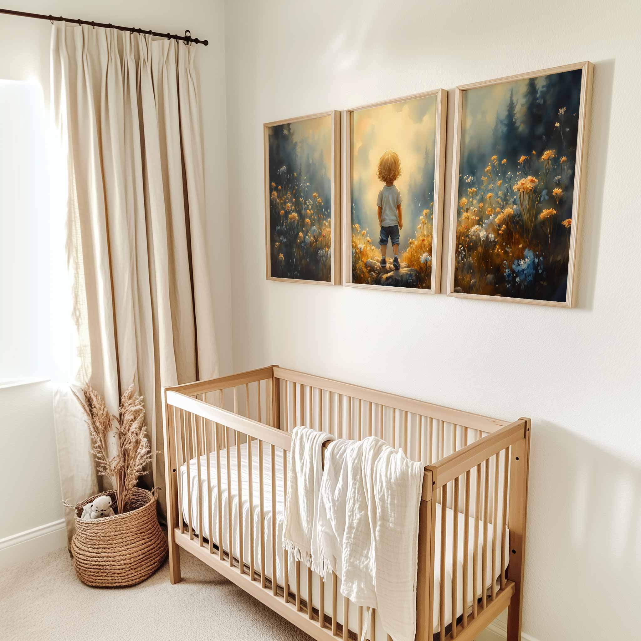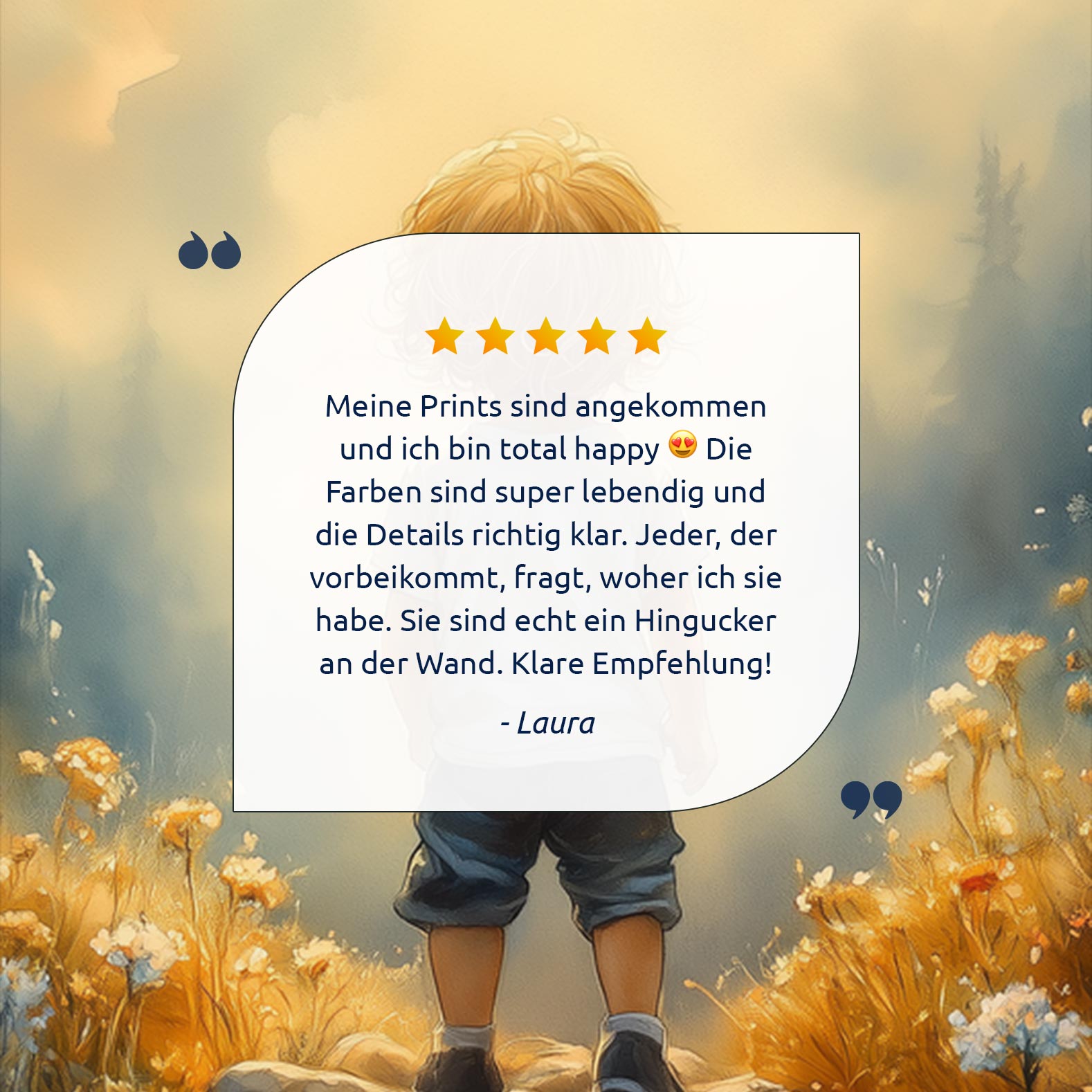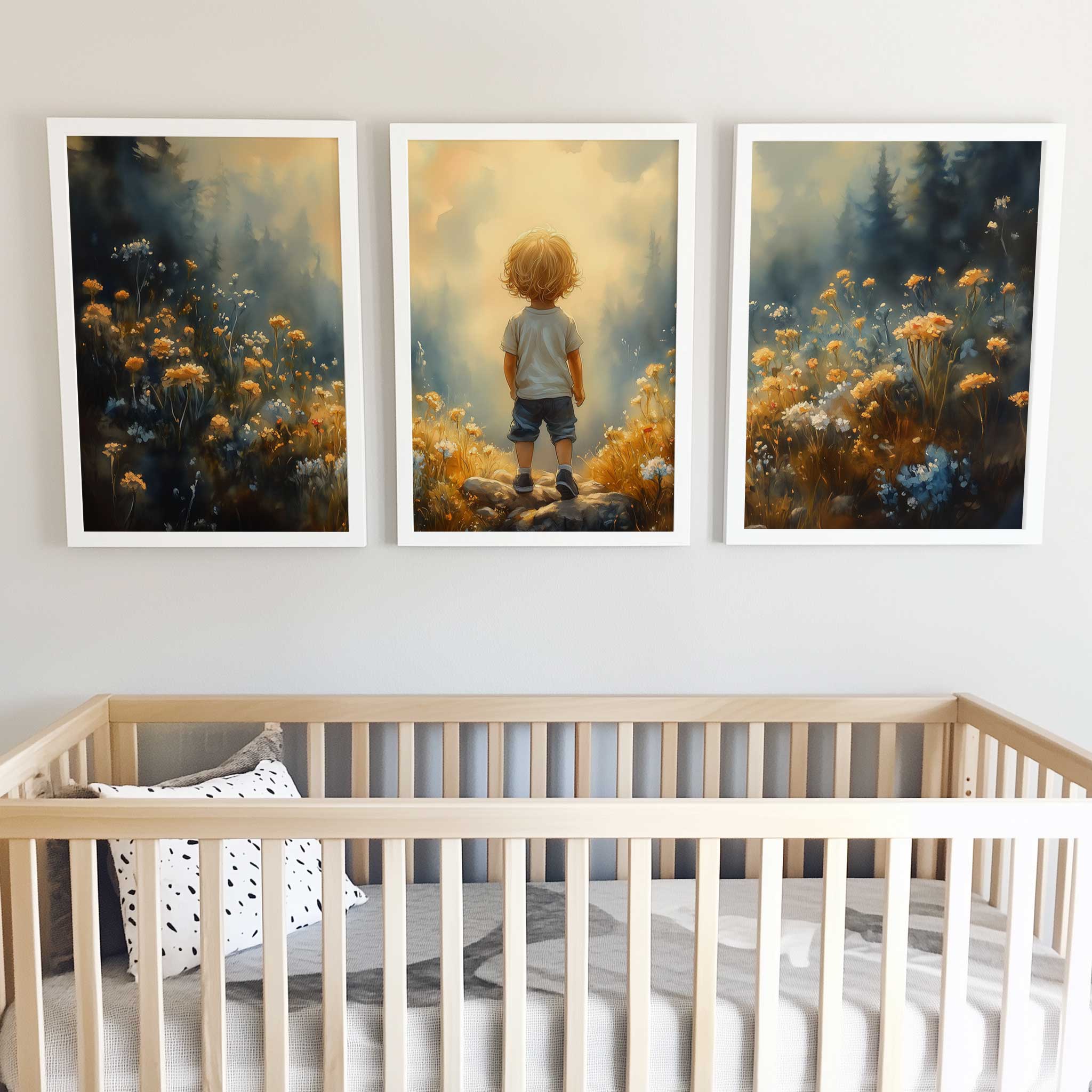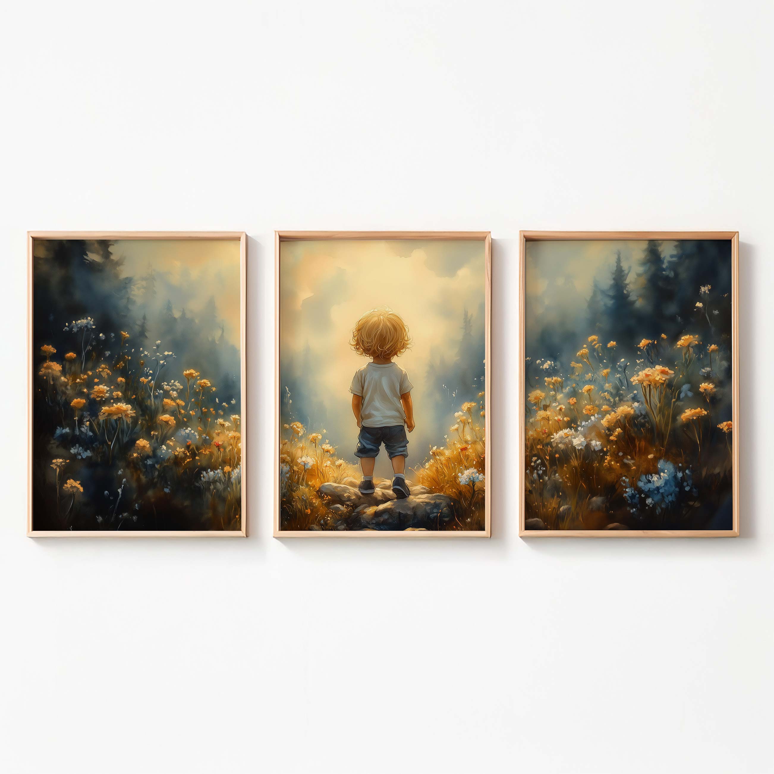 Terug naar collectie Posters Jongen op de rots: Speels avontuur in bloemenveld