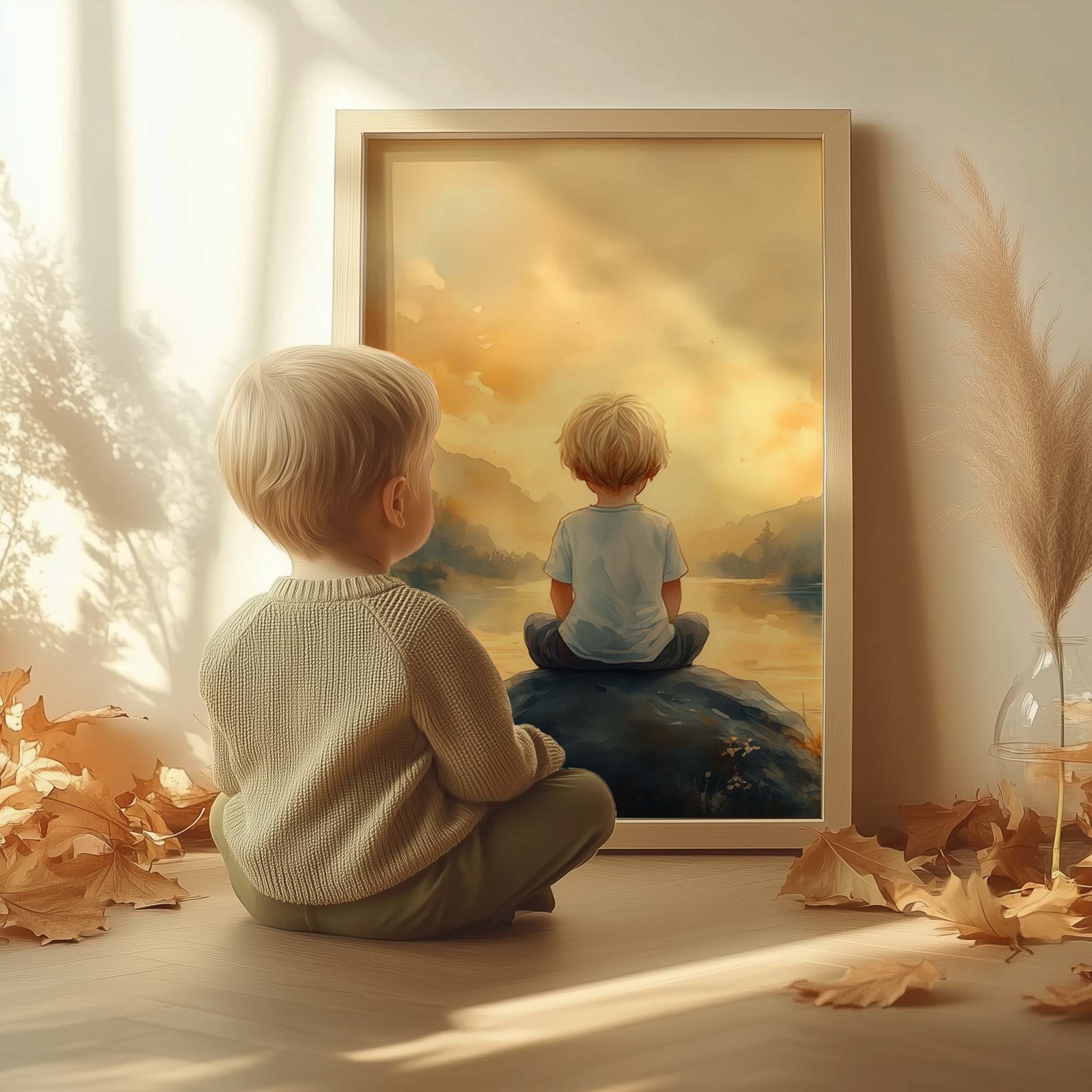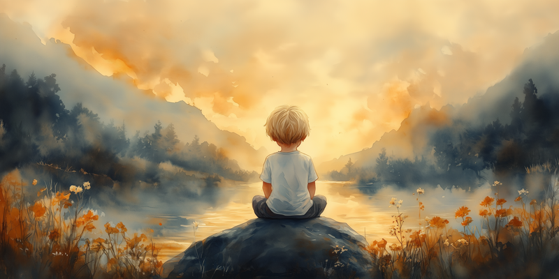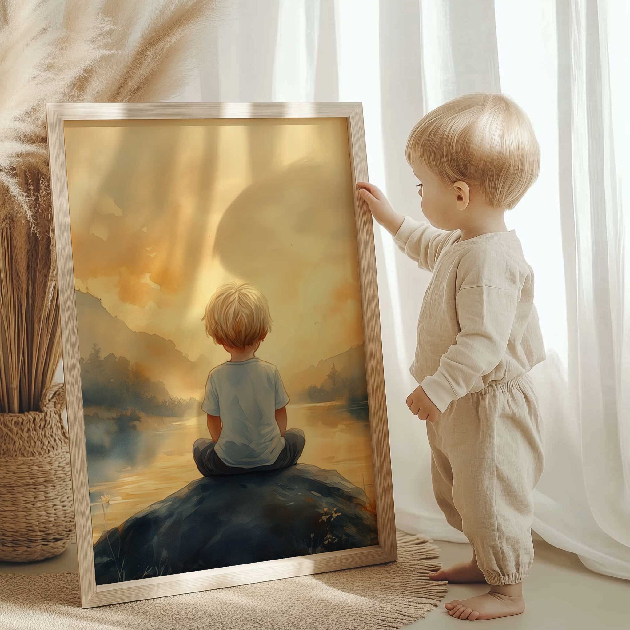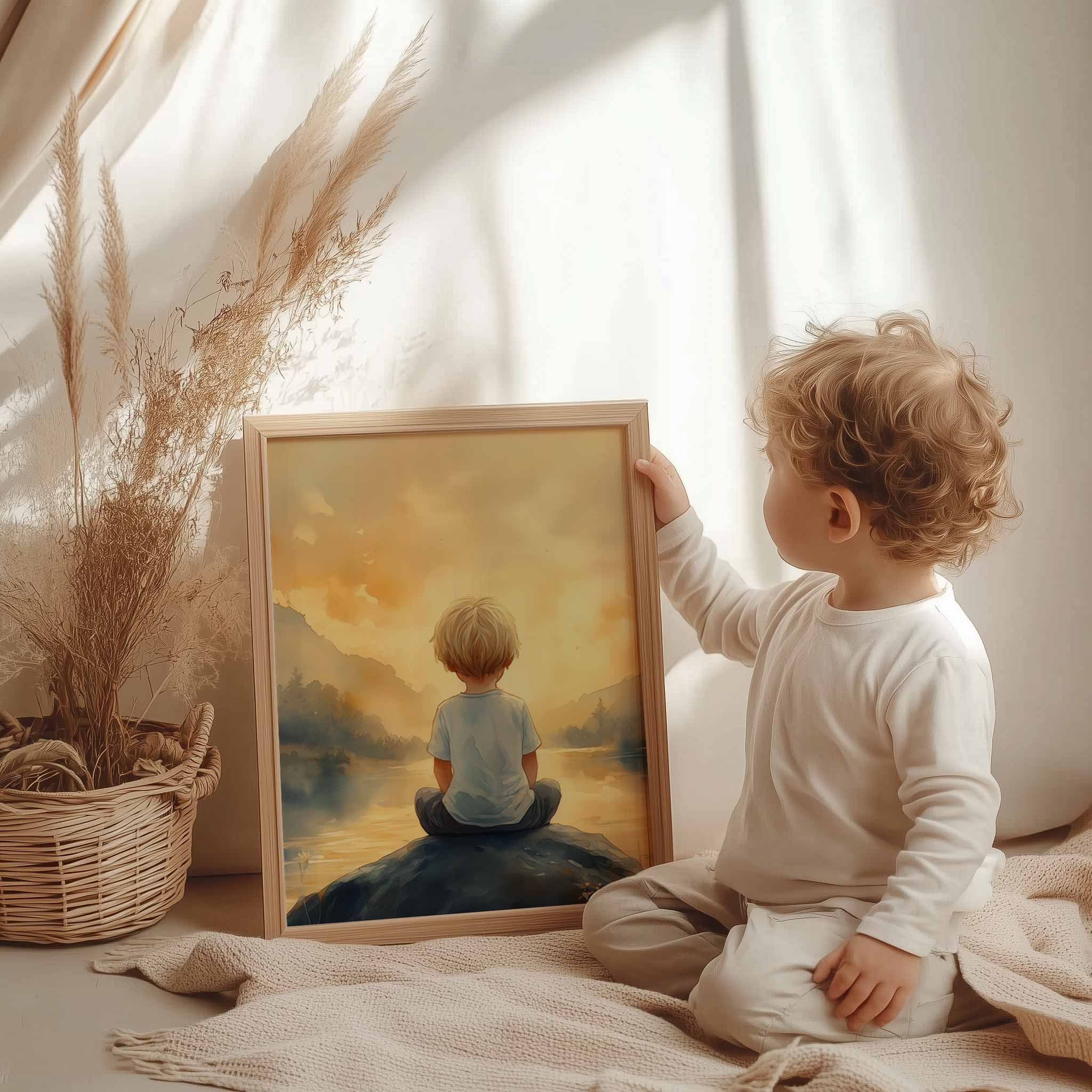 Jongen op rots bij water – warme, speelse sfeer