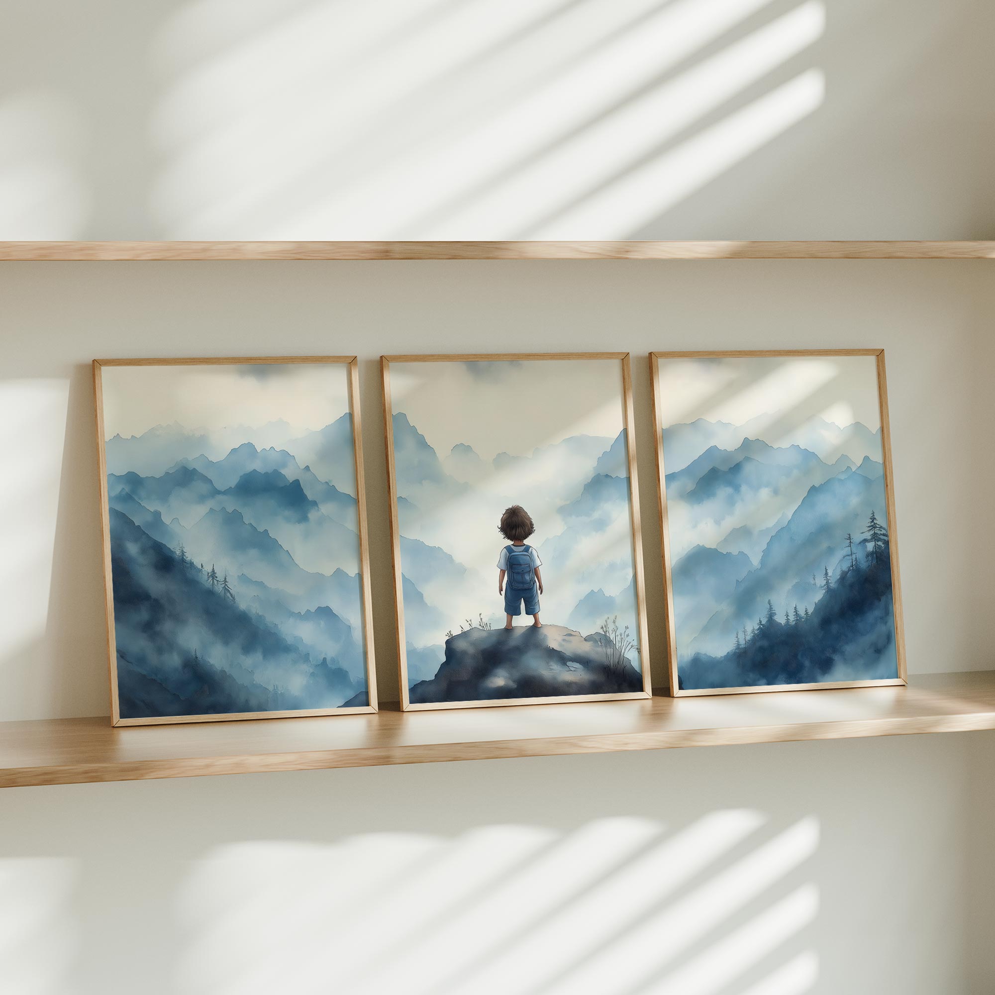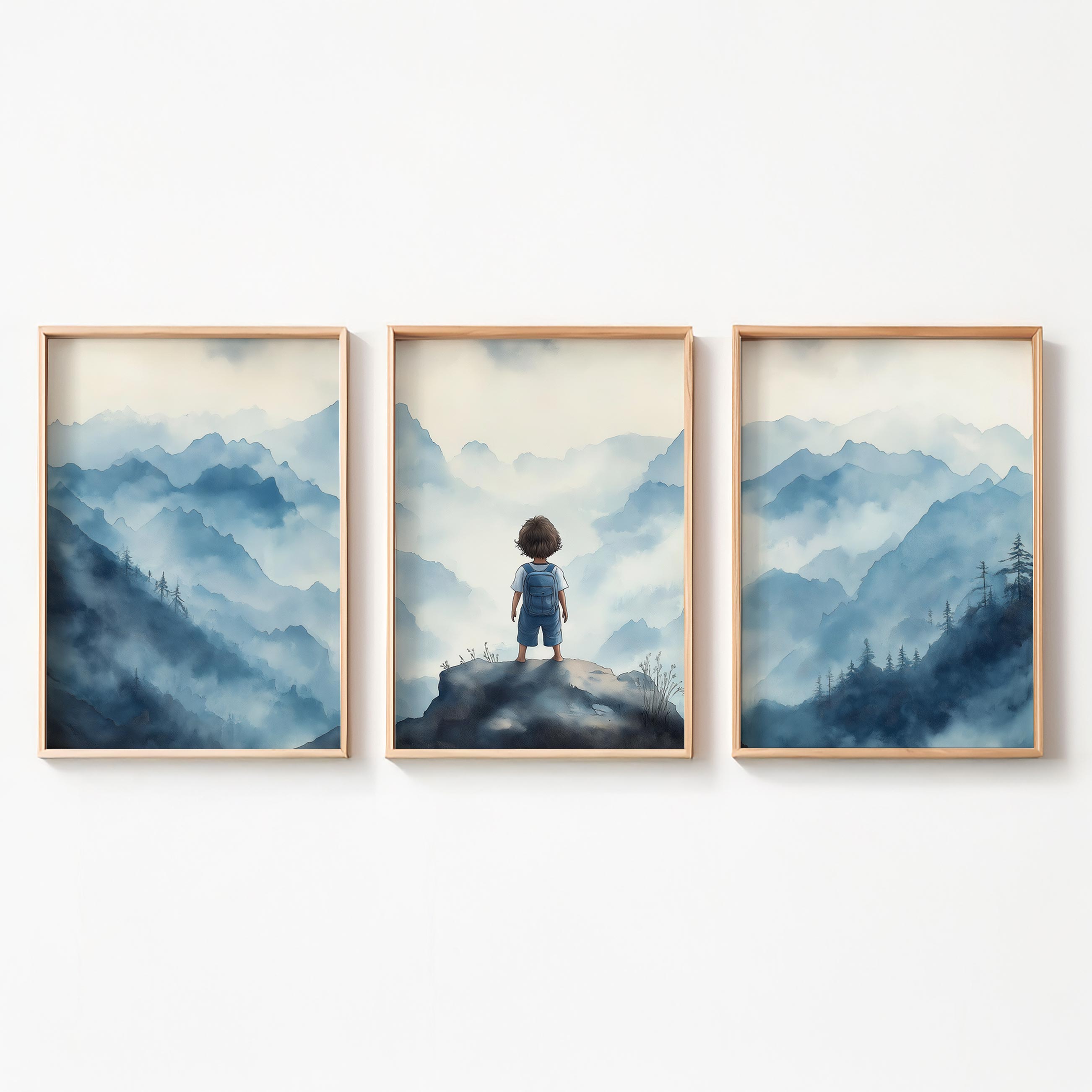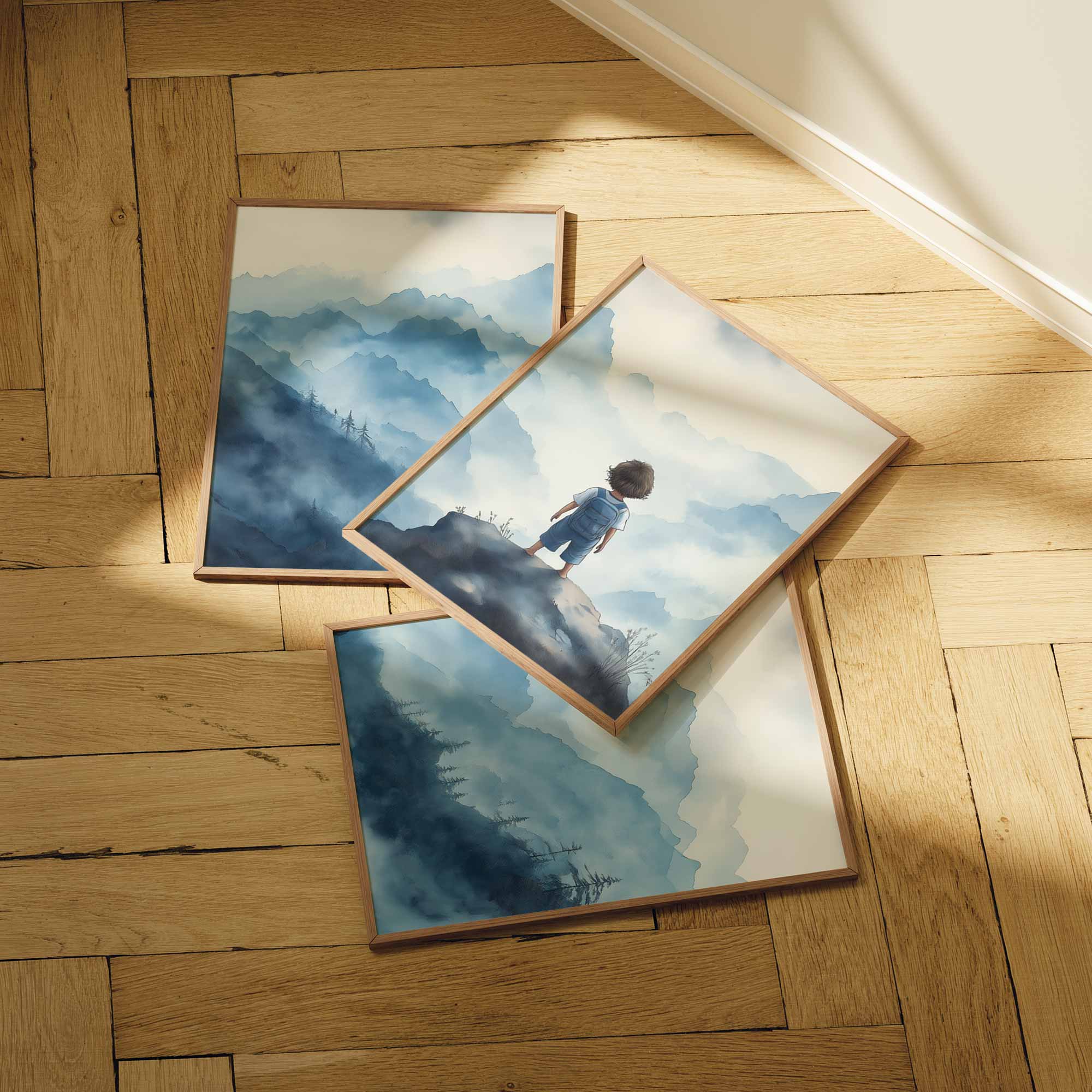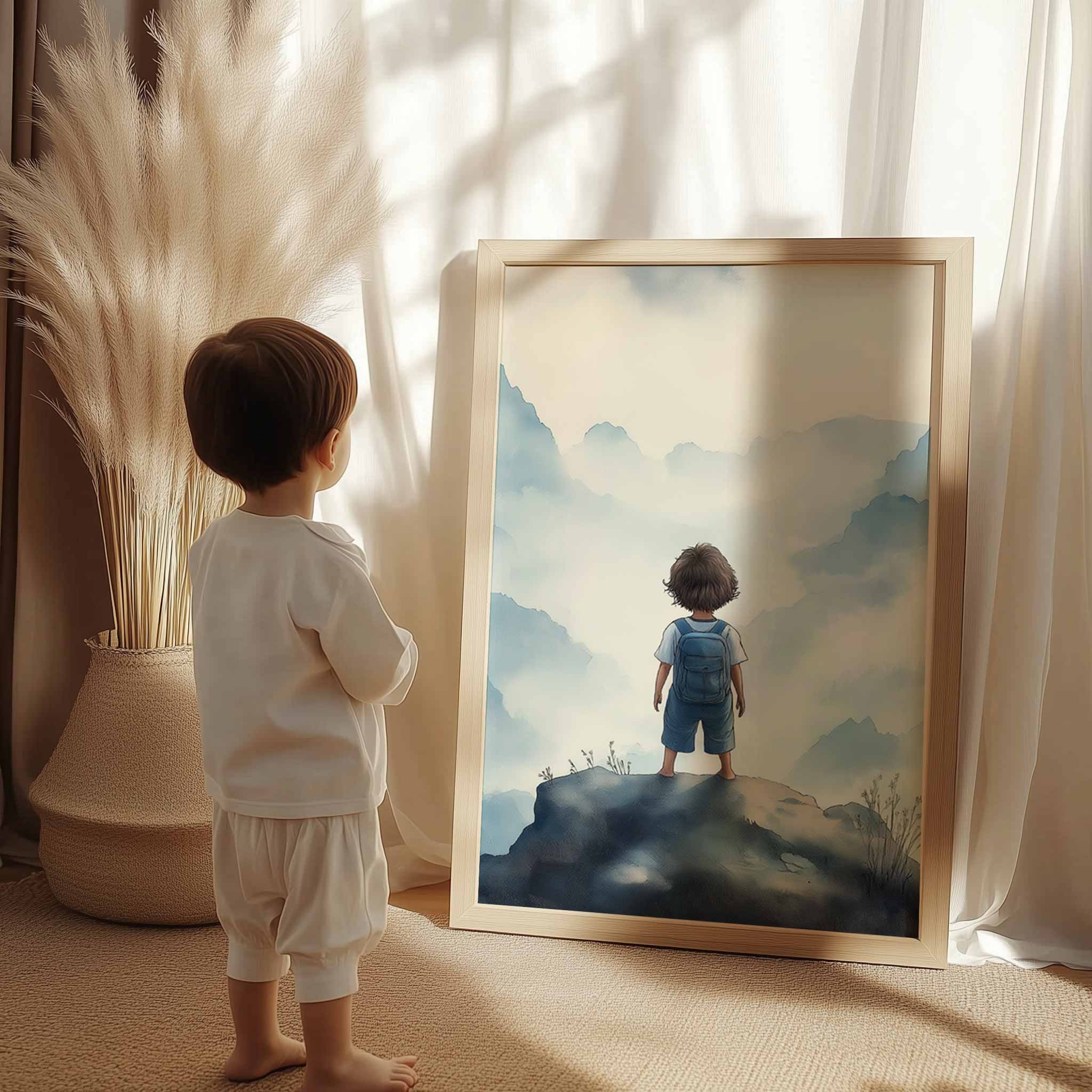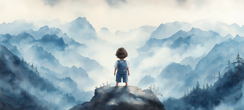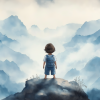 Jongen op rots – Dromerig berglandschap in waterverf