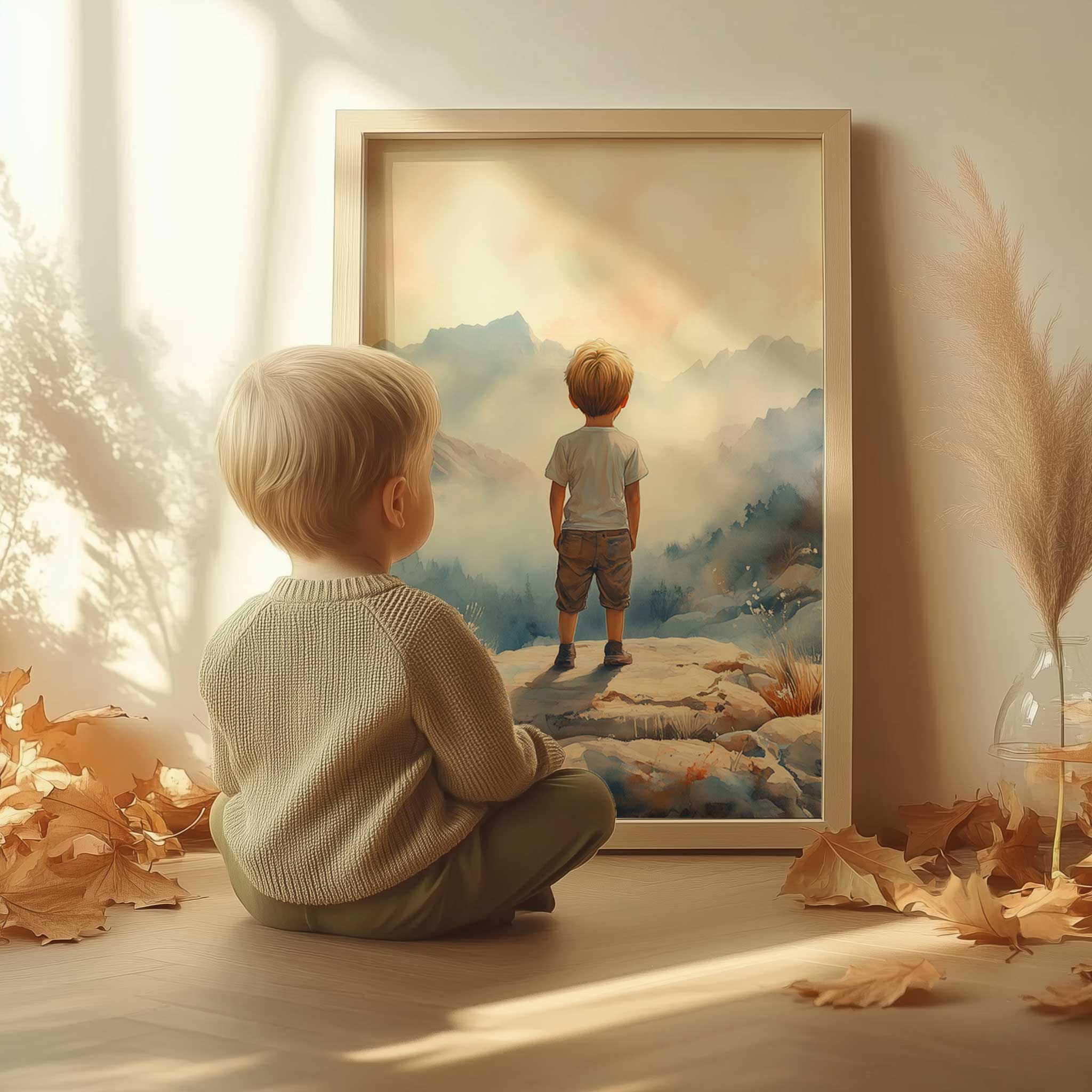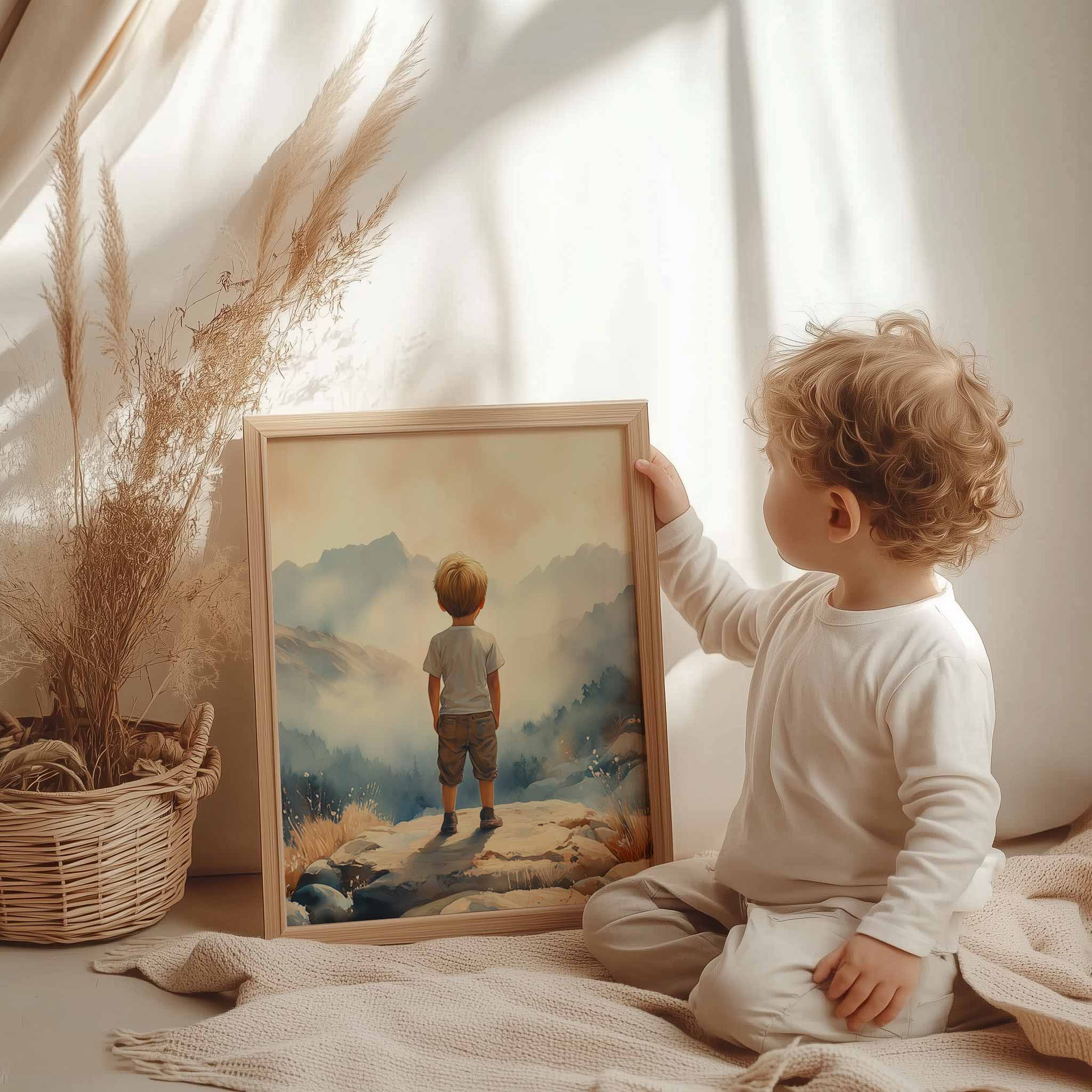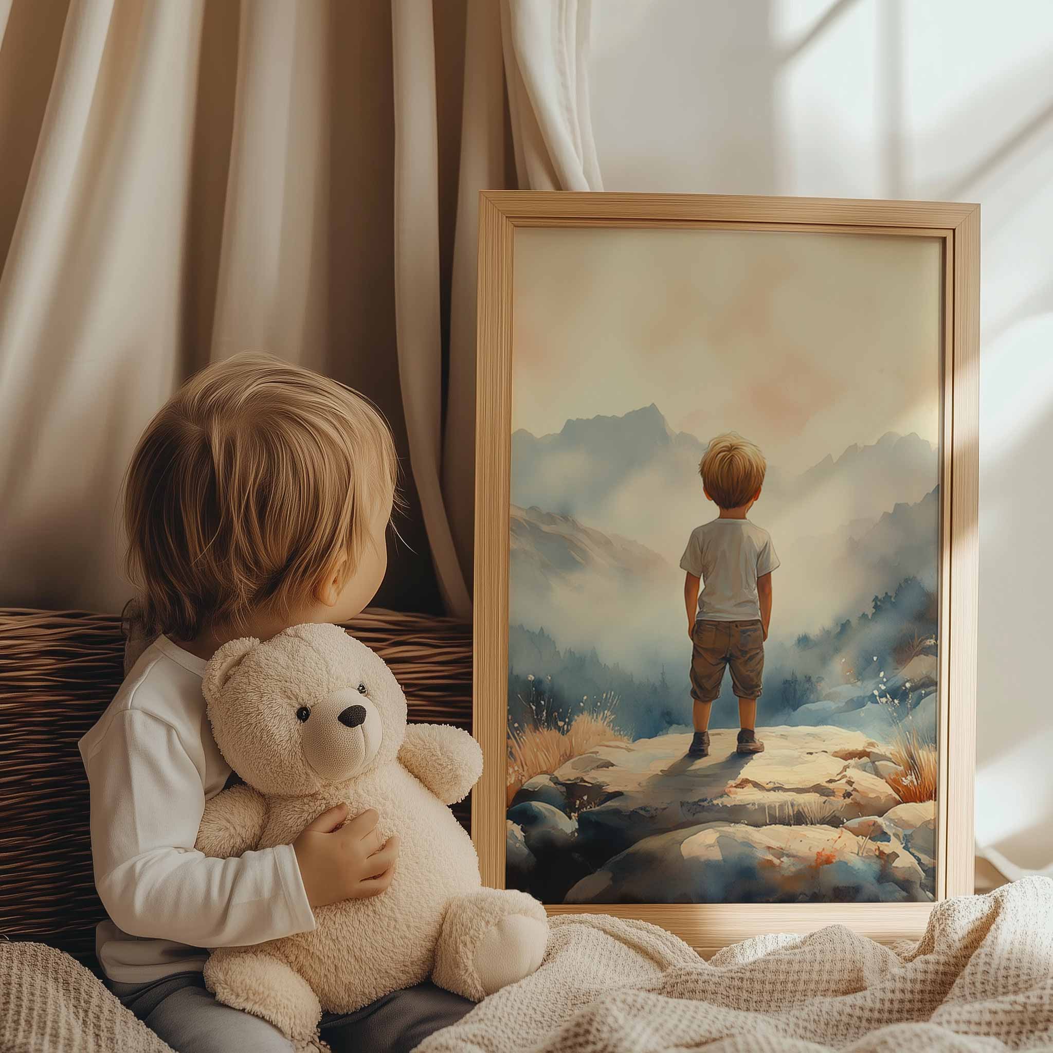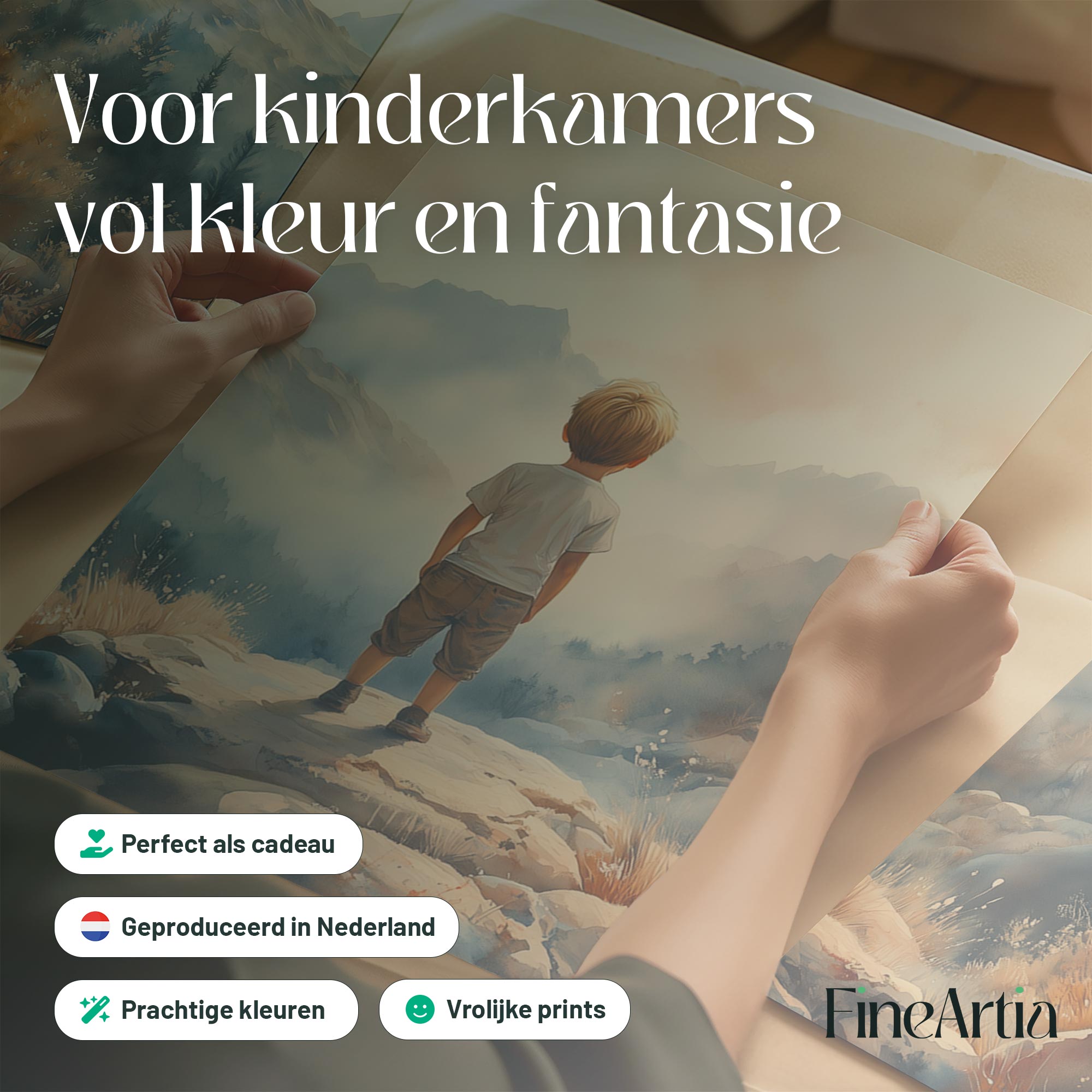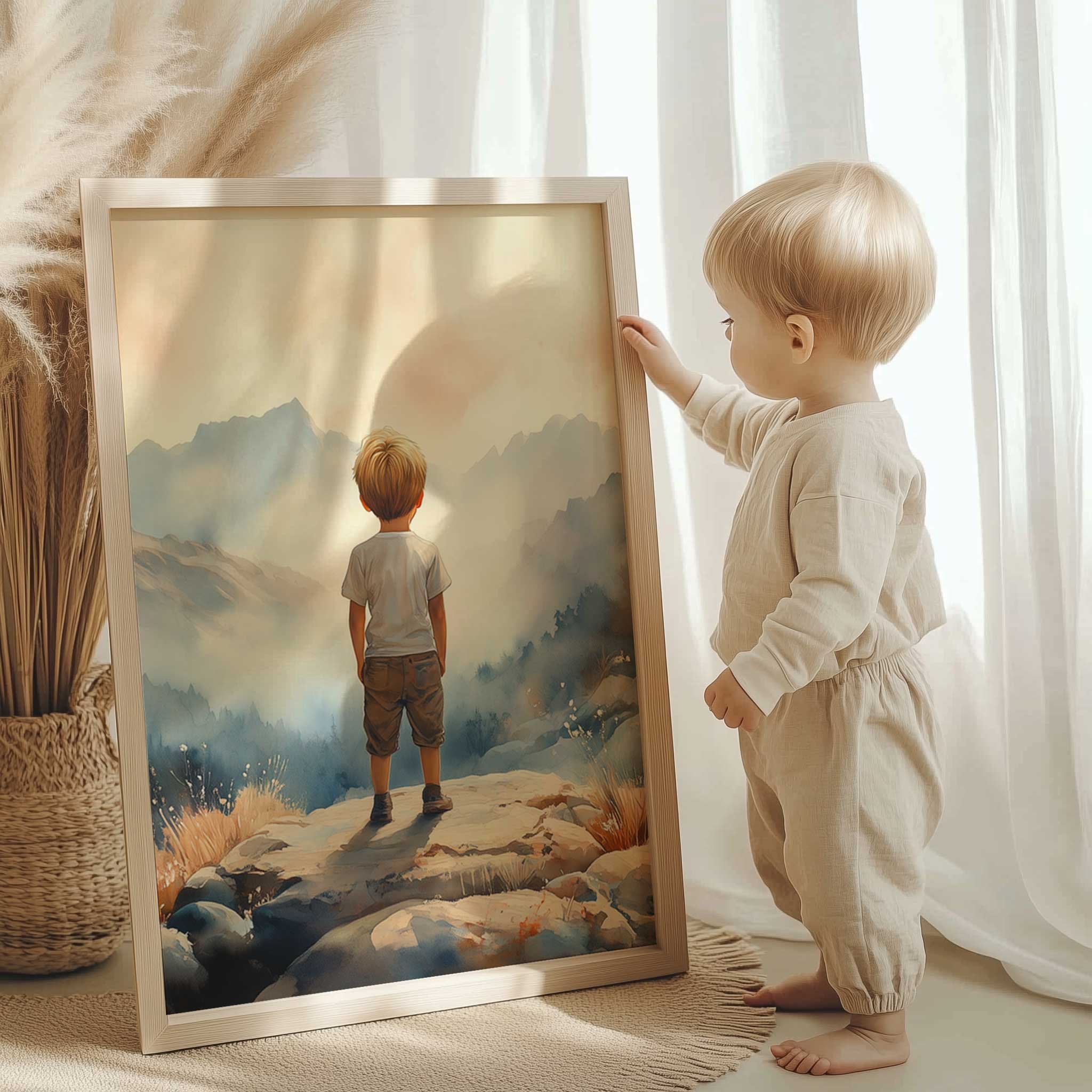 Jongen op rots – Dromerig berglandschap voor kinderkamer