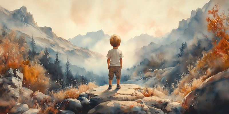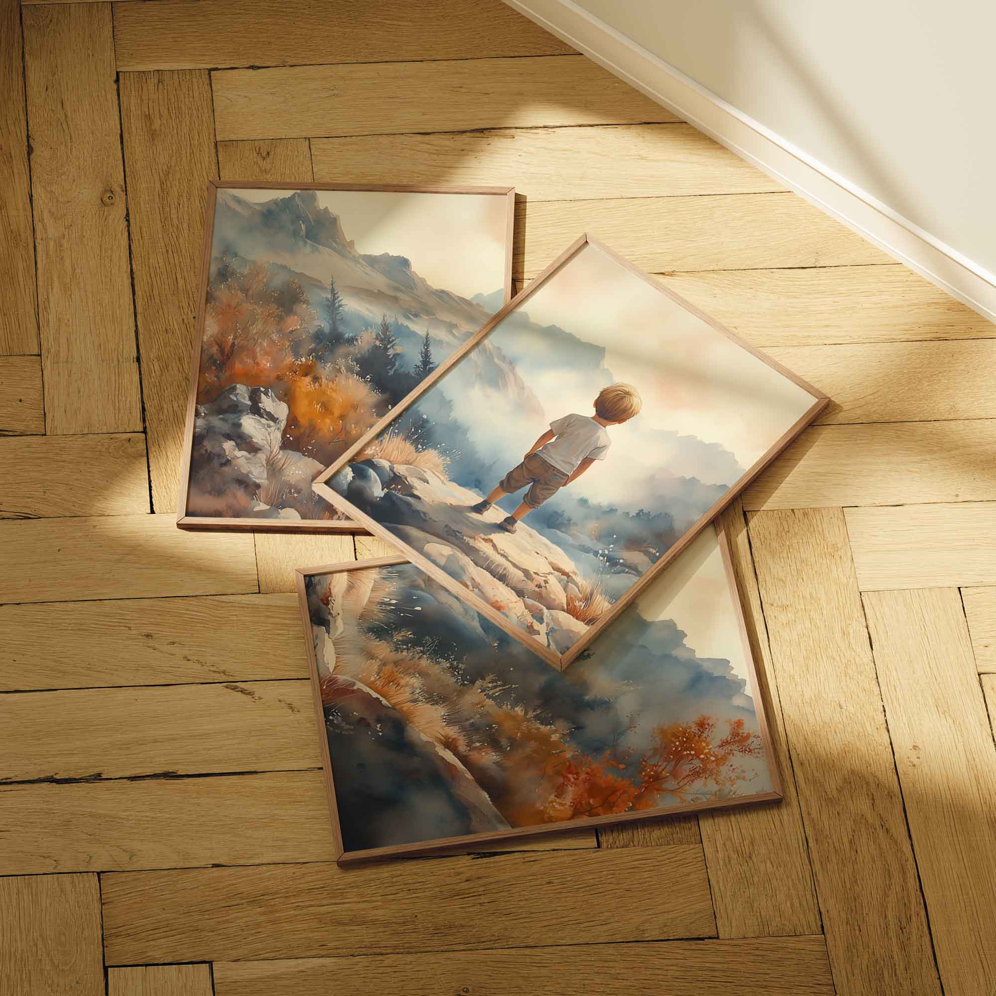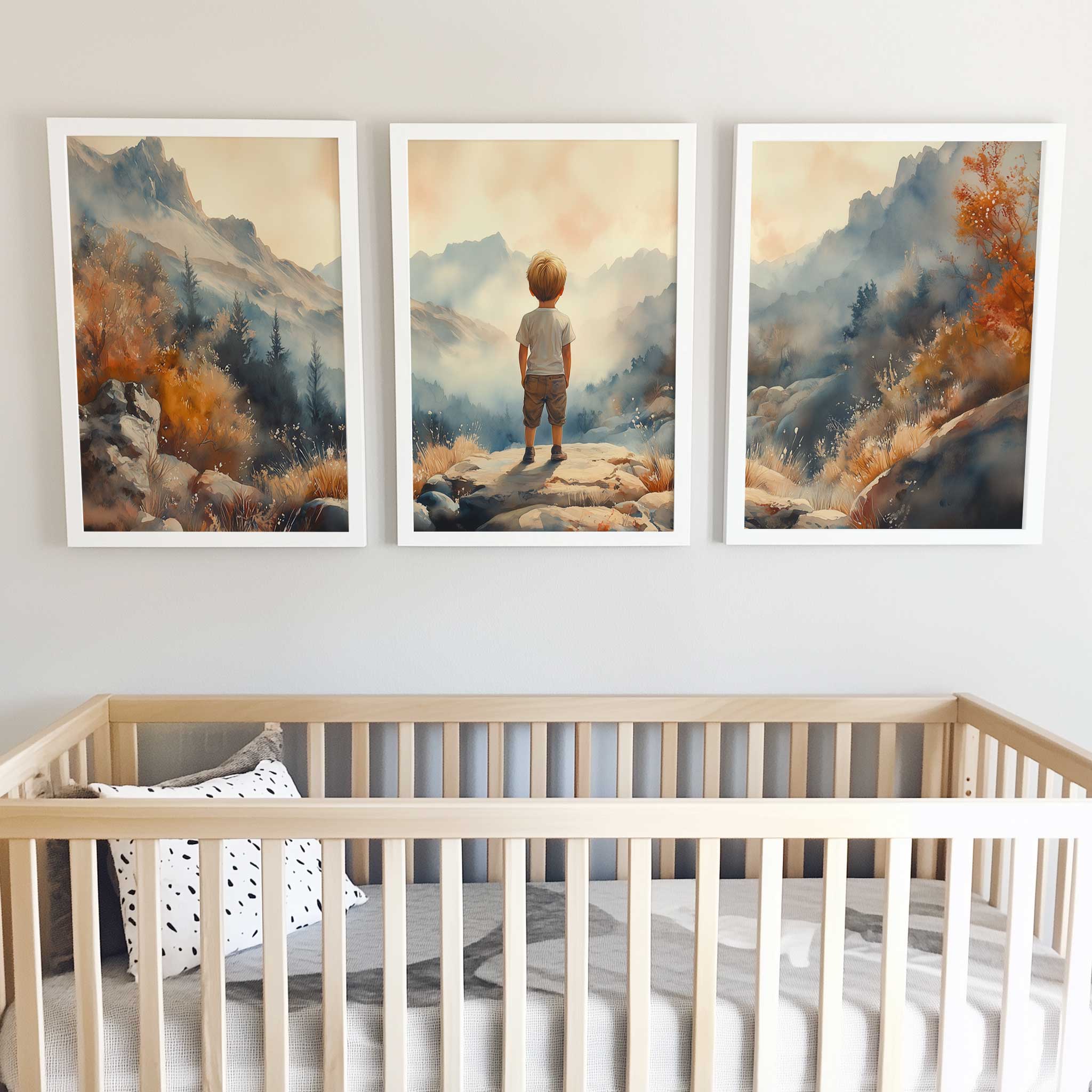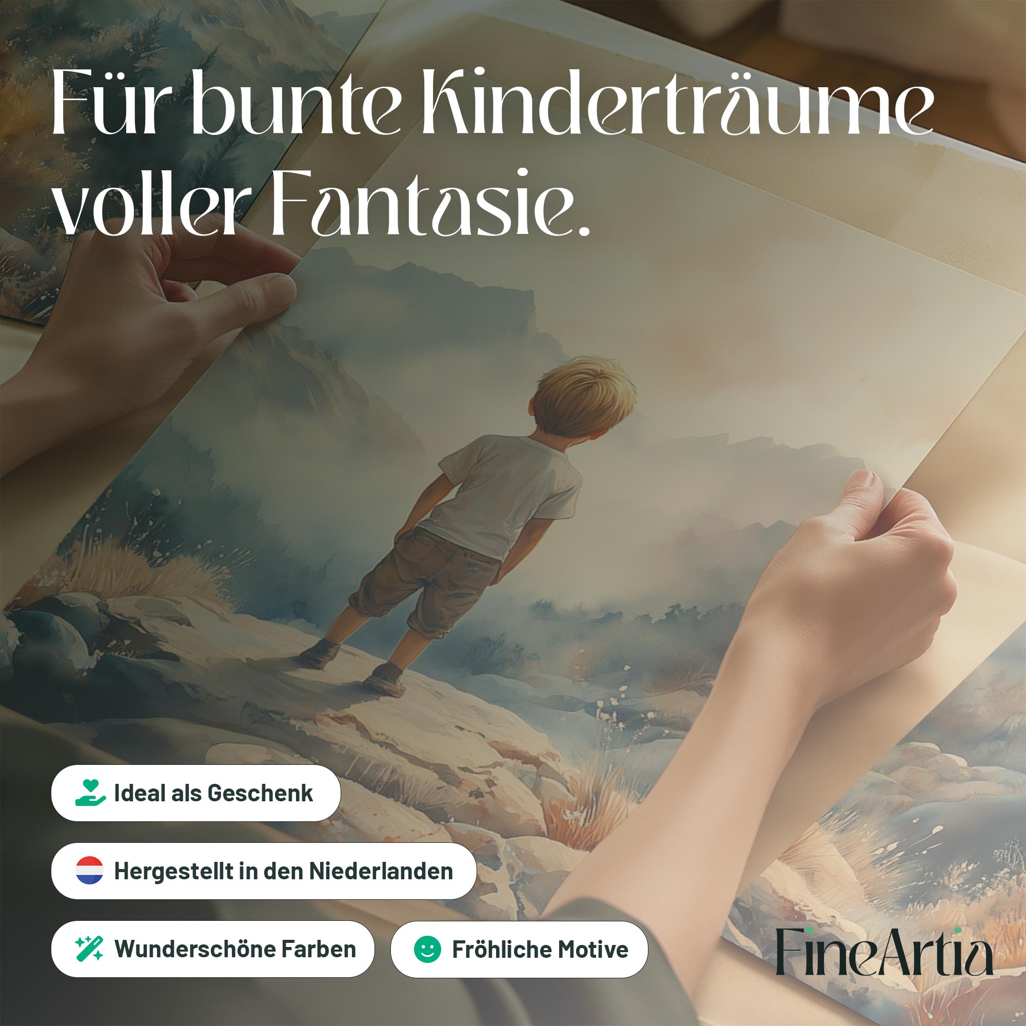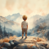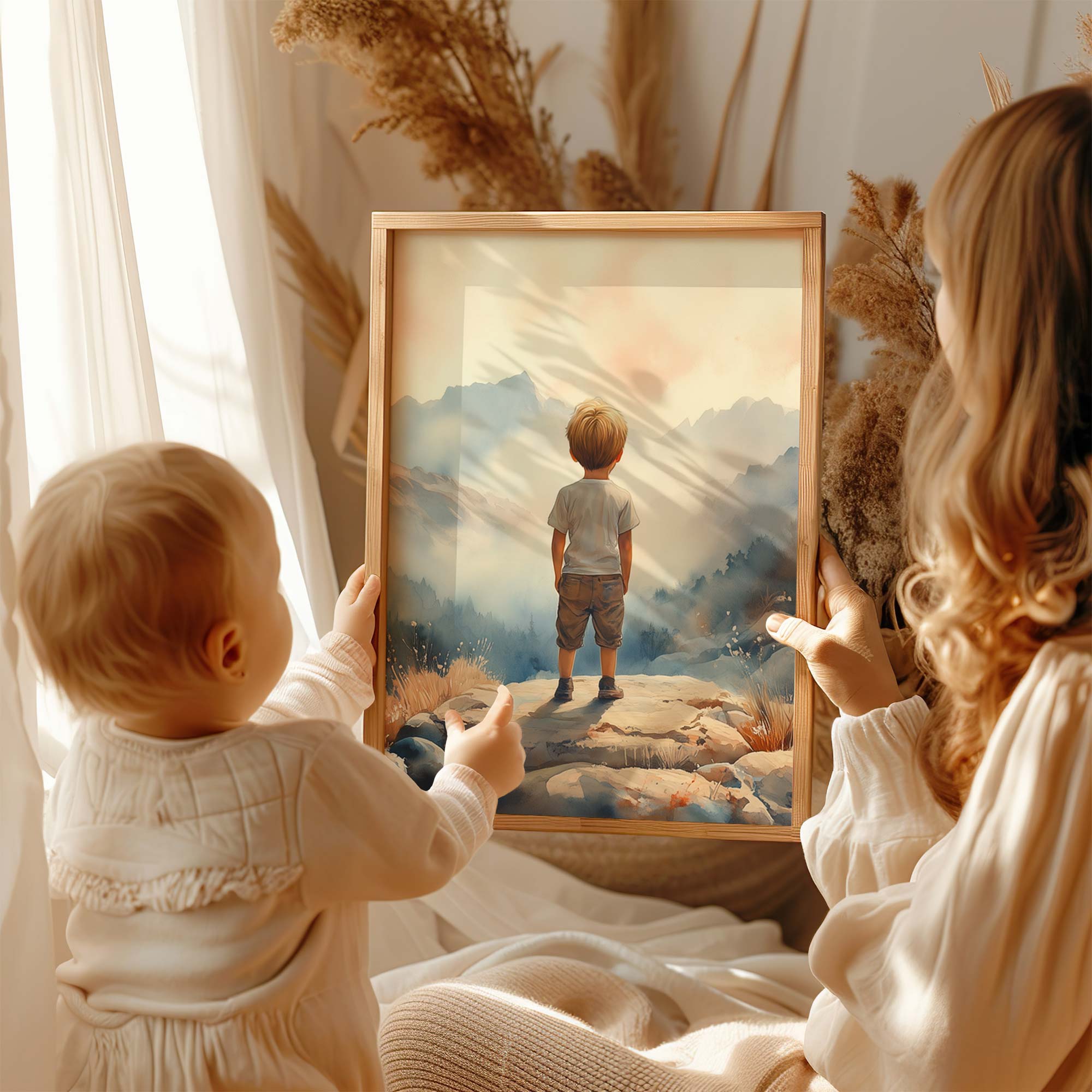 Jongen op rots – Dromerig berglandschap voor kinderkamer