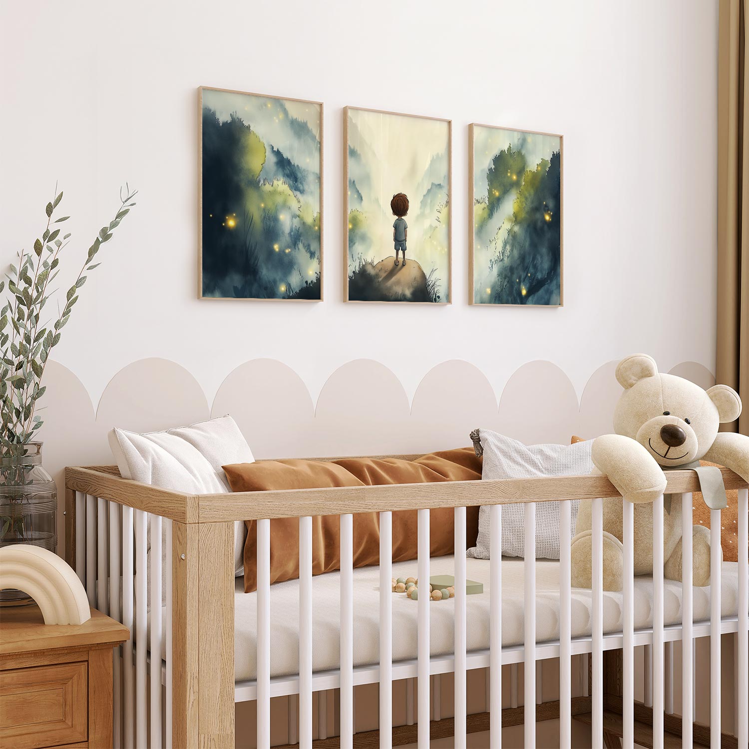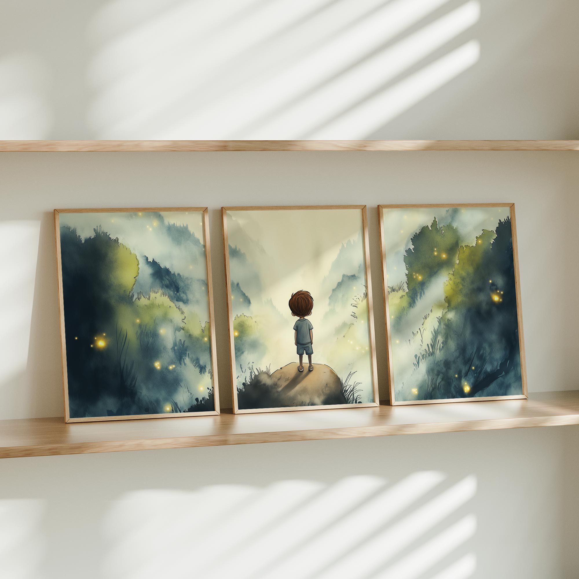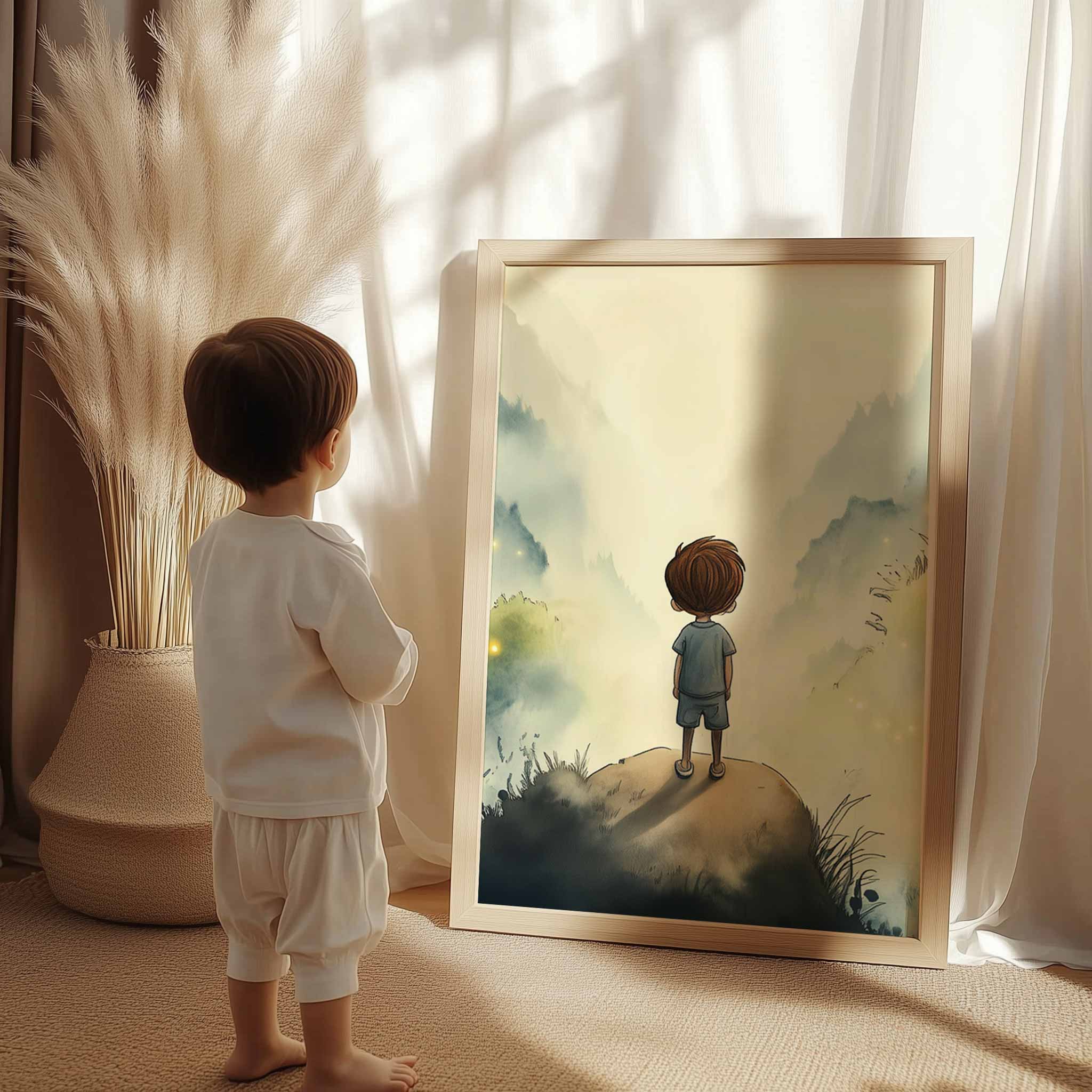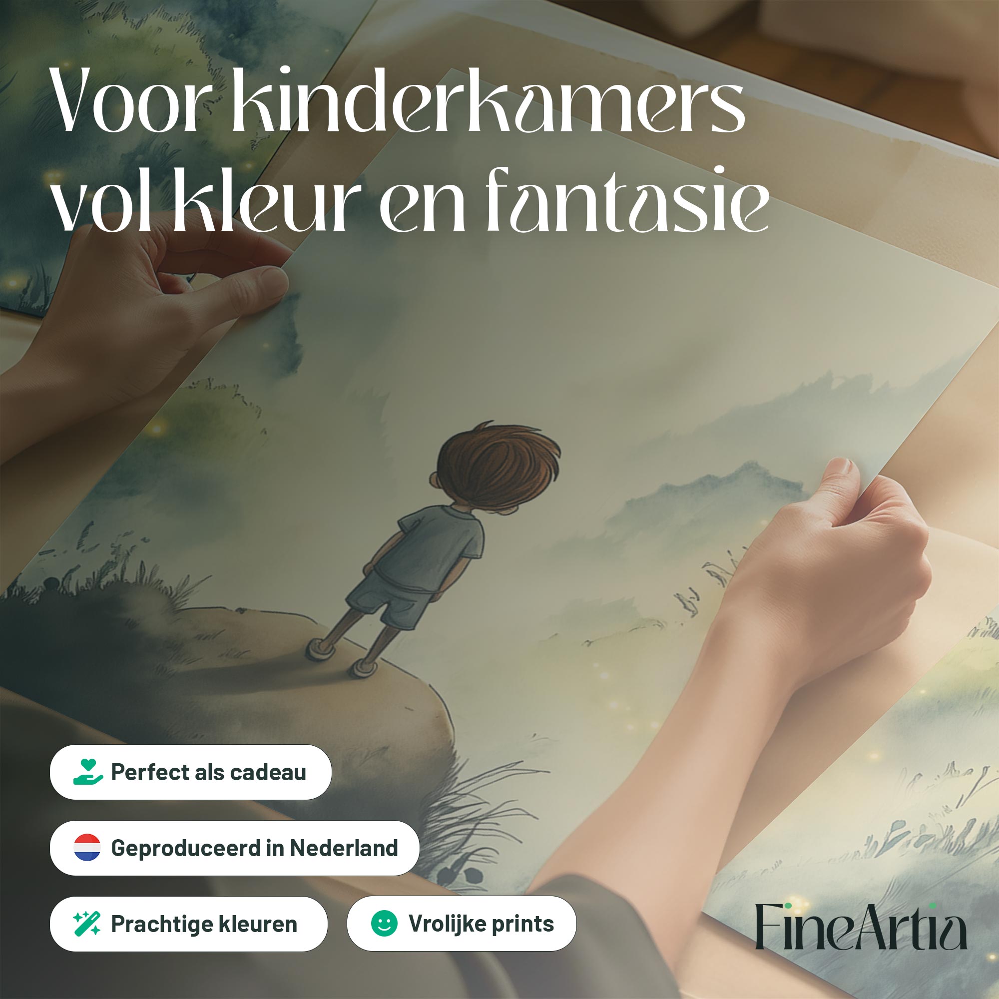 Jongen op rots in betoverend bos – Droomachtig wanddecoratie