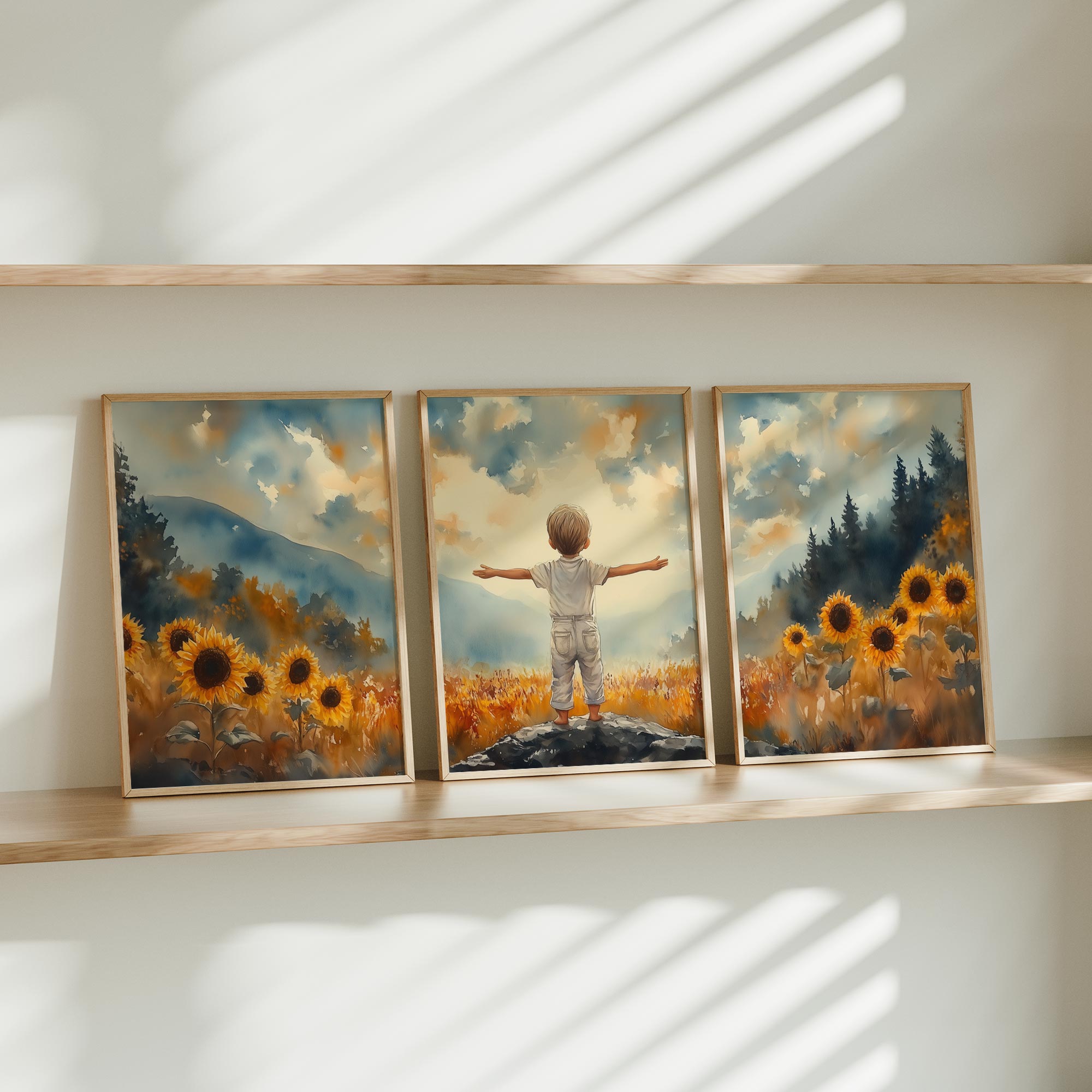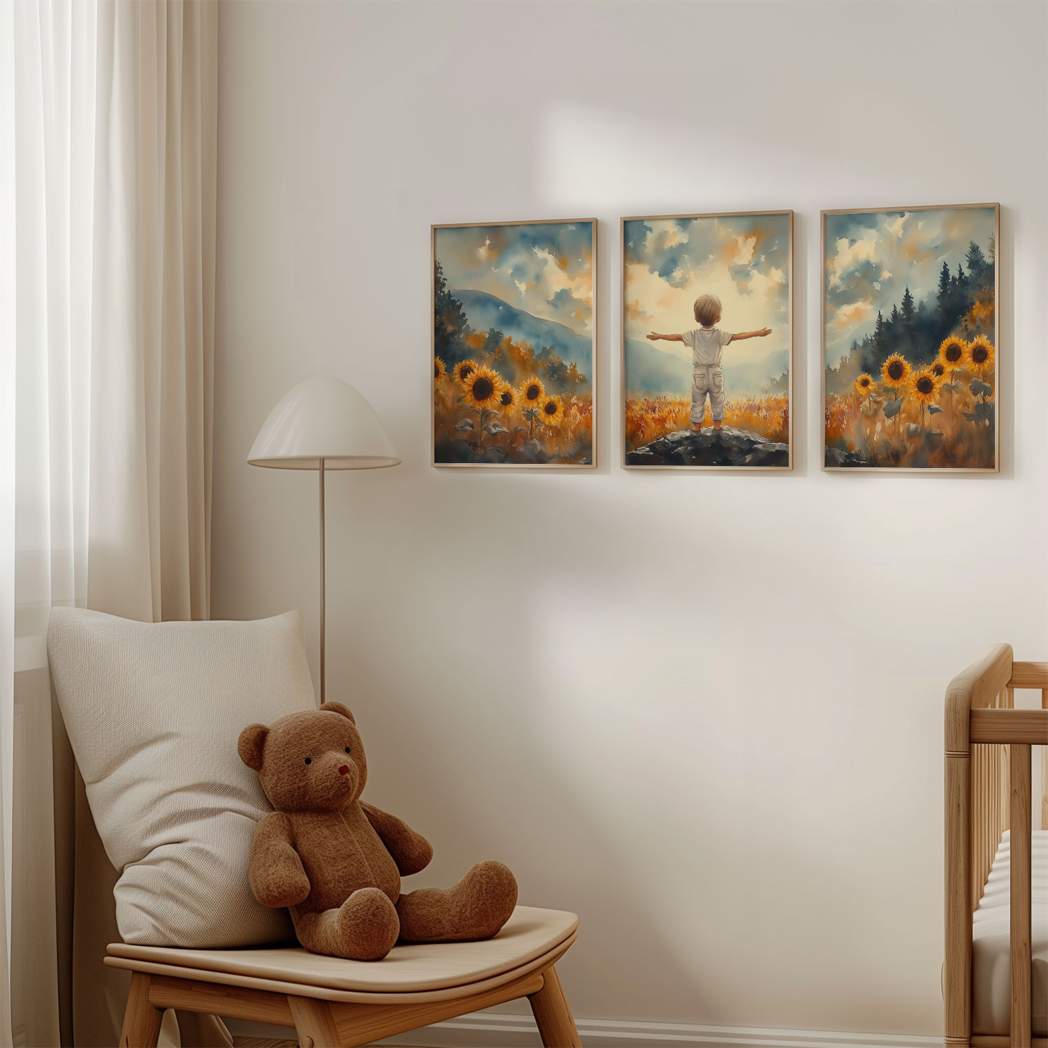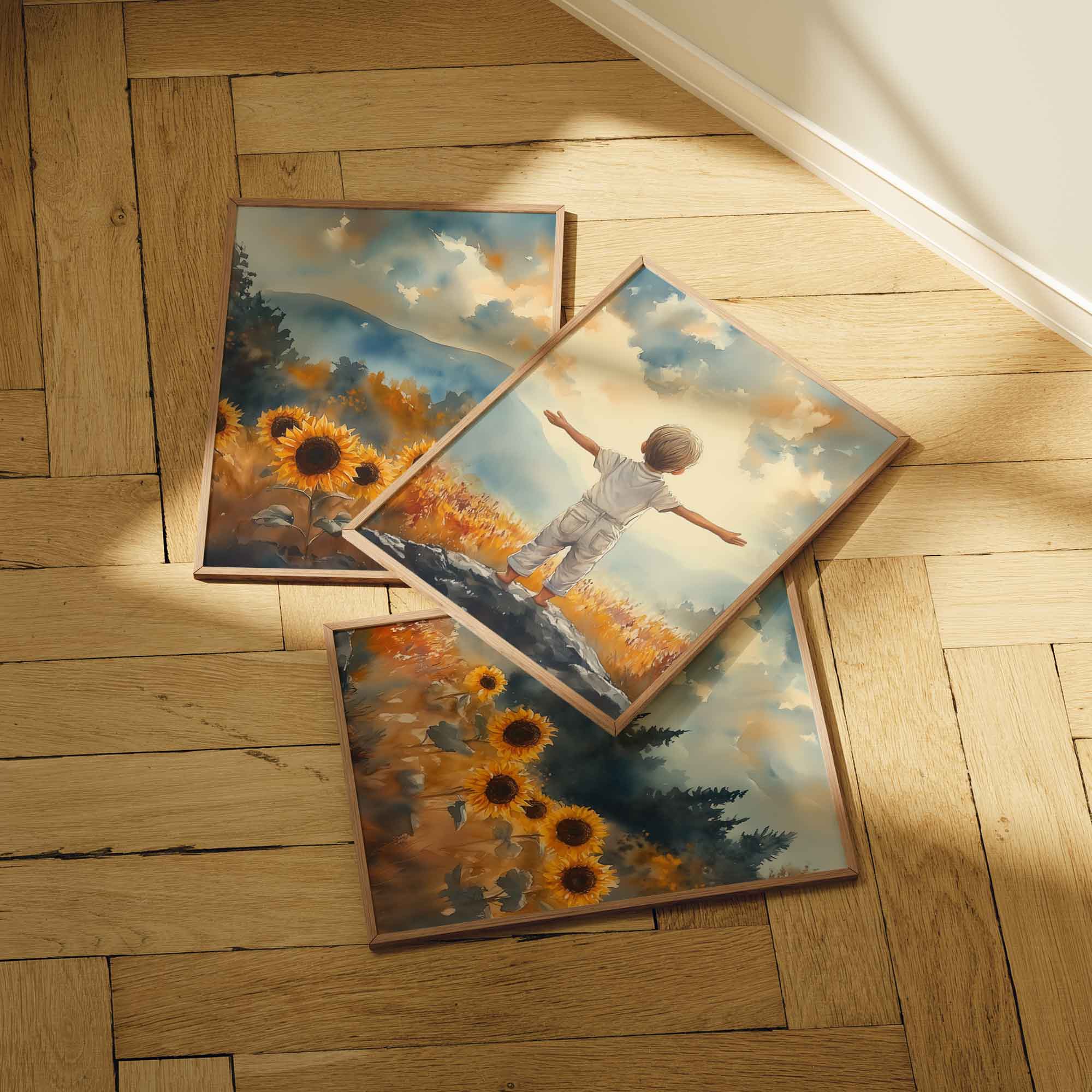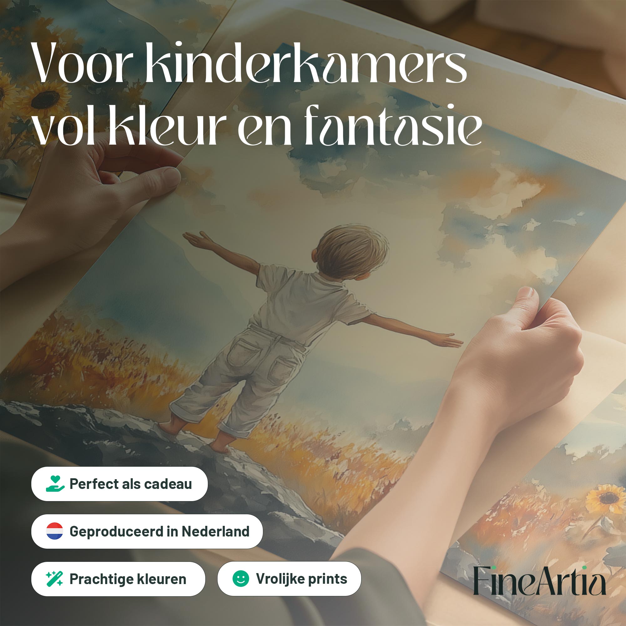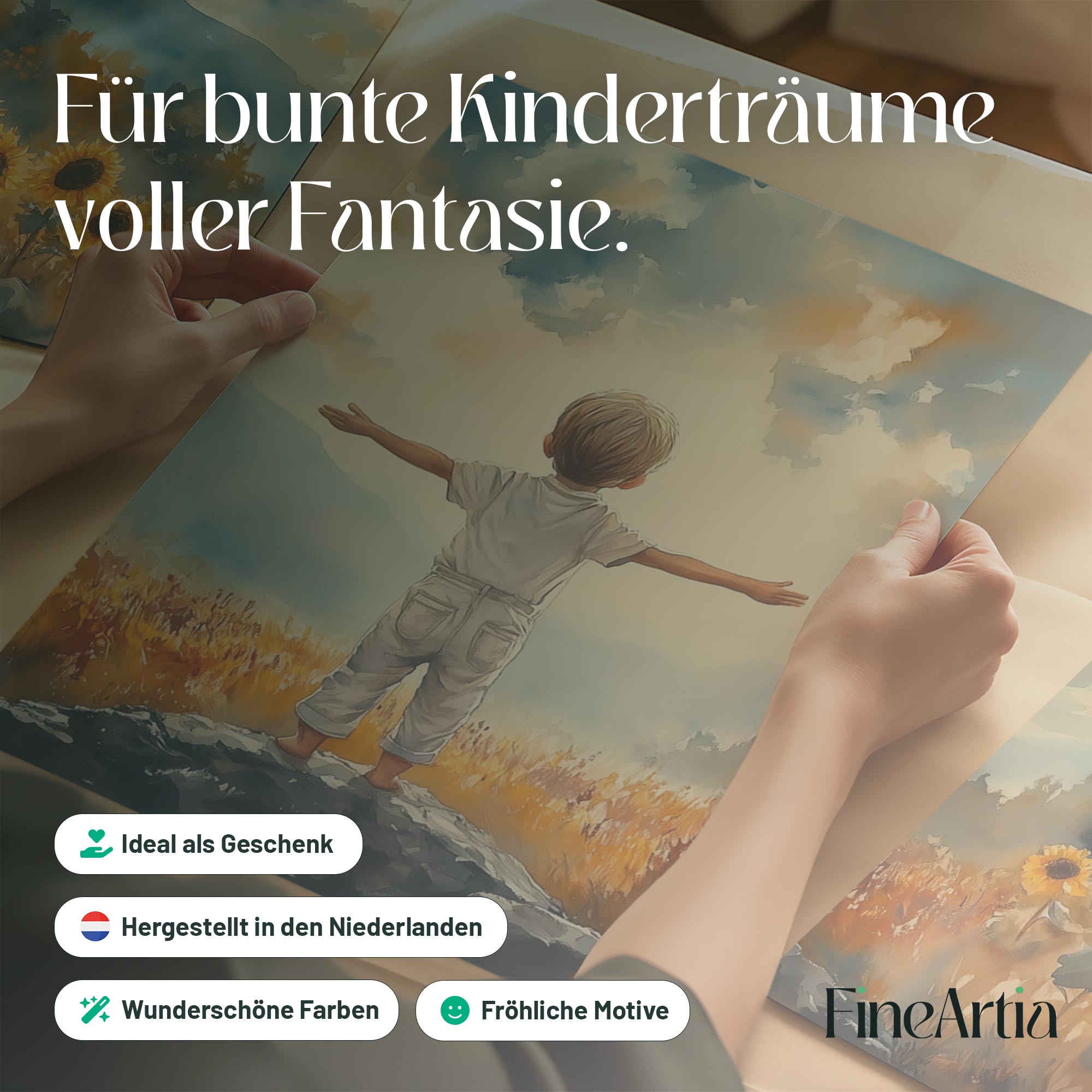 Terug naar collectie Posters Jongen tussen zonnebloemen: vrolijk en kleurrijk tafereel