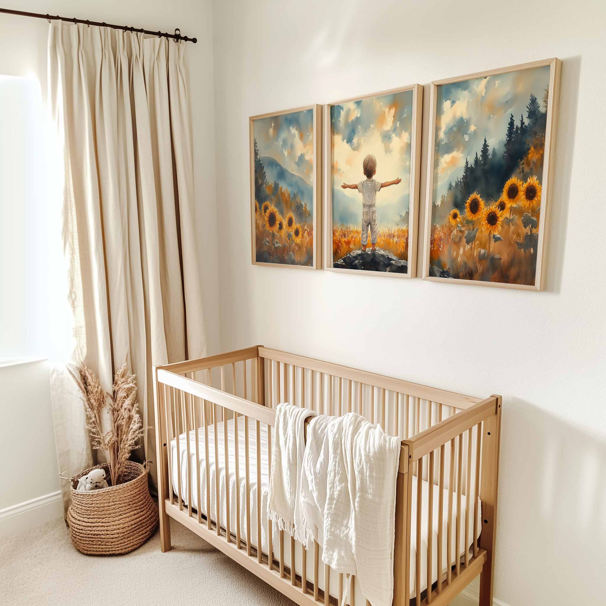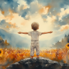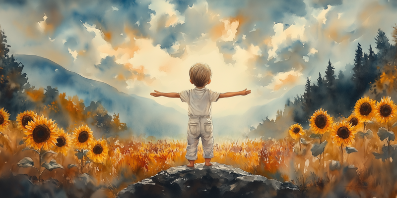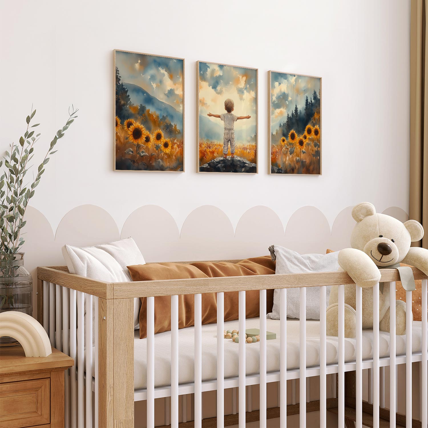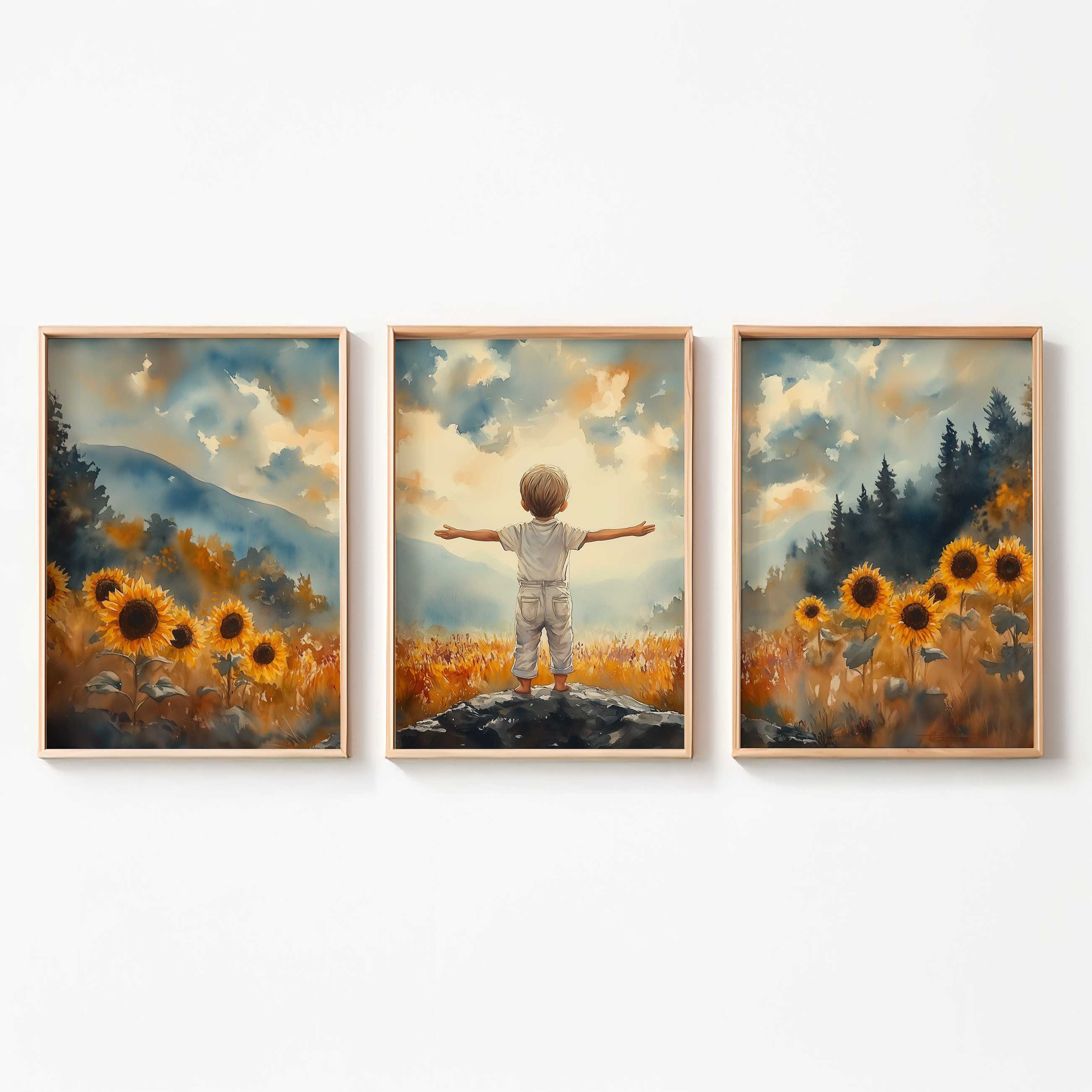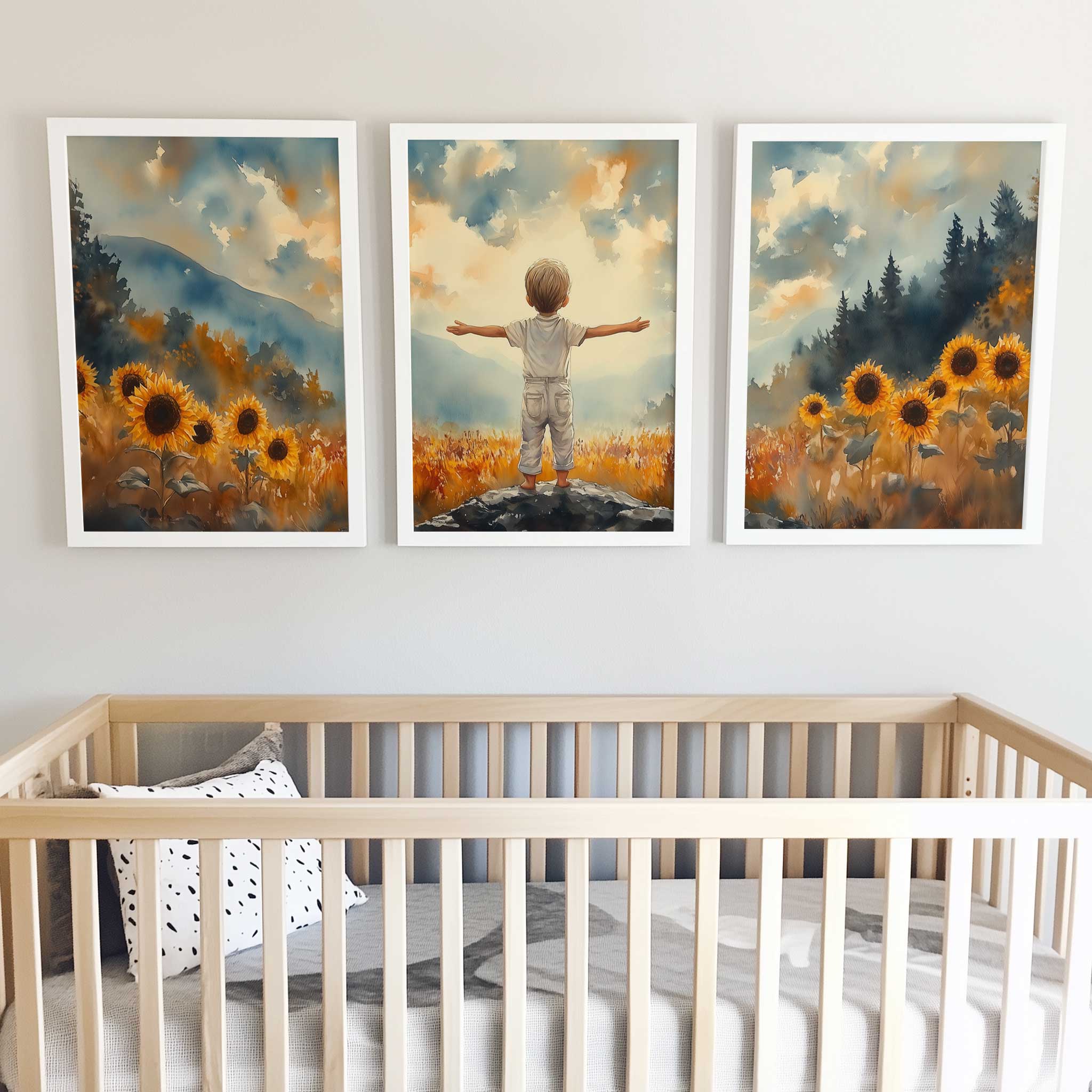 Terug naar collectie Posters Jongen tussen zonnebloemen: vrolijk en kleurrijk tafereel