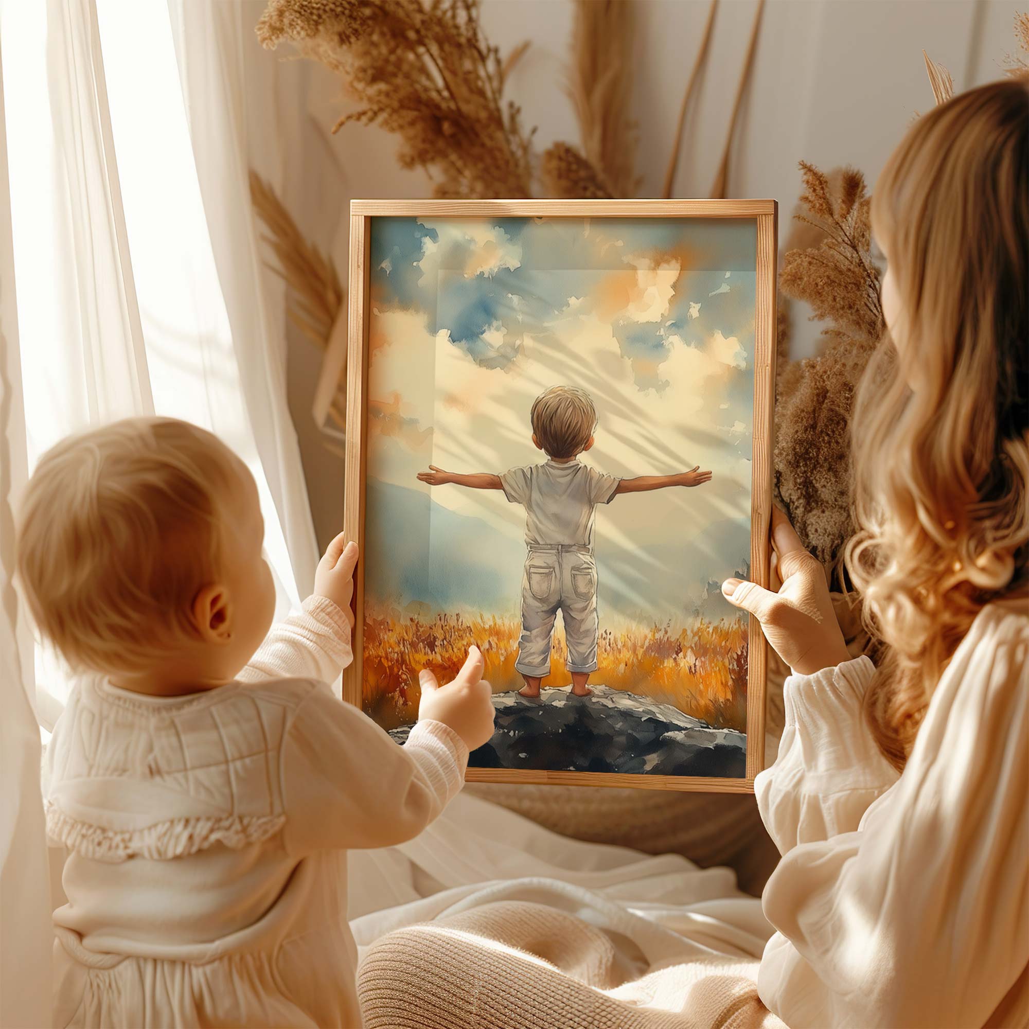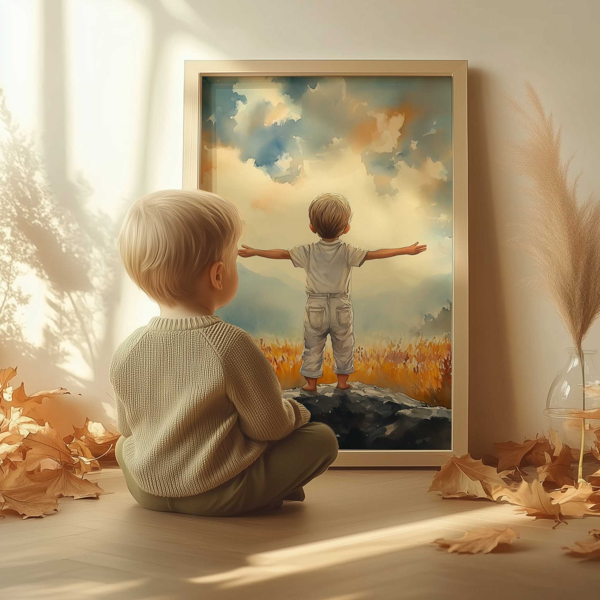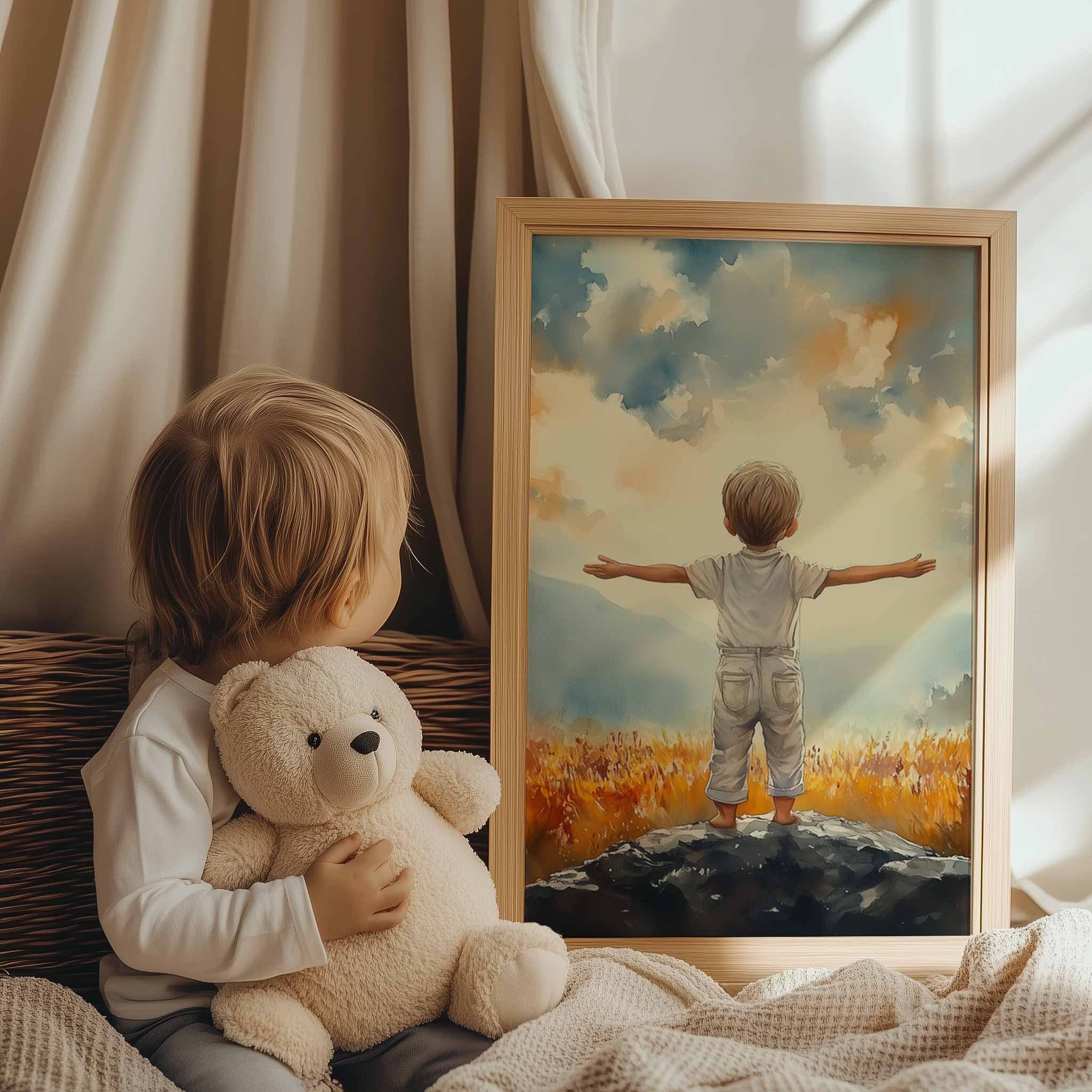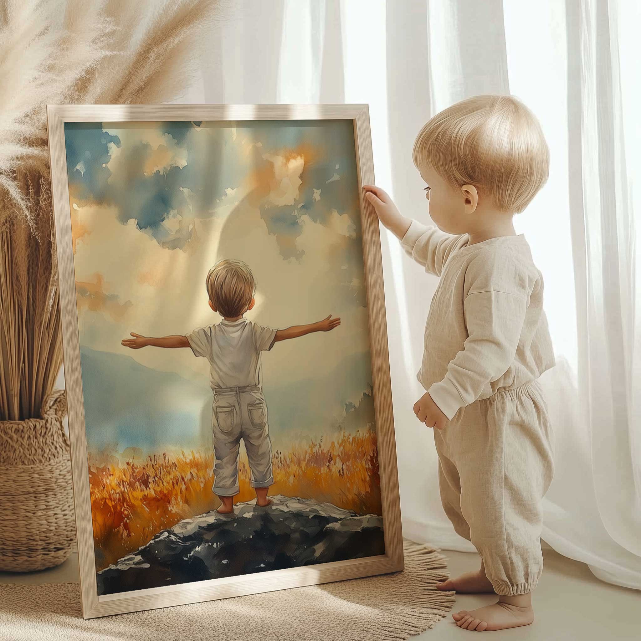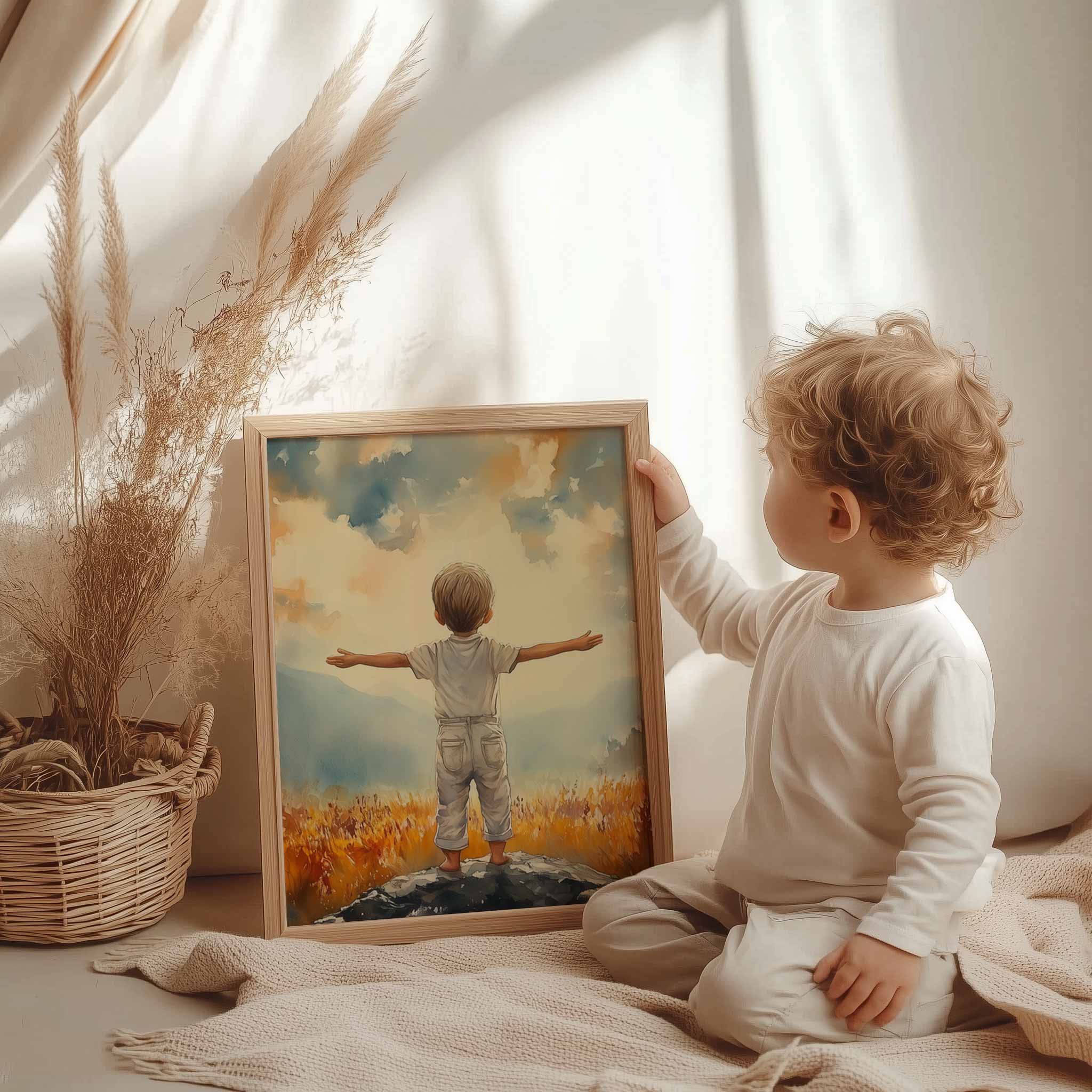 Terug naar collectie Posters Jongen tussen zonnebloemen: vrolijk en kleurrijk tafereel