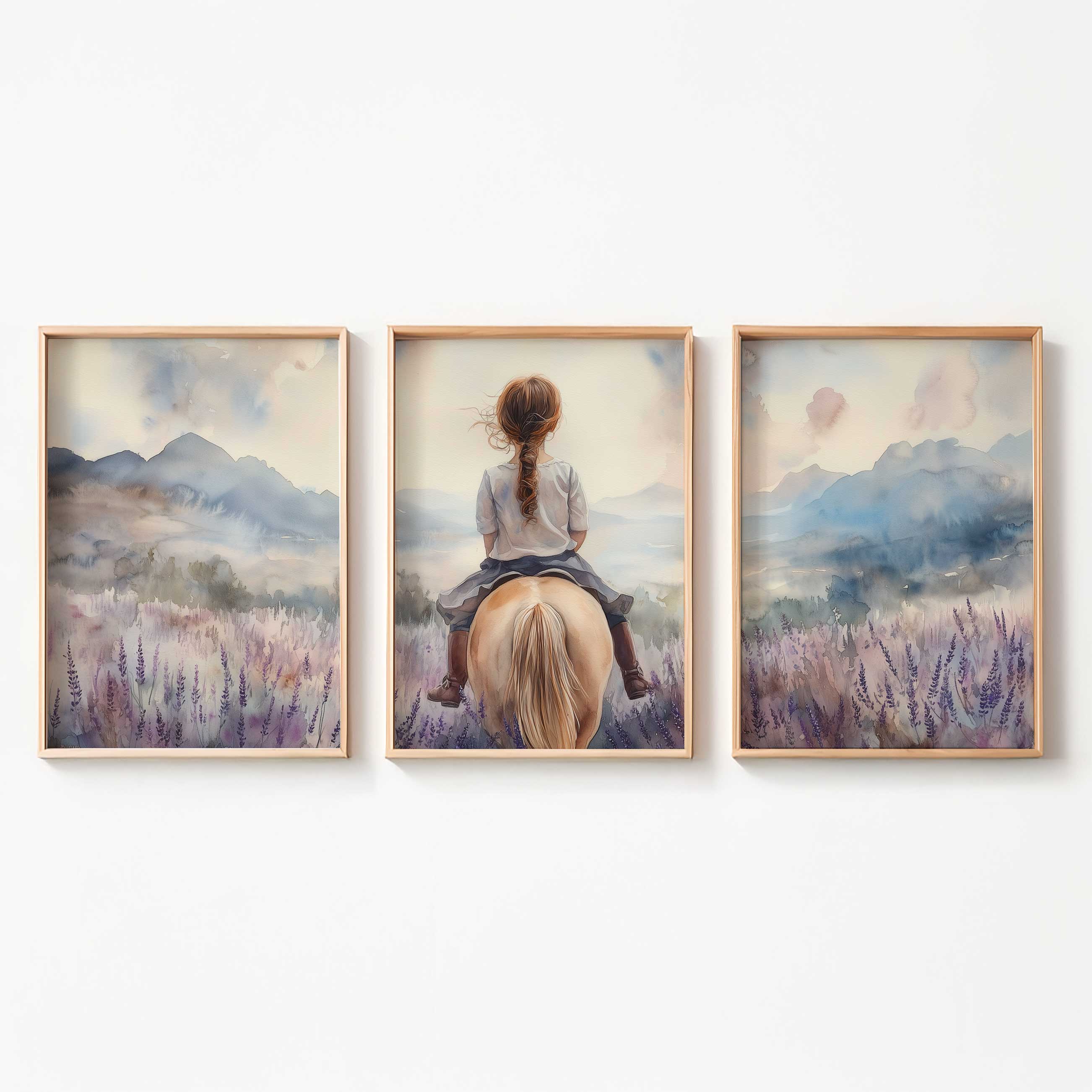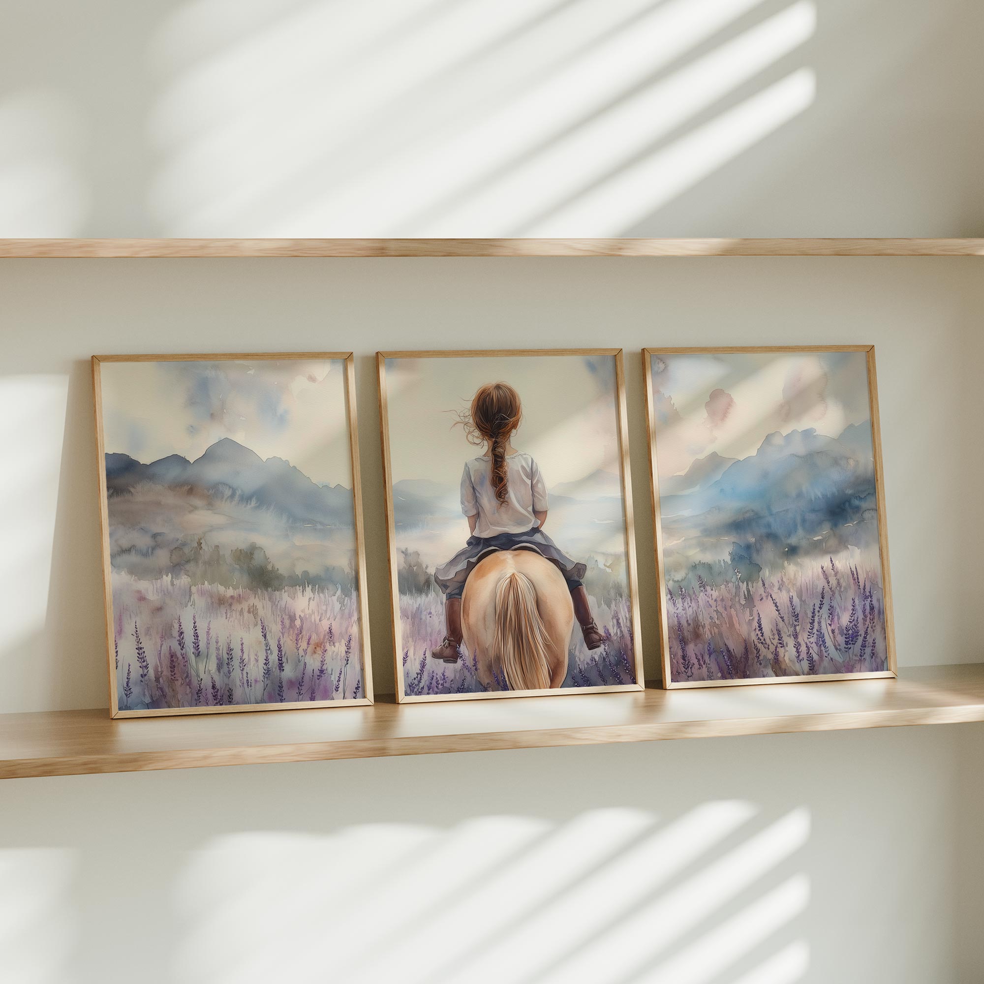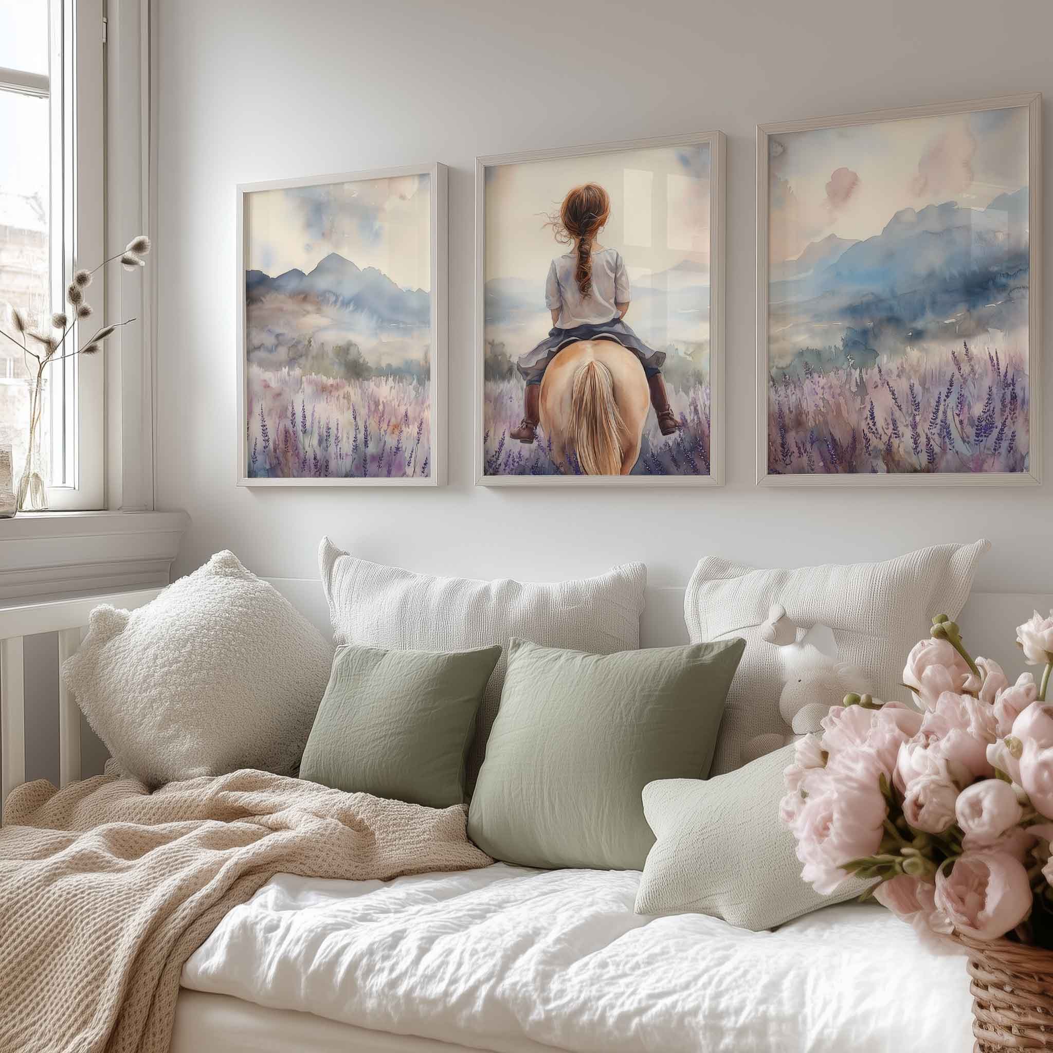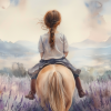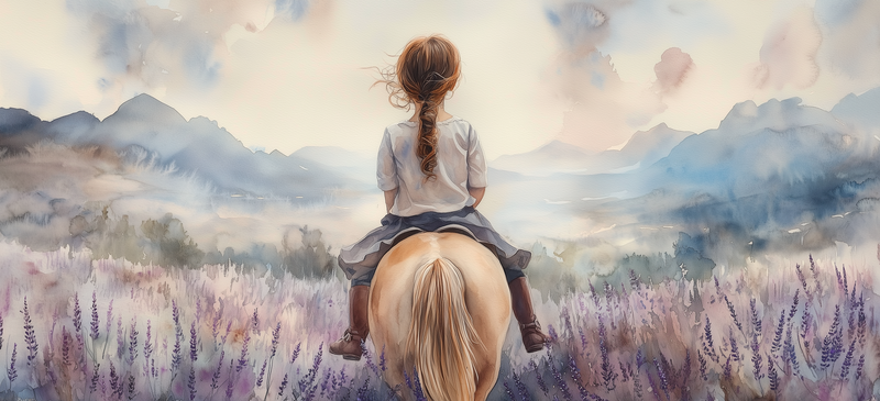 Lavendel Droom: Meisje en Paard in Berglandschap