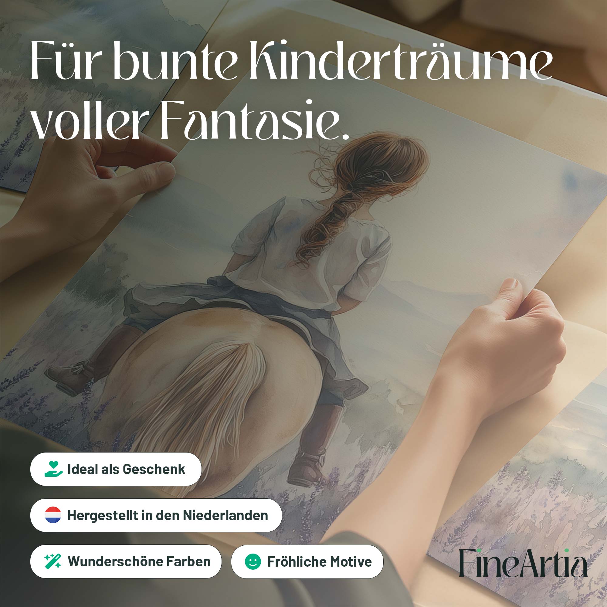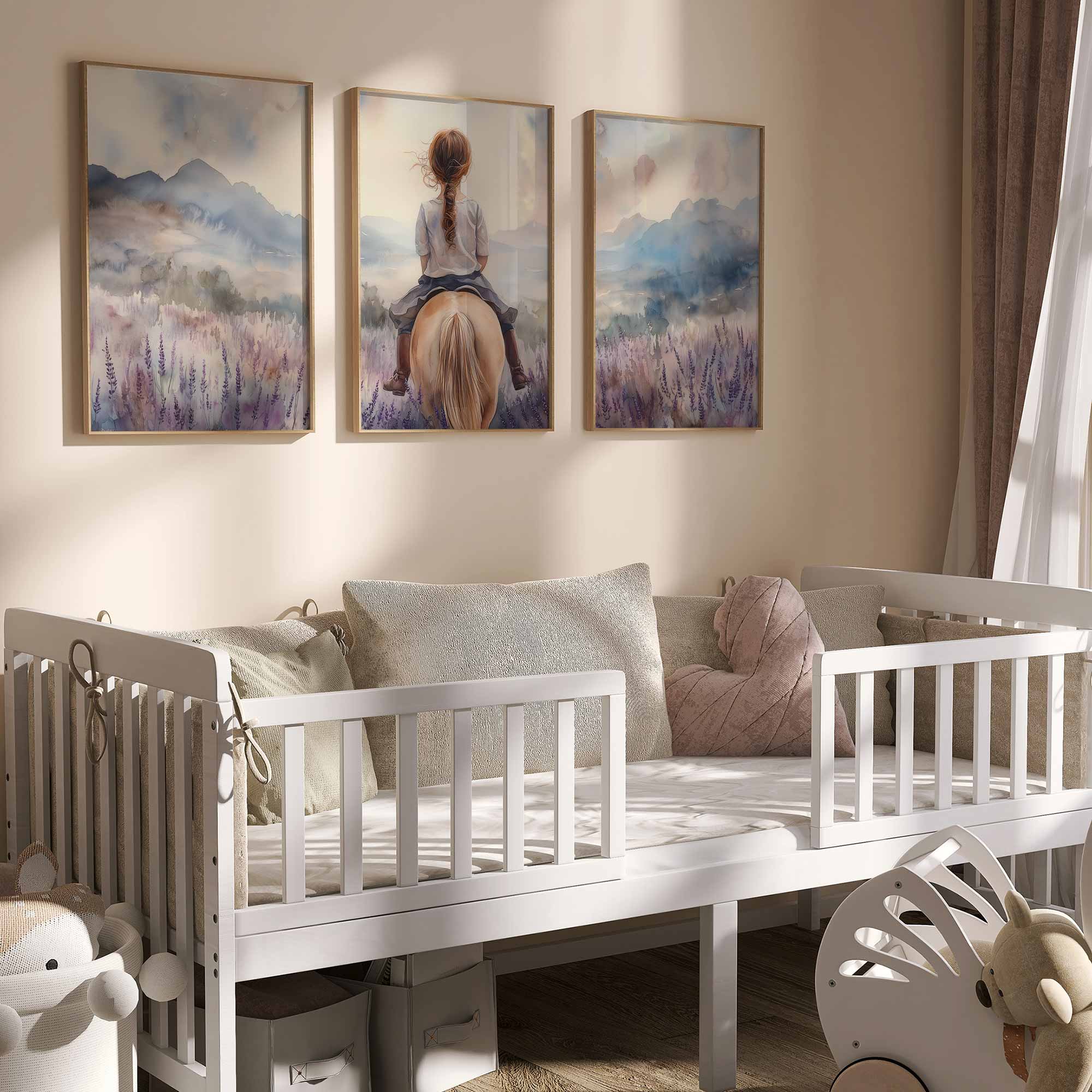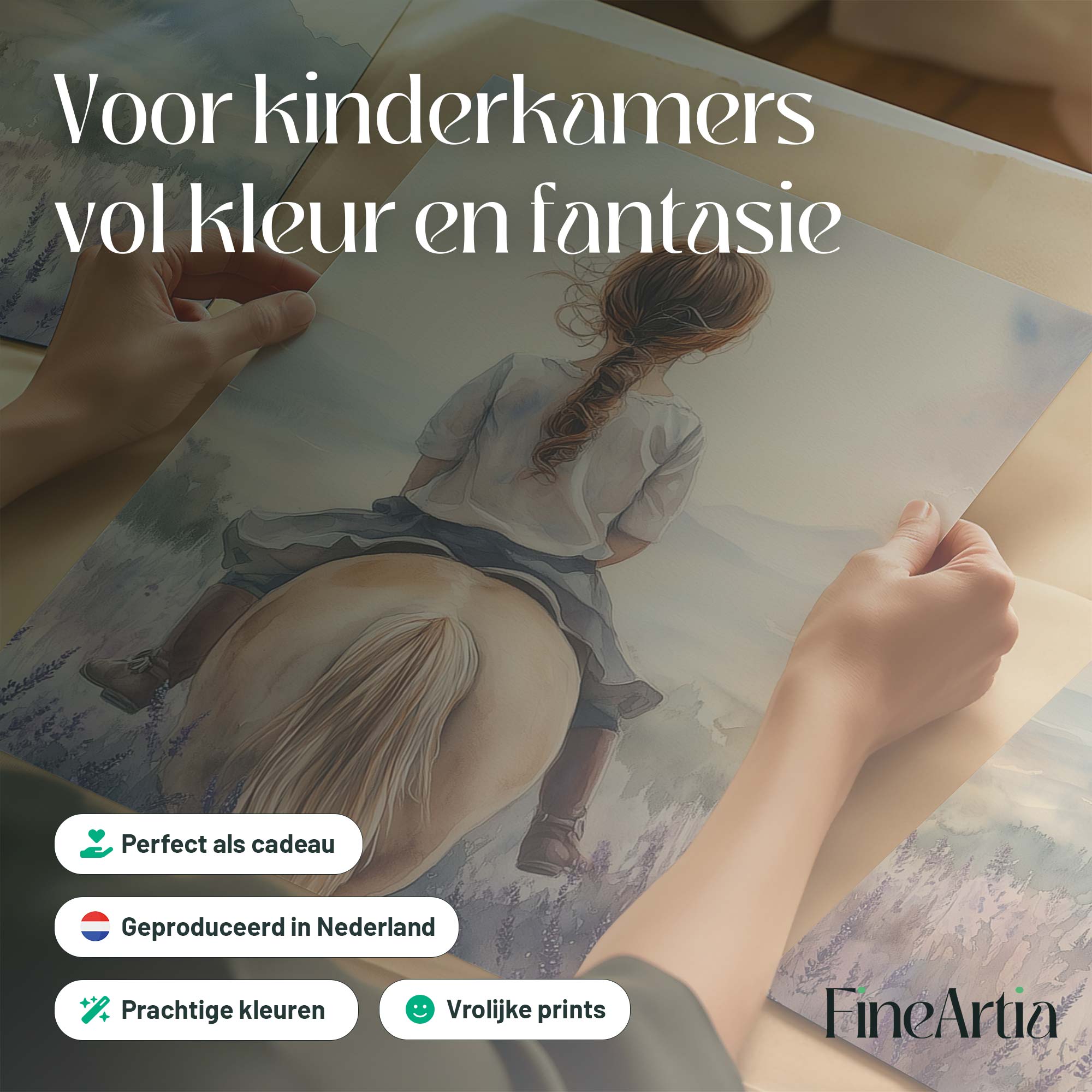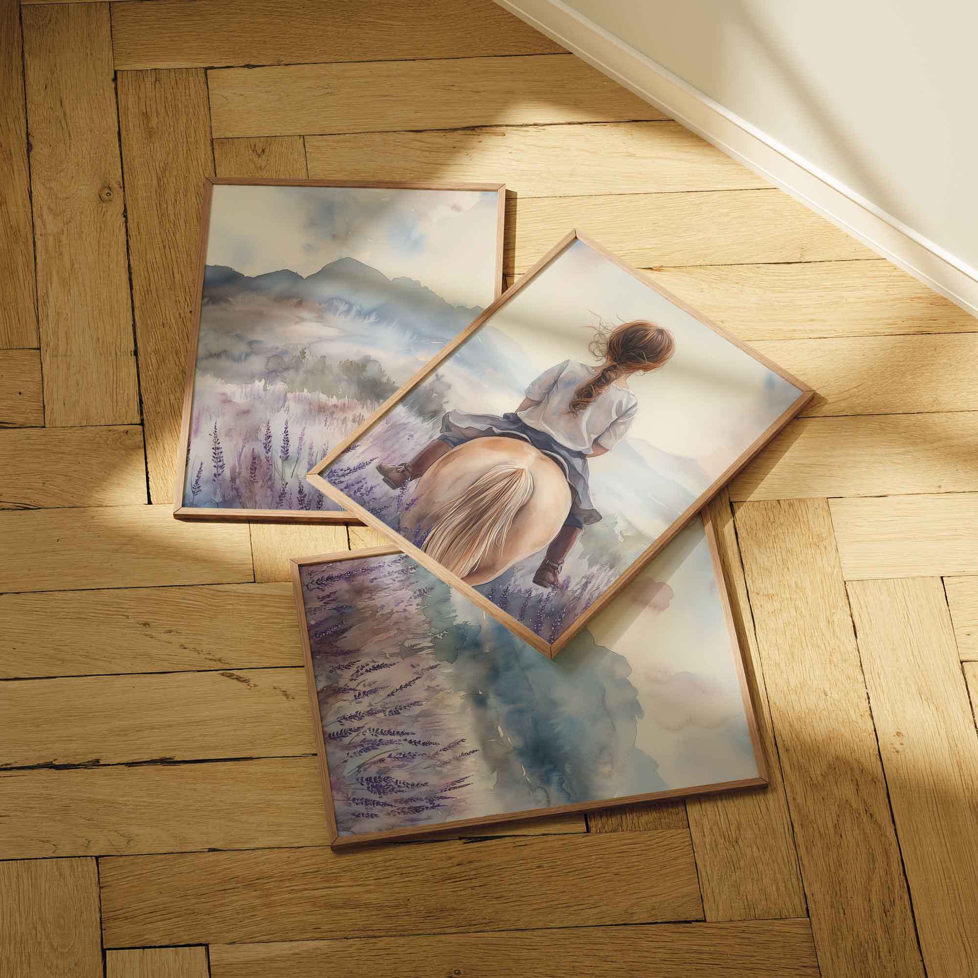 Lavendel Droom: Meisje en Paard in Berglandschap