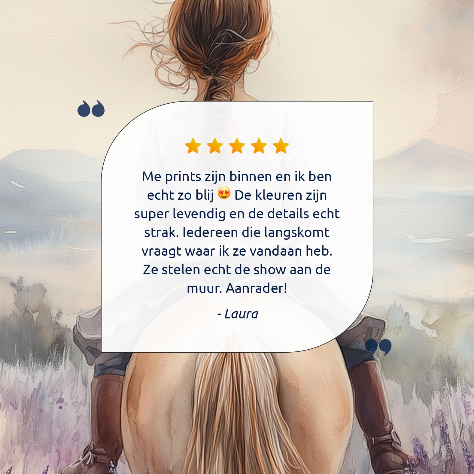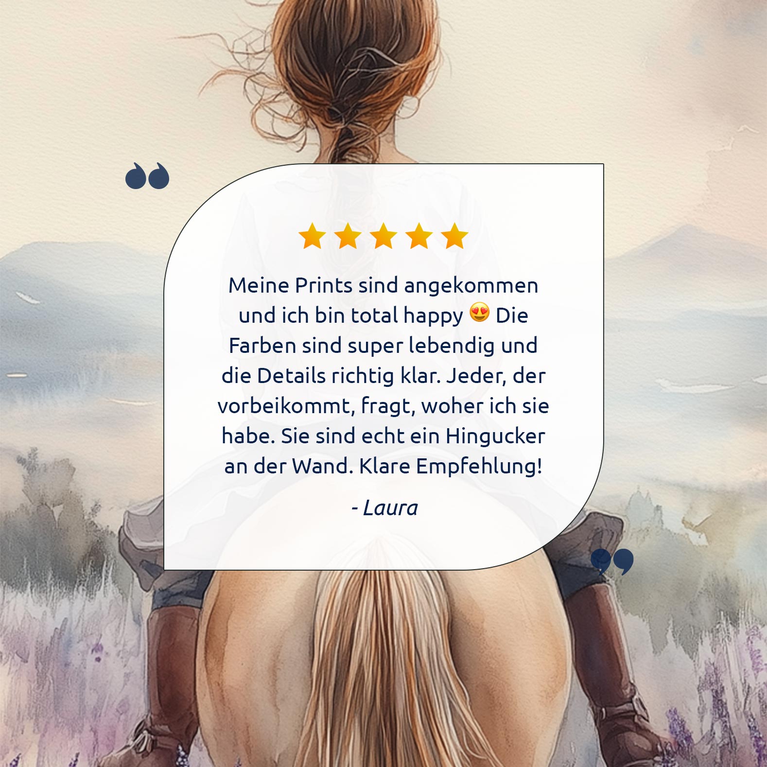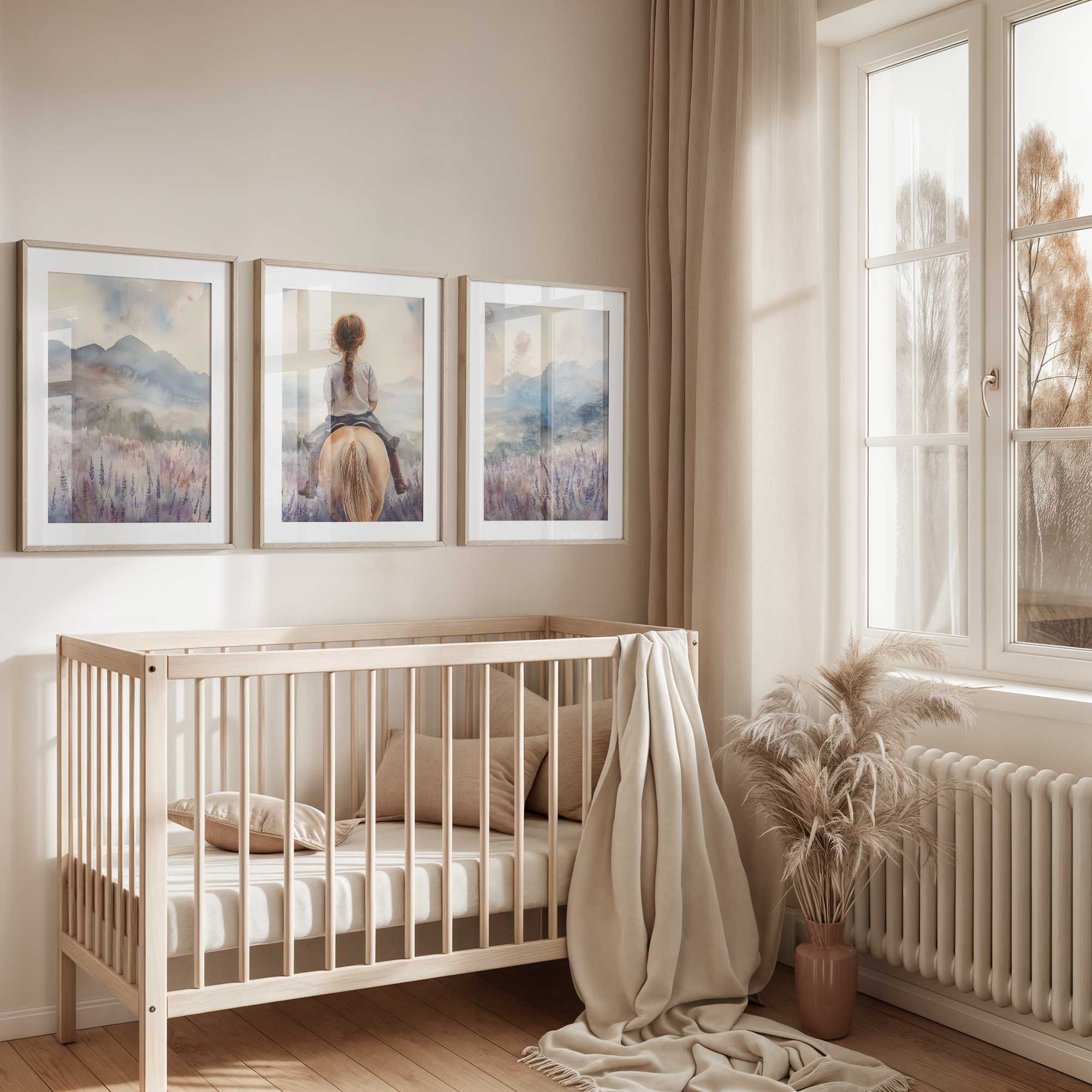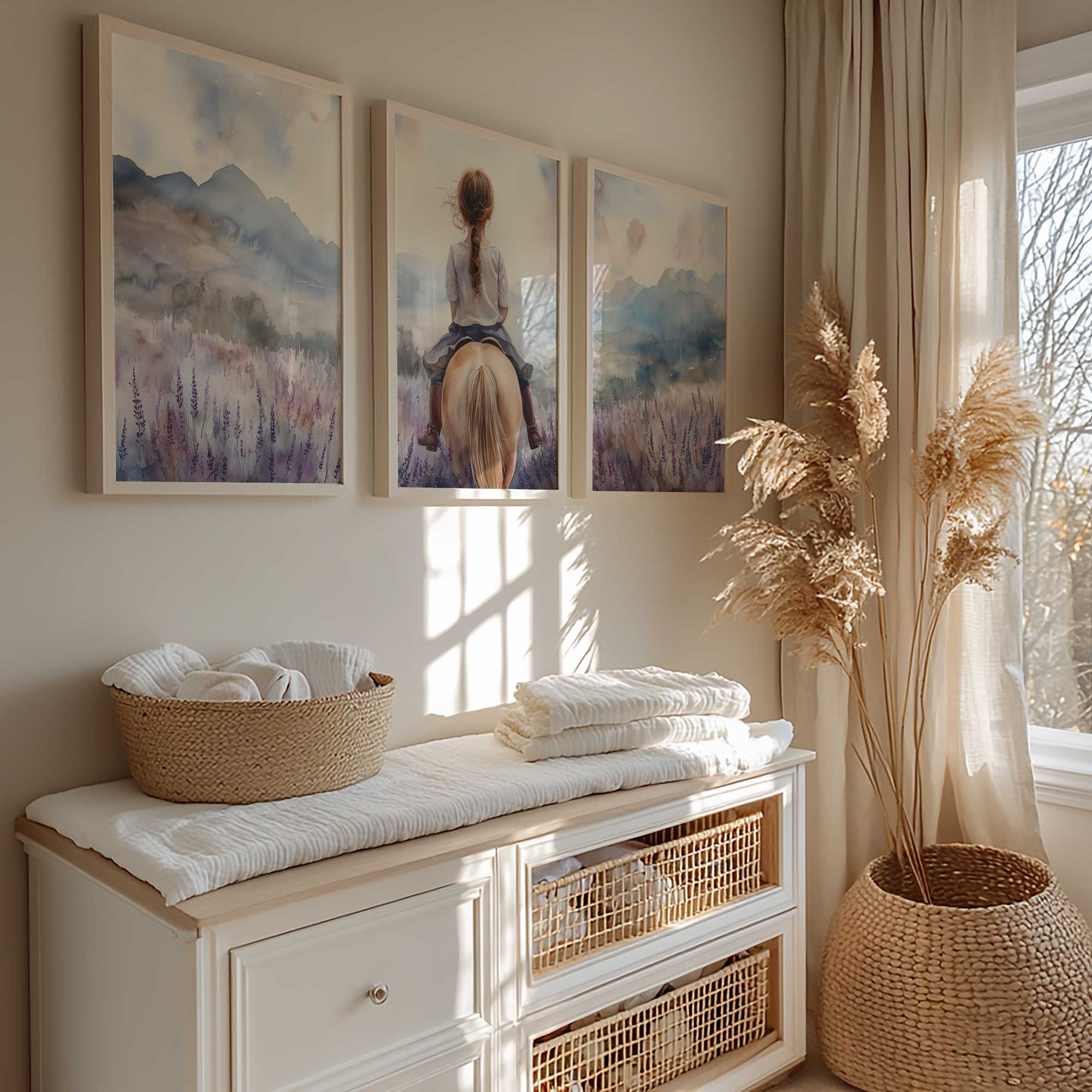 Lavendel Droom: Meisje en Paard in Berglandschap