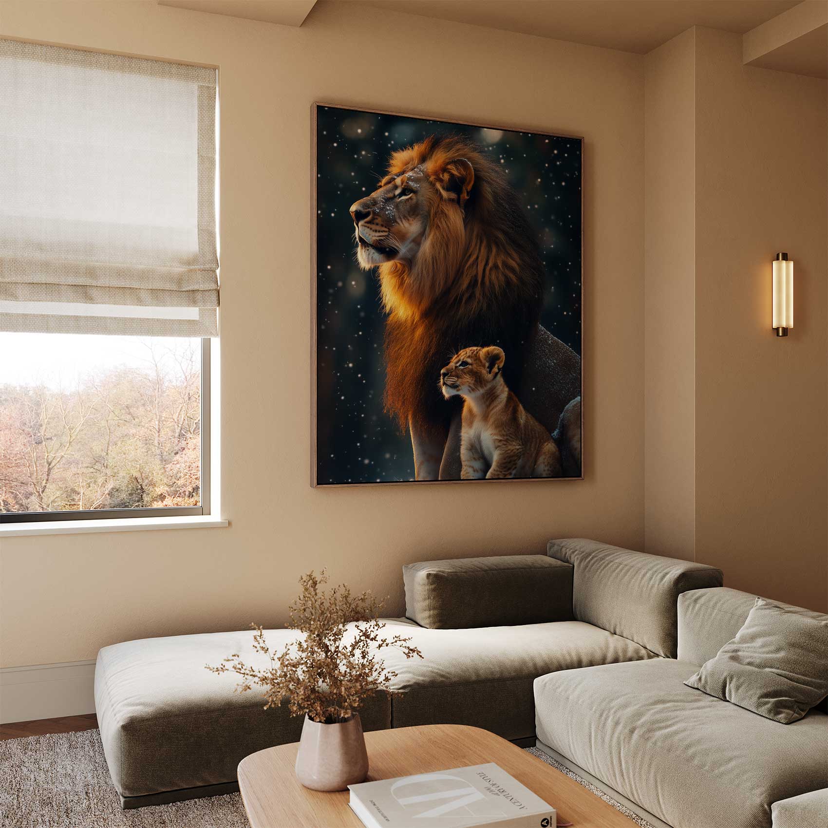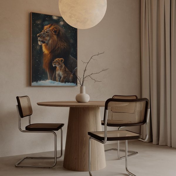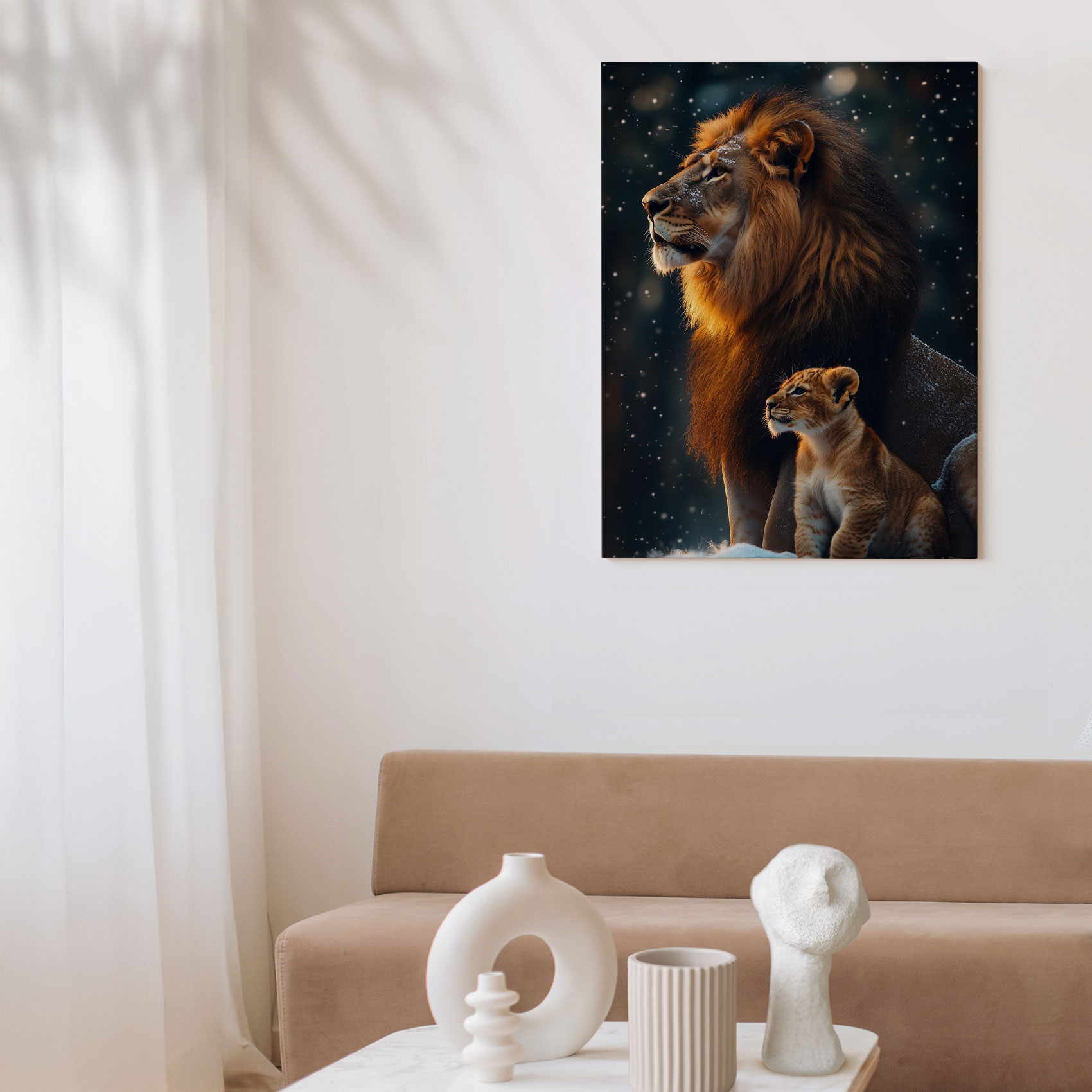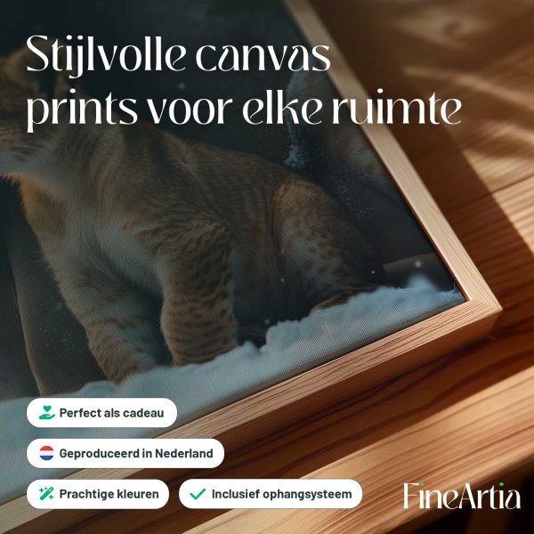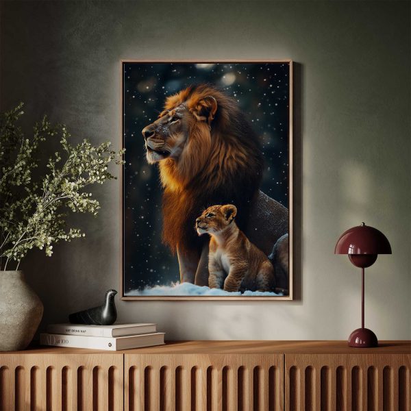 Terug naar collectie Canvas Leeuw en welp in besneeuwd bos
