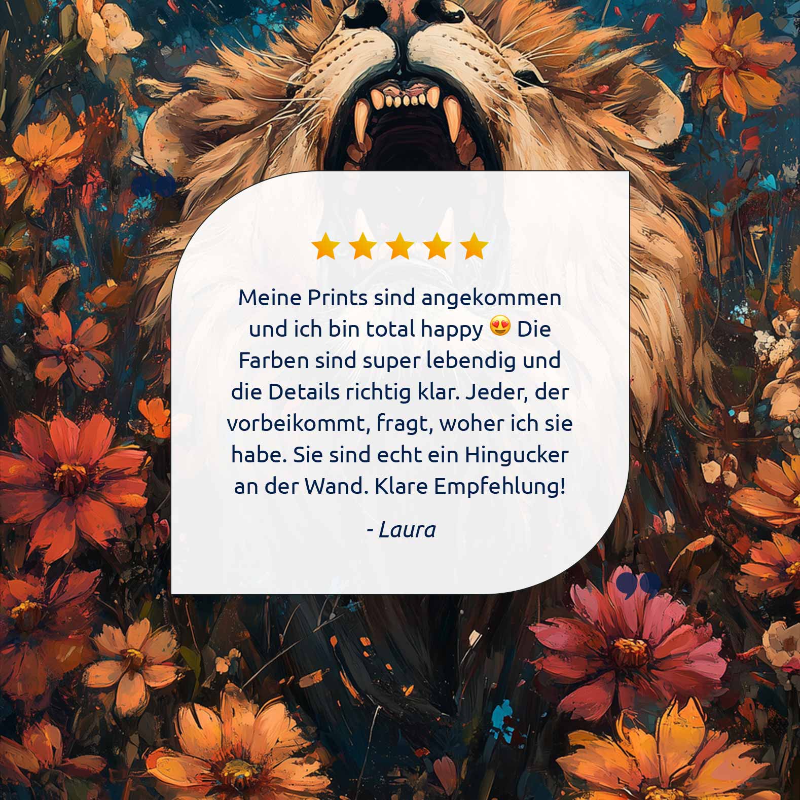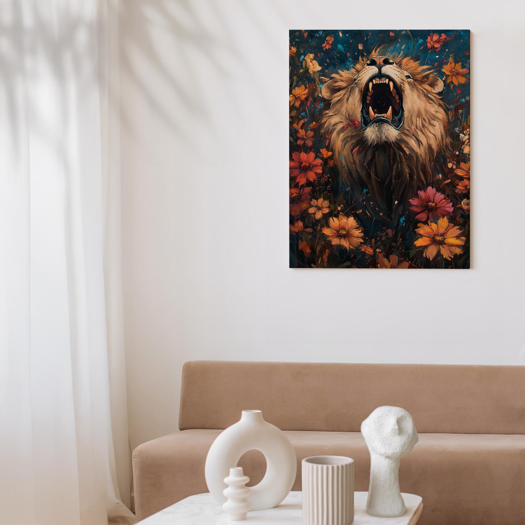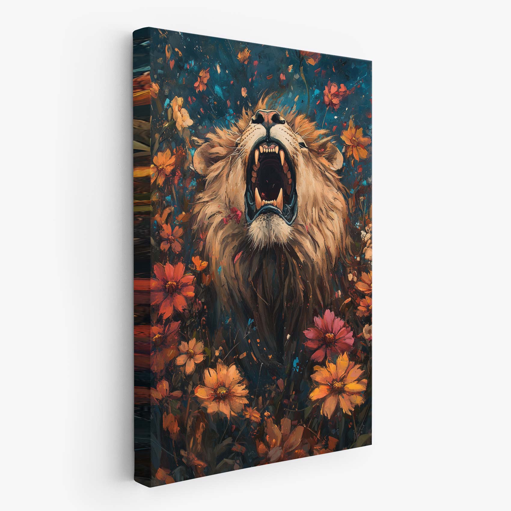 Leeuw omringd door bloemenpracht