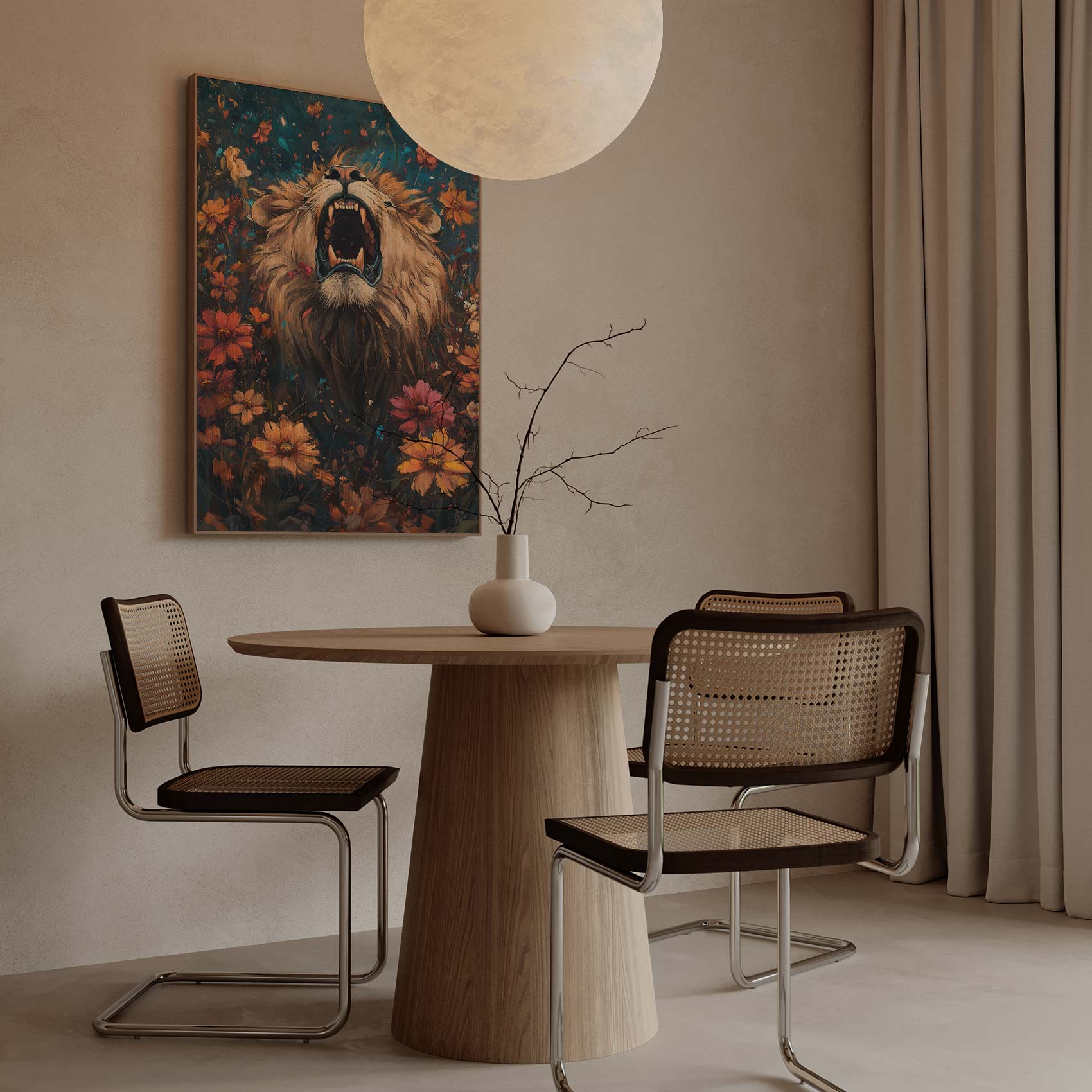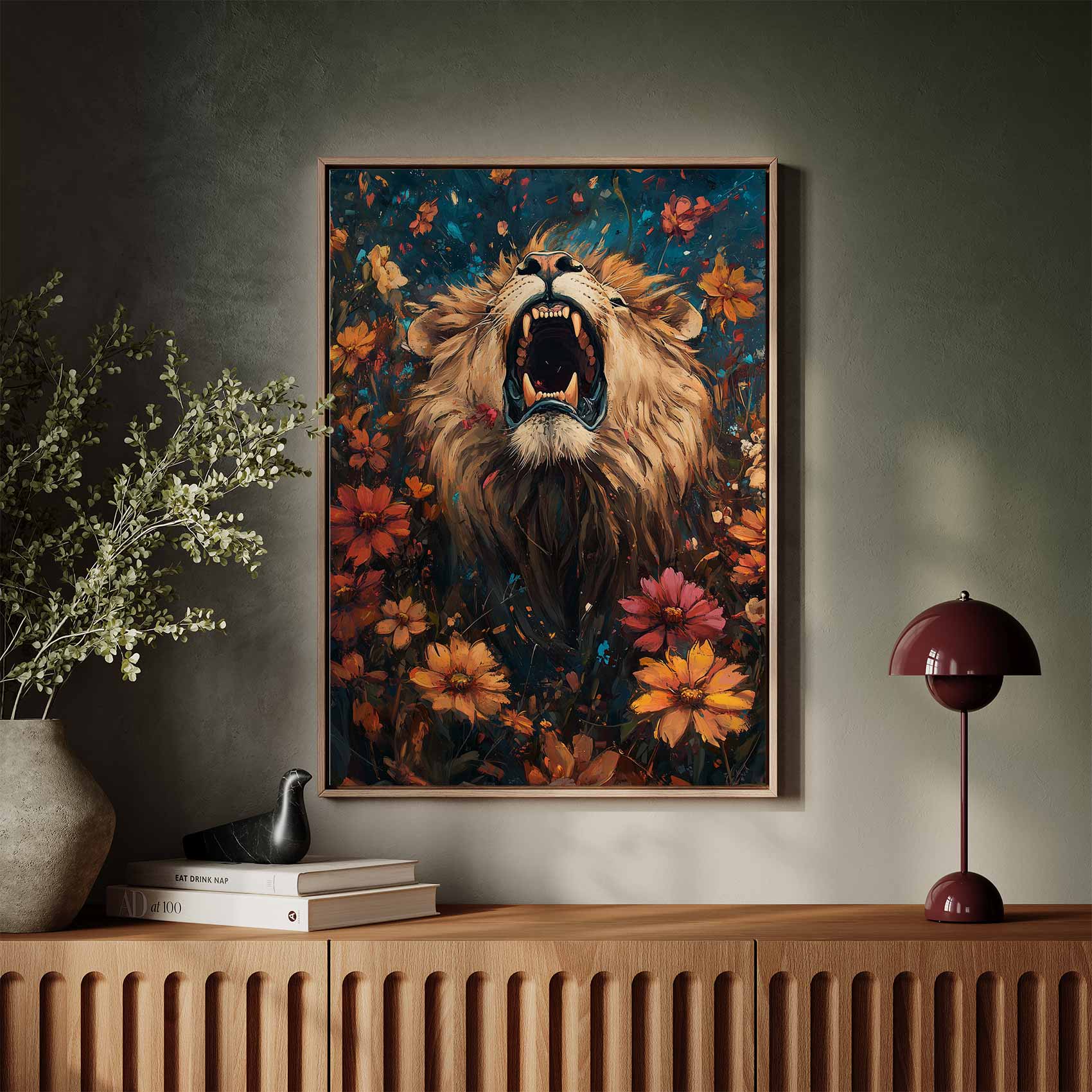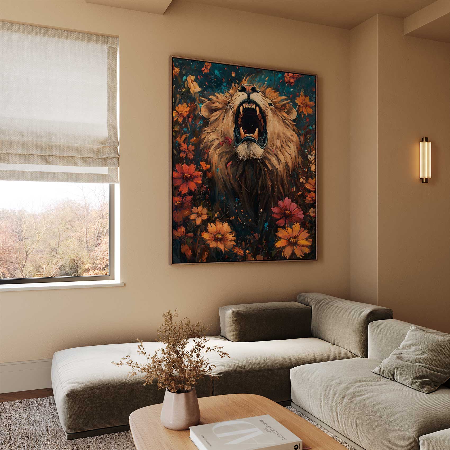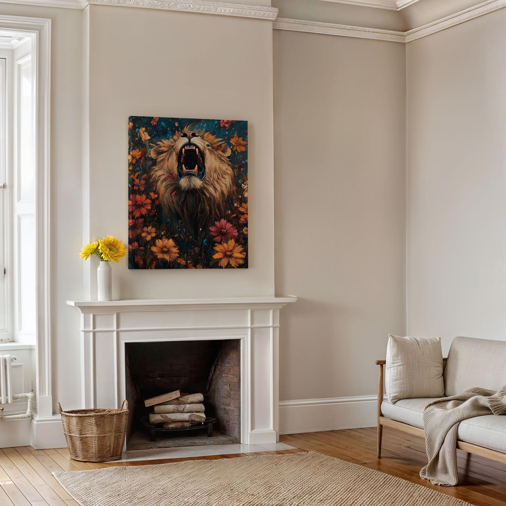 Leeuw omringd door bloemenpracht
