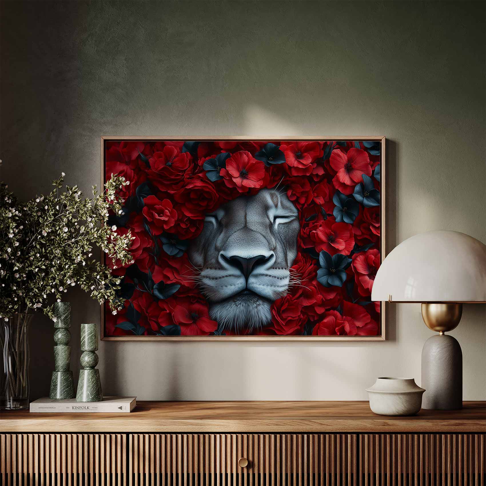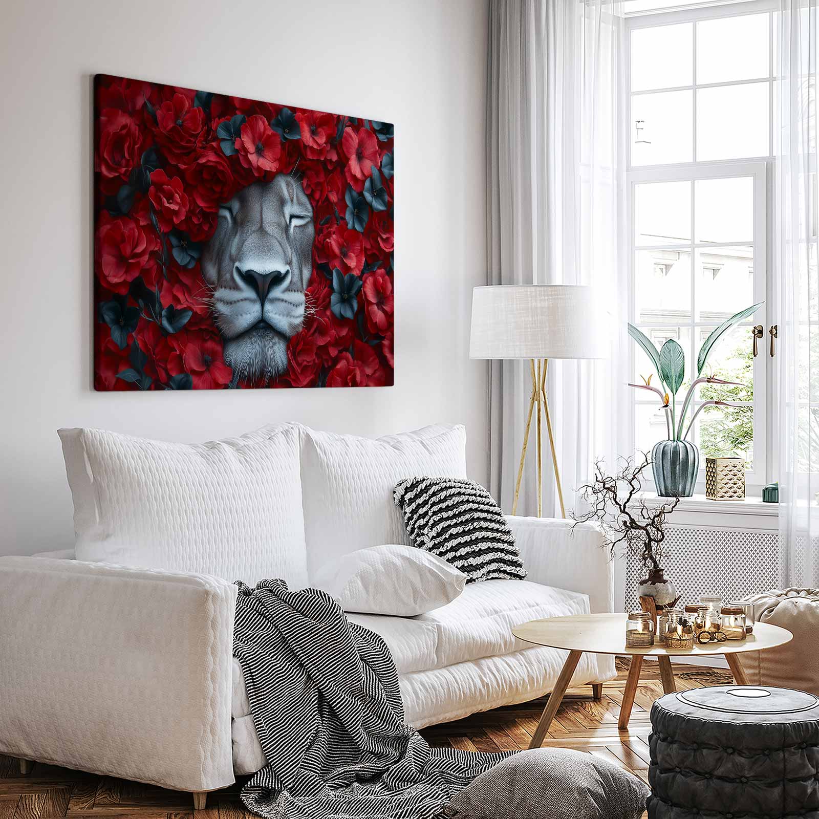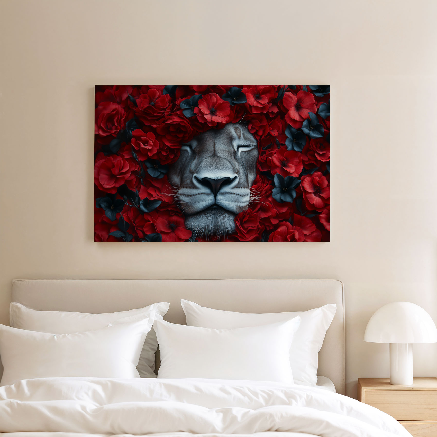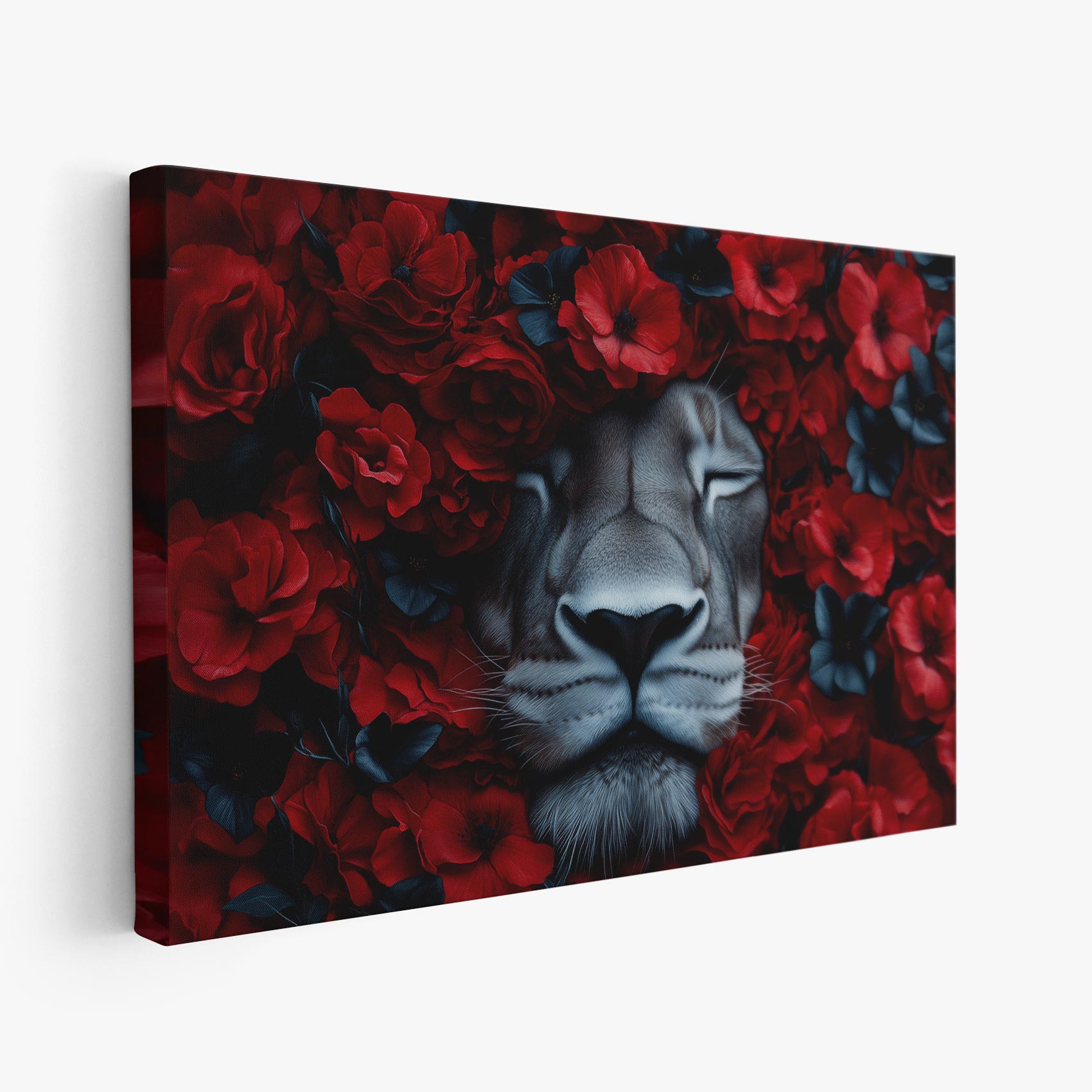 Leeuw tussen rode bloemen