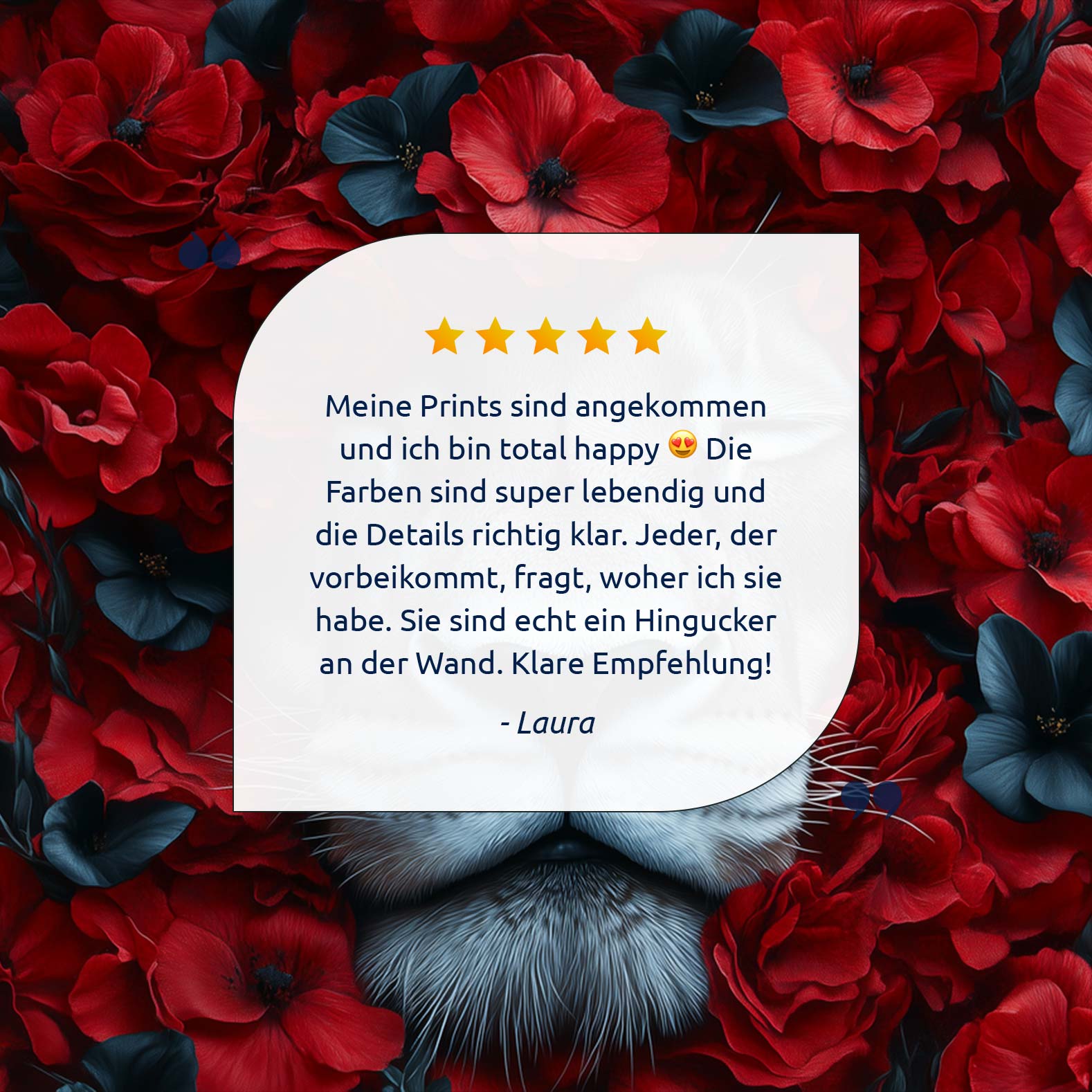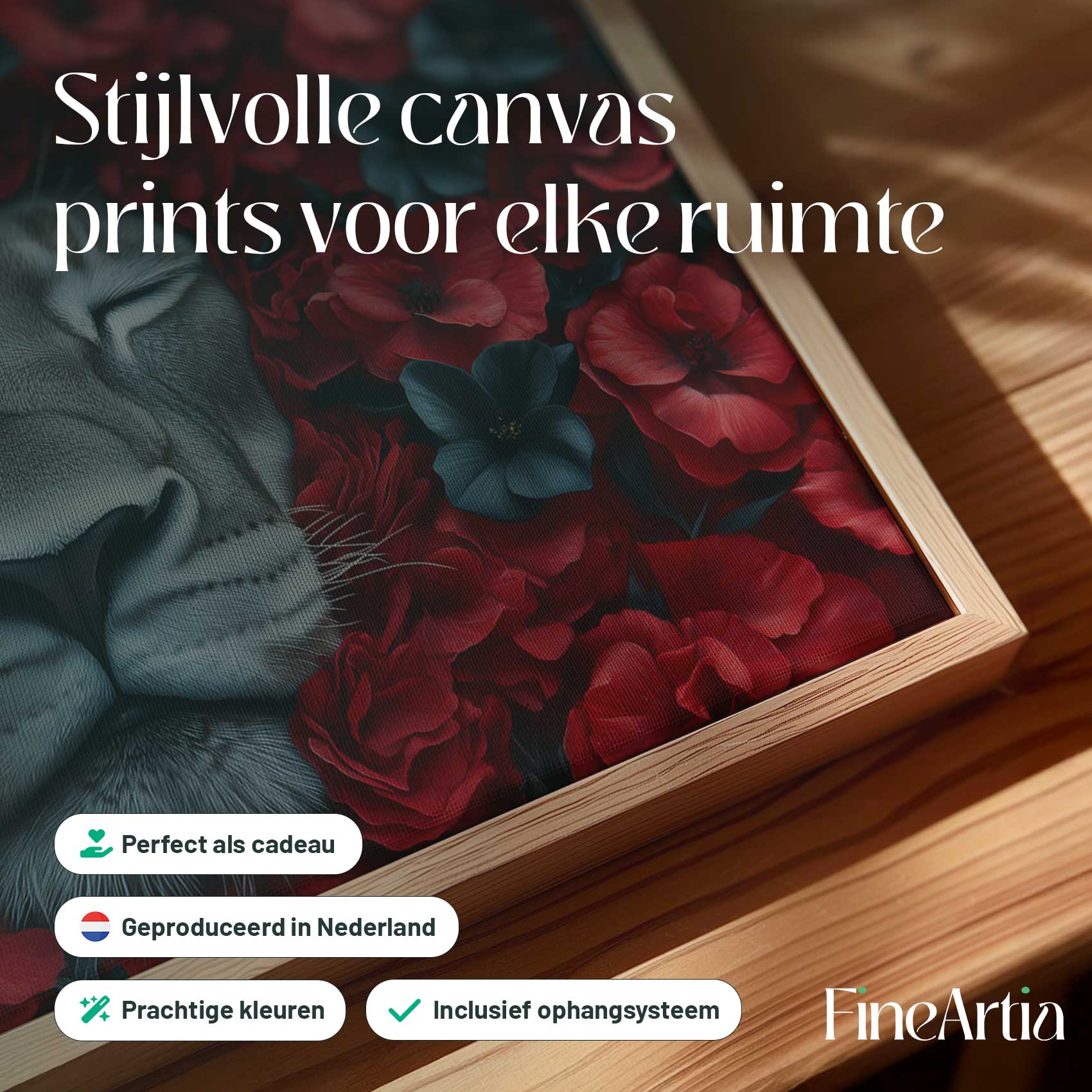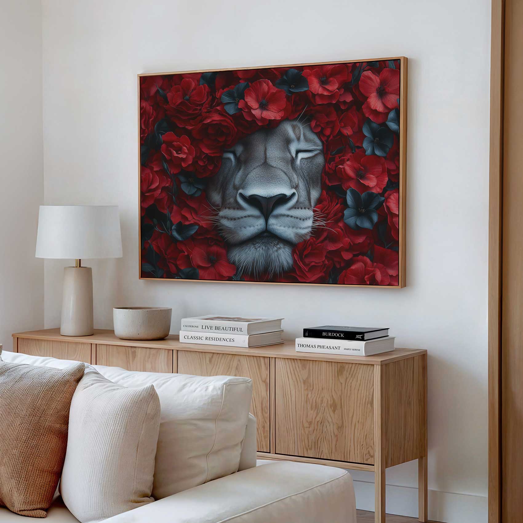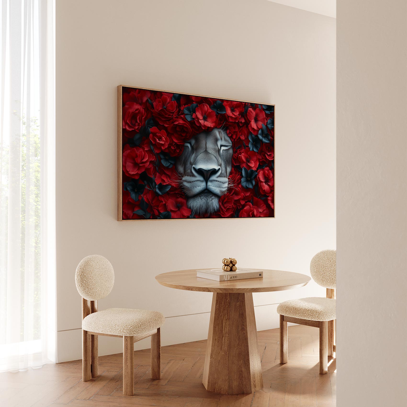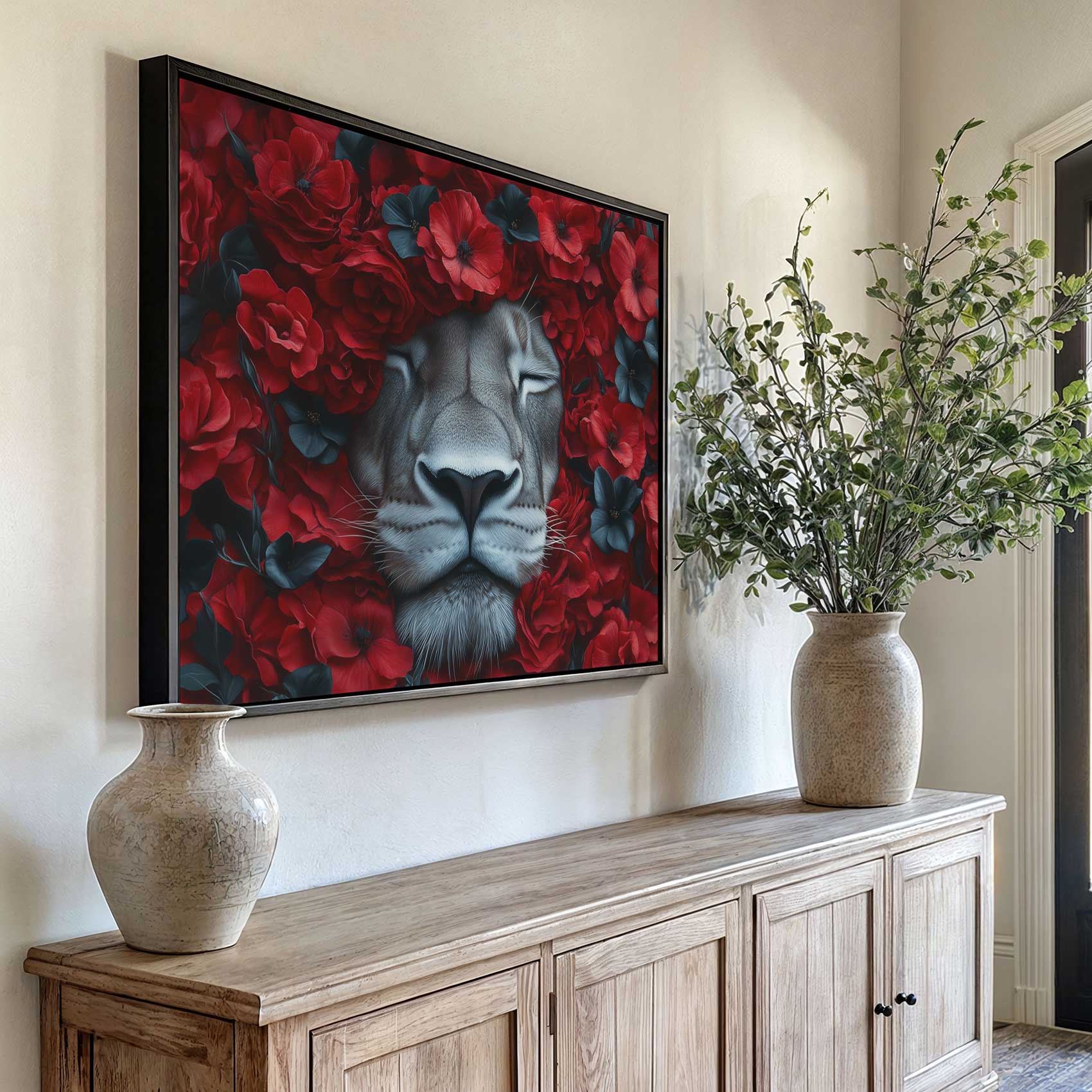 Leeuw tussen rode bloemen