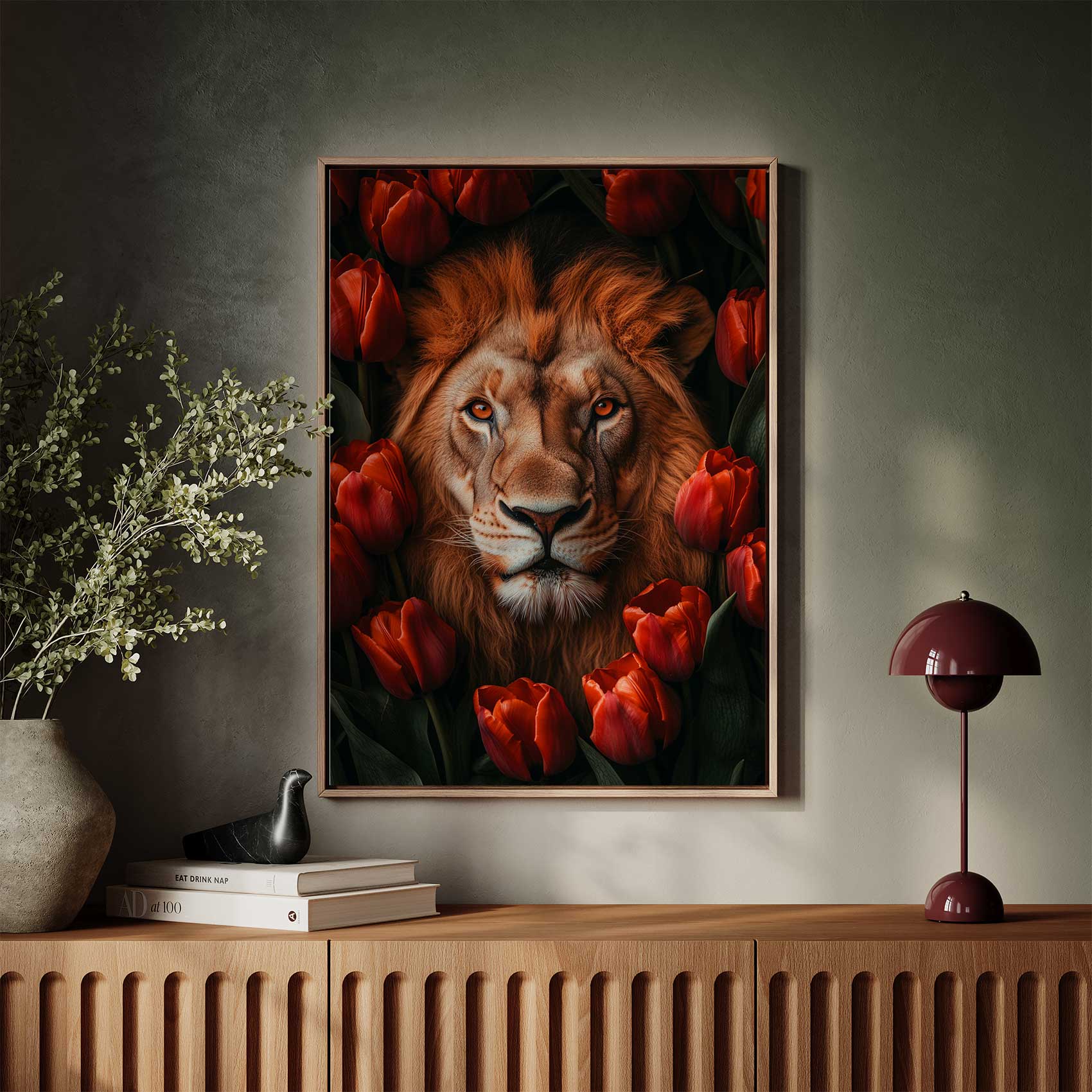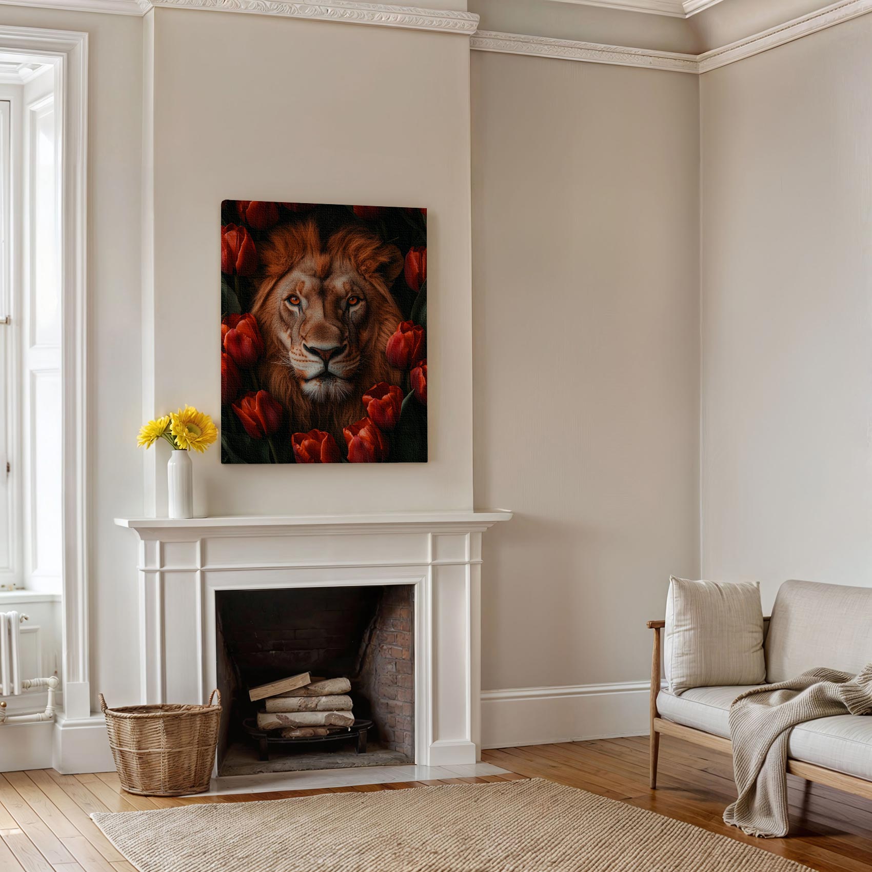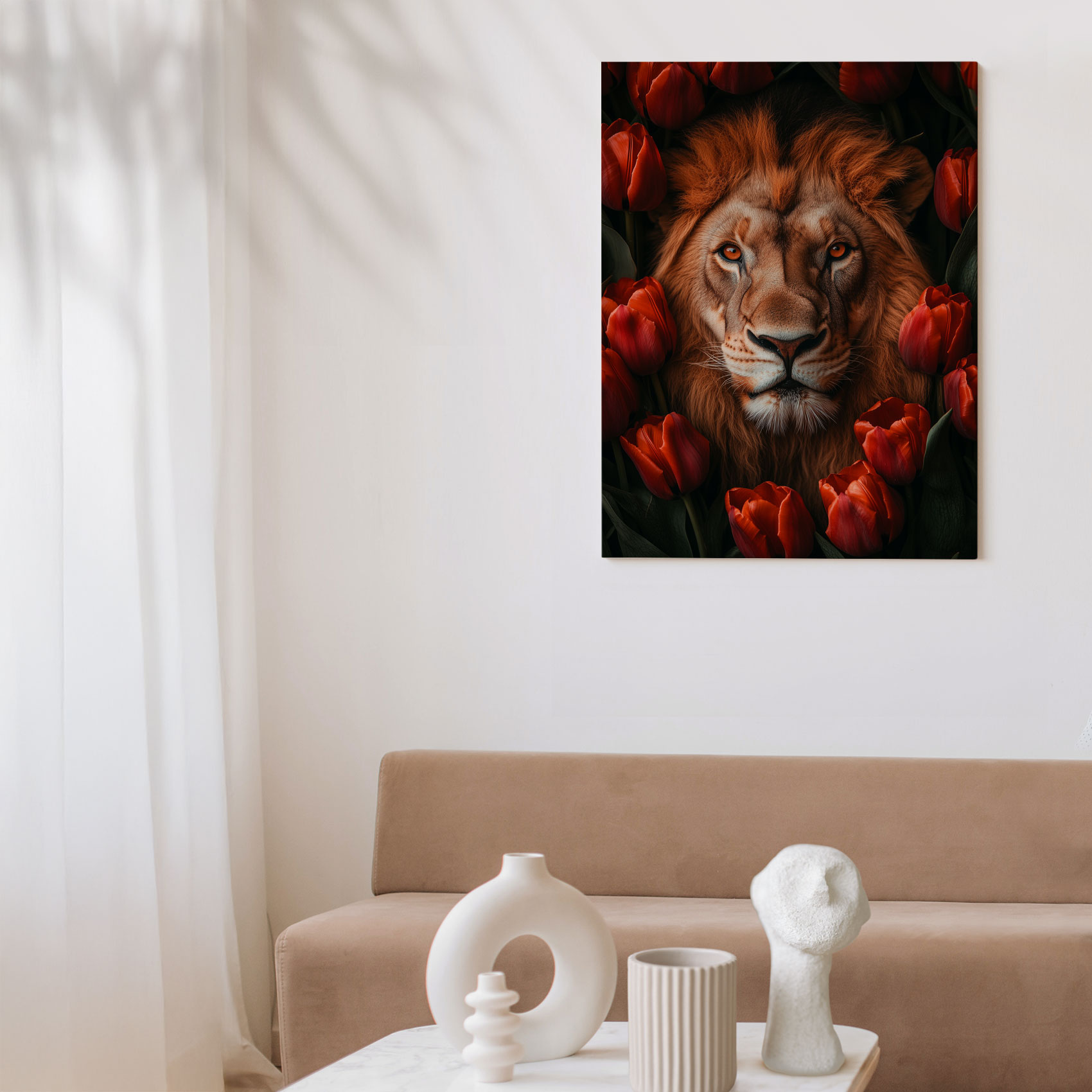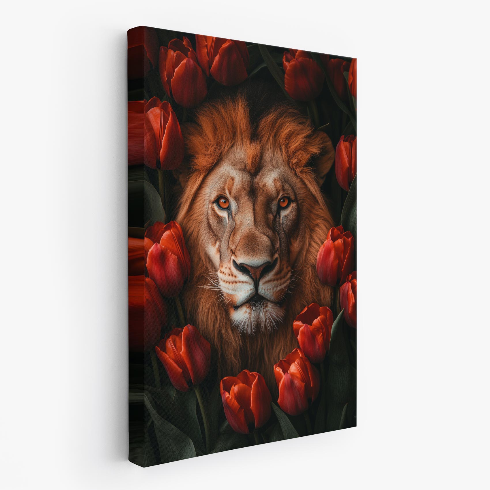 Terug naar collectie Canvas Leeuwenkop met rode tulpen
