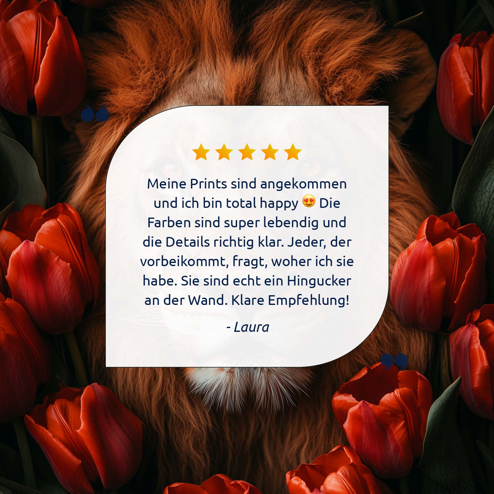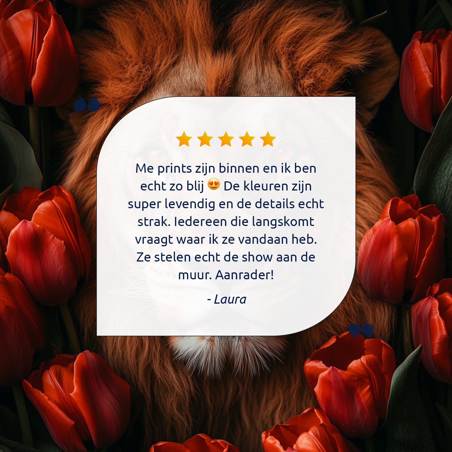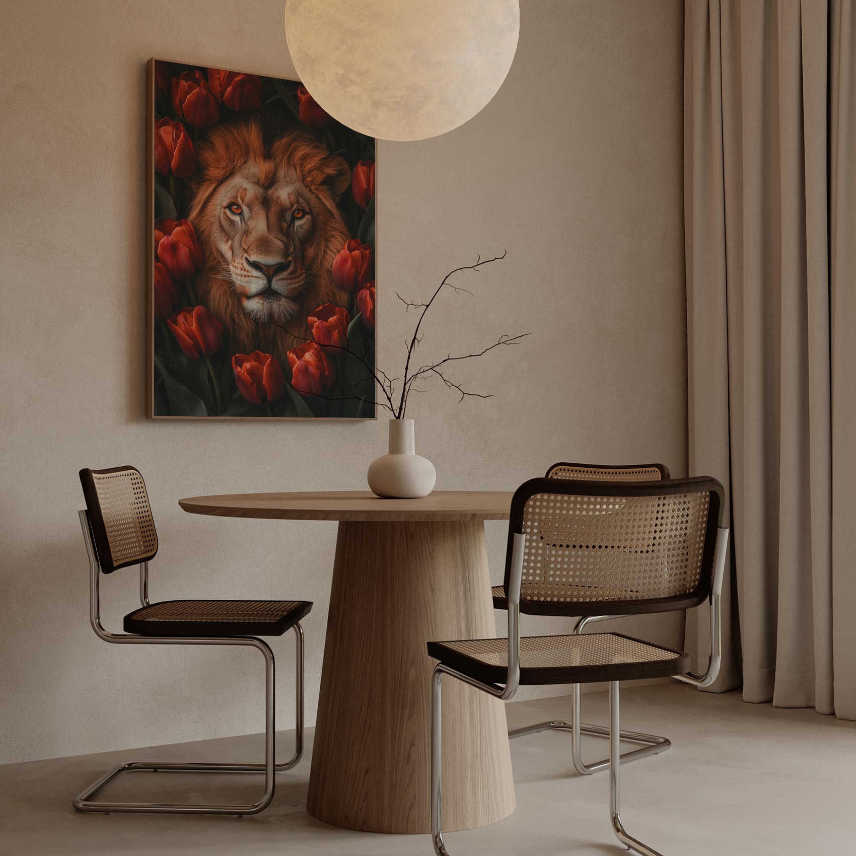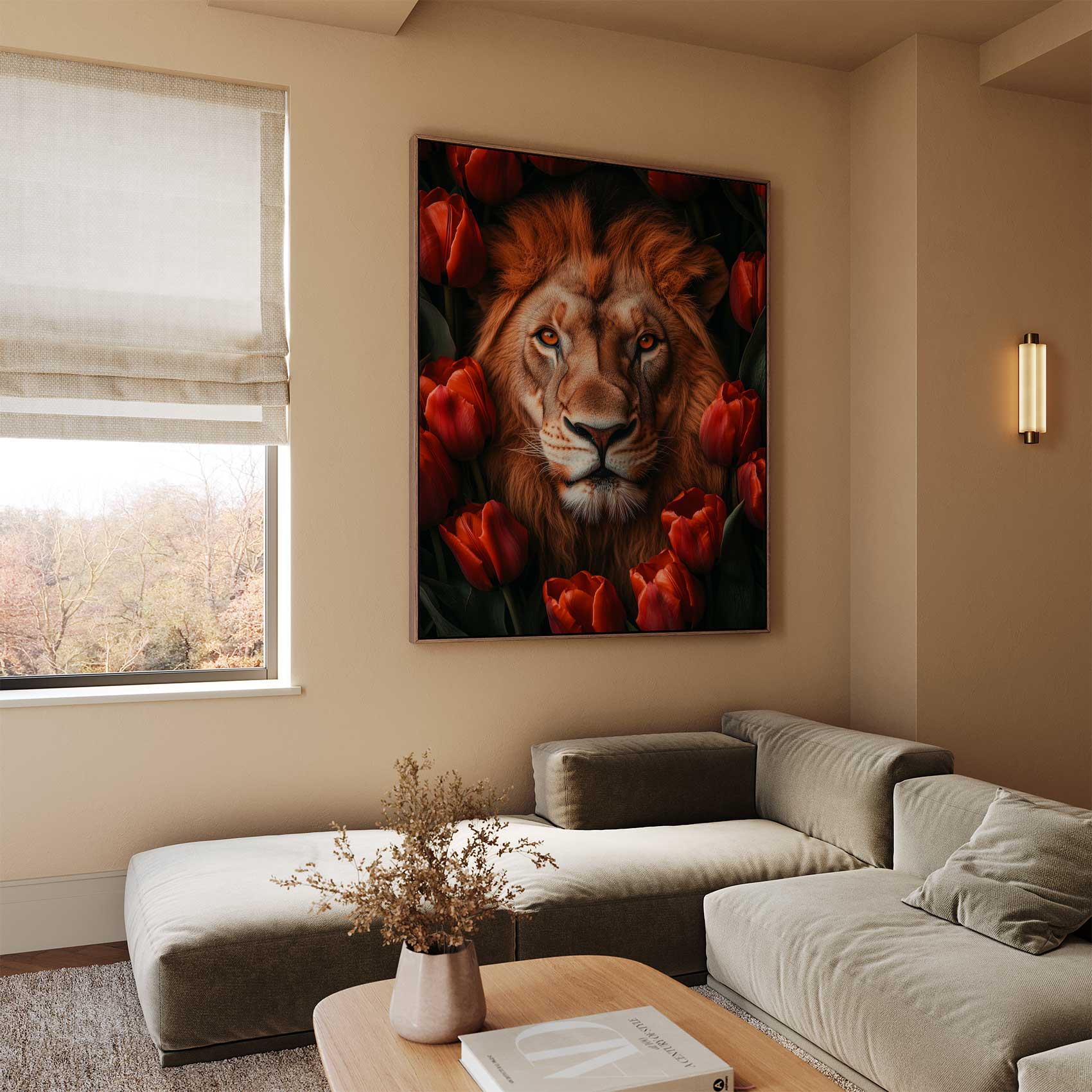 Terug naar collectie Canvas Leeuwenkop met rode tulpen