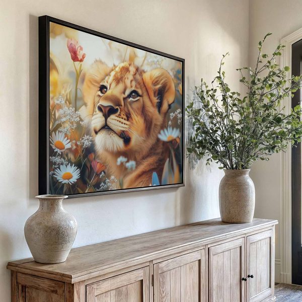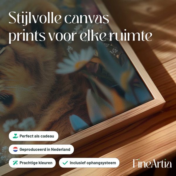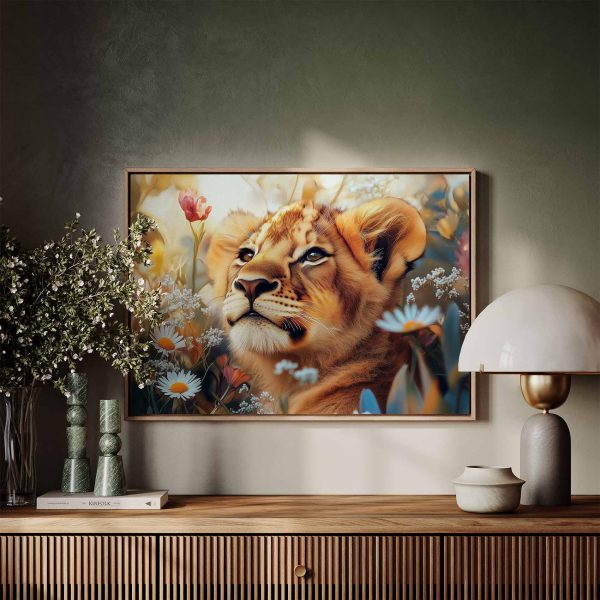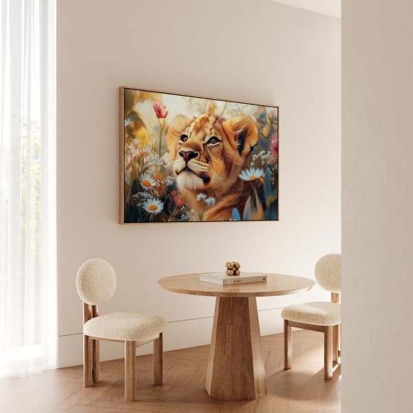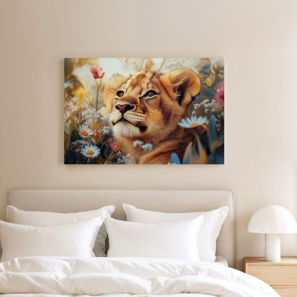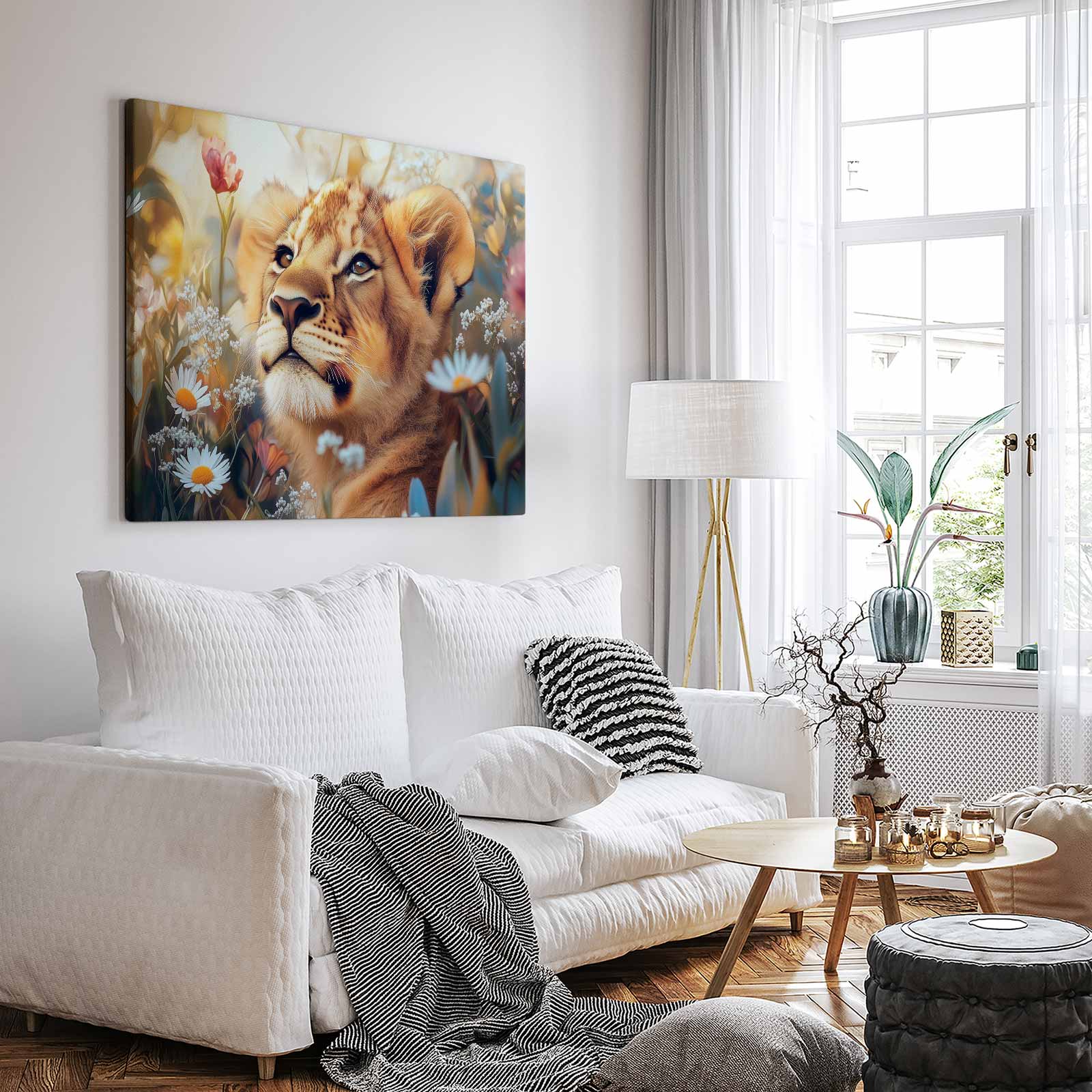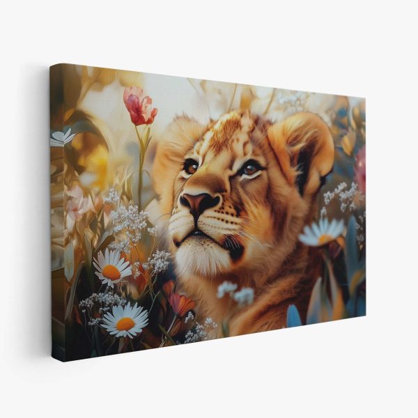 Terug naar collectie Canvas Leeuwenwelp in bloemenveld