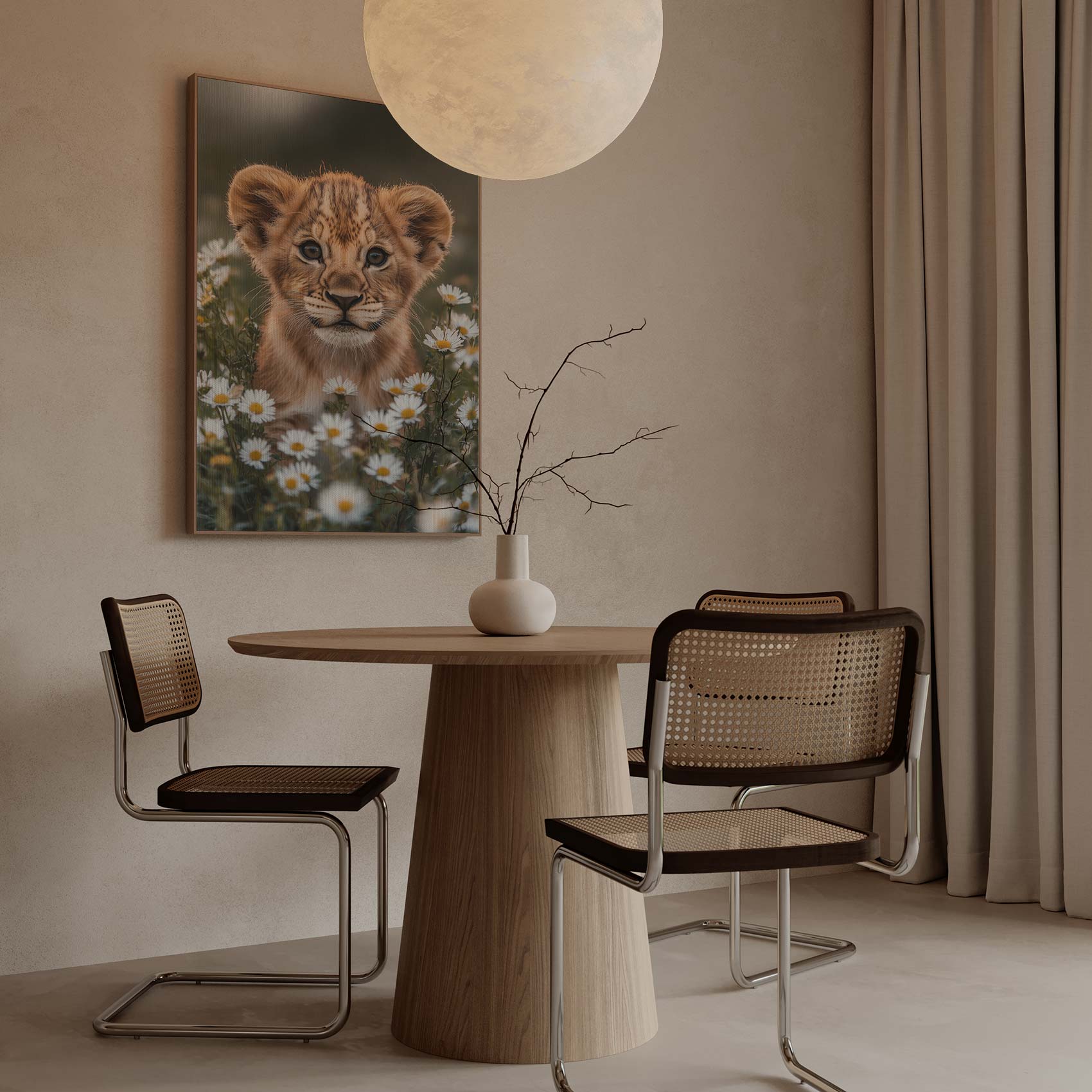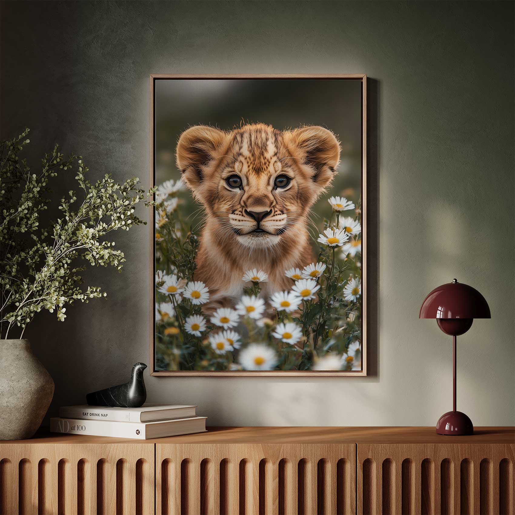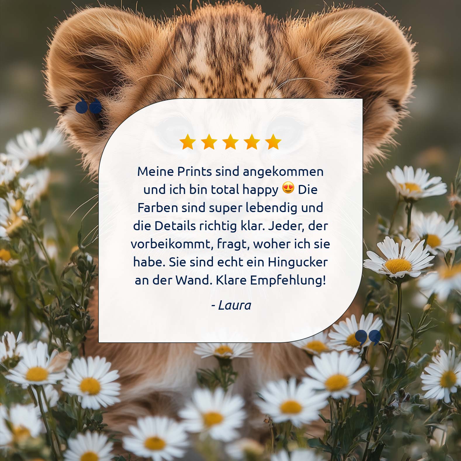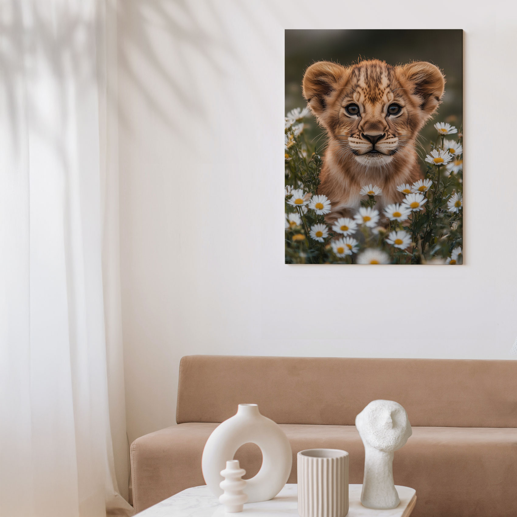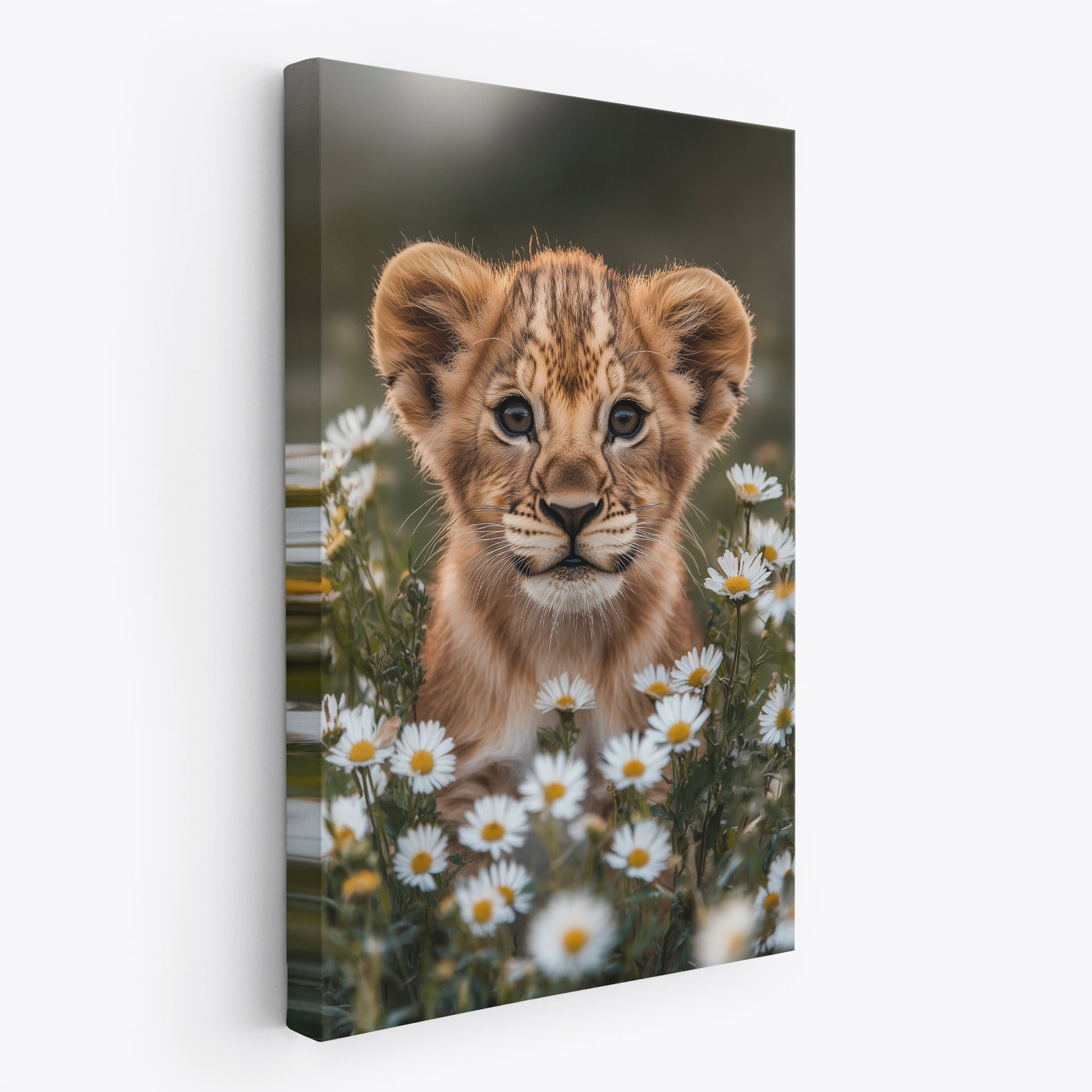 Leeuwenwelp tussen witte madeliefjes