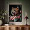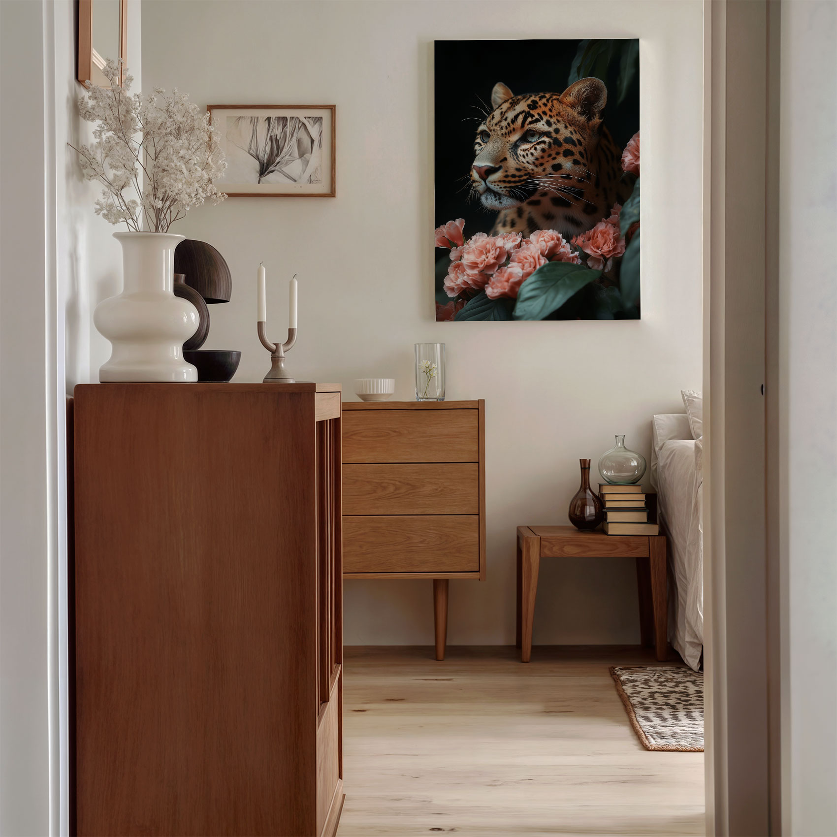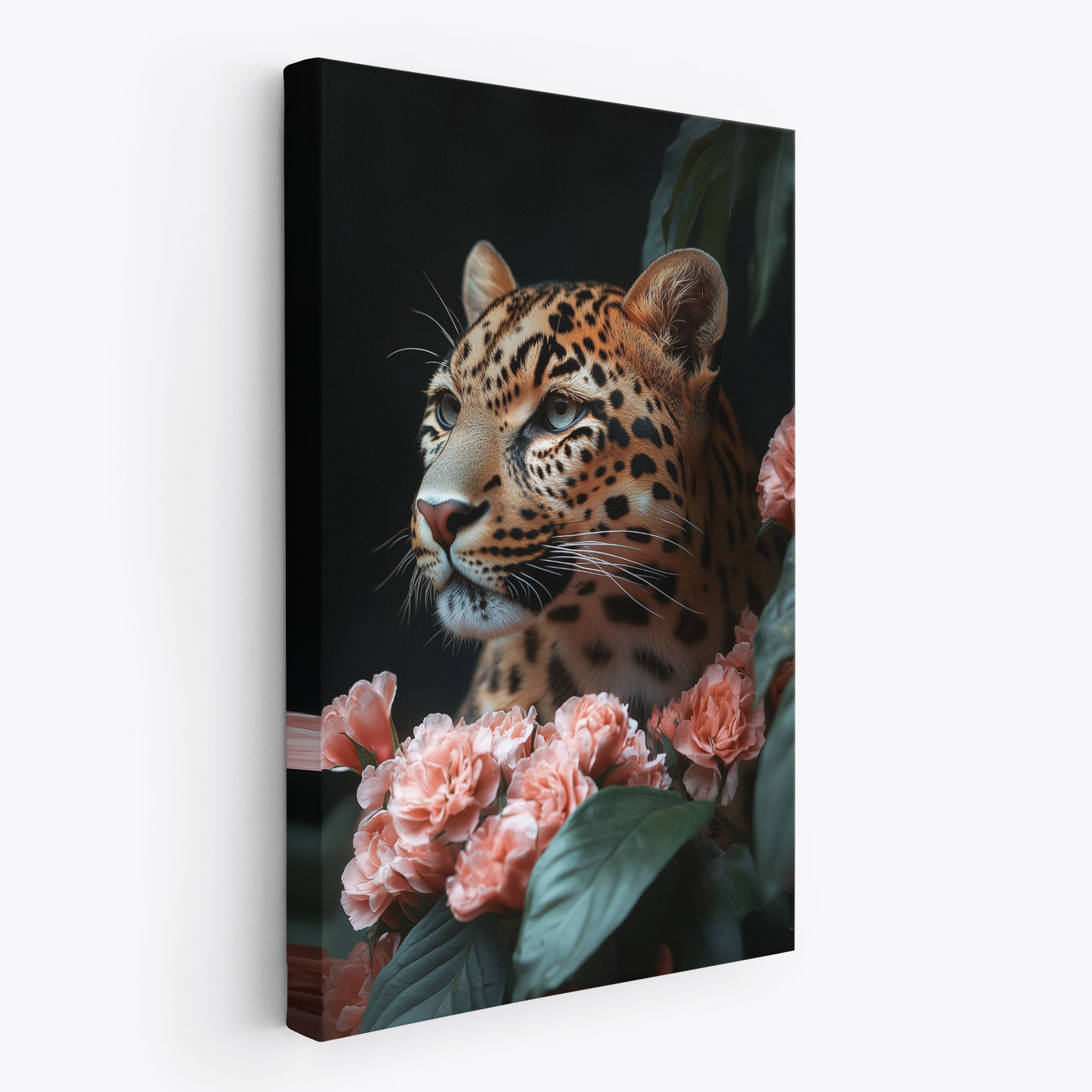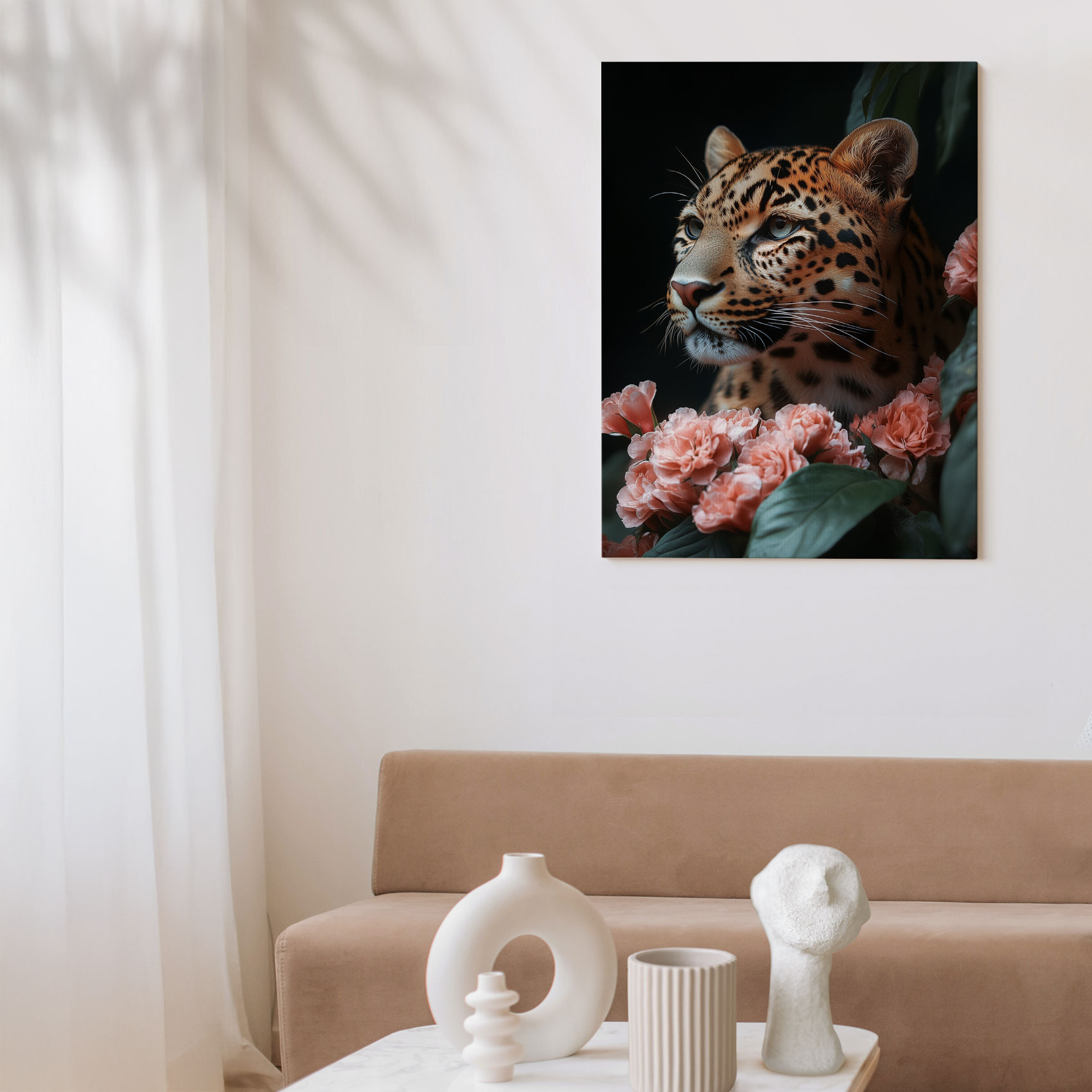 Luipaard tussen roze bloemen