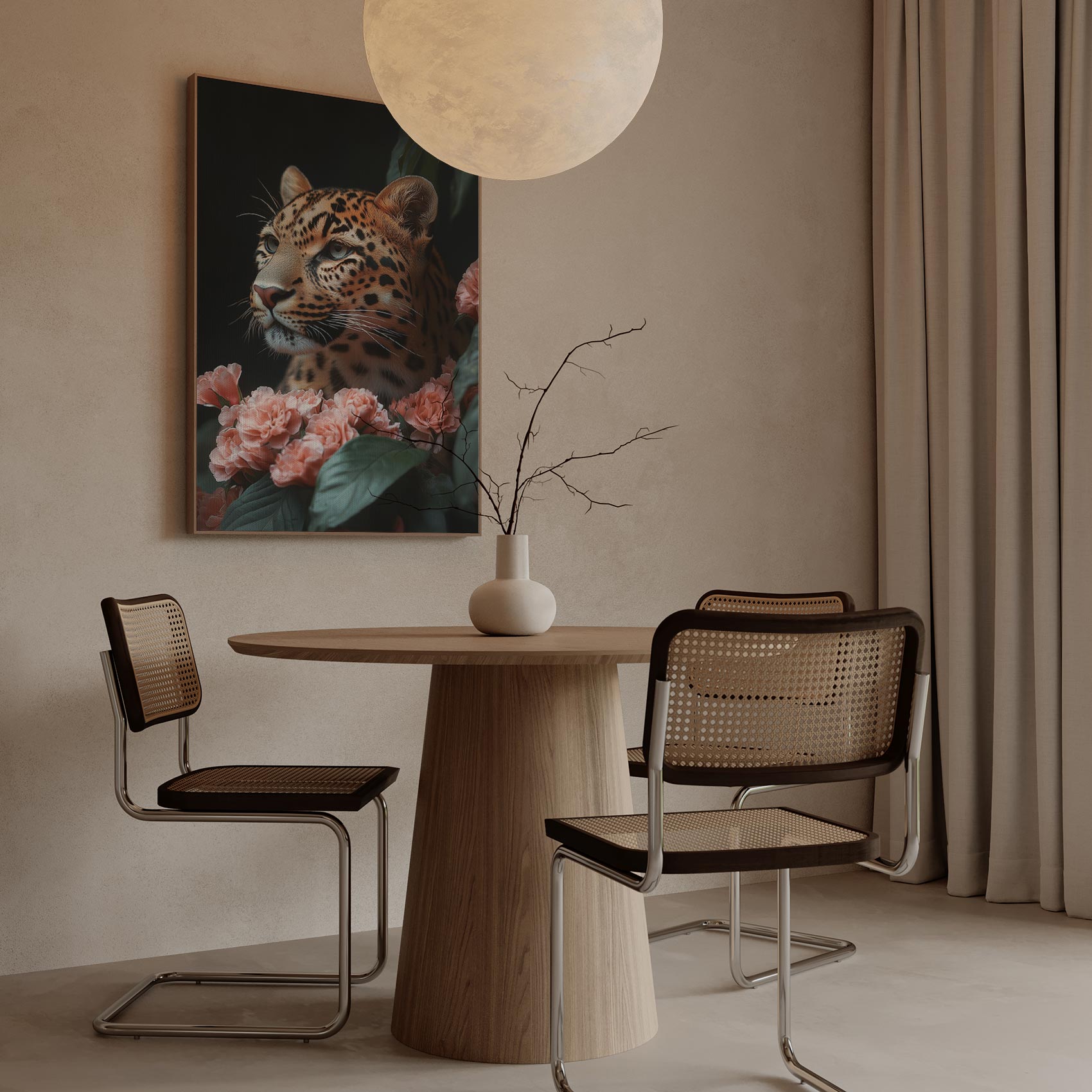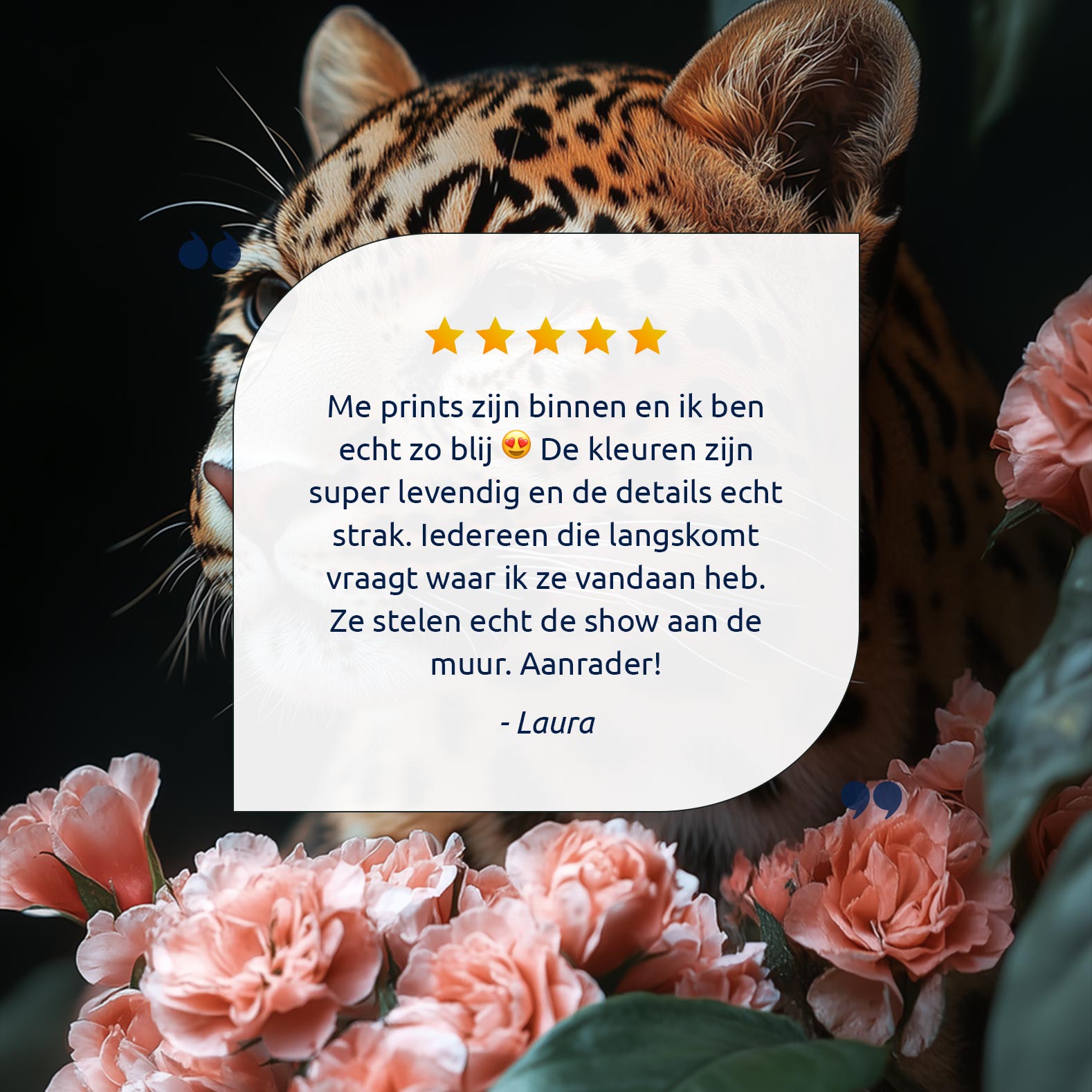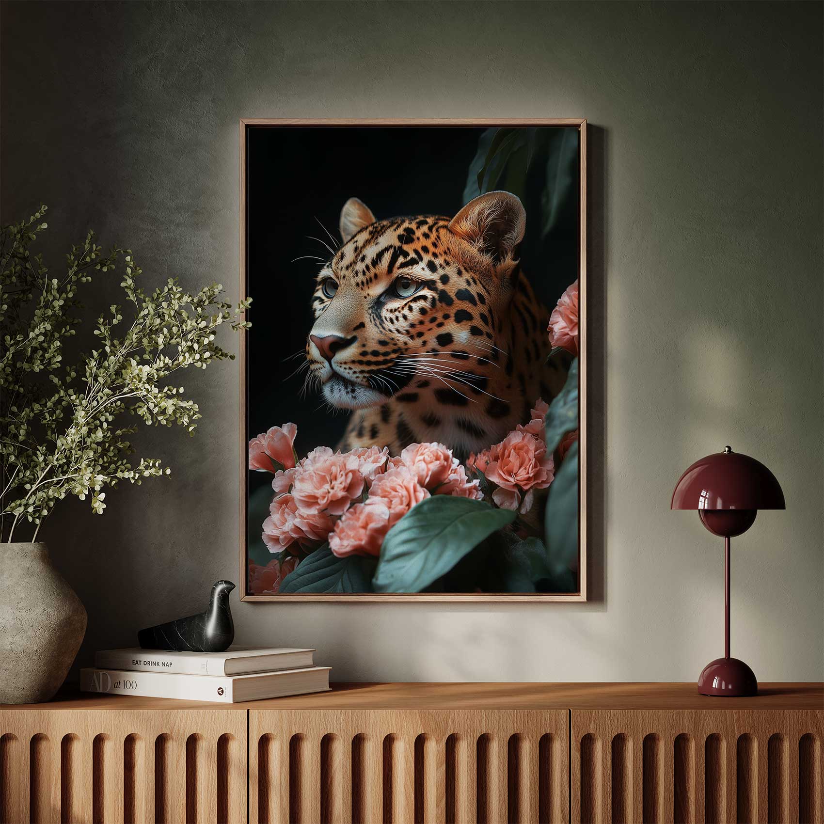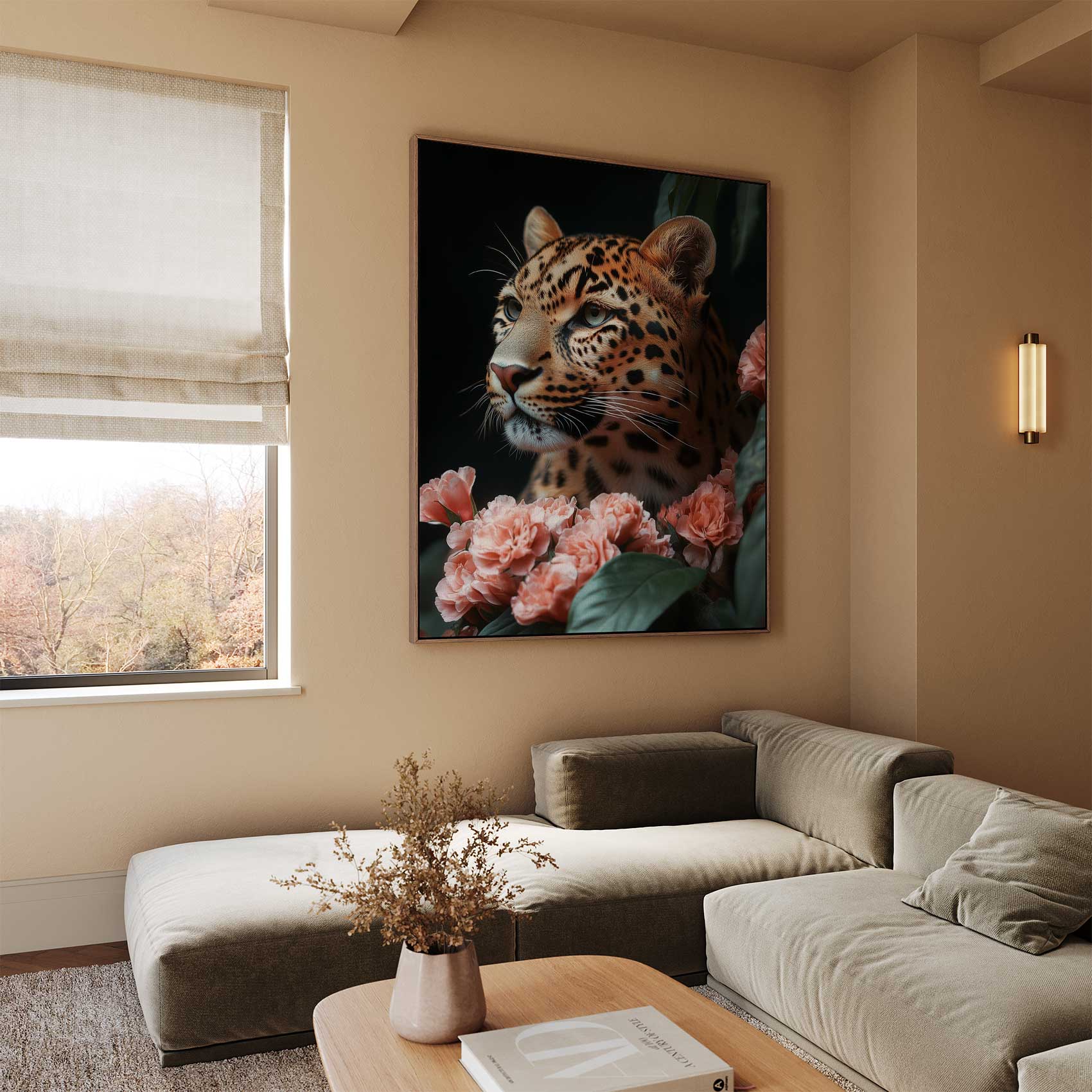 Luipaard tussen roze bloemen