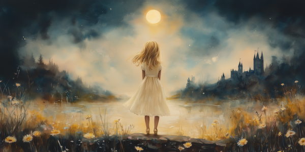 Magisch Maanlicht: Meisje in Bloemenveld bij Kasteel