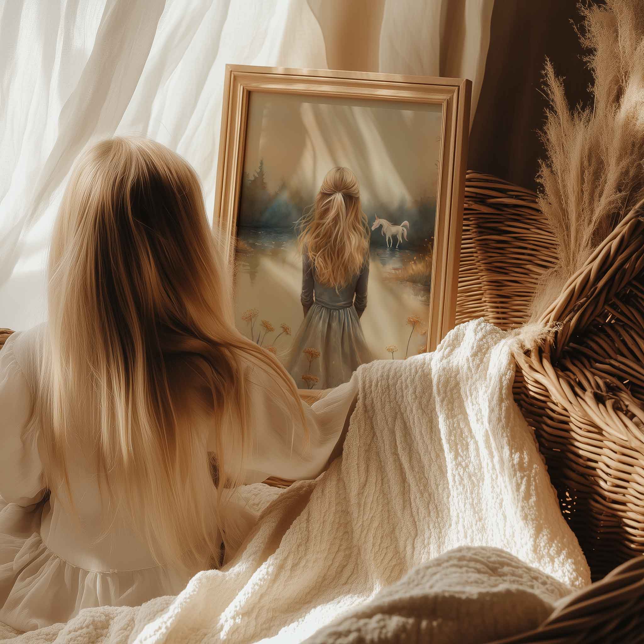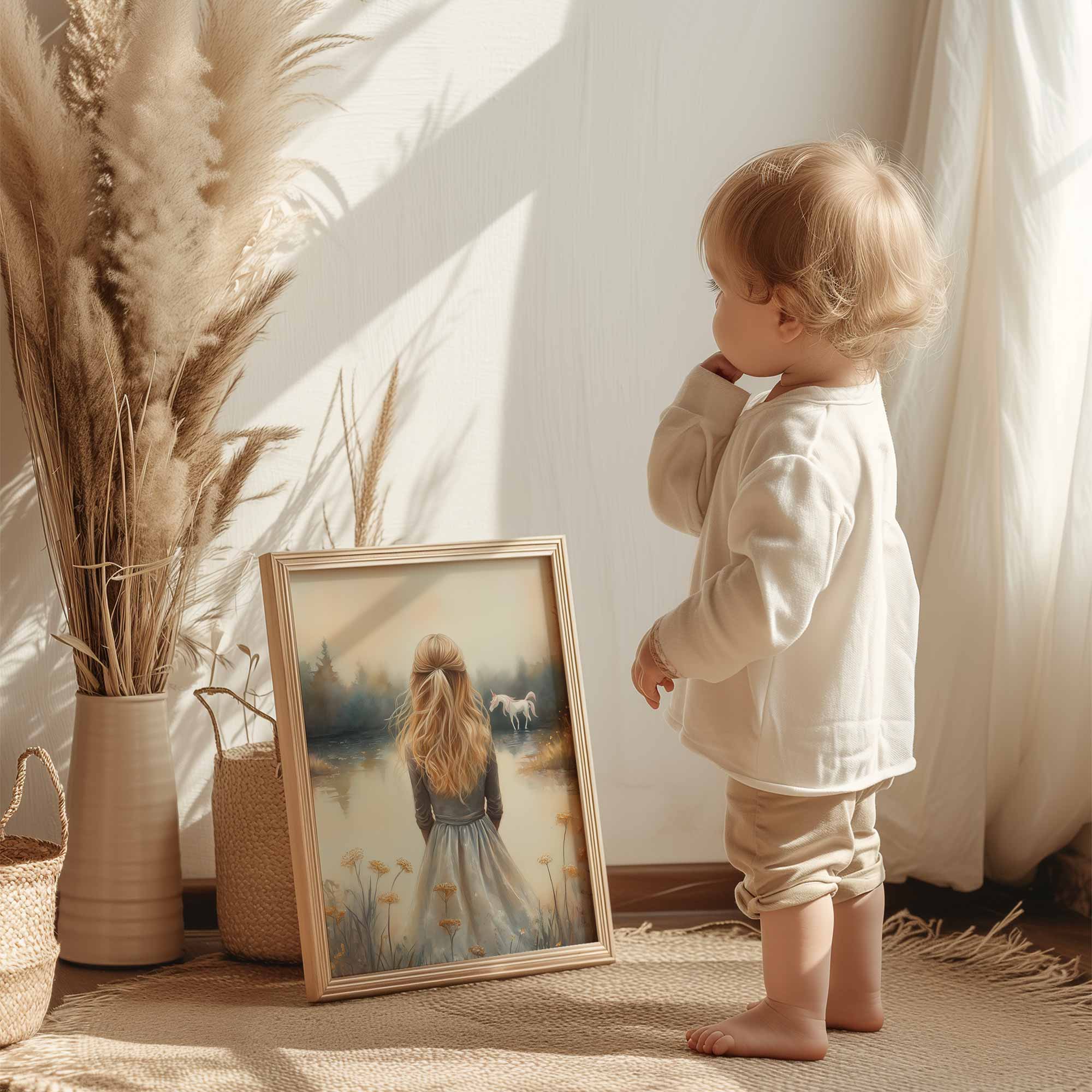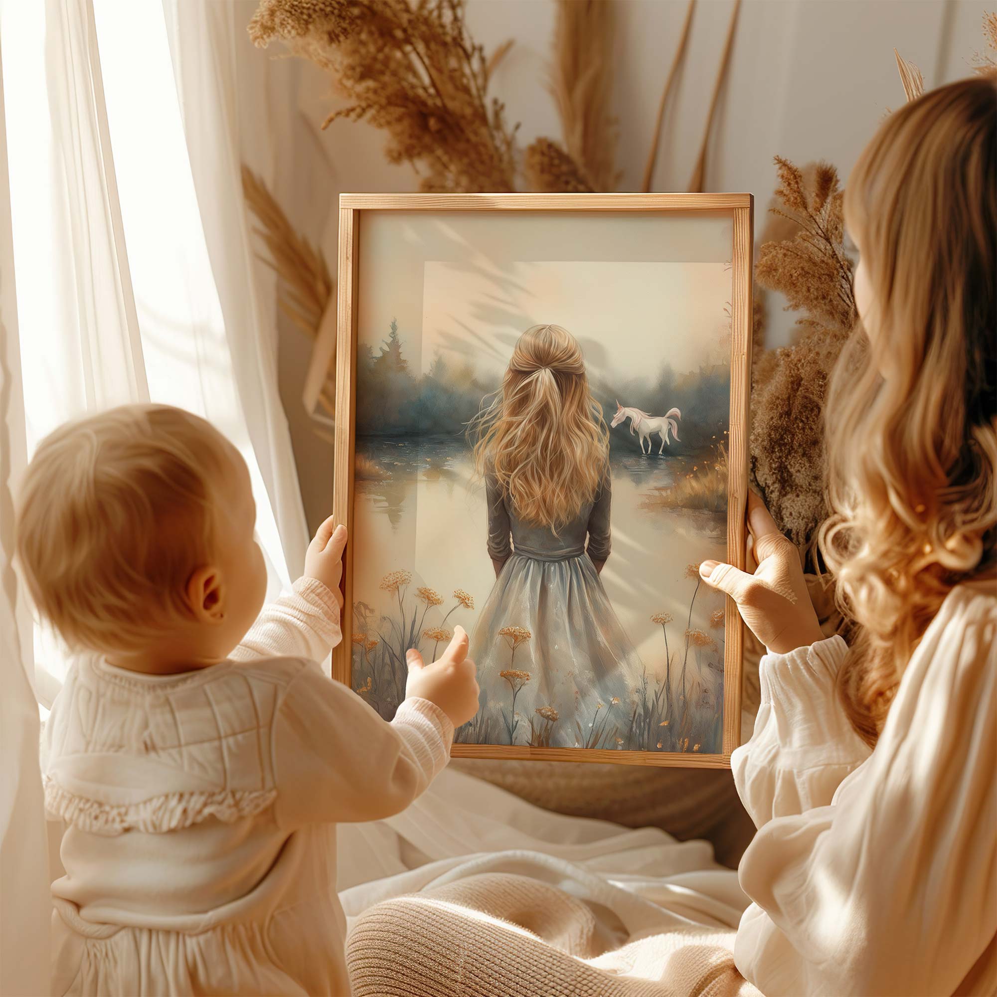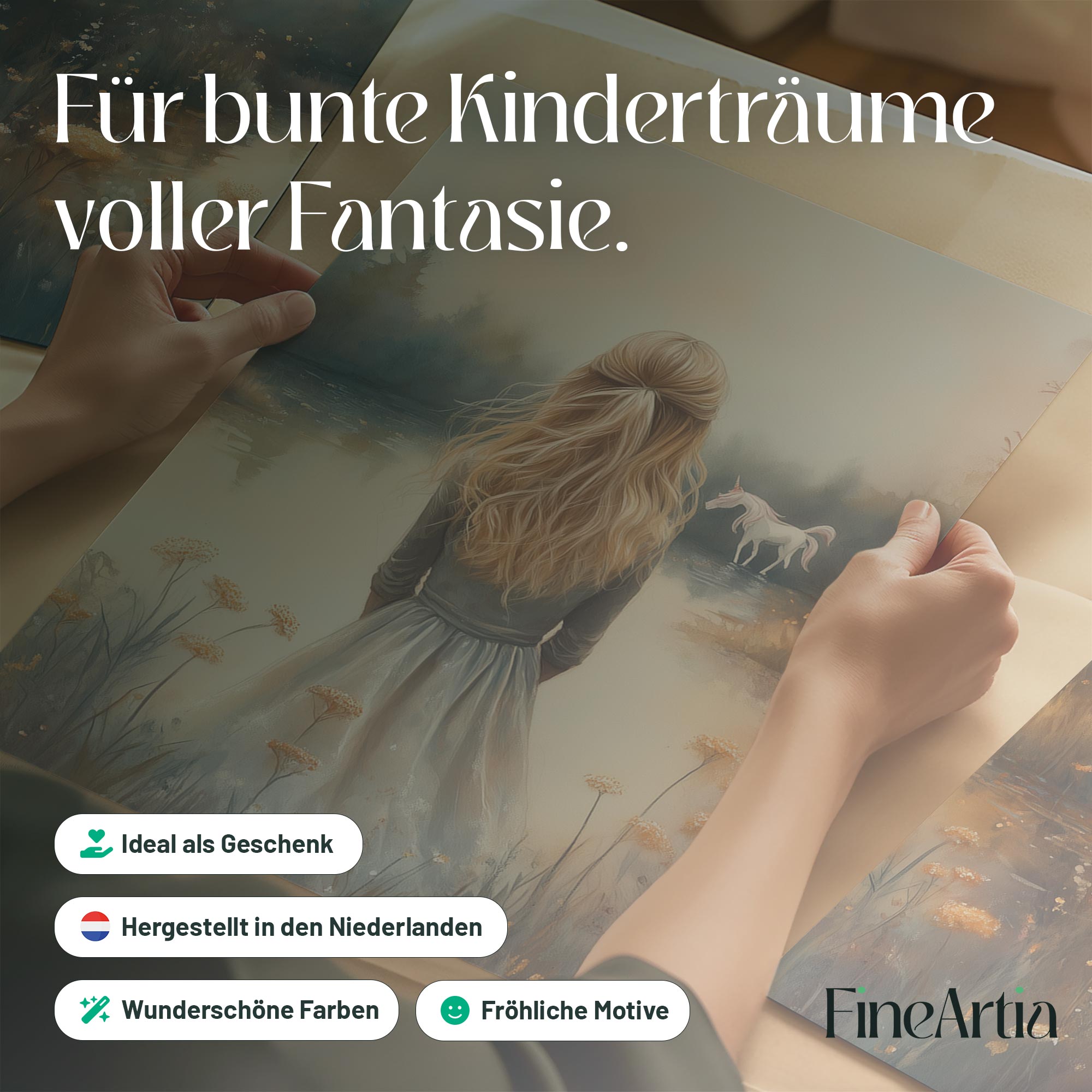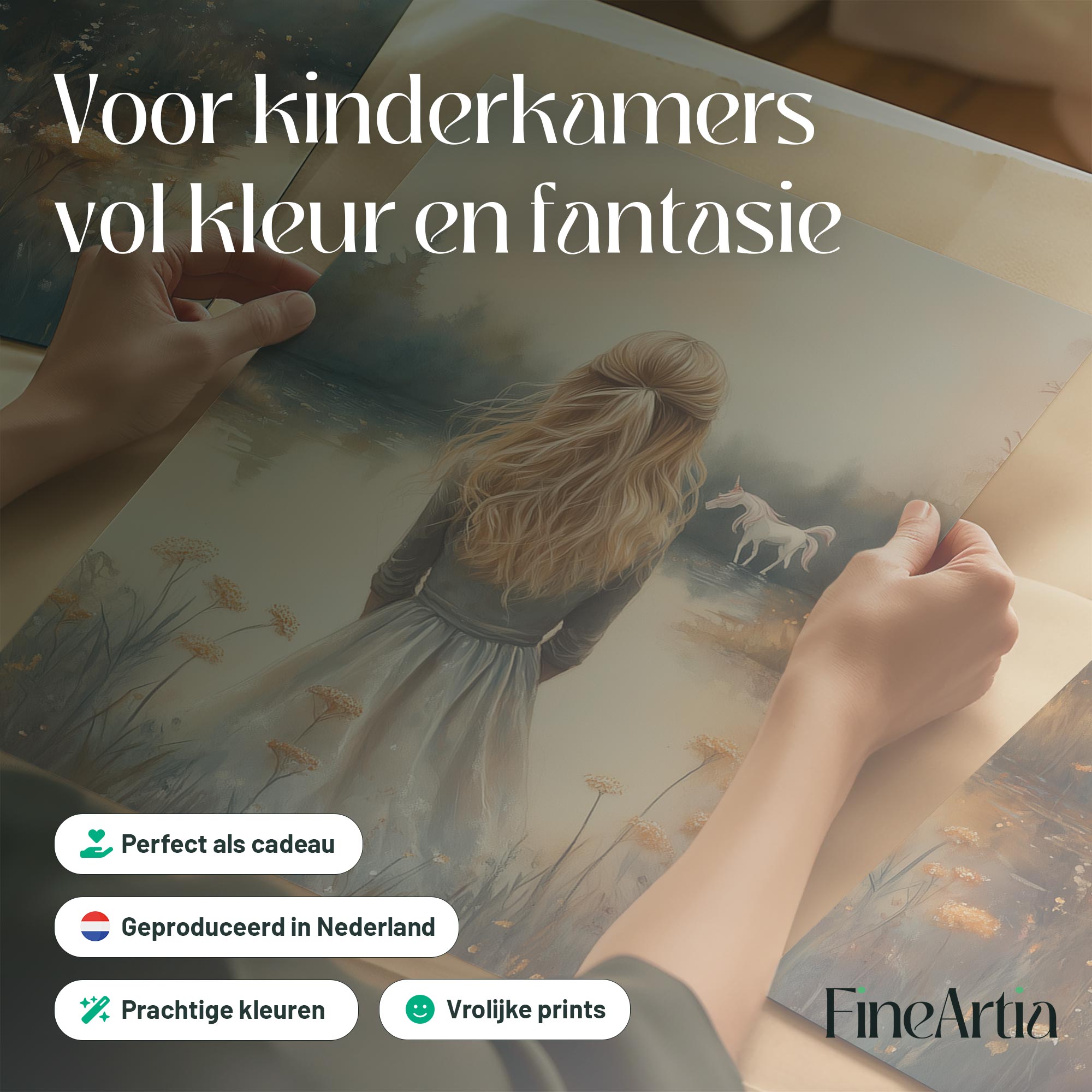 Terug naar collectie Posters Magisch Meer met Vrouw en Eenhoorn in Bloemenveld