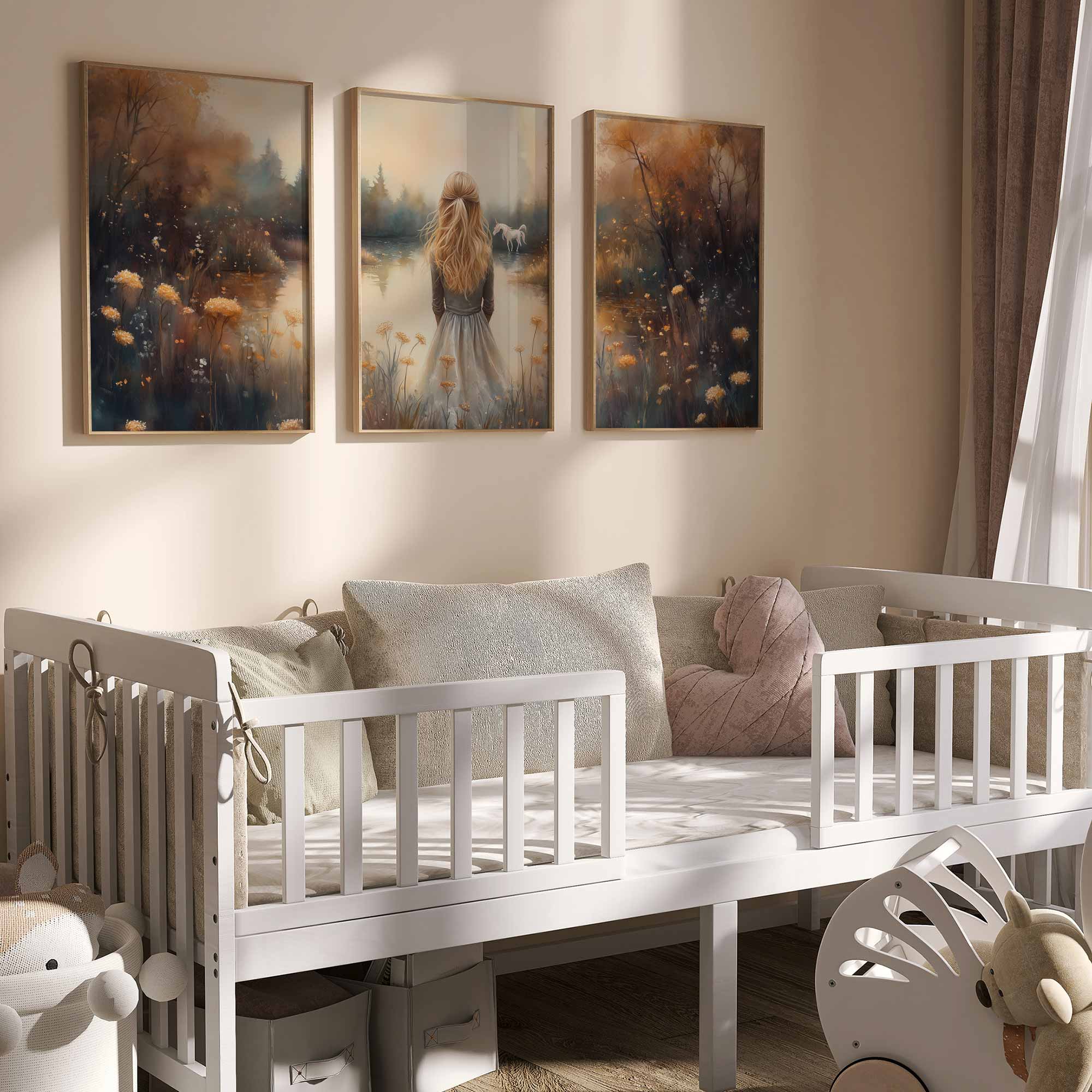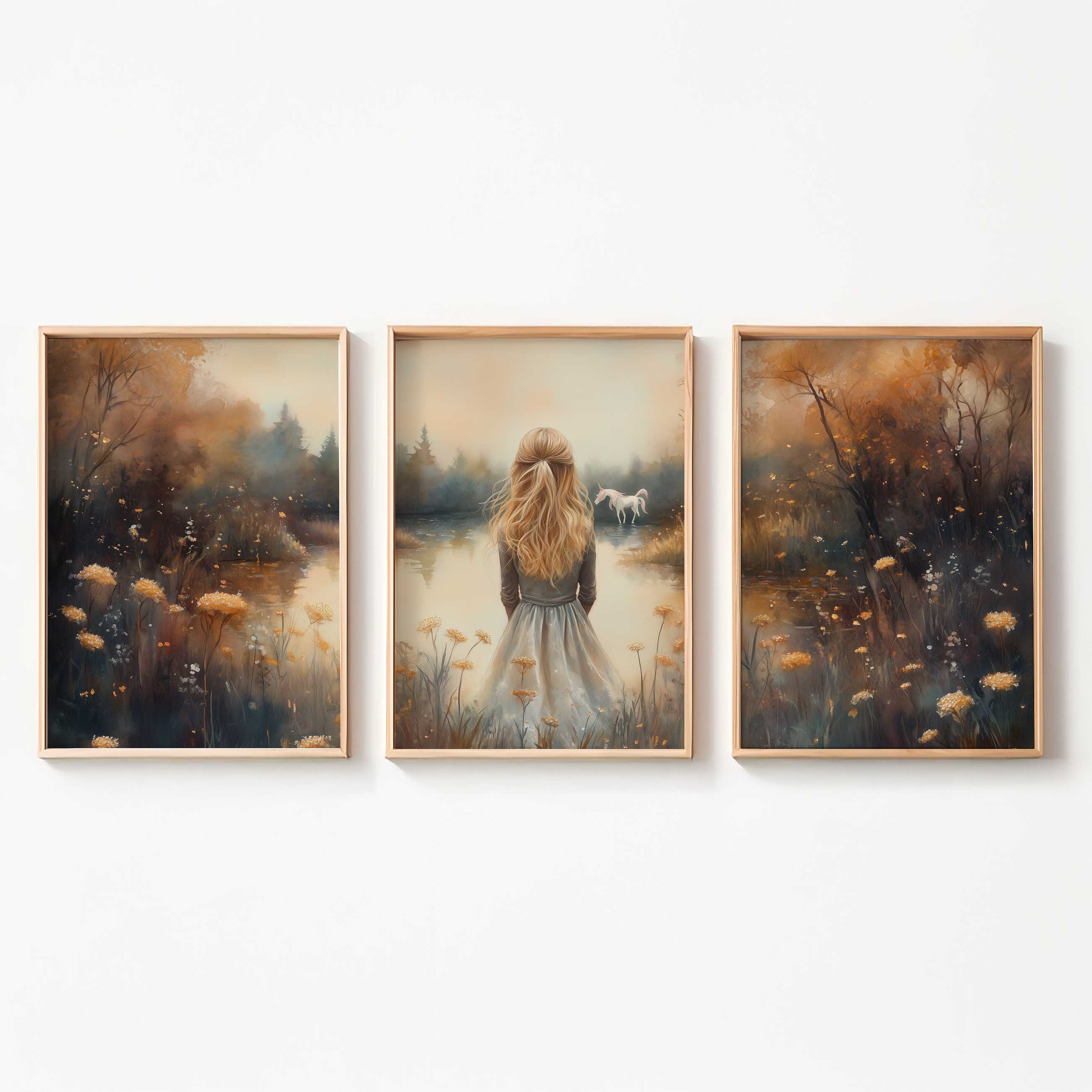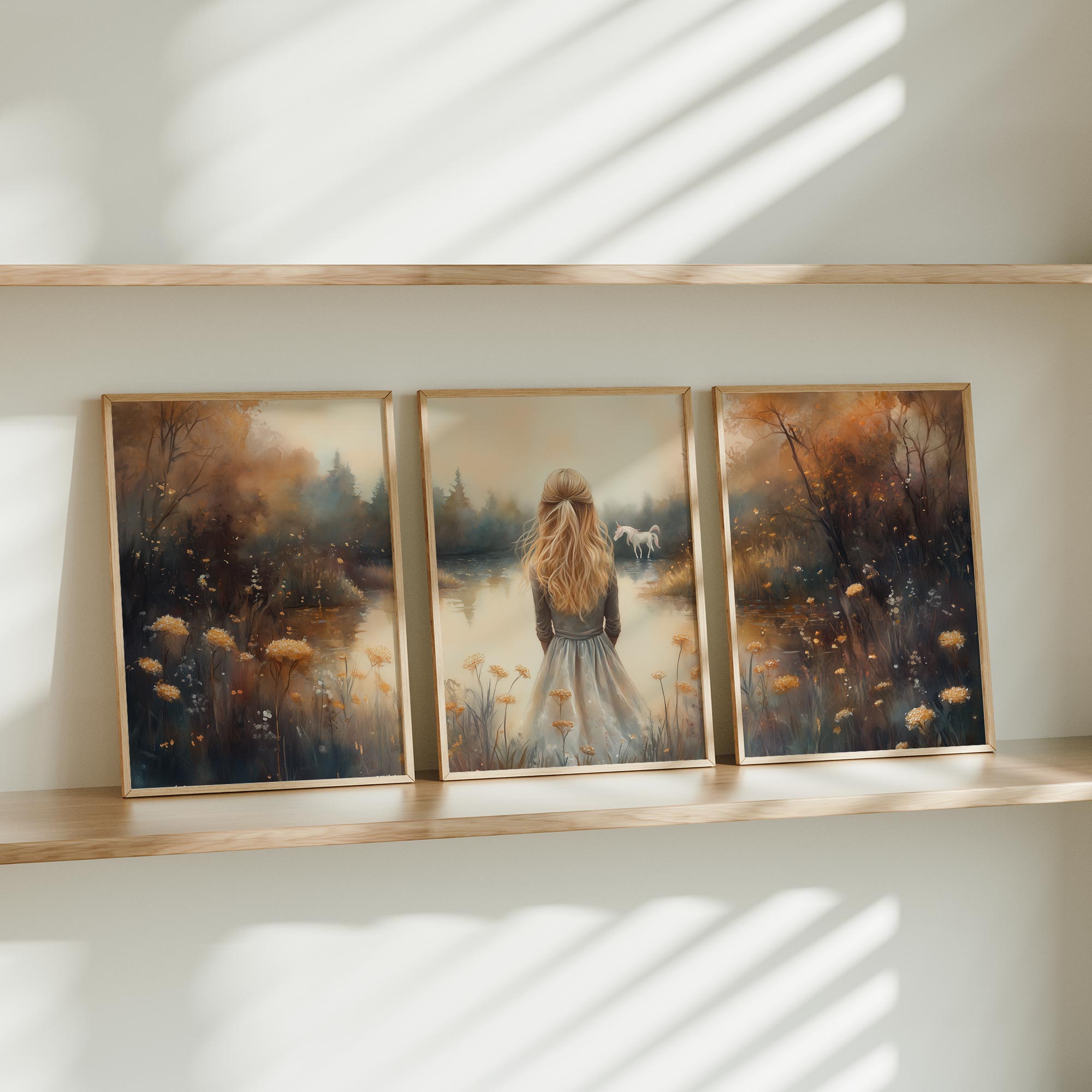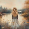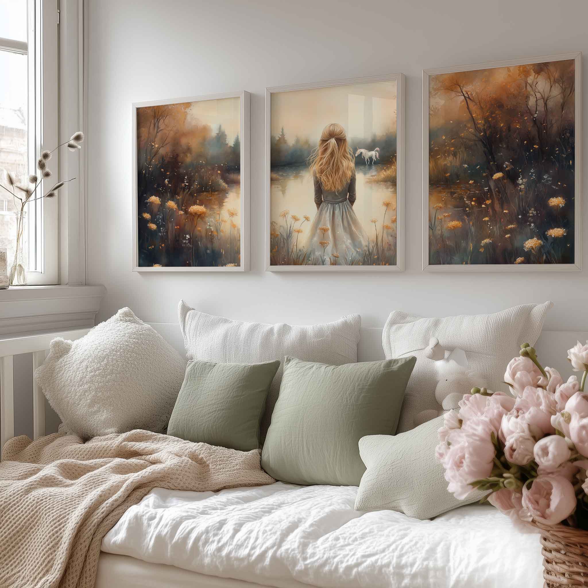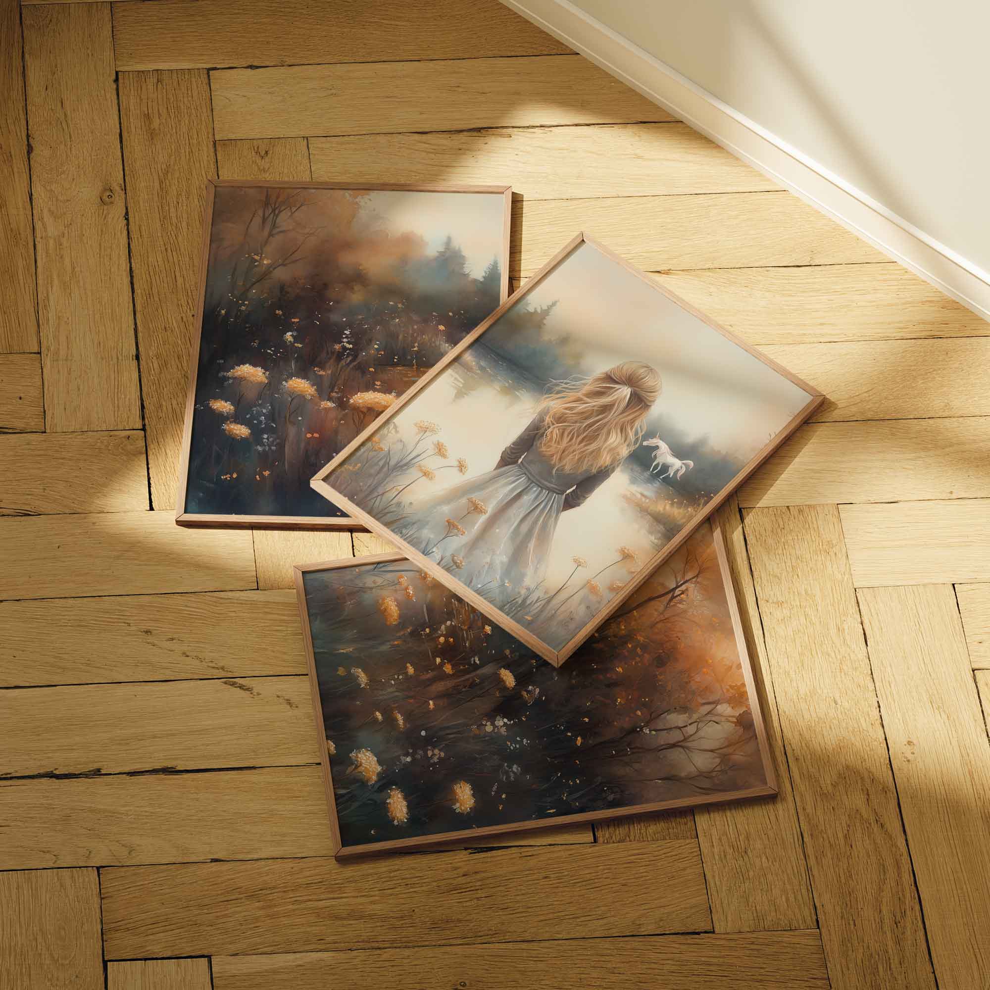 Terug naar collectie Posters Magisch Meer met Vrouw en Eenhoorn in Bloemenveld