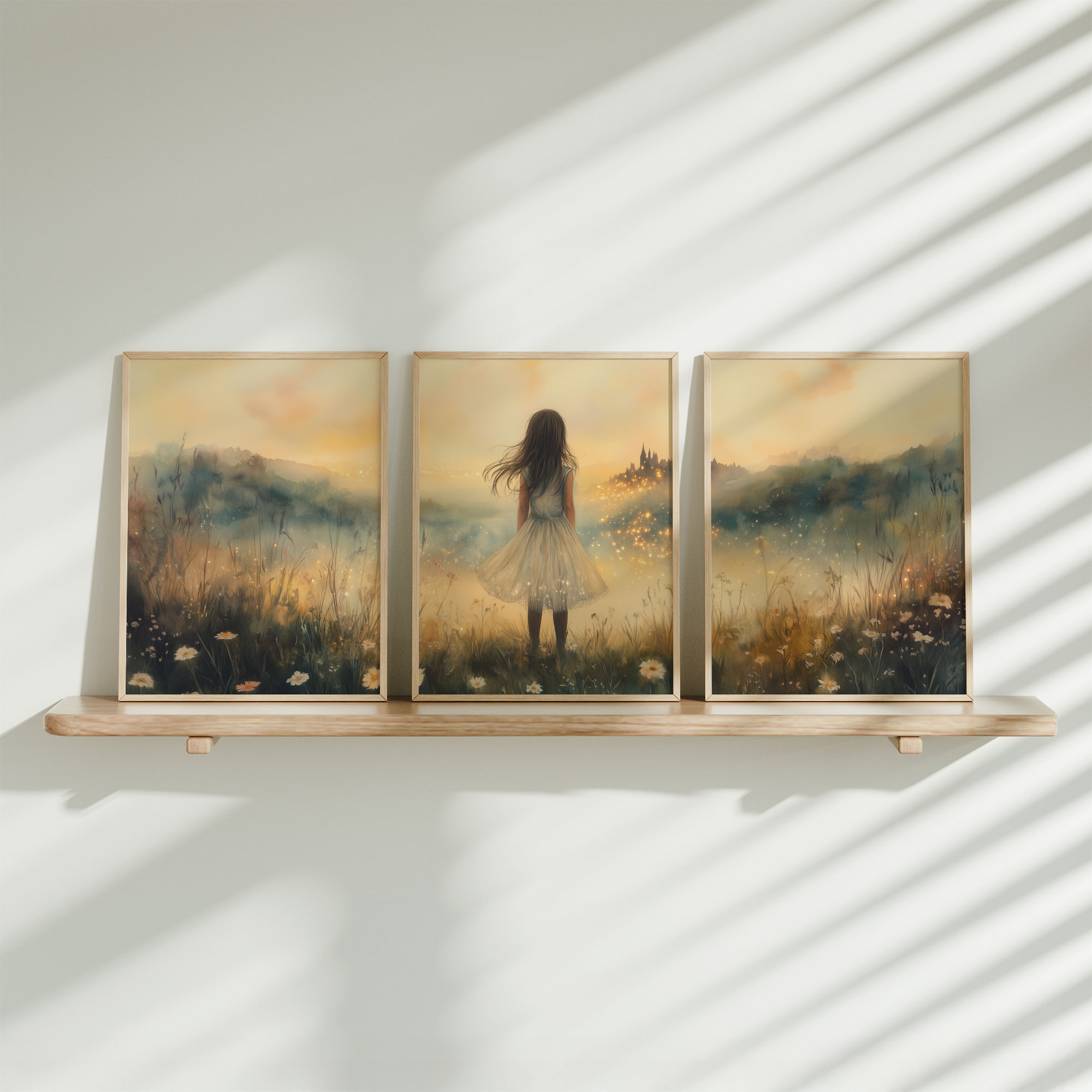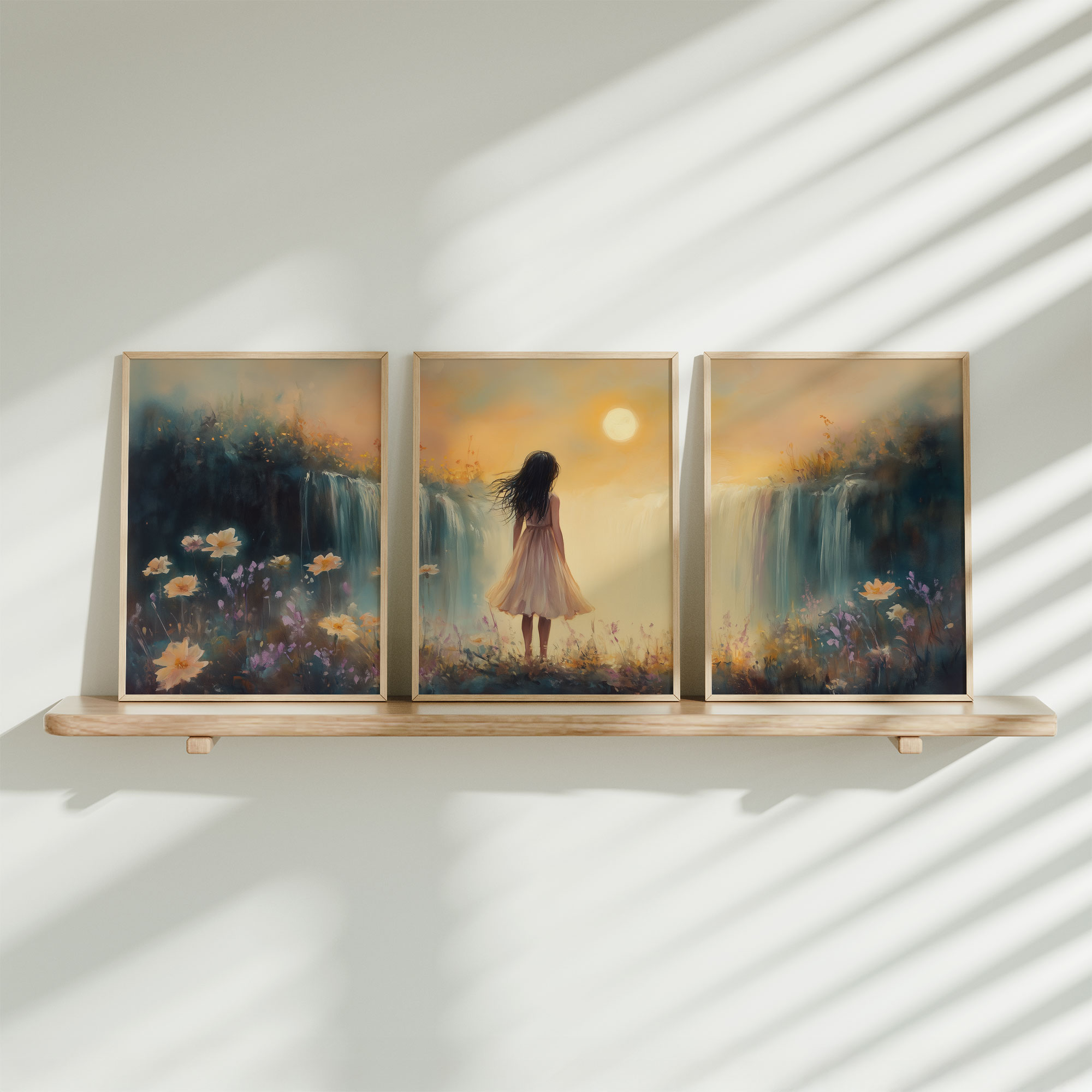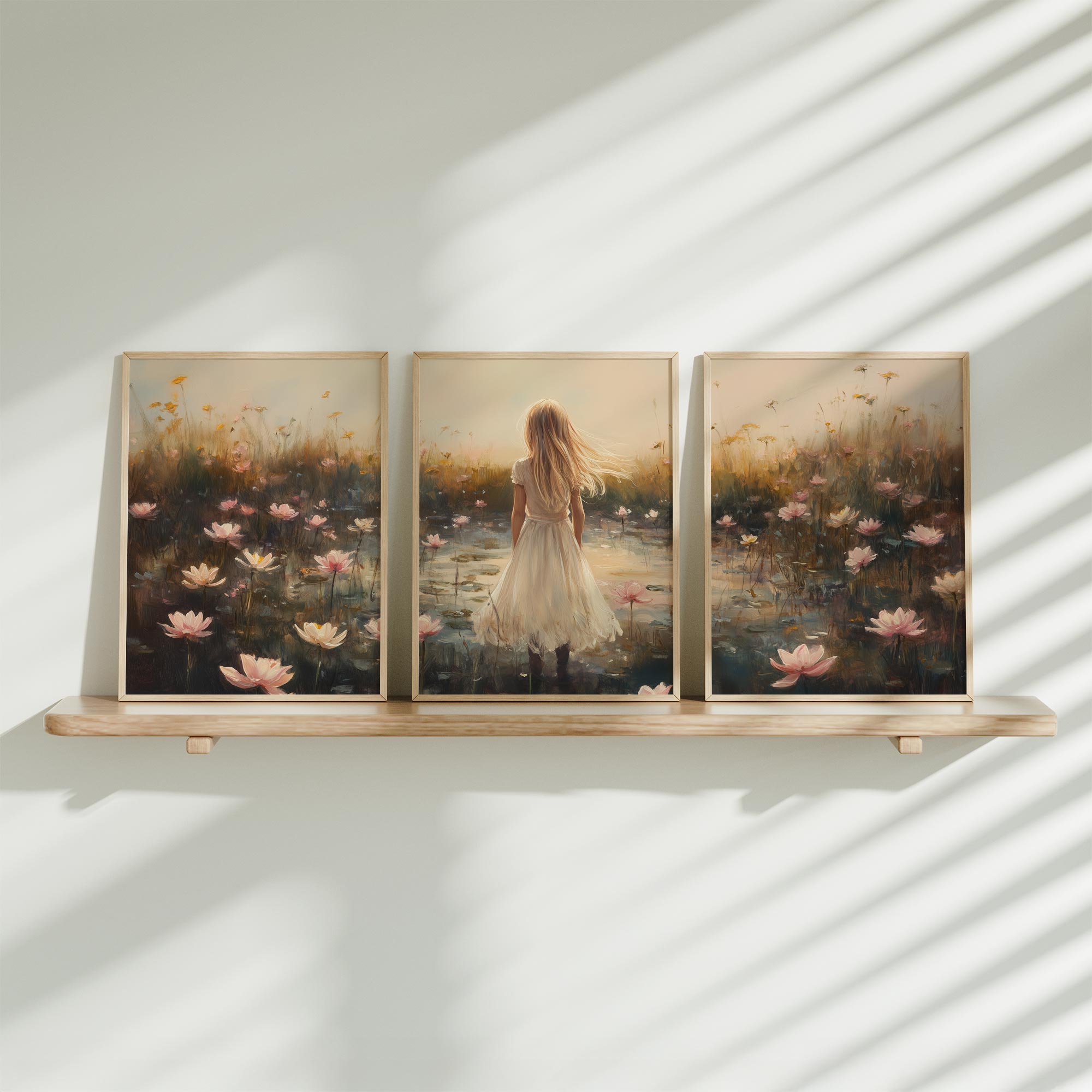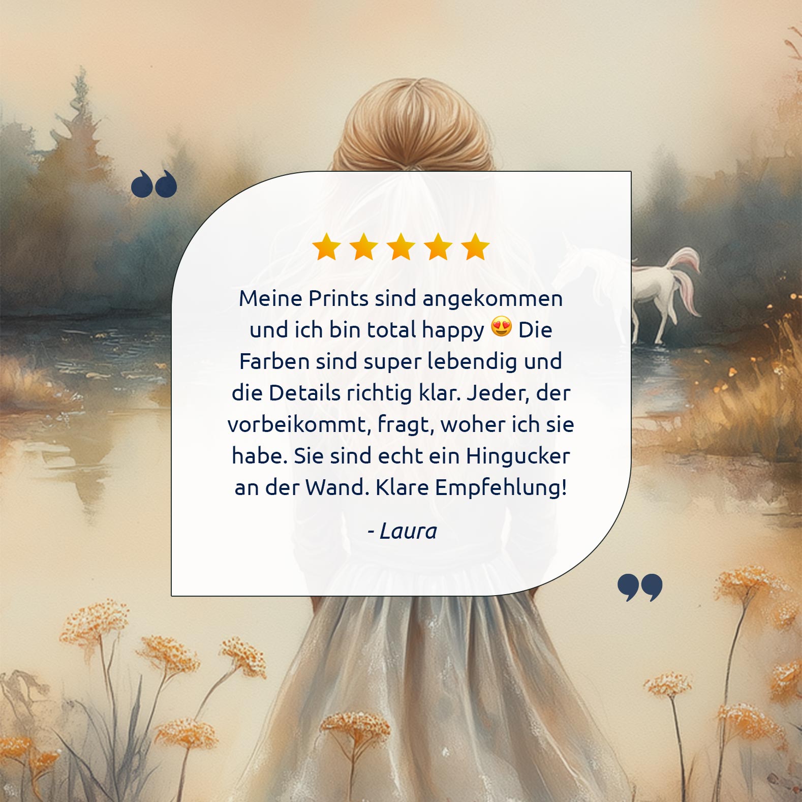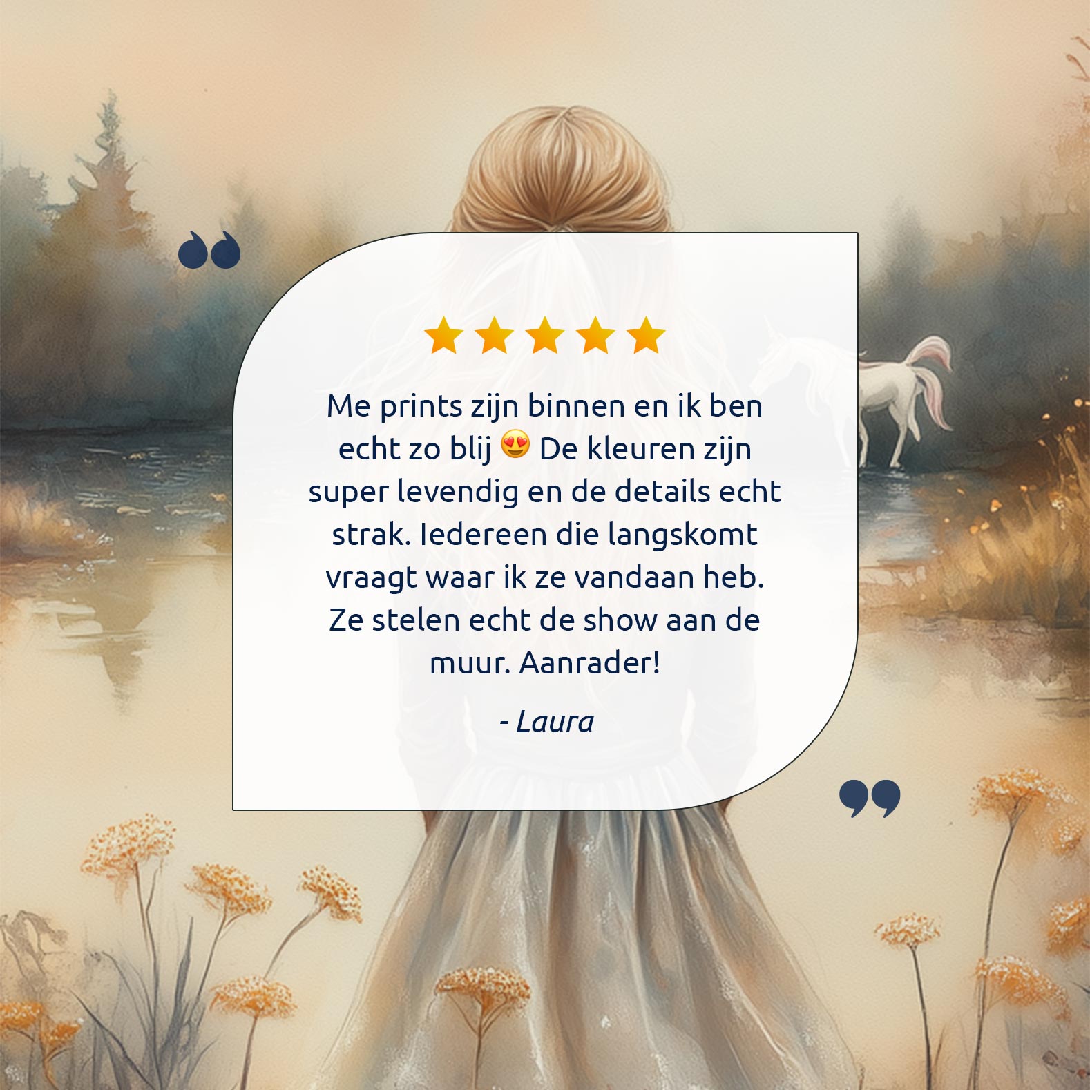 Terug naar collectie Posters Magisch Meer met Vrouw en Eenhoorn in Bloemenveld