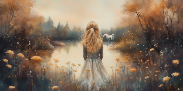 Magisch Meer met Vrouw en Eenhoorn in Bloemenveld