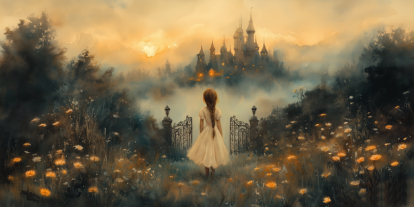 Magisch Meisje bij Dromenkasteel in Gouden Gloed