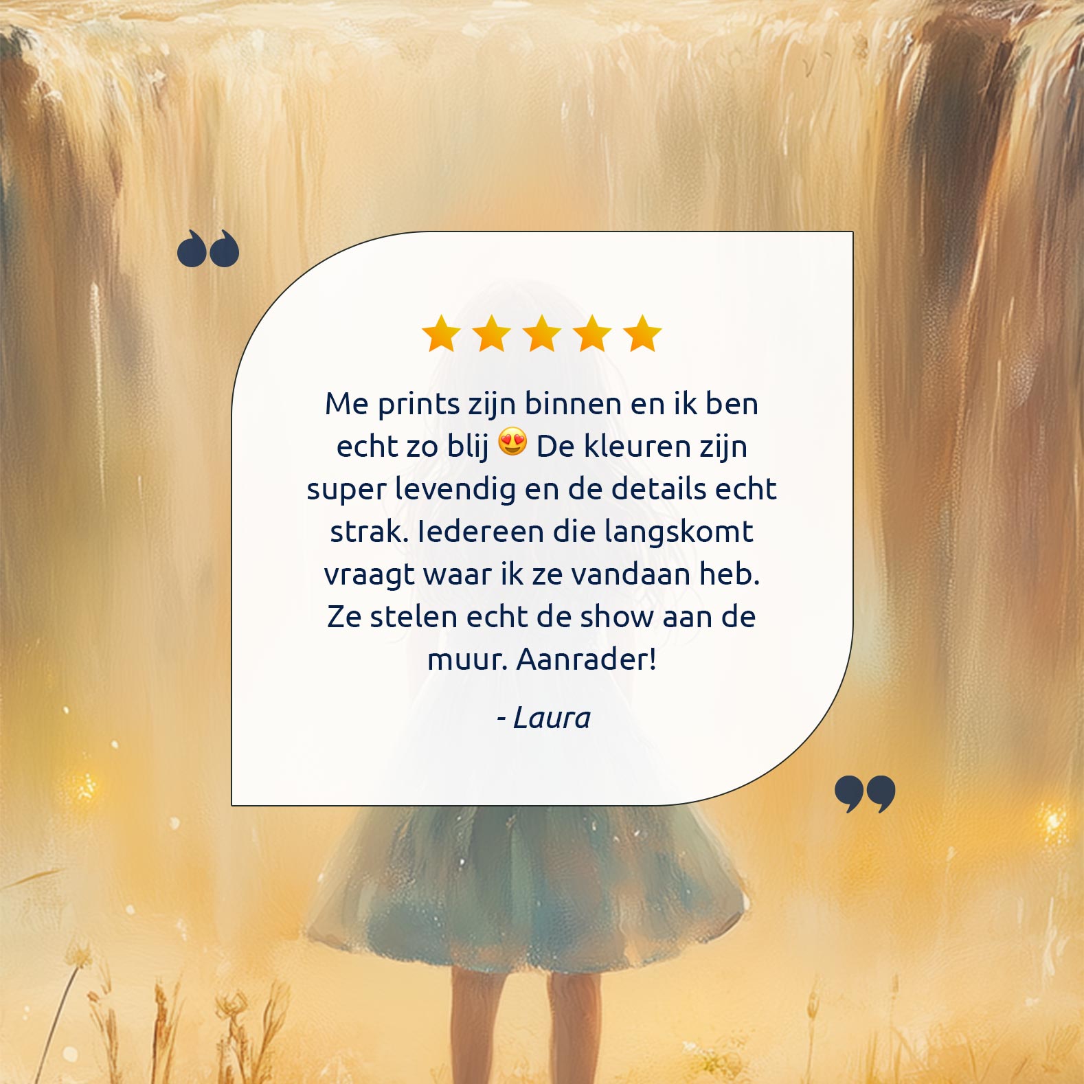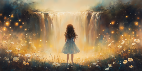 Magisch Meisje bij Gouden Waterval en Bloemenveld