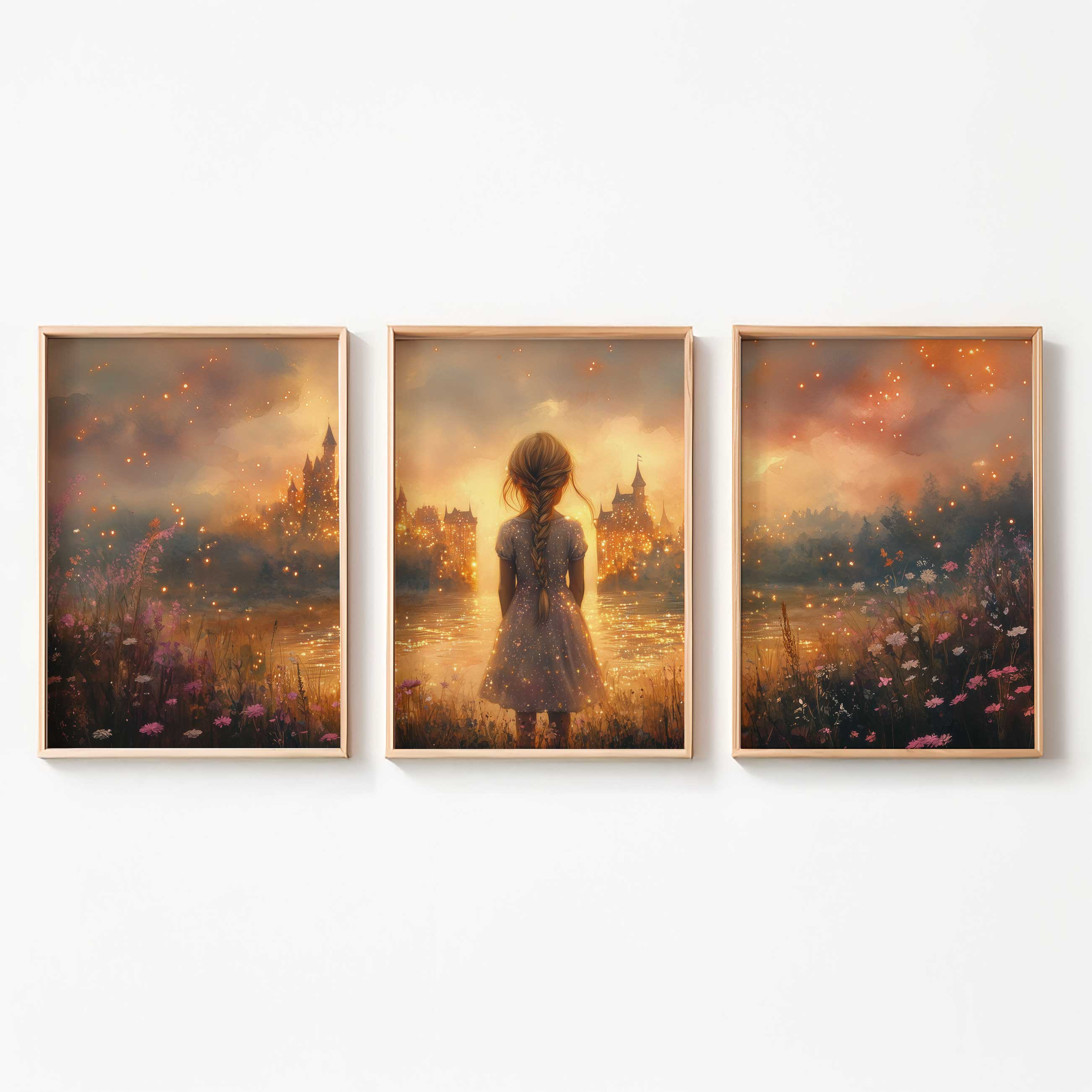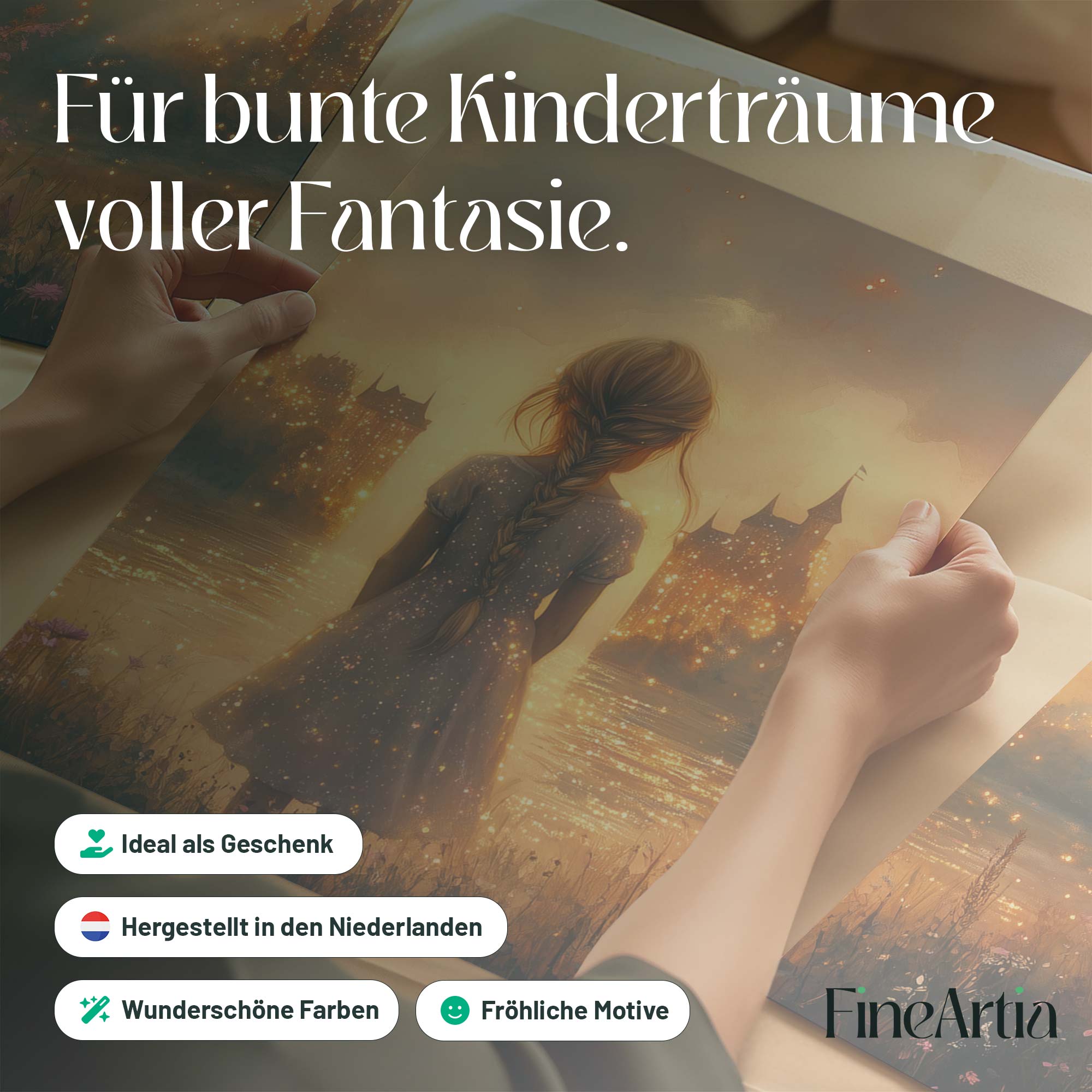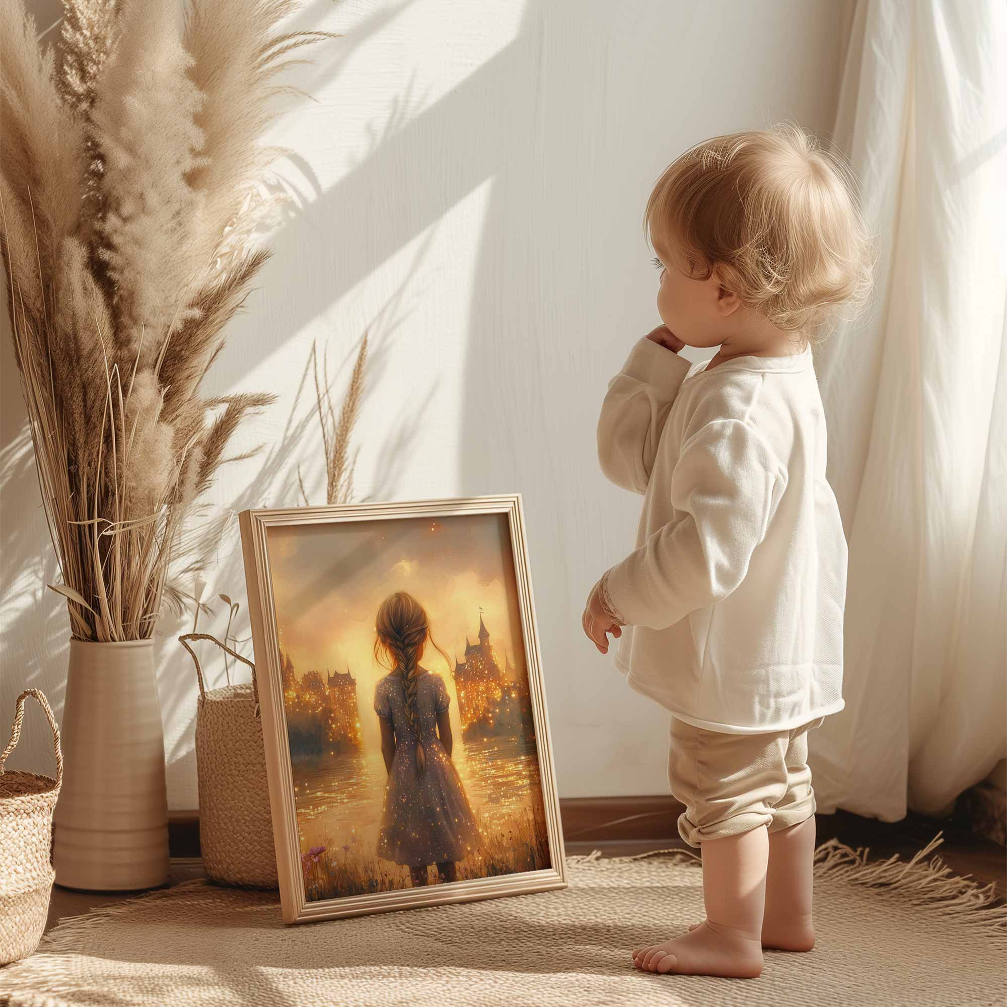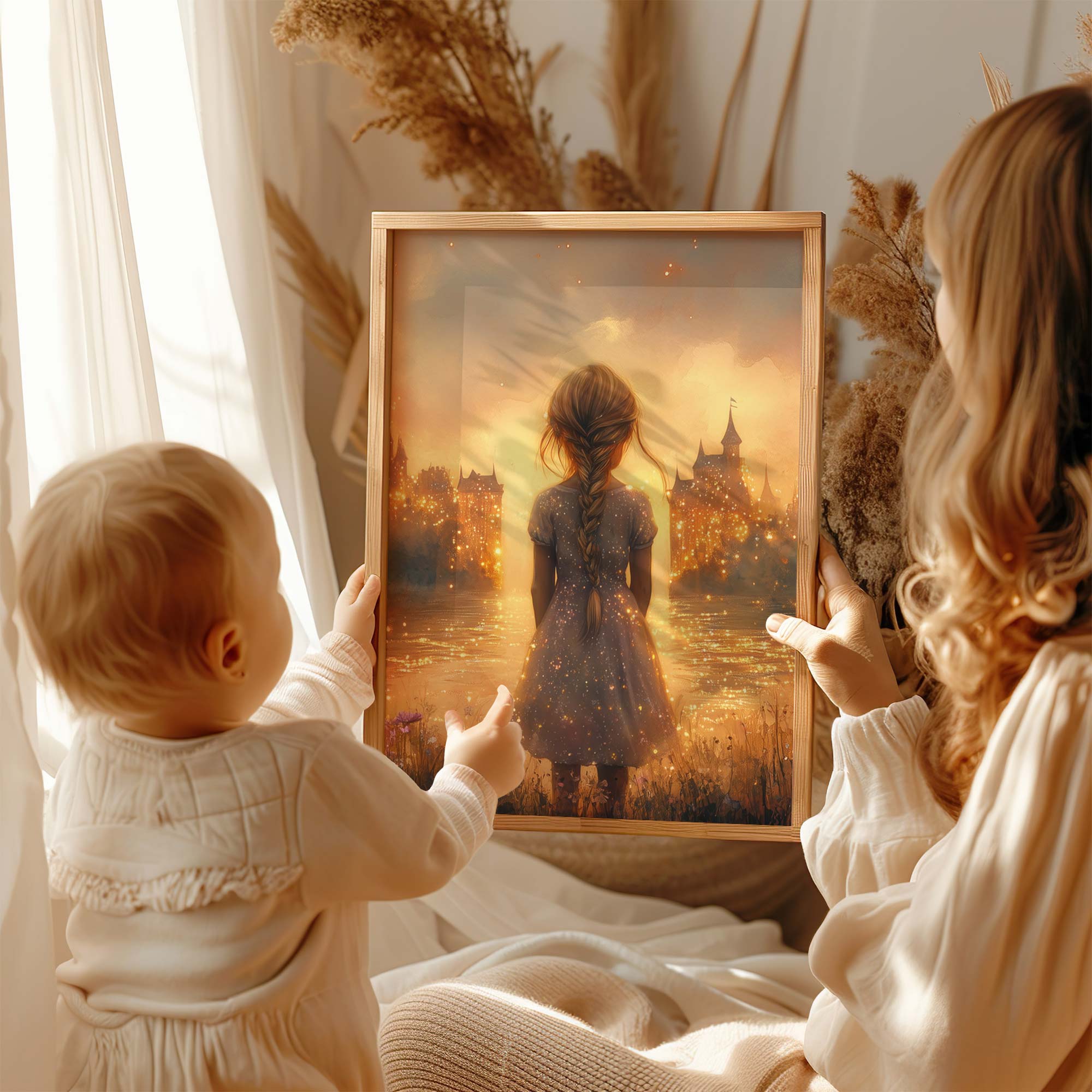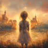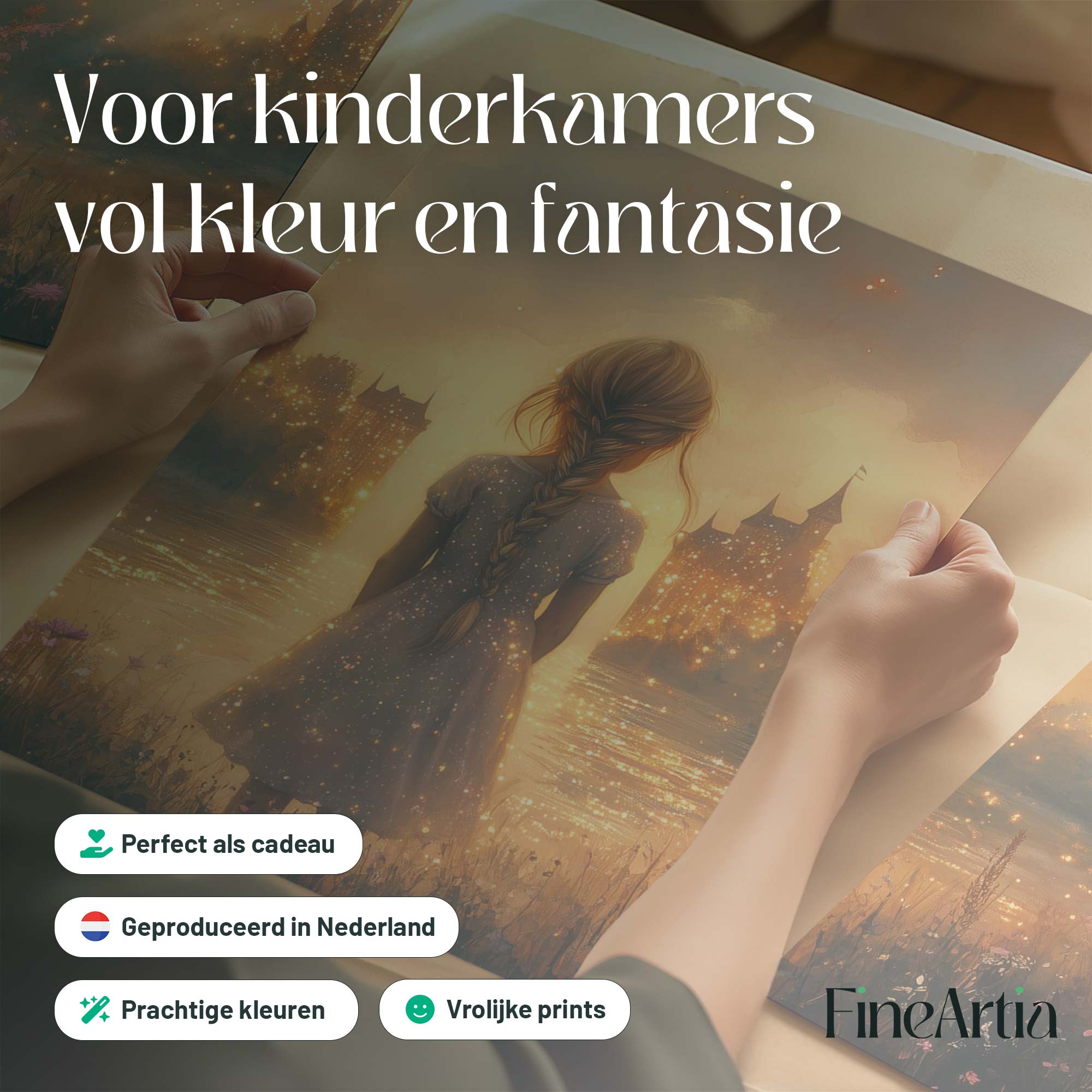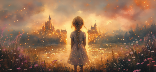 Magisch Meisje bij Verlicht Kasteel in Gouden Gloed