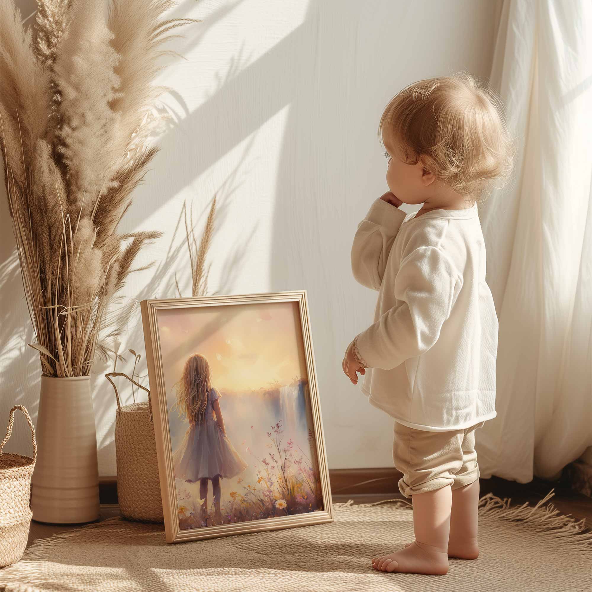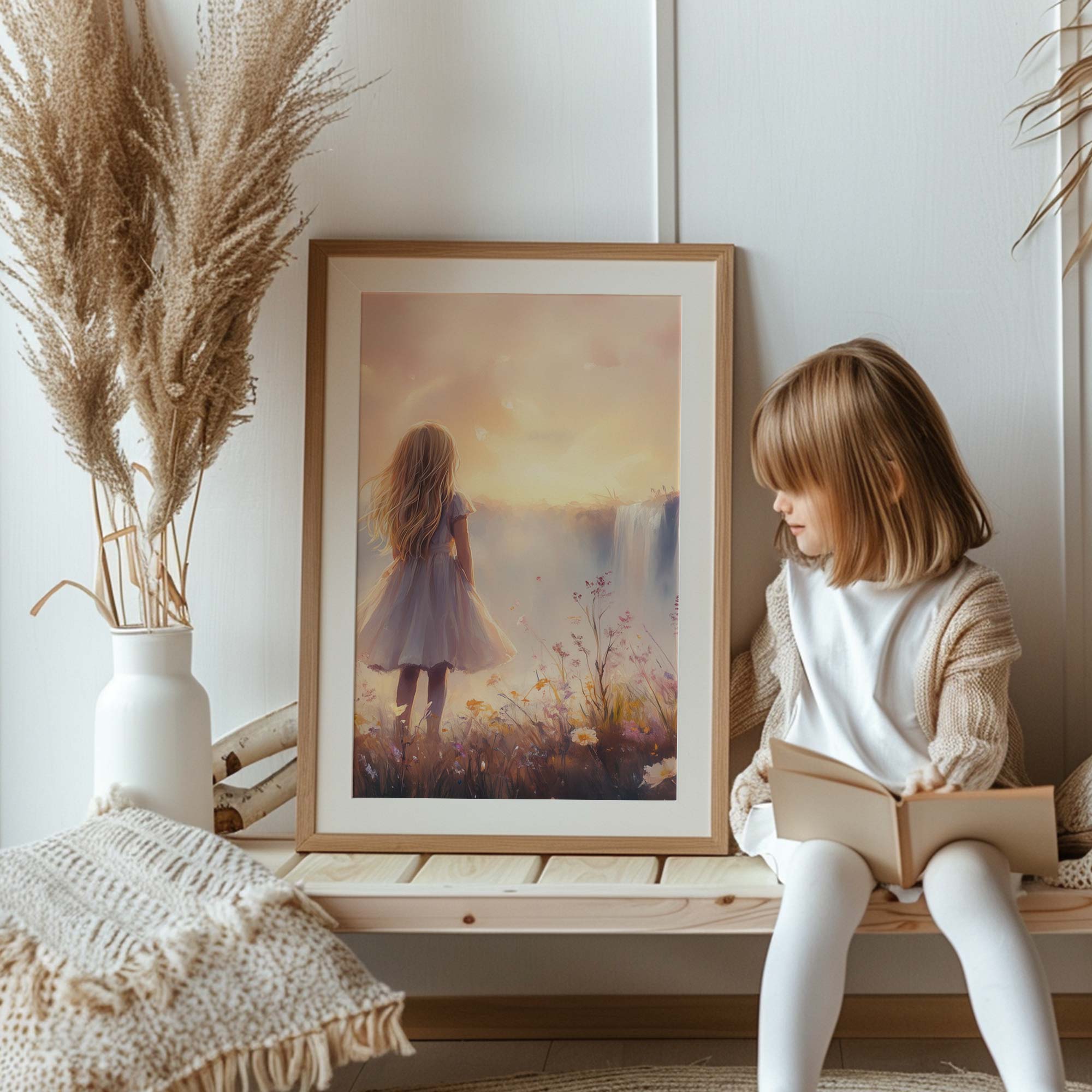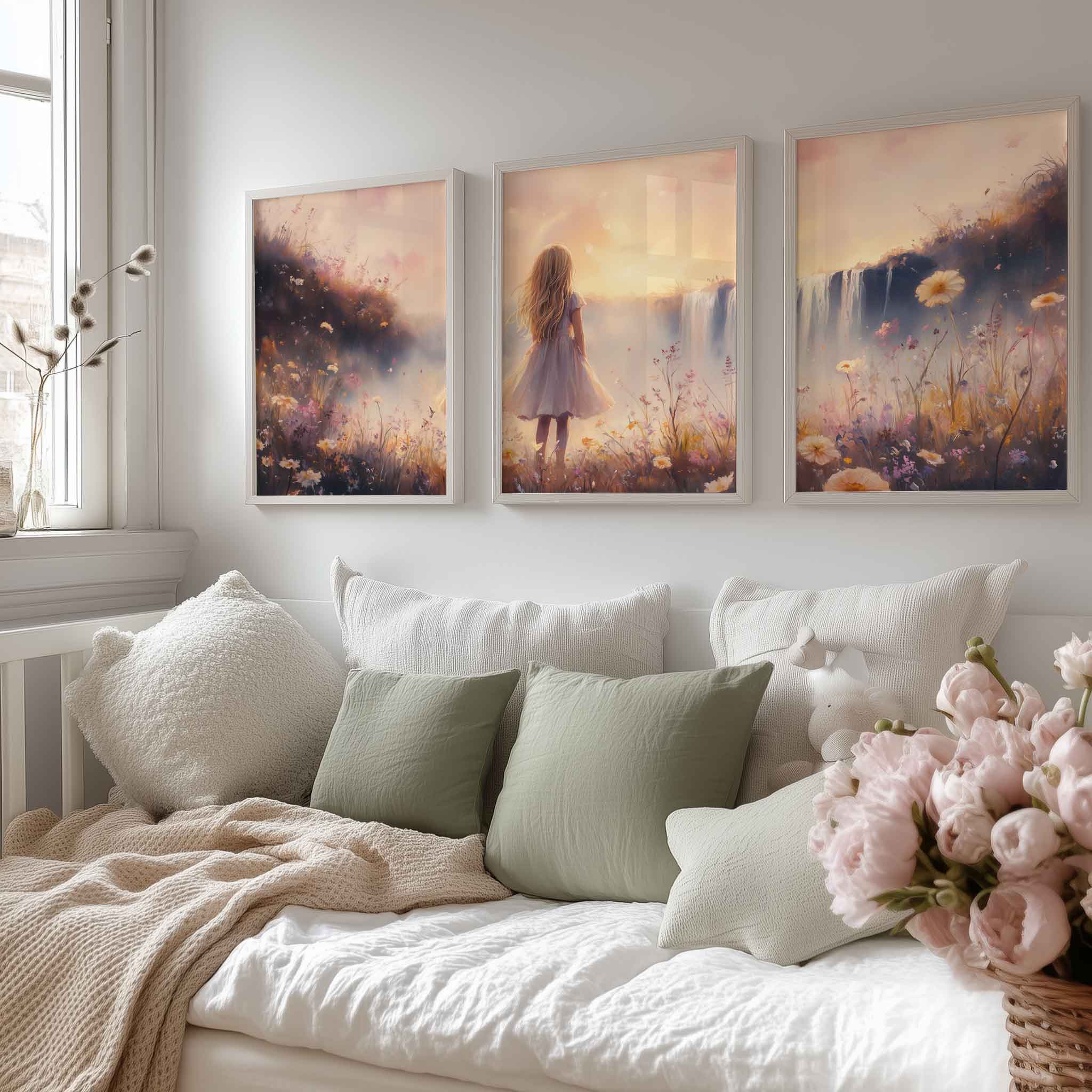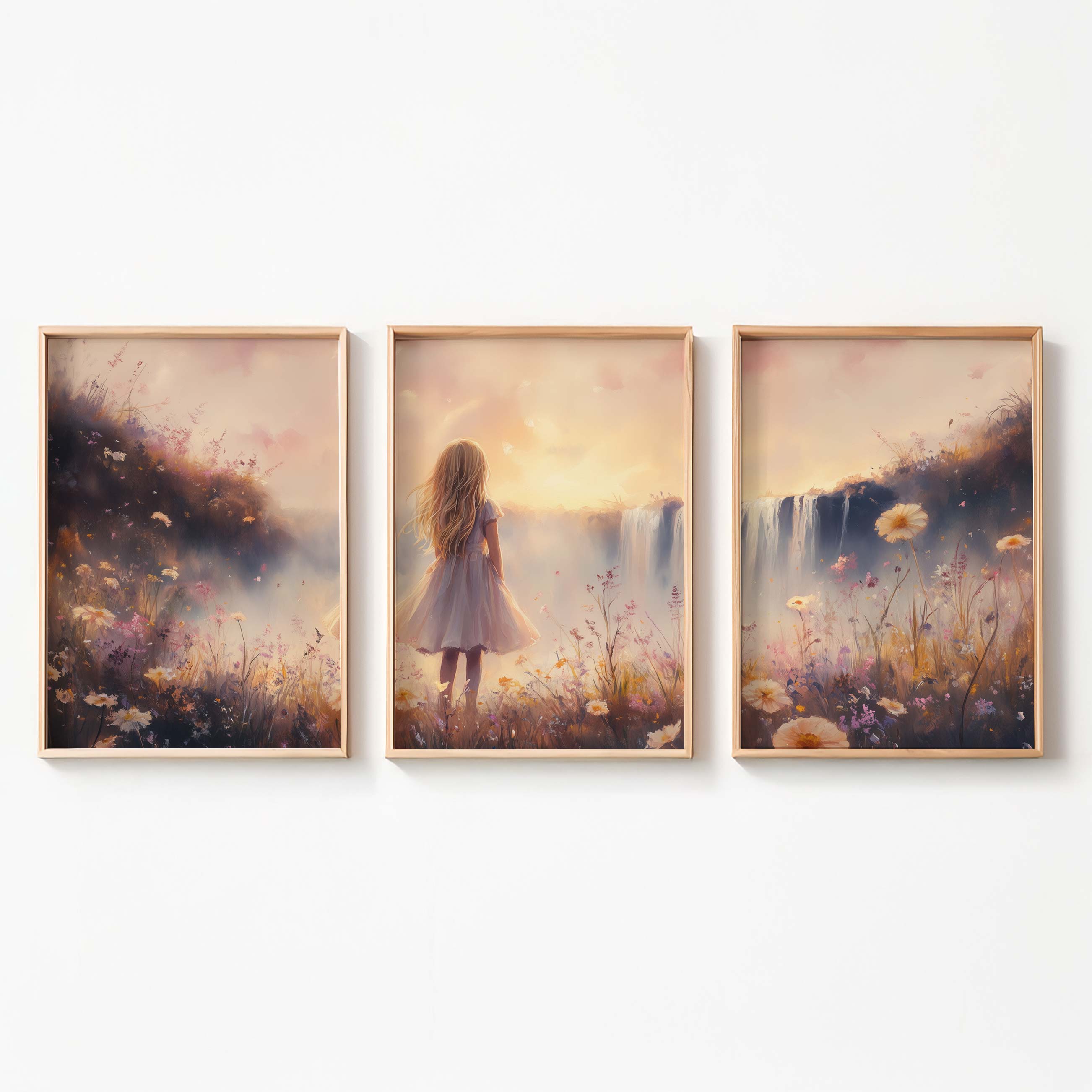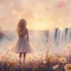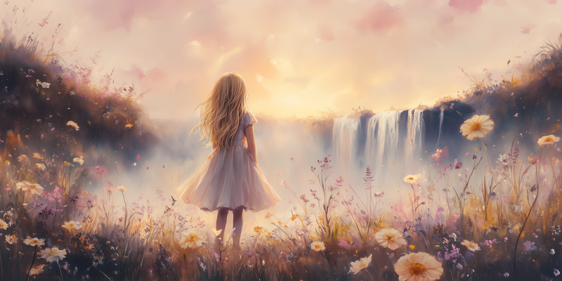 Magisch Meisje bij Waterfall en Bloemenveld