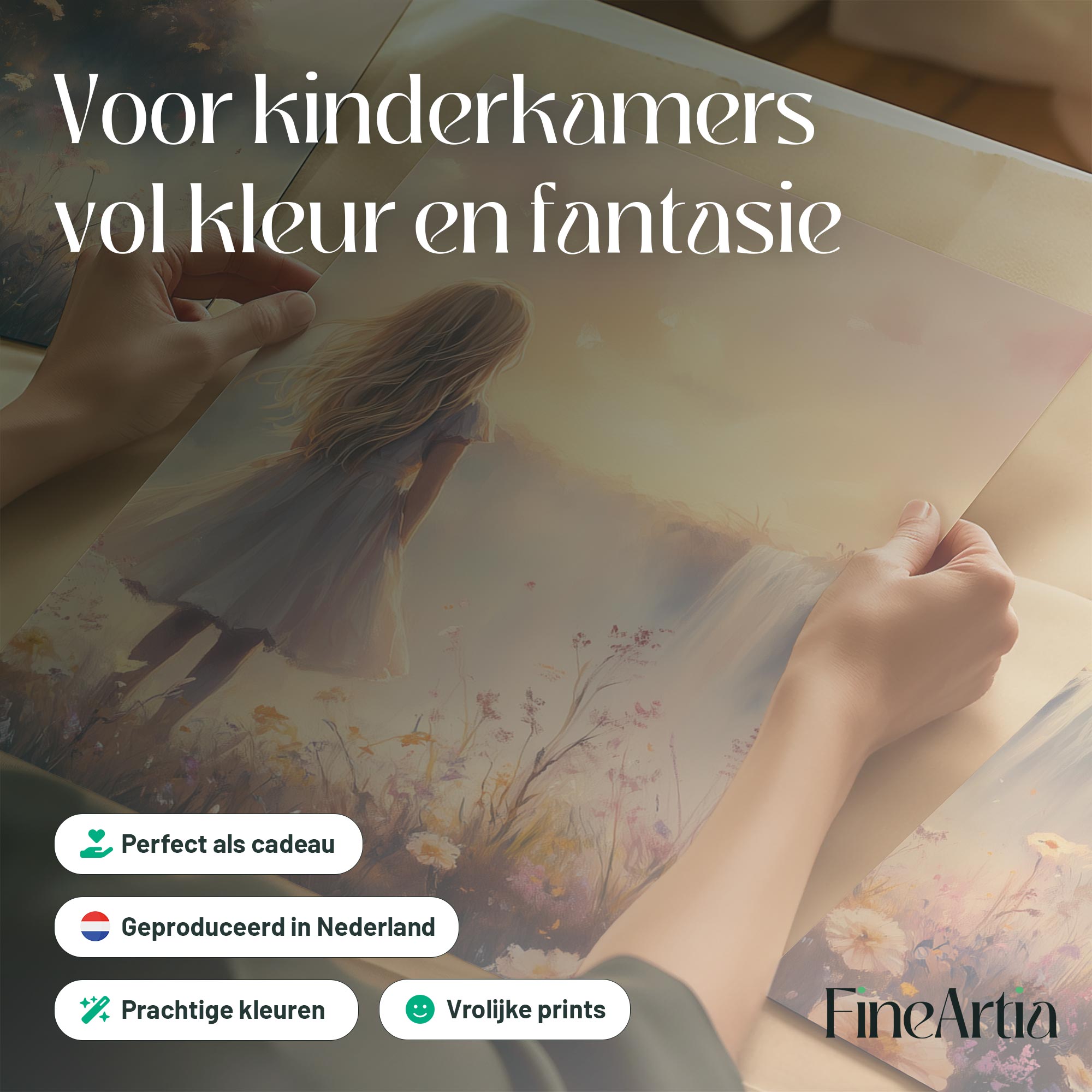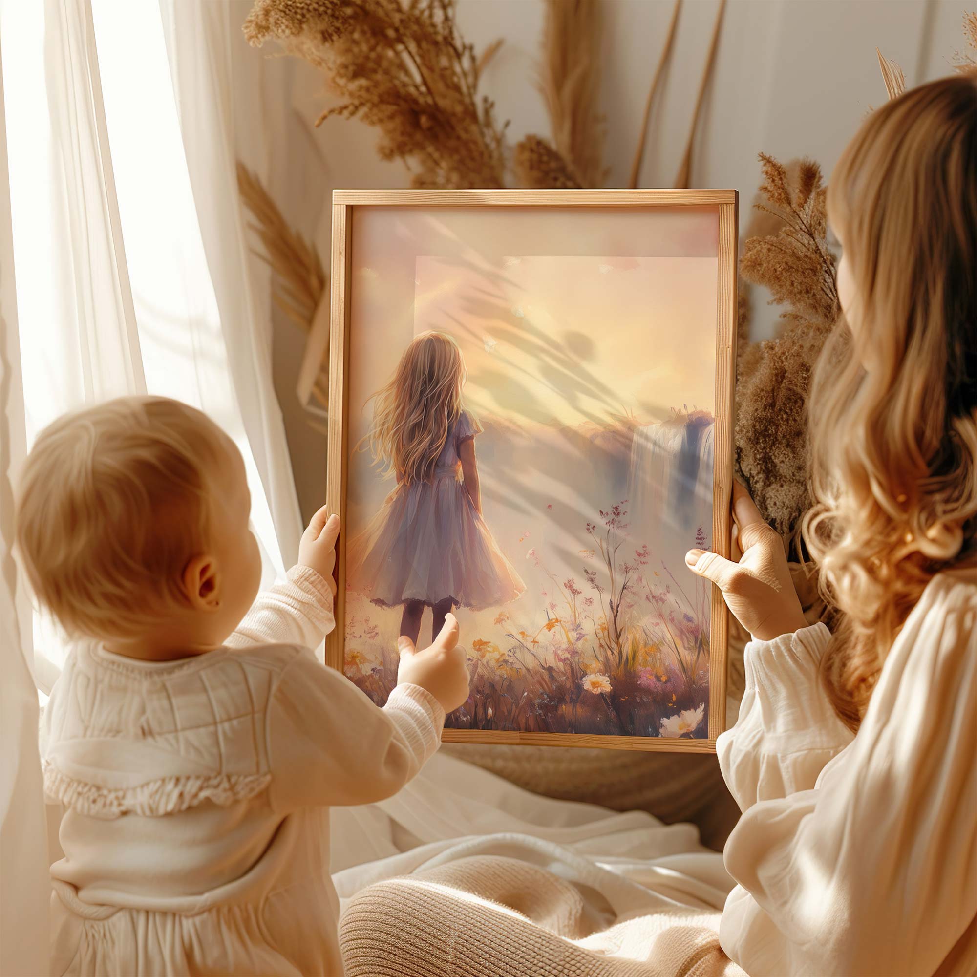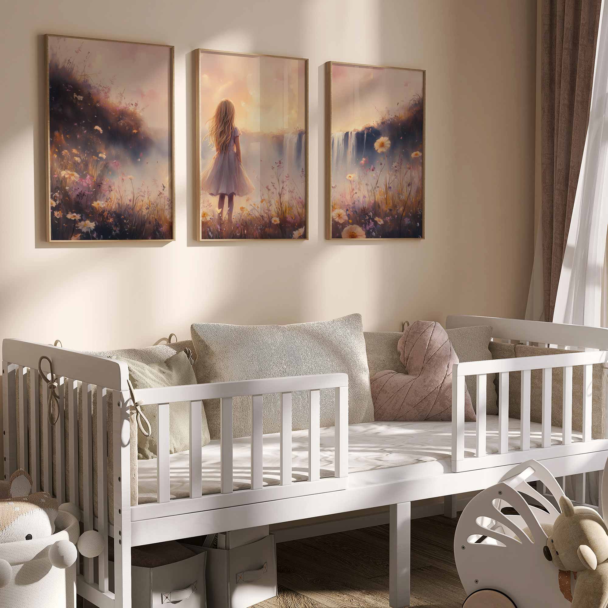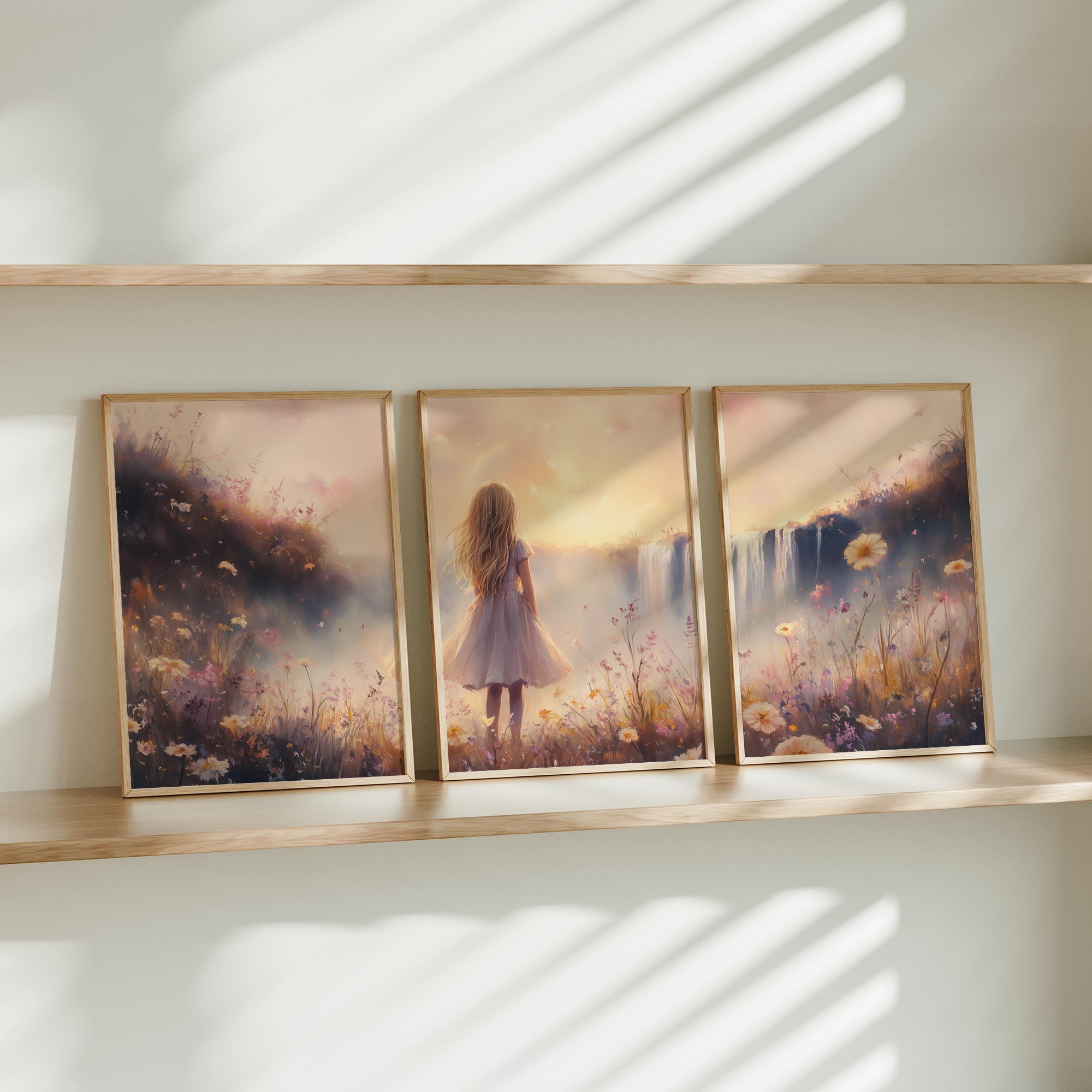 Magisch Meisje bij Waterfall en Bloemenveld