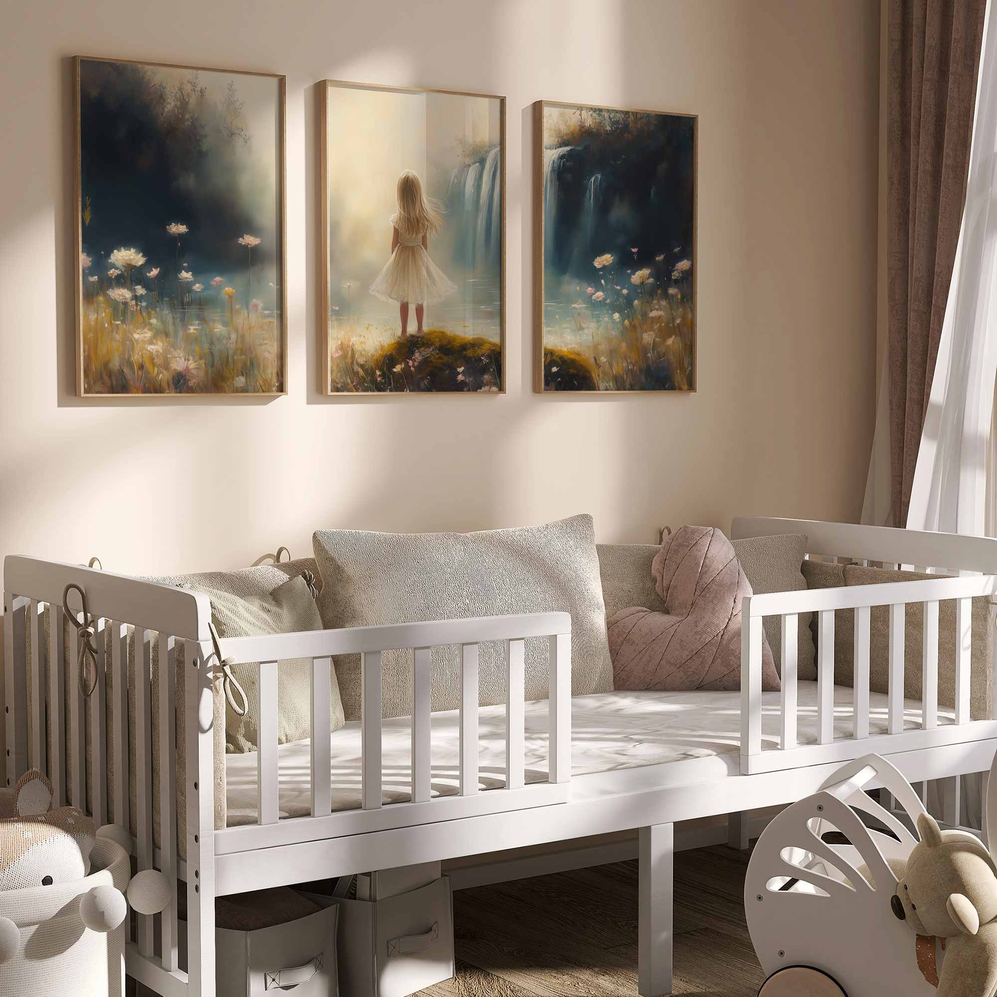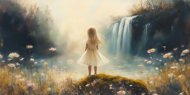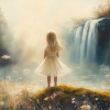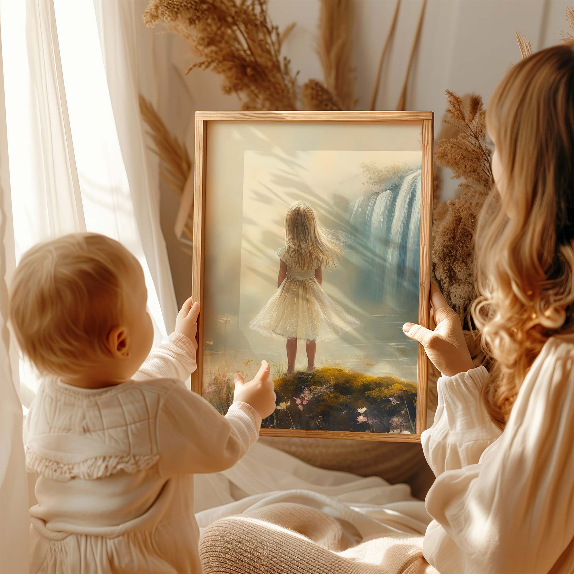 Magisch Meisje bij Waterval – Dromerig Pastel Decor