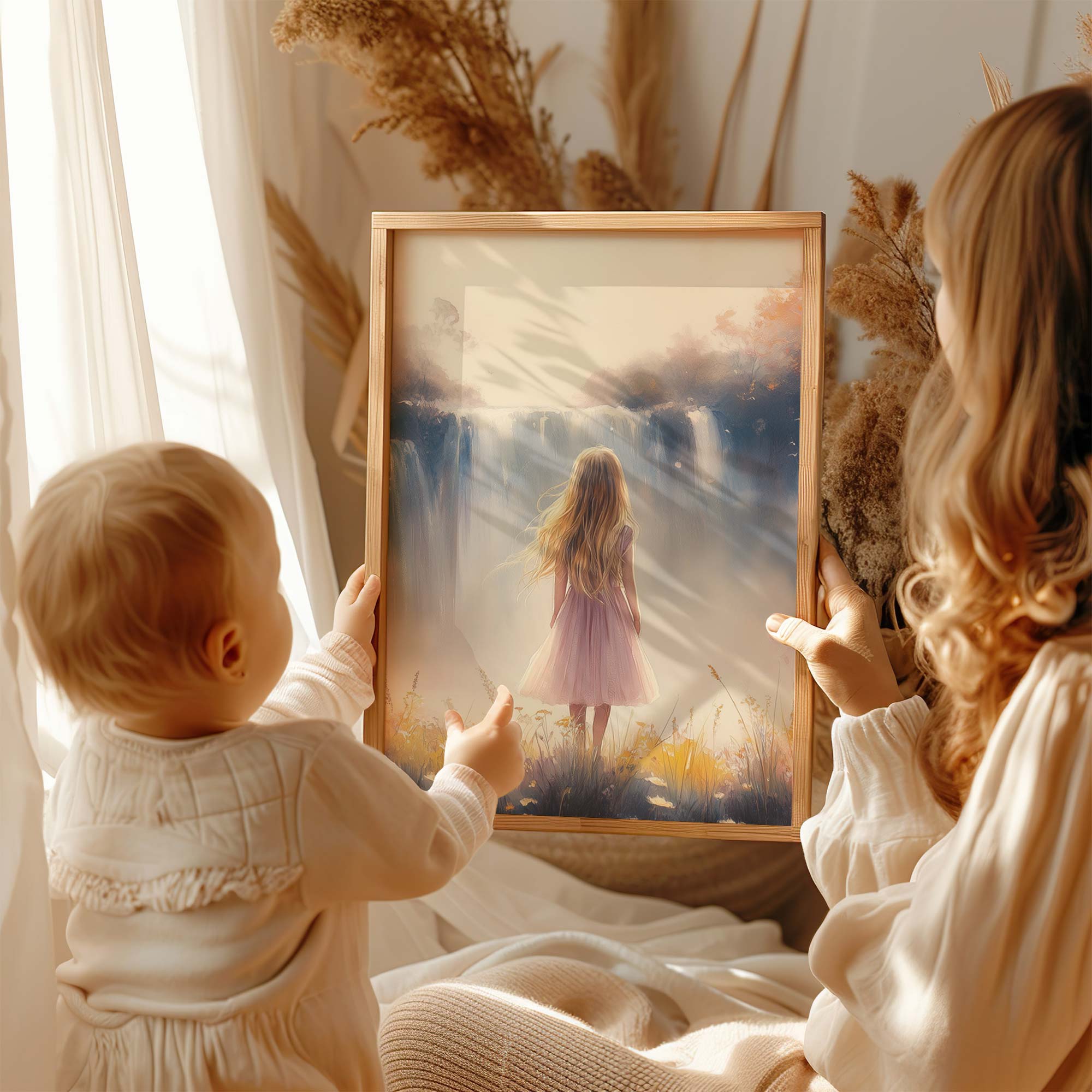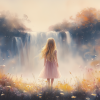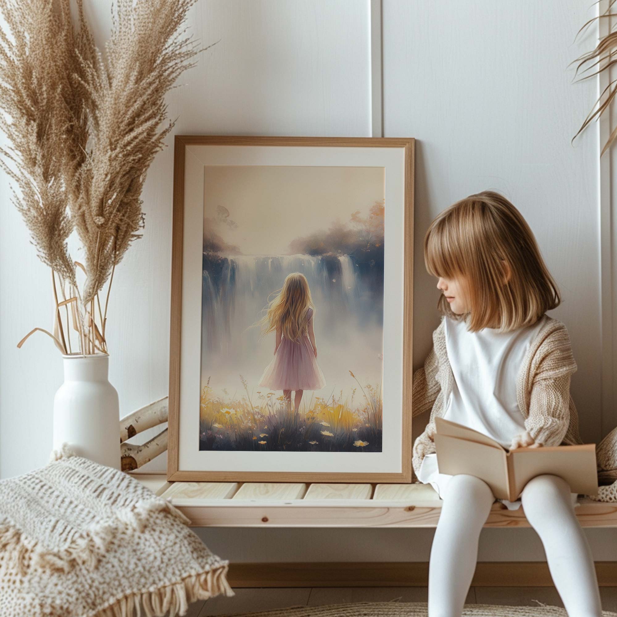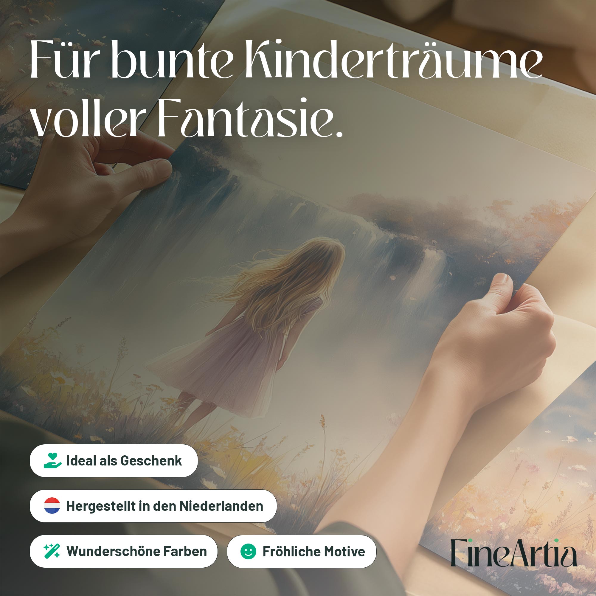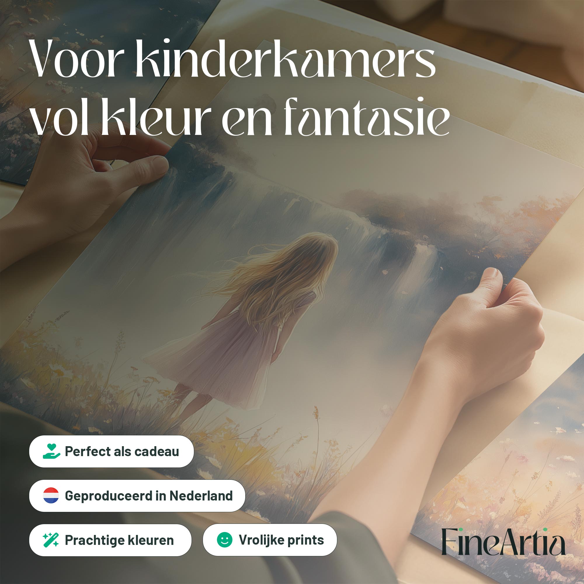 Terug naar collectie Posters Magisch Meisje bij Waterval in Bloemenveld