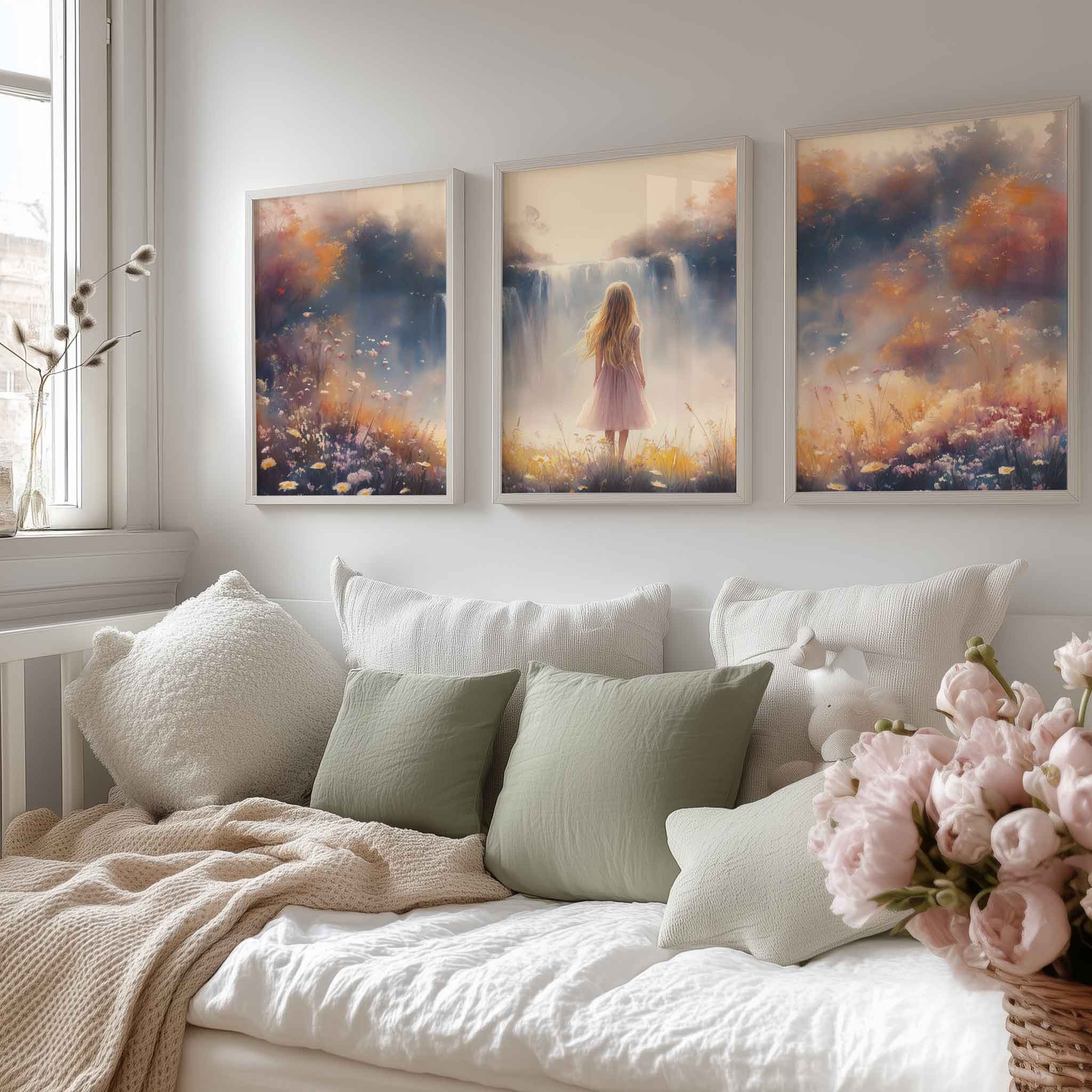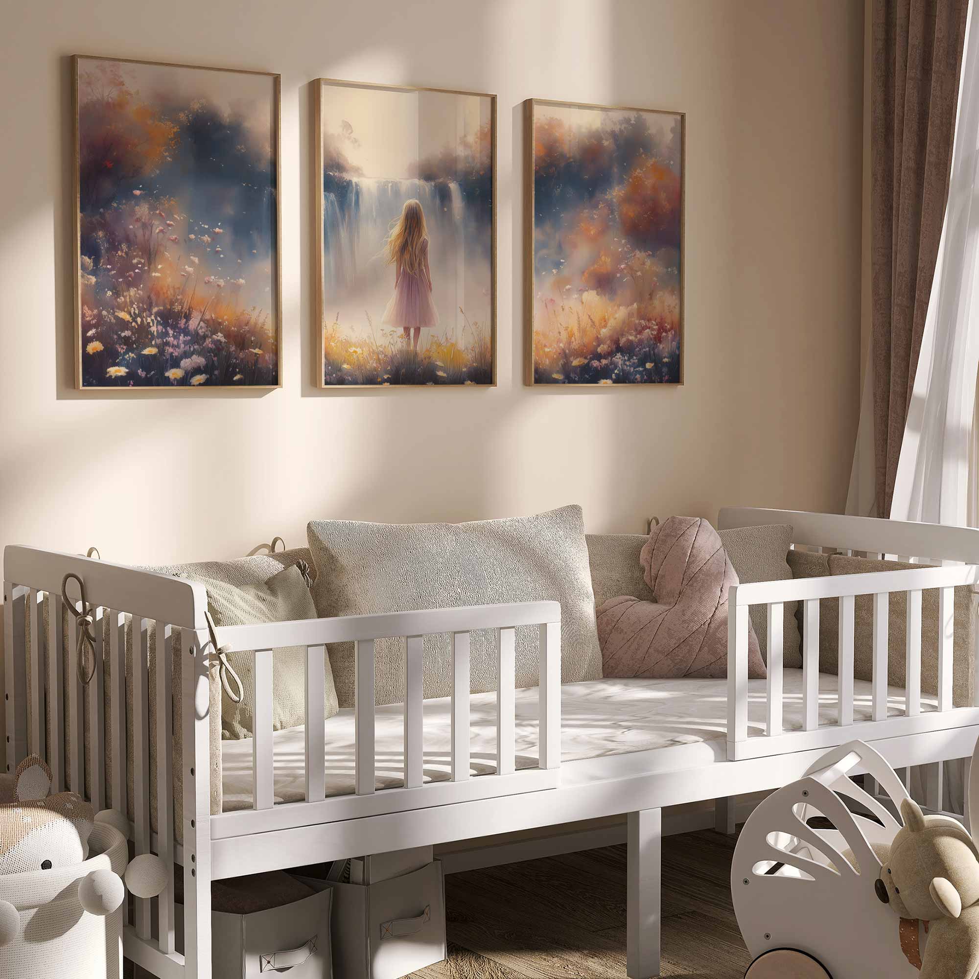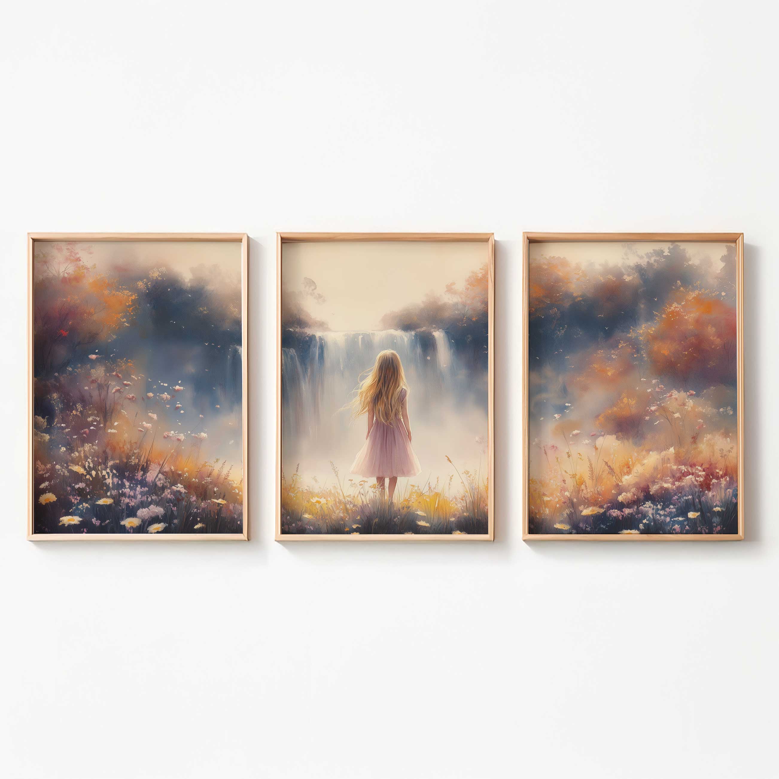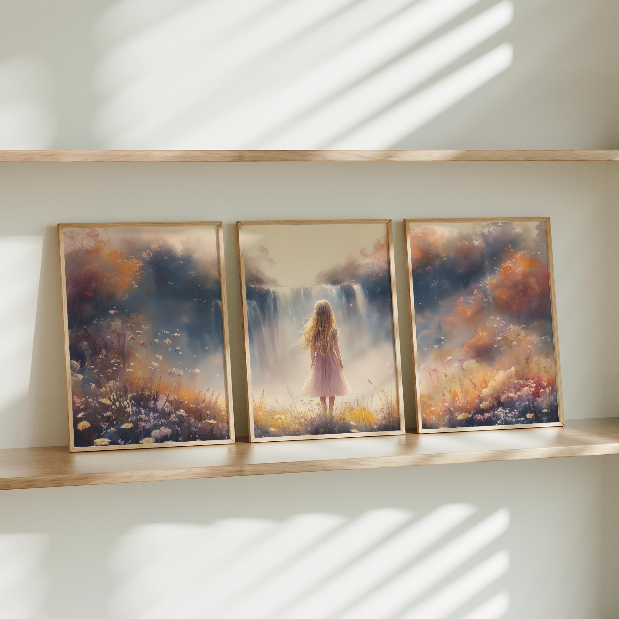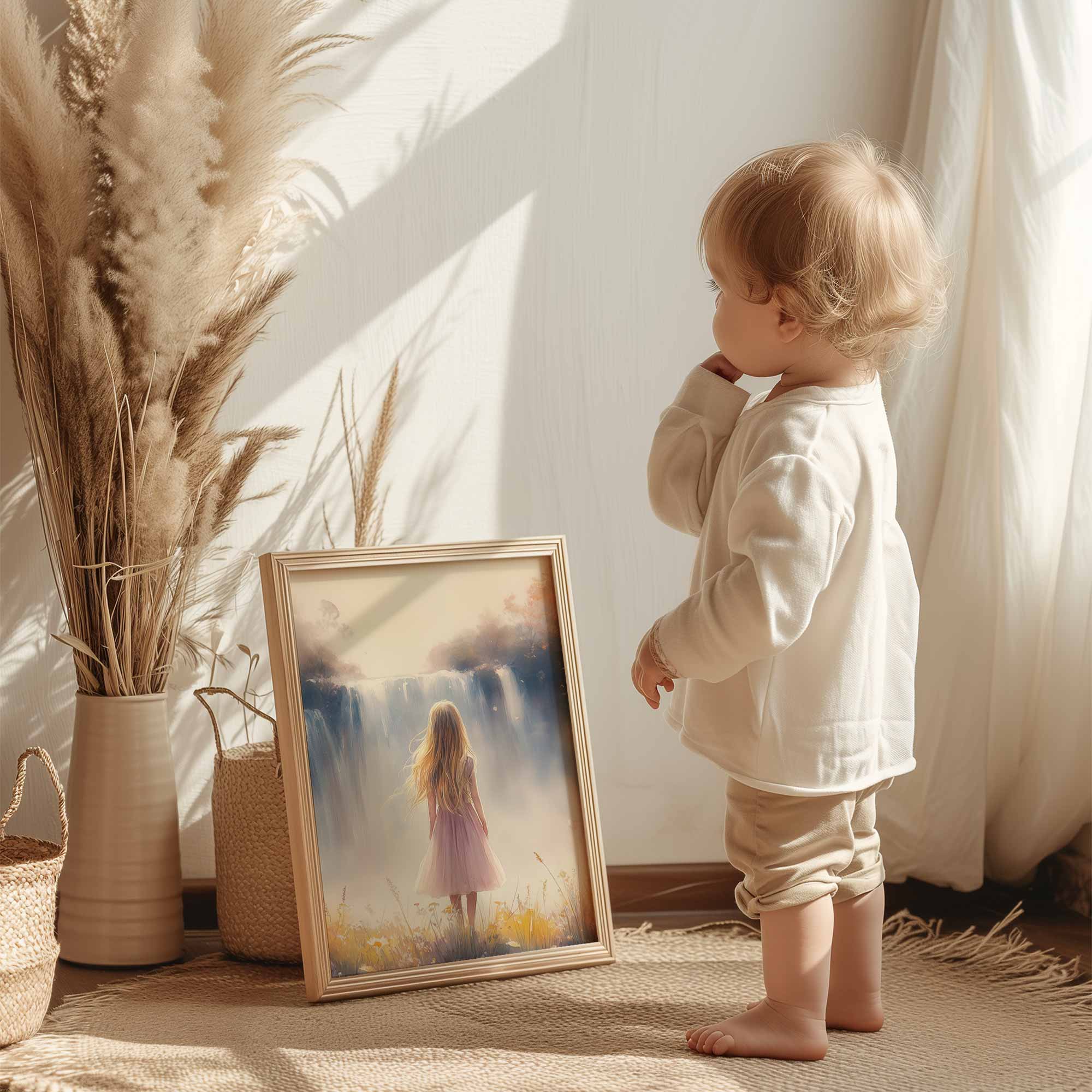 Terug naar collectie Posters Magisch Meisje bij Waterval in Bloemenveld