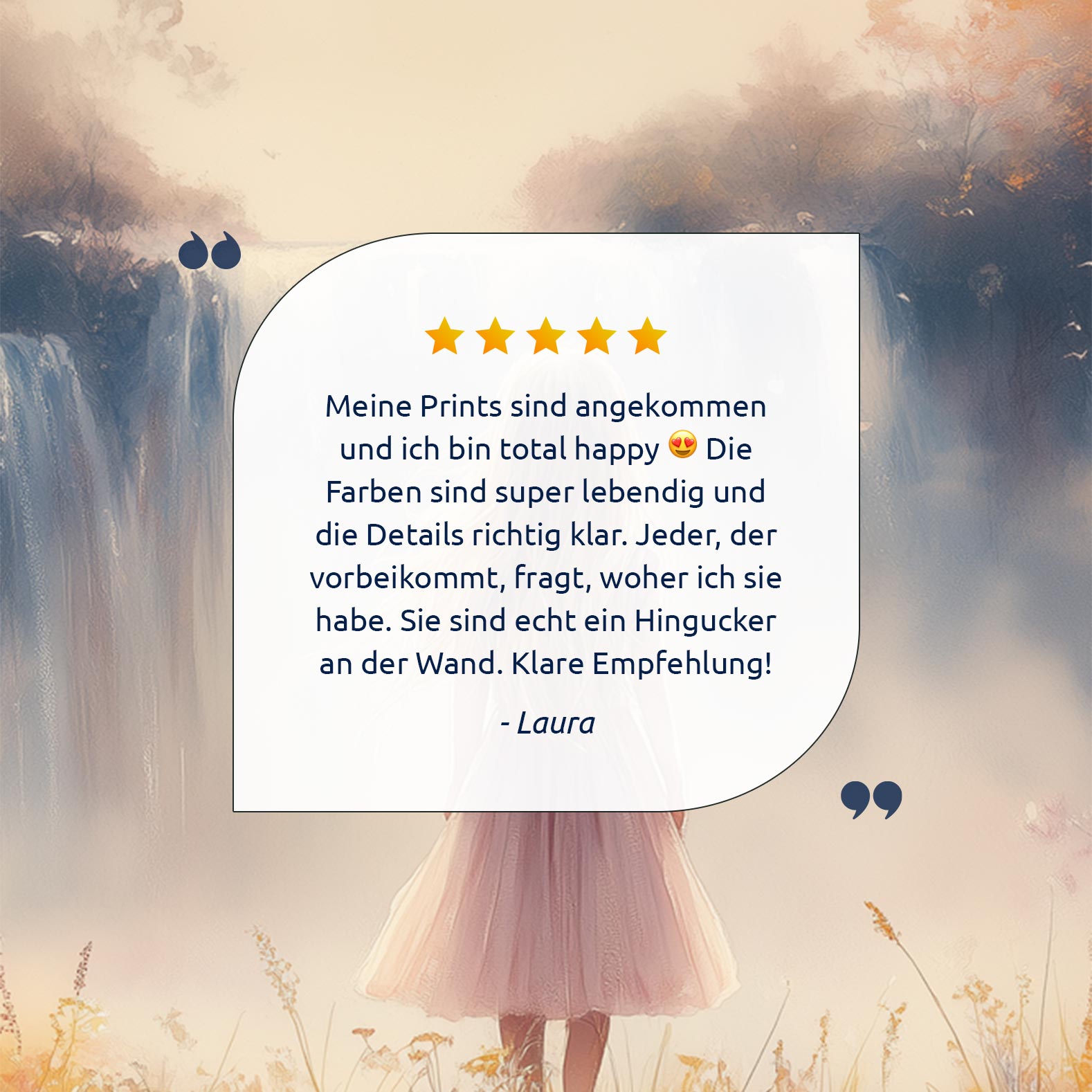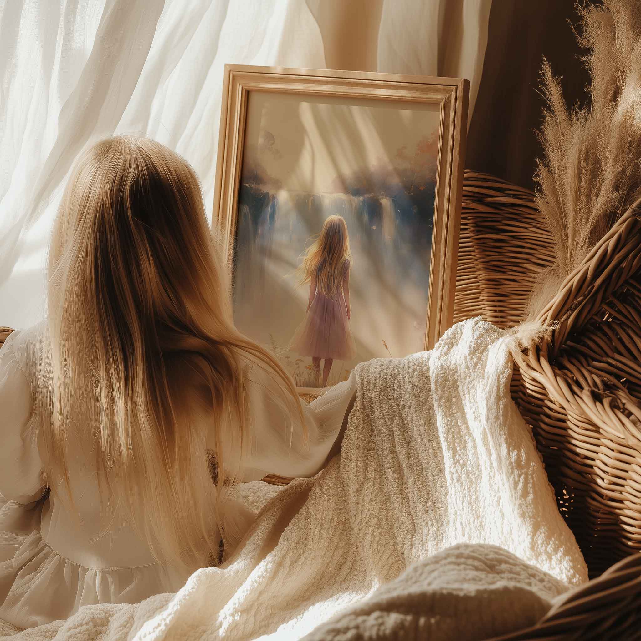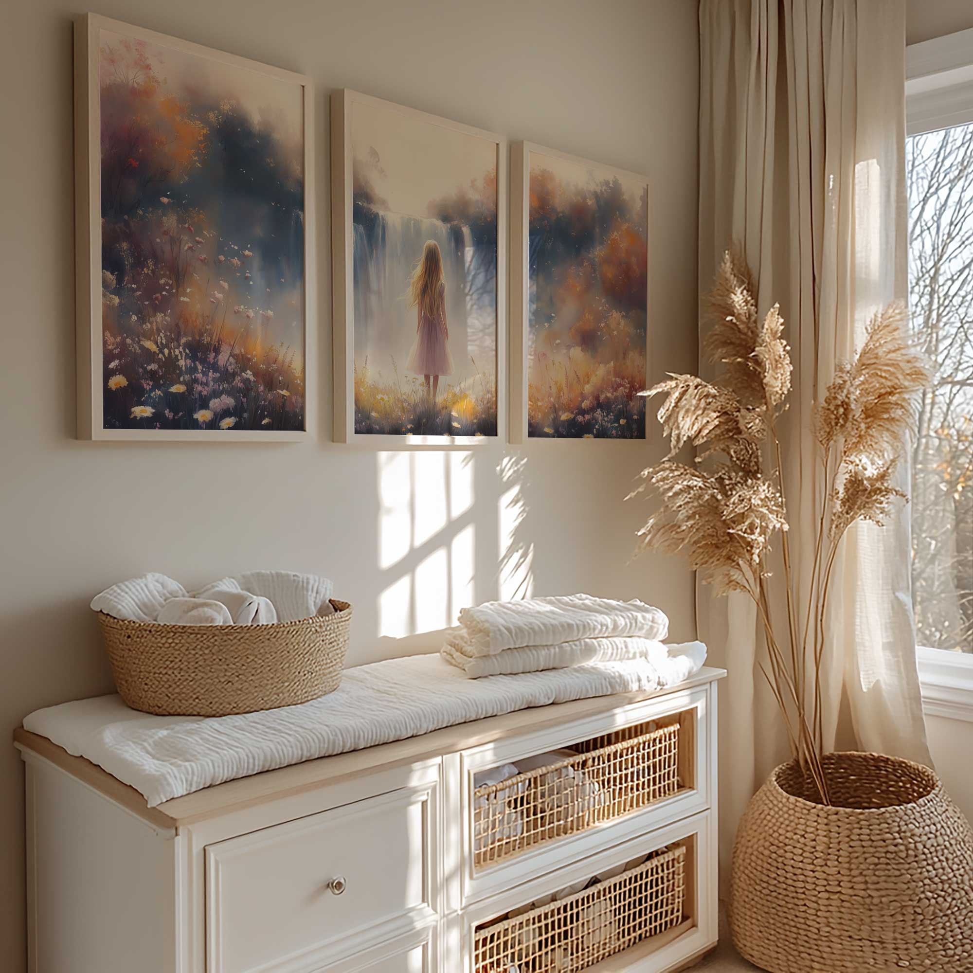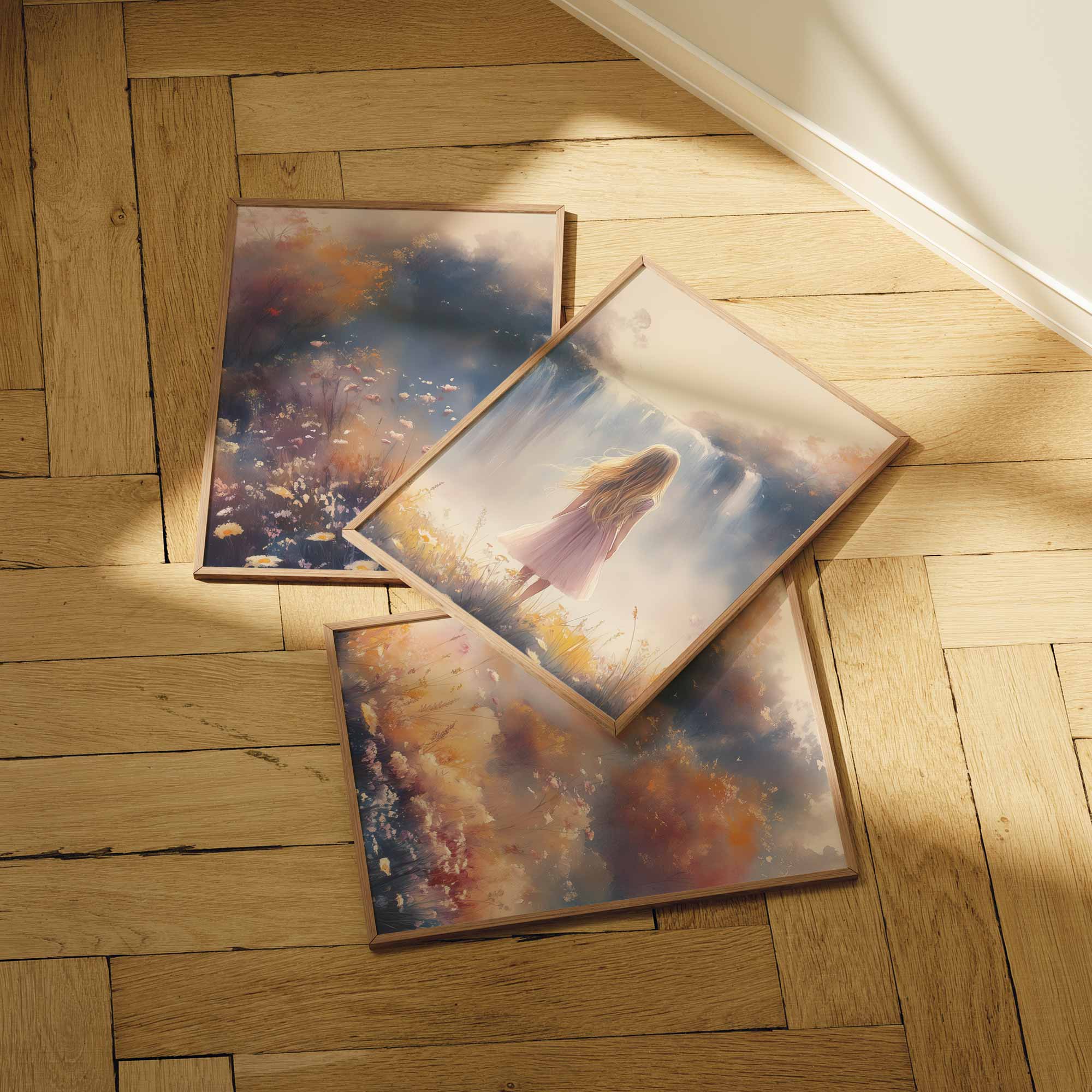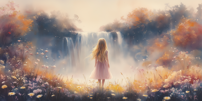 Terug naar collectie Posters Magisch Meisje bij Waterval in Bloemenveld