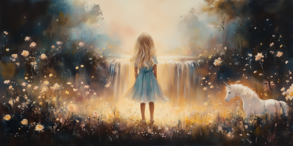 Magisch Meisje en Eenhoorn in Dromerig Bloemenveld
