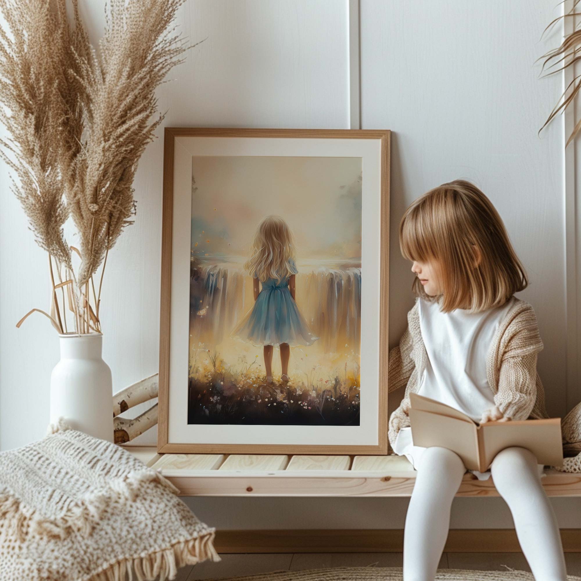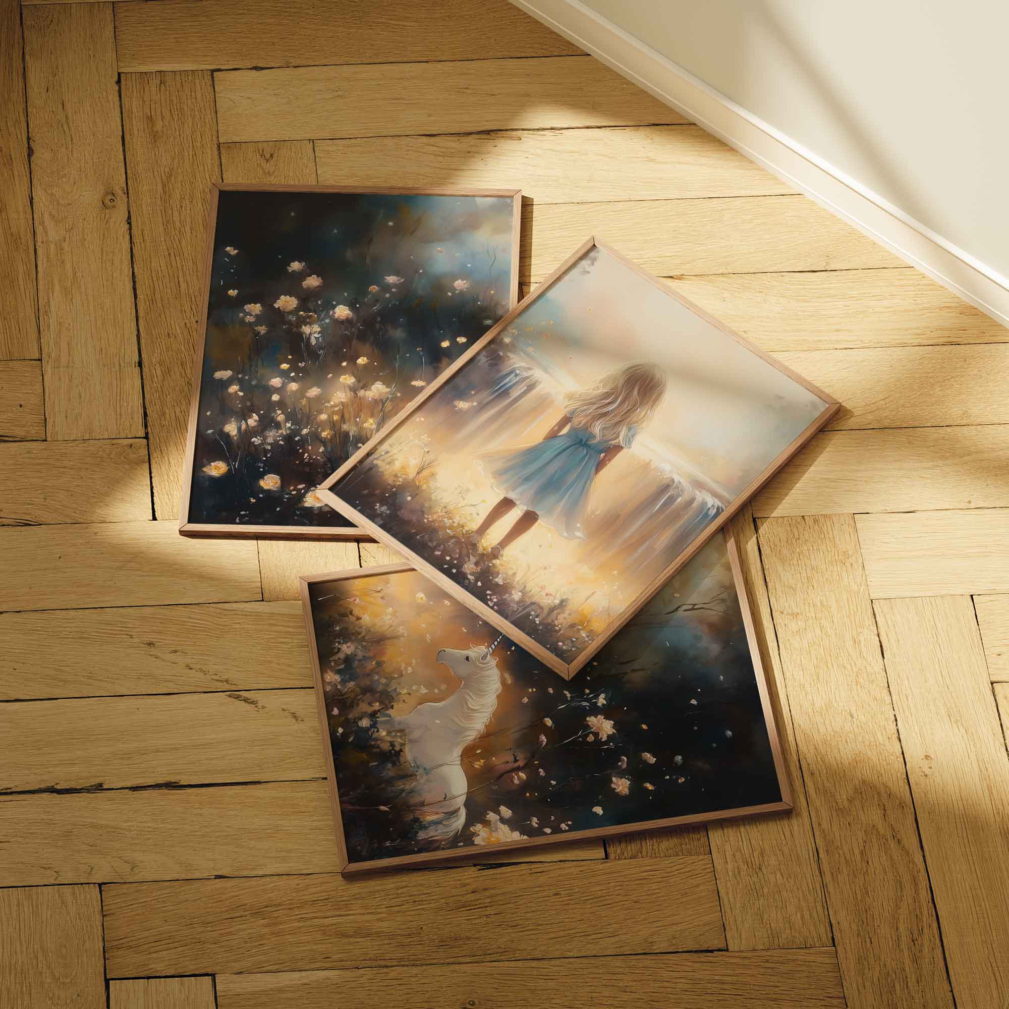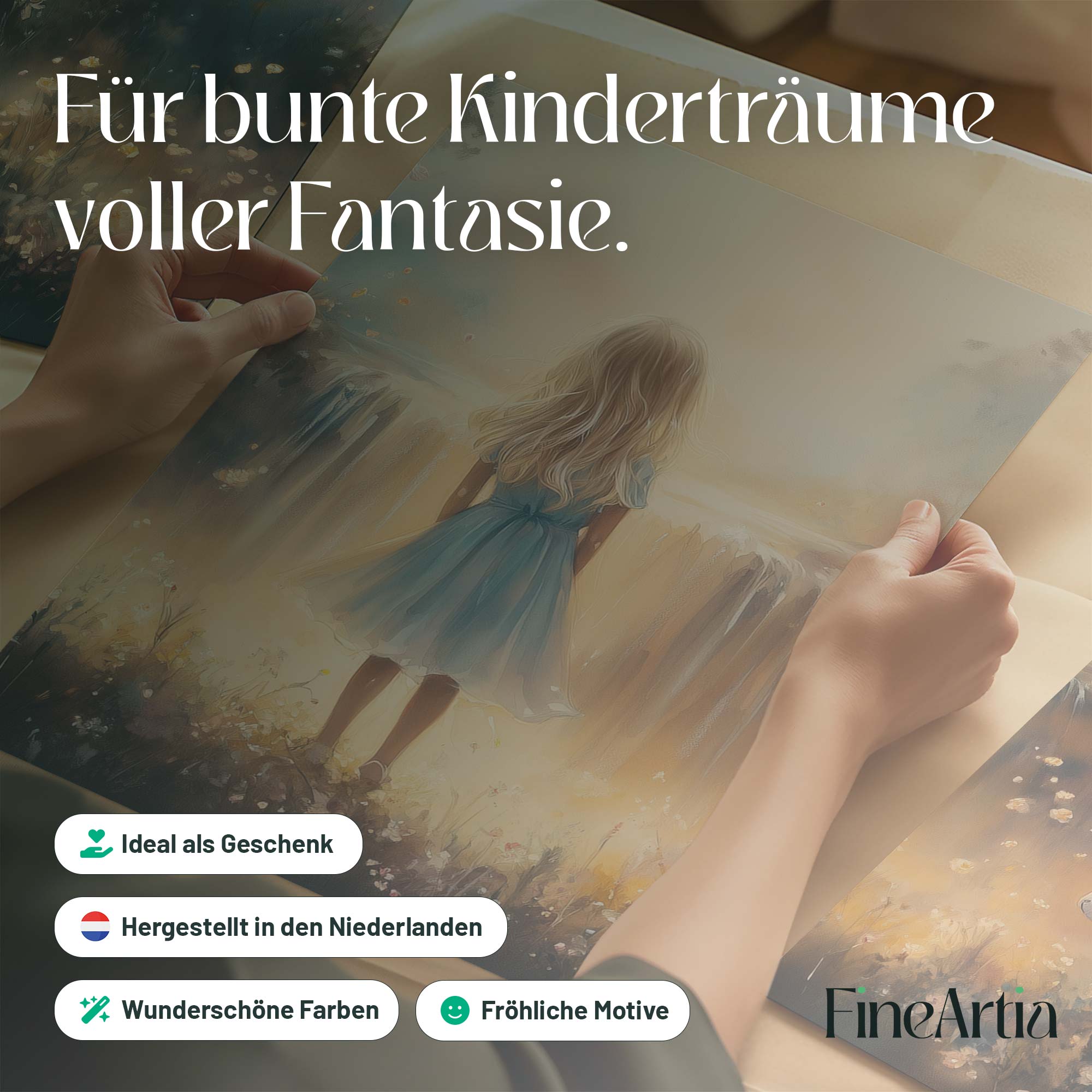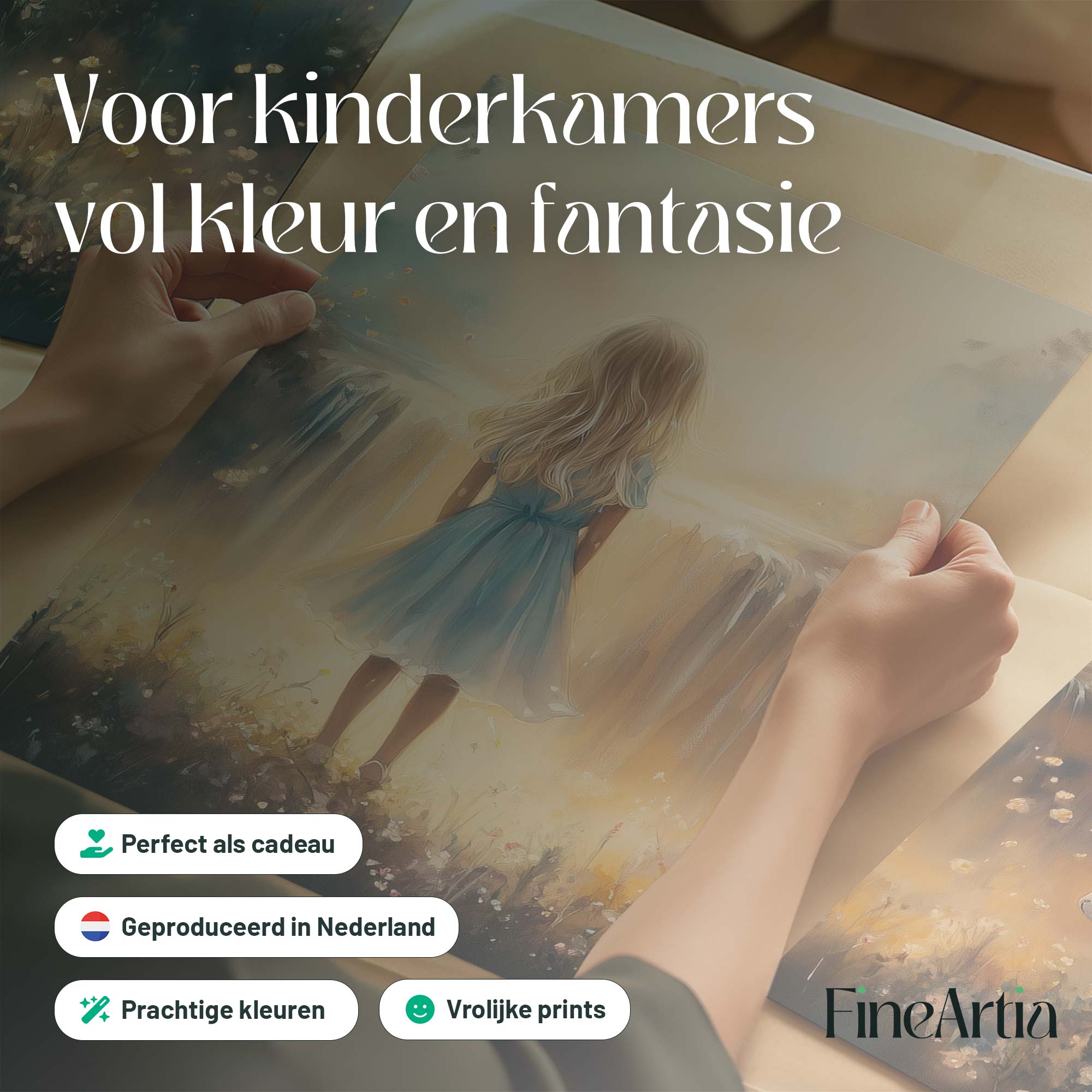 Terug naar collectie Posters Magisch Meisje en Eenhoorn in Dromerig Bloemenveld