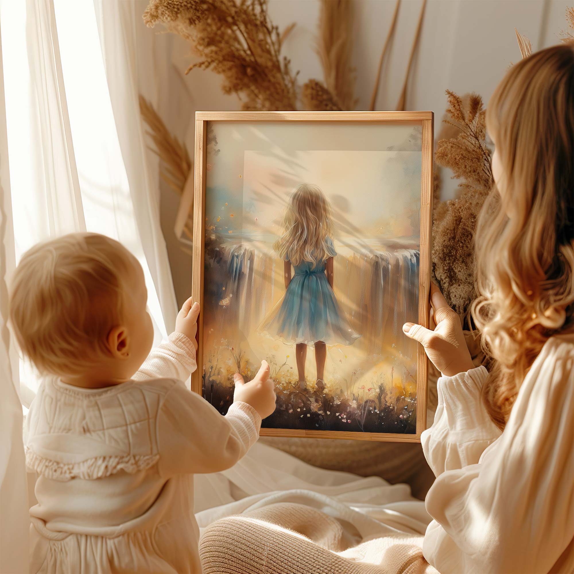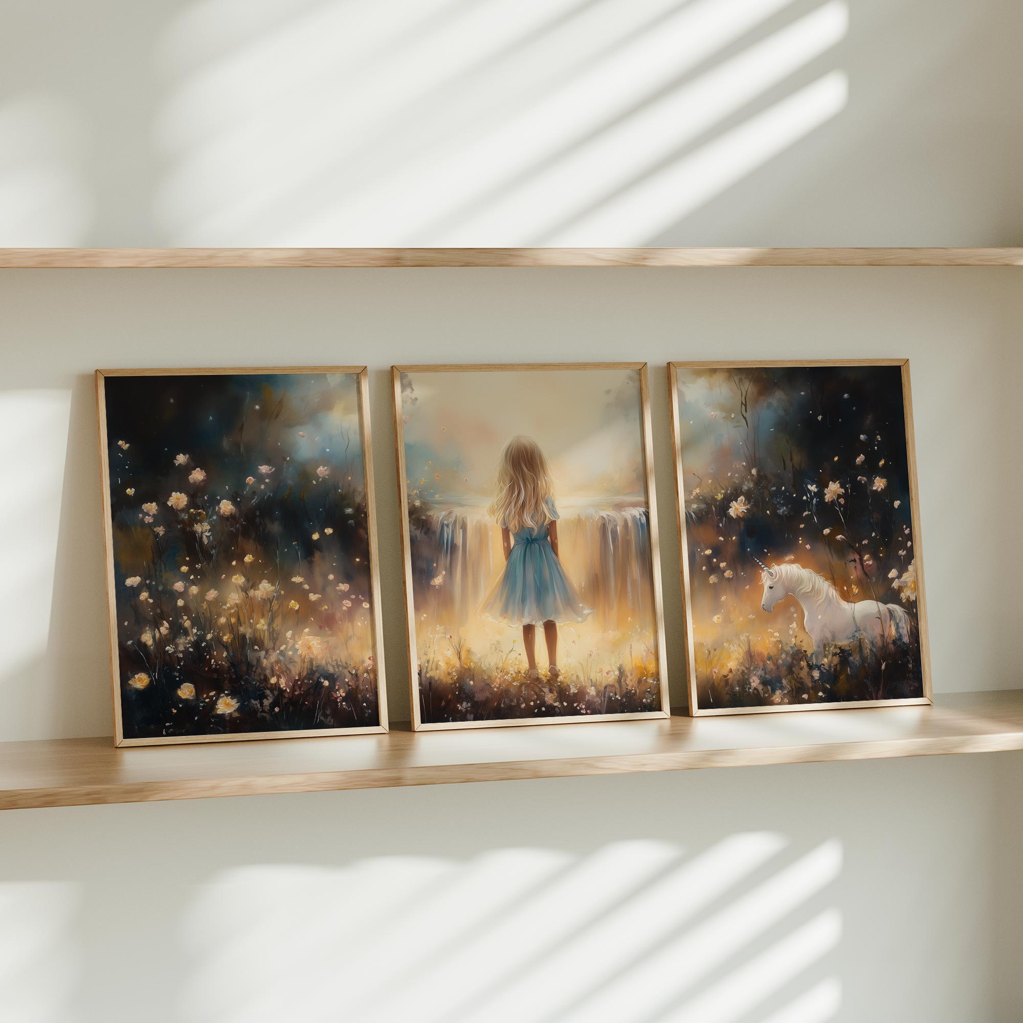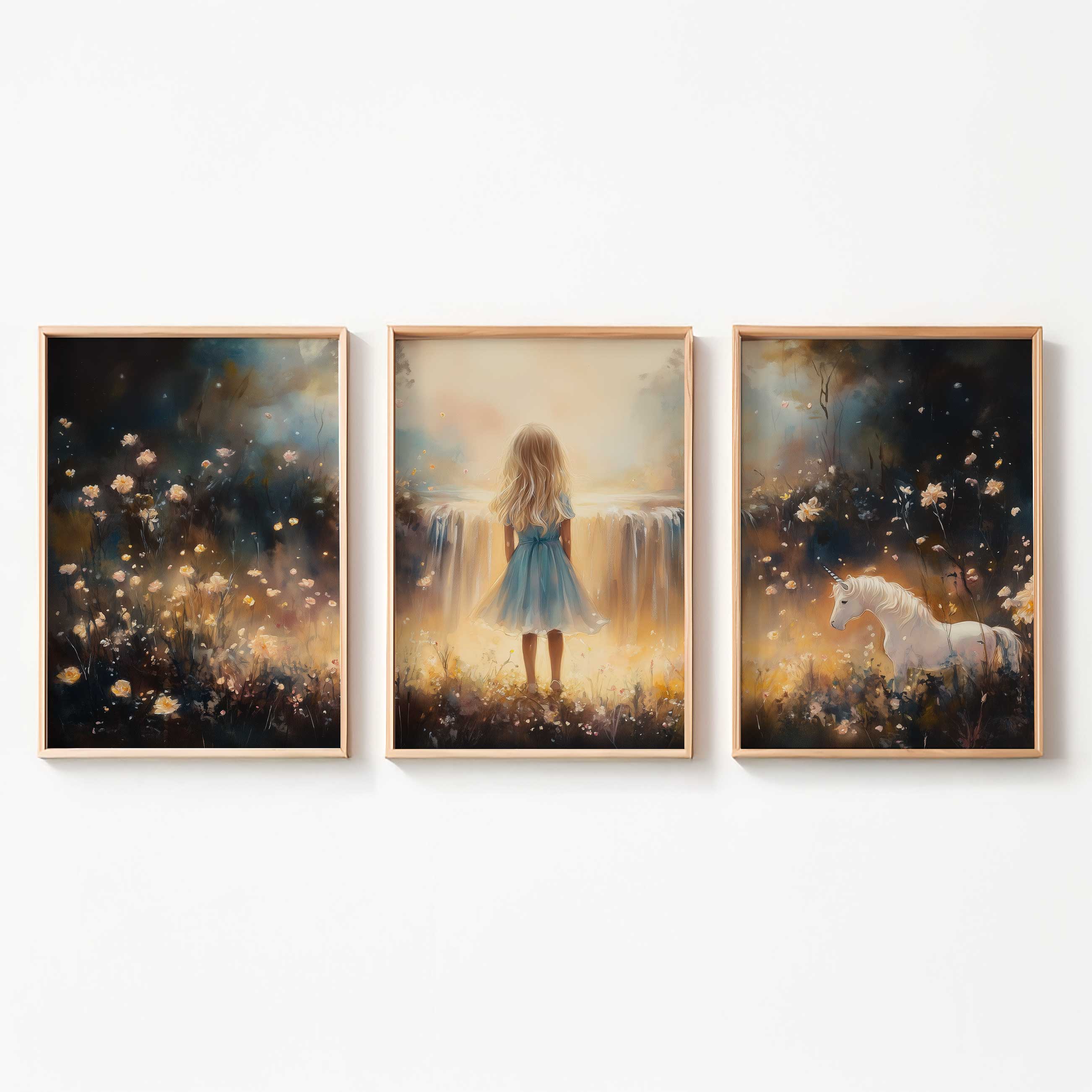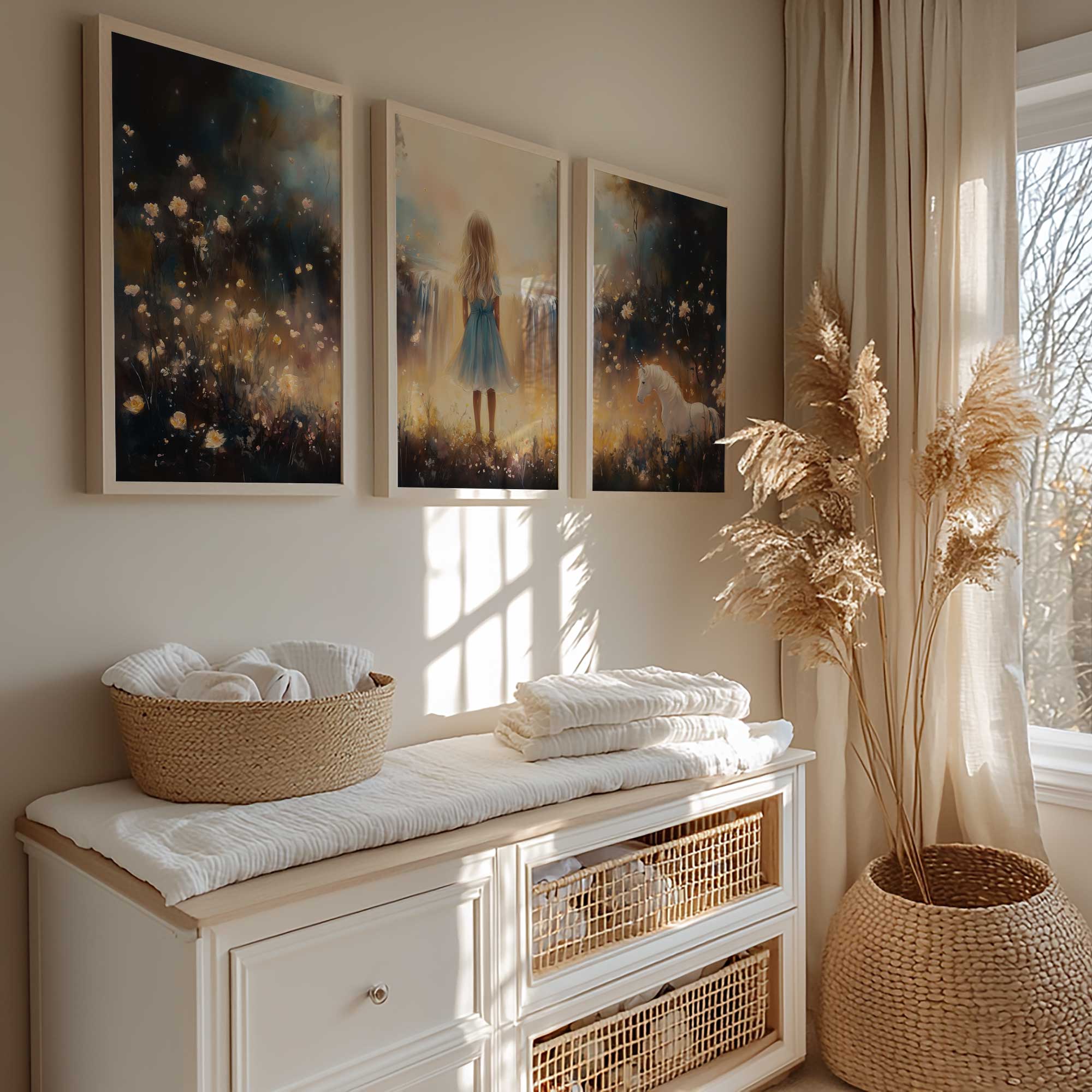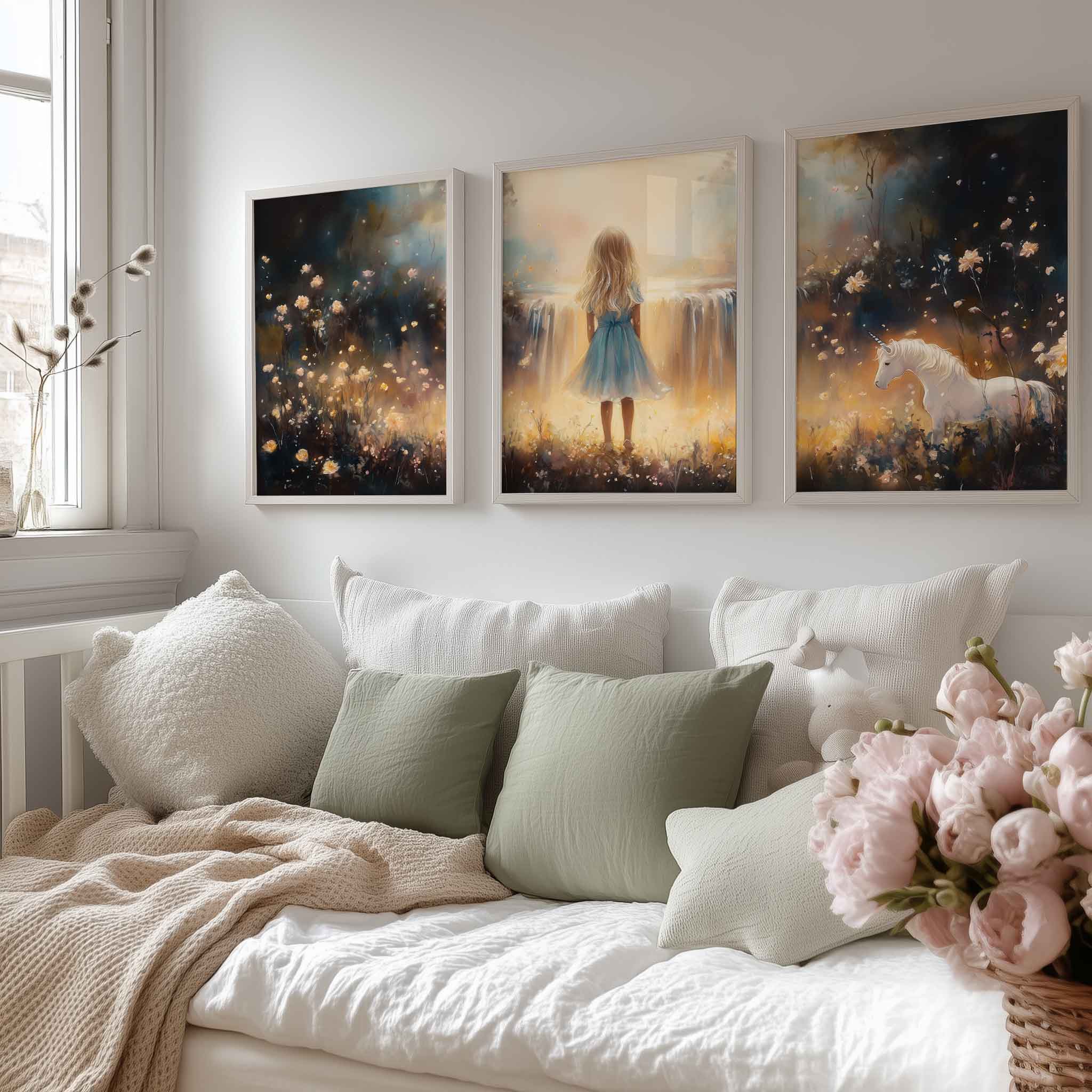 Terug naar collectie Posters Magisch Meisje en Eenhoorn in Dromerig Bloemenveld
