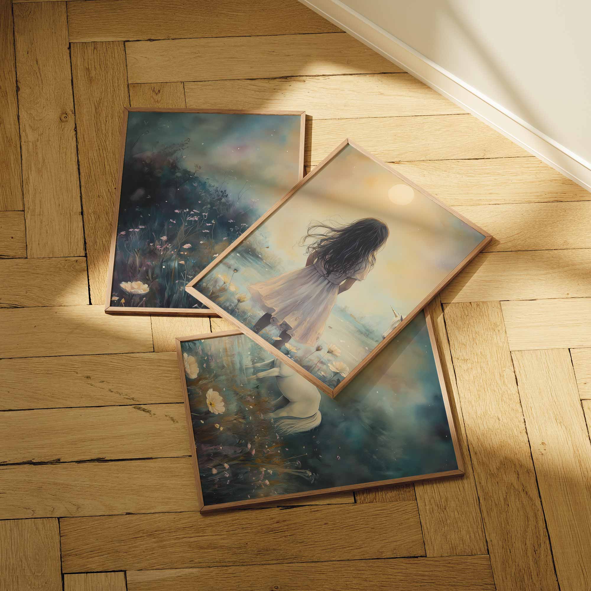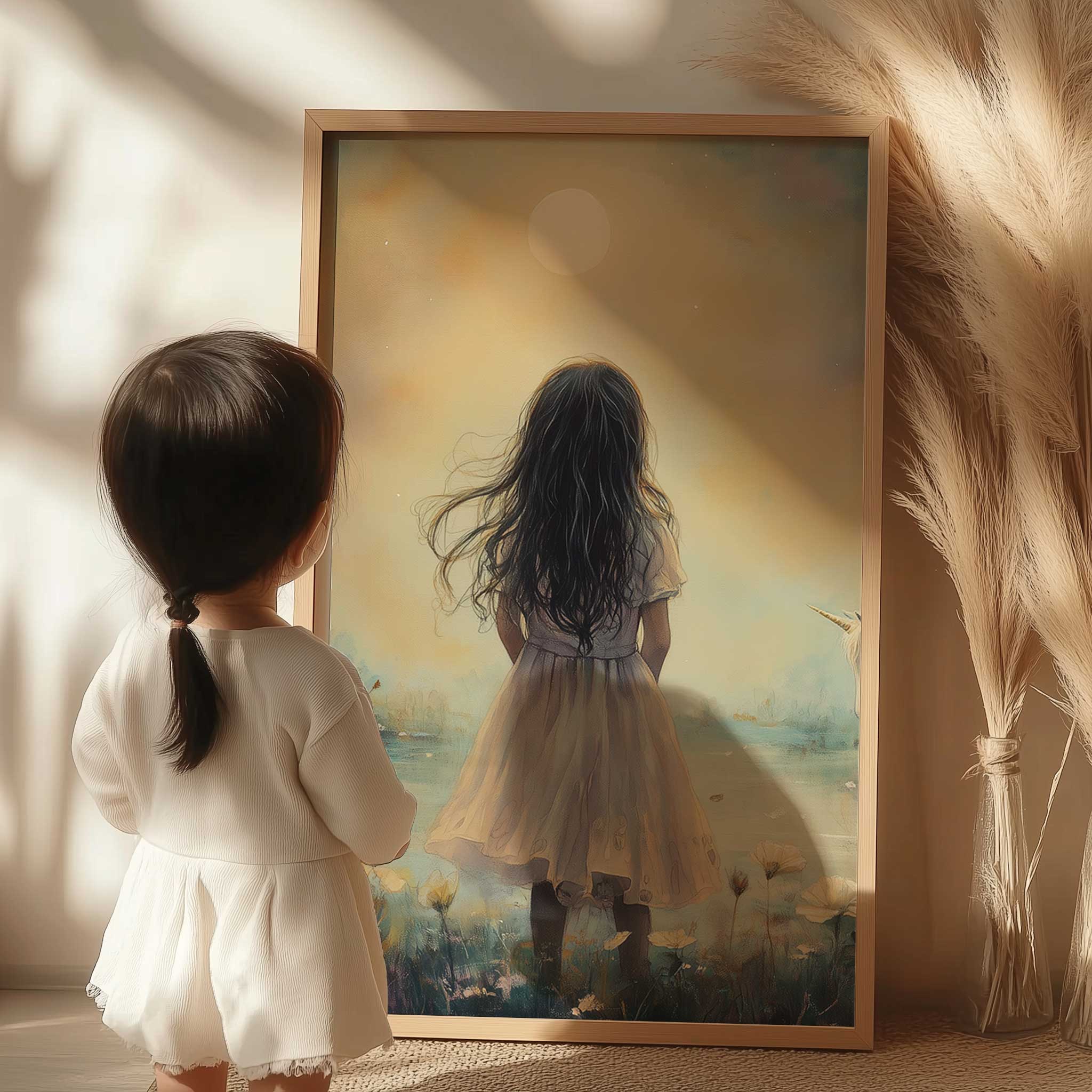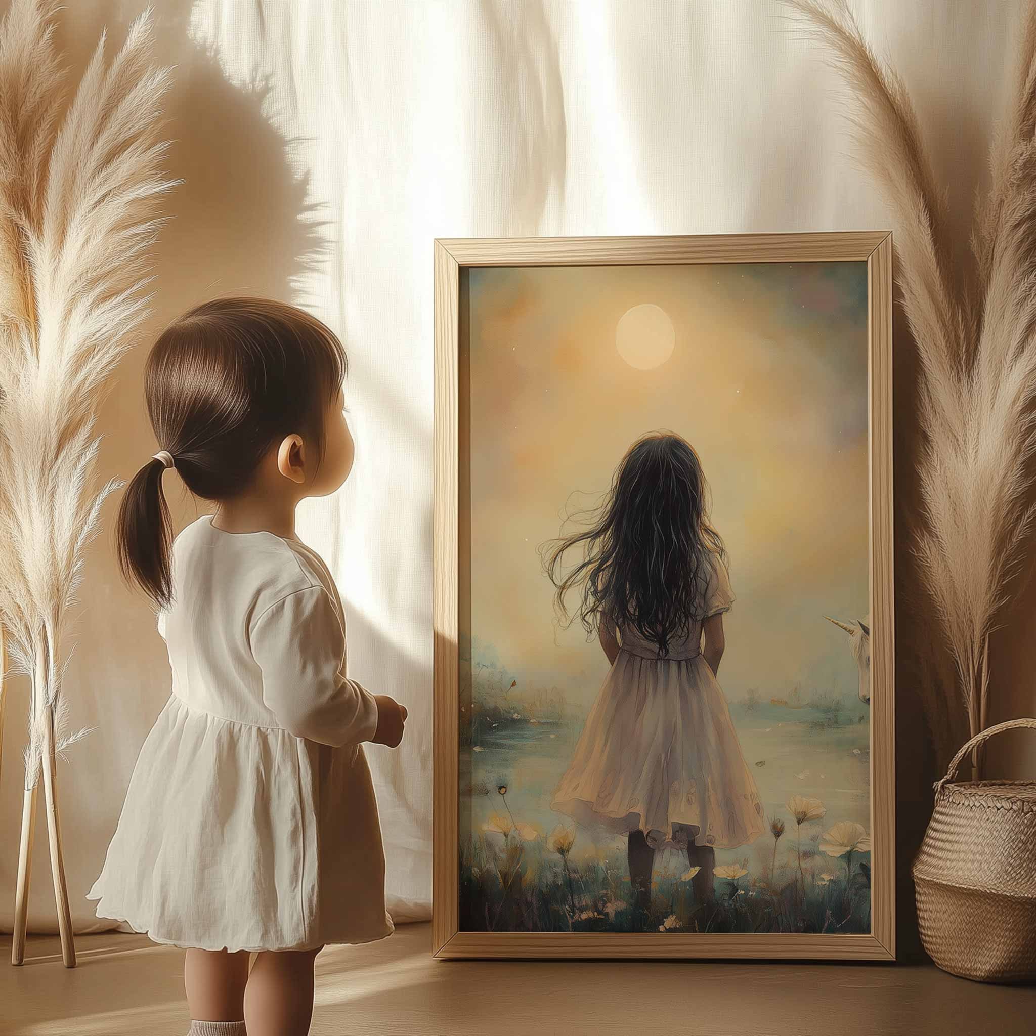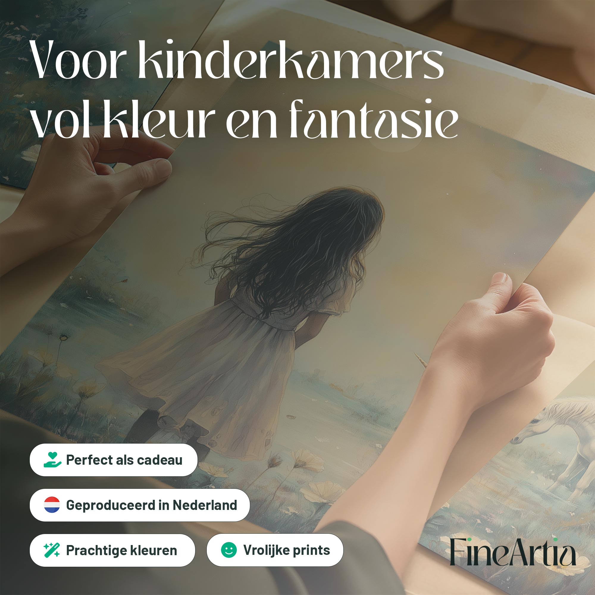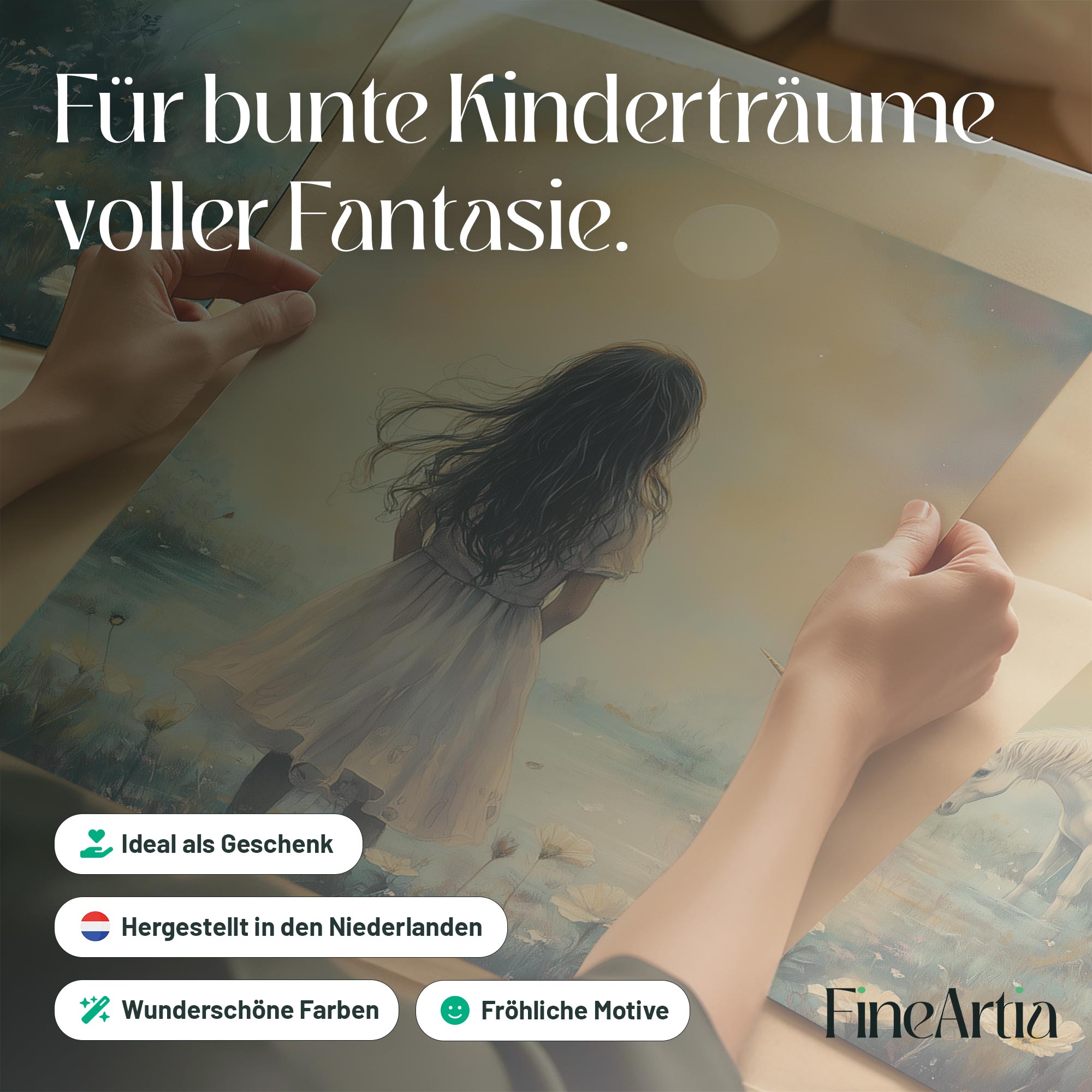Terug naar collectie Posters Magisch Meisje en Eenhoorn in Dromerig Landschap