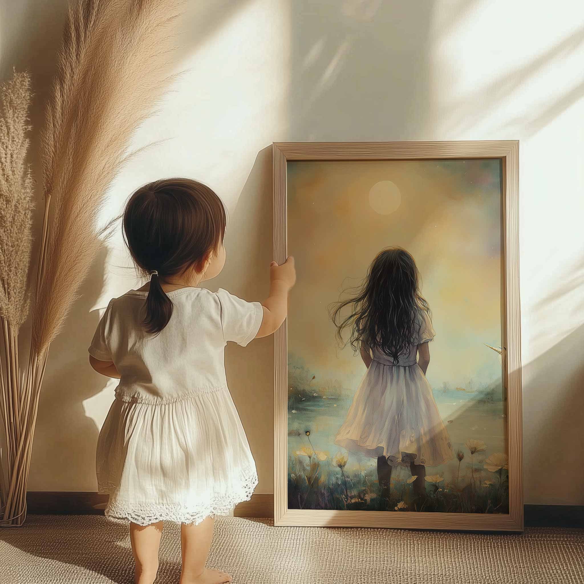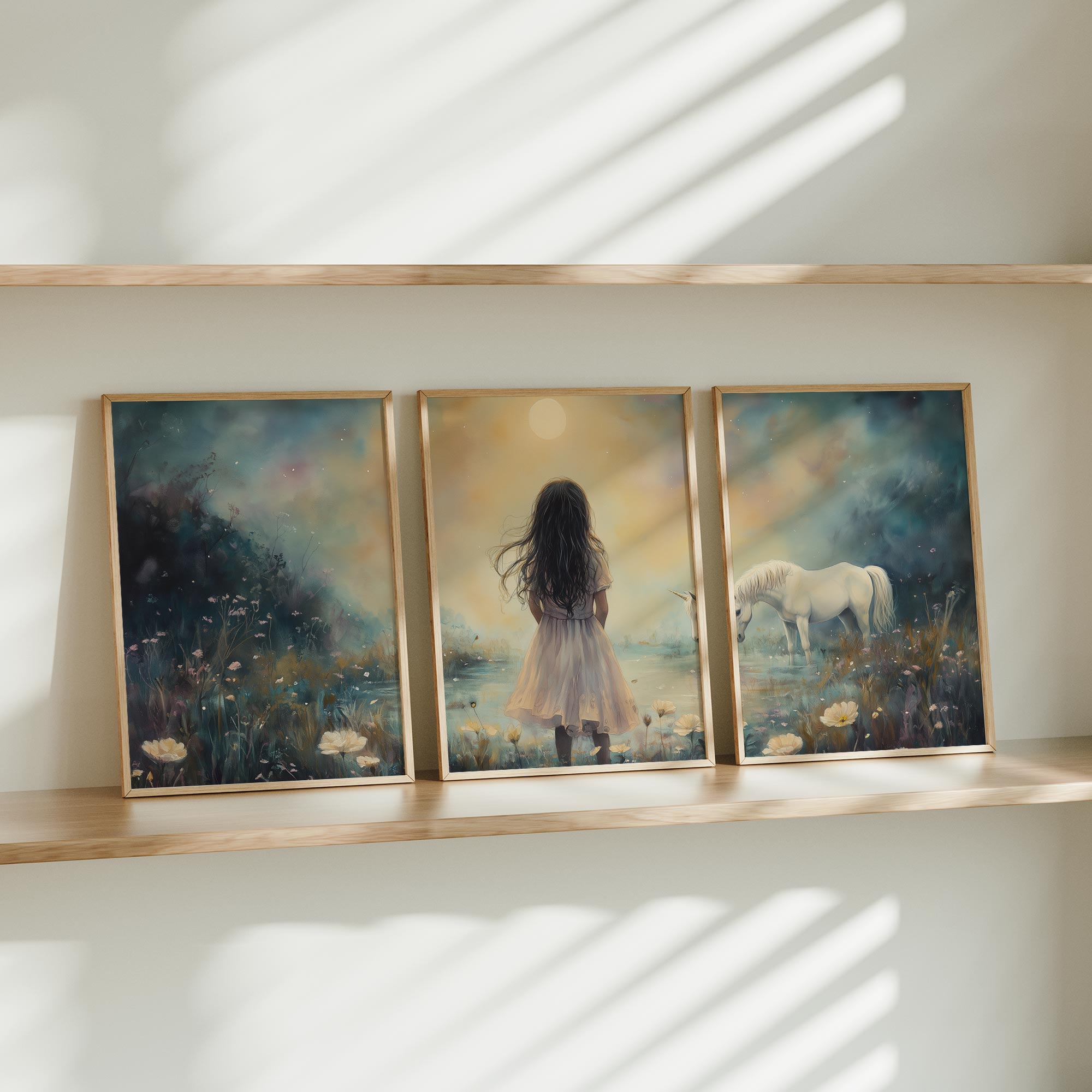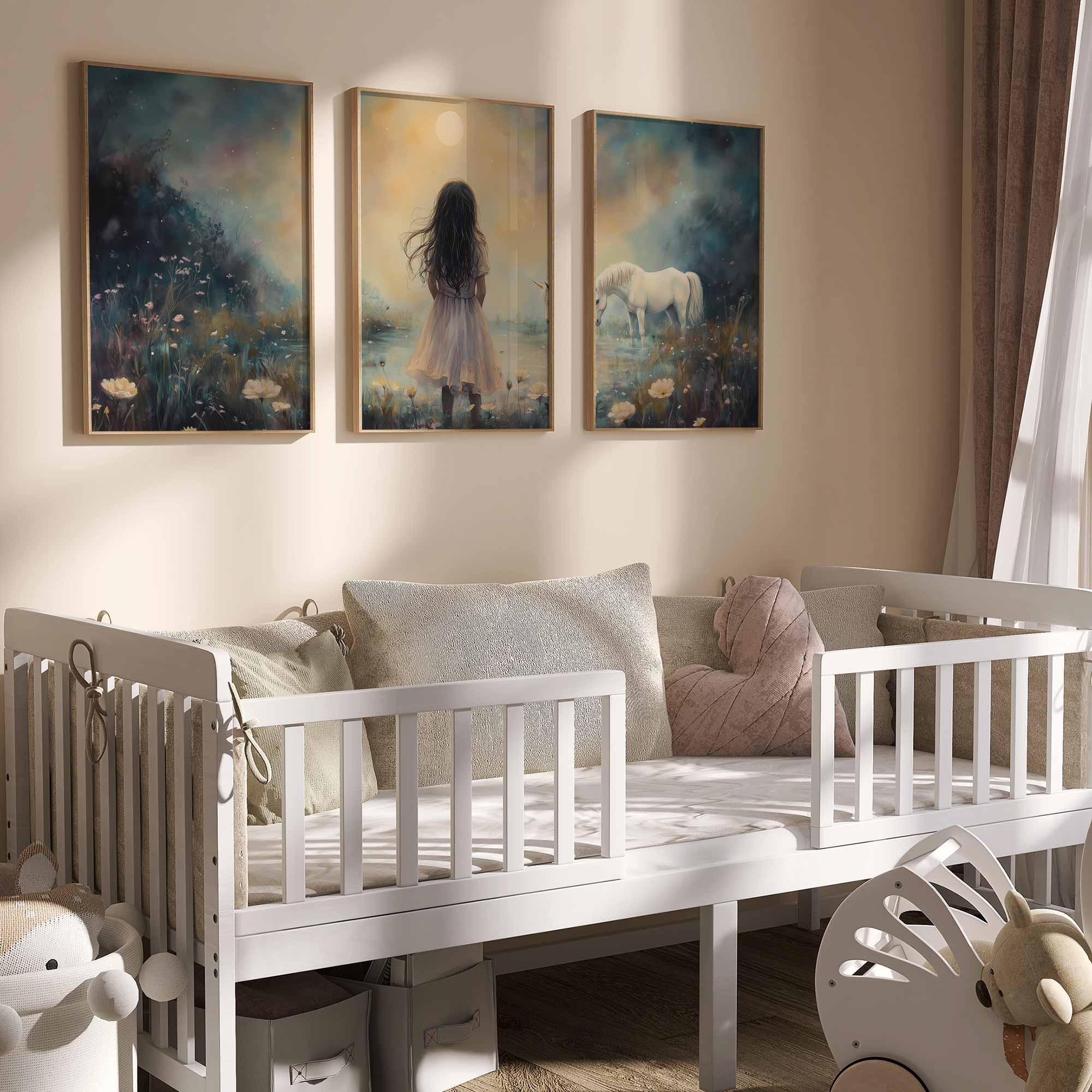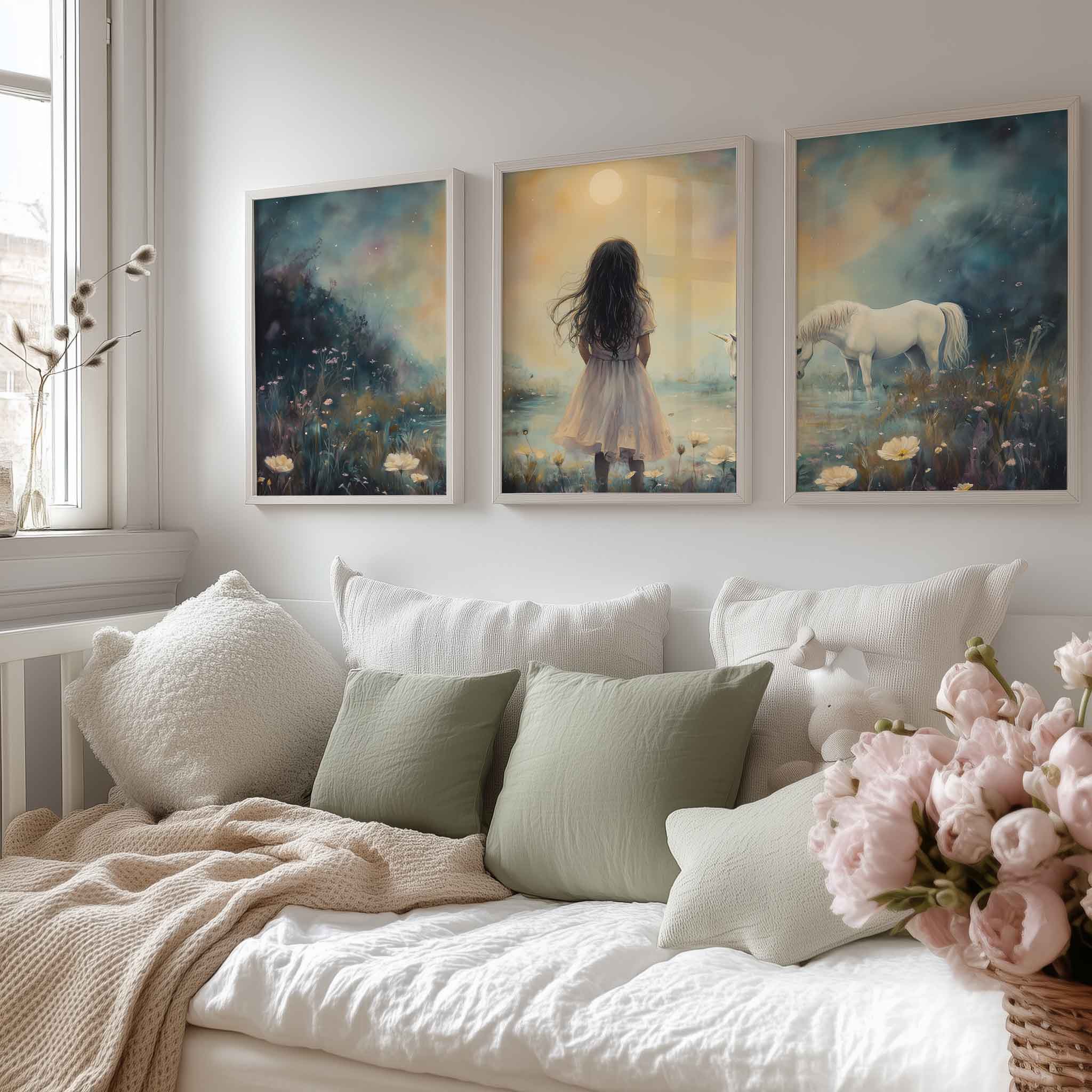 Terug naar collectie Posters Magisch Meisje en Eenhoorn in Dromerig Landschap