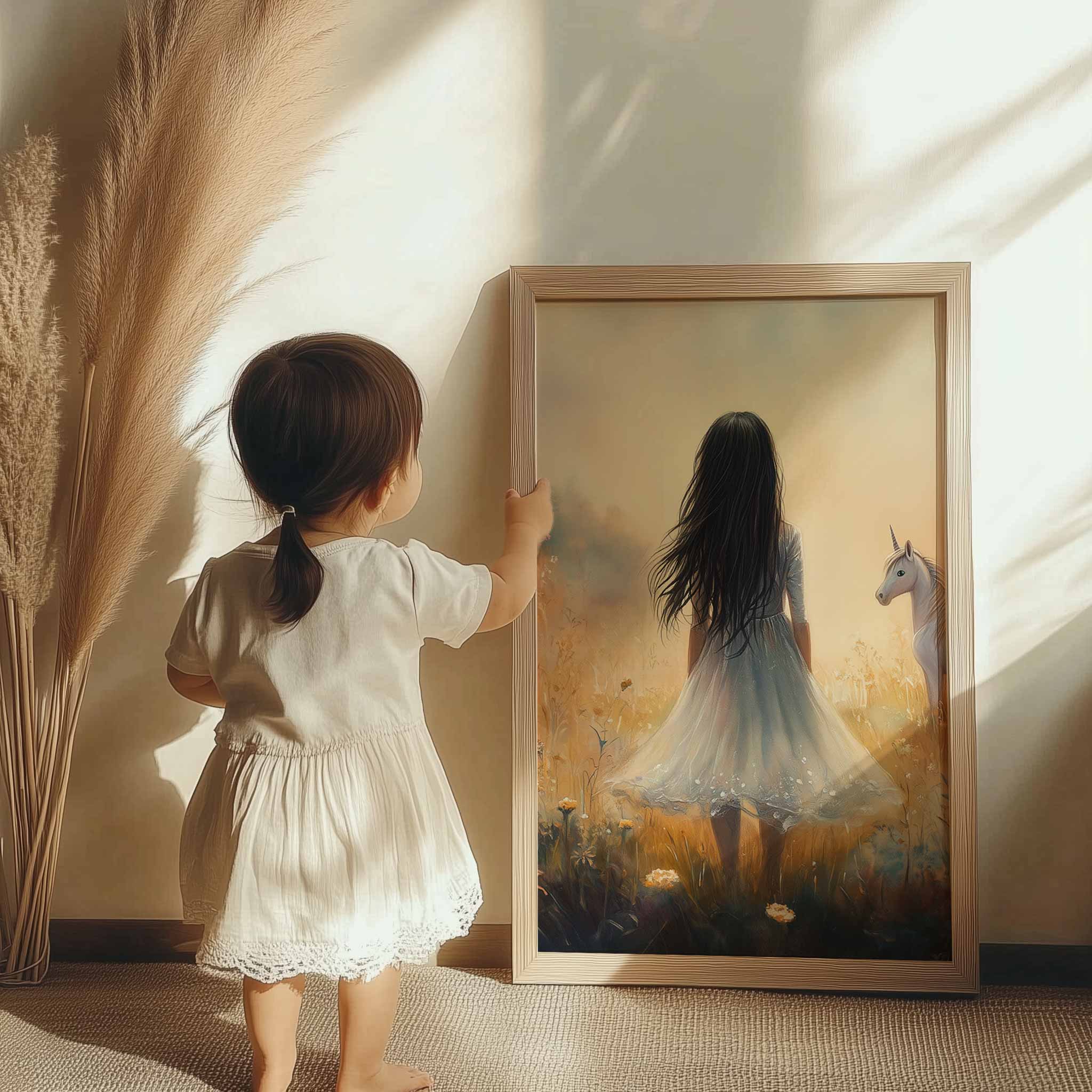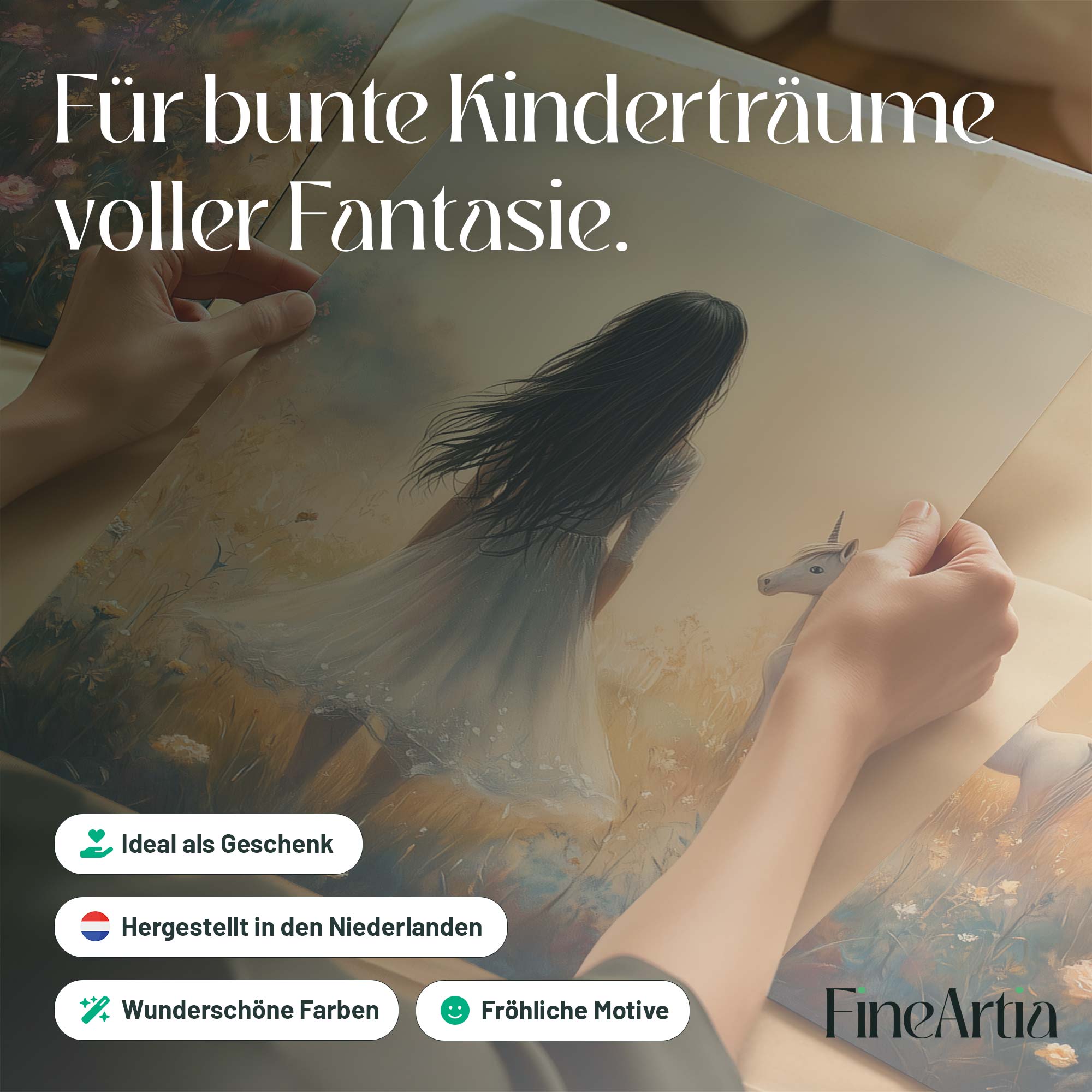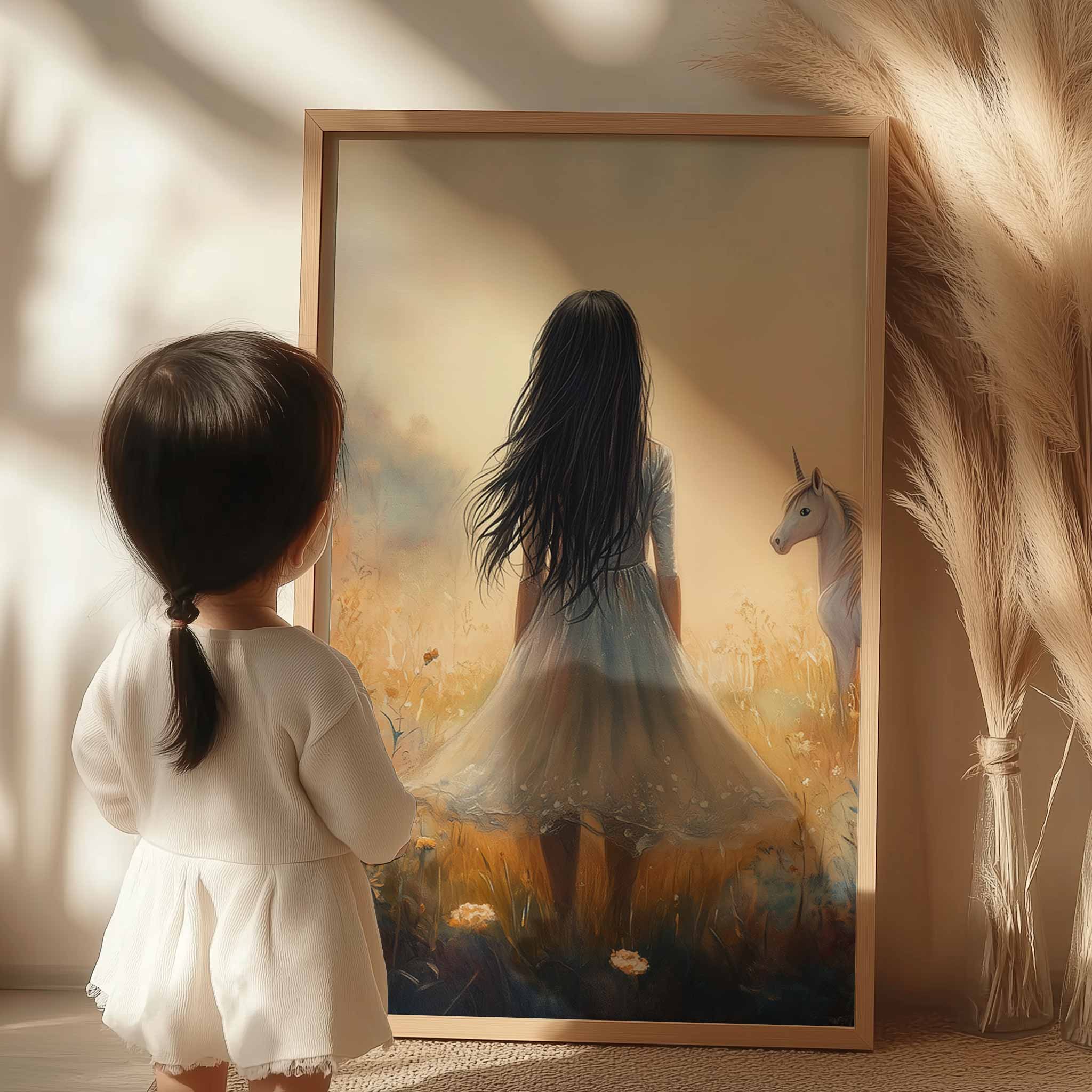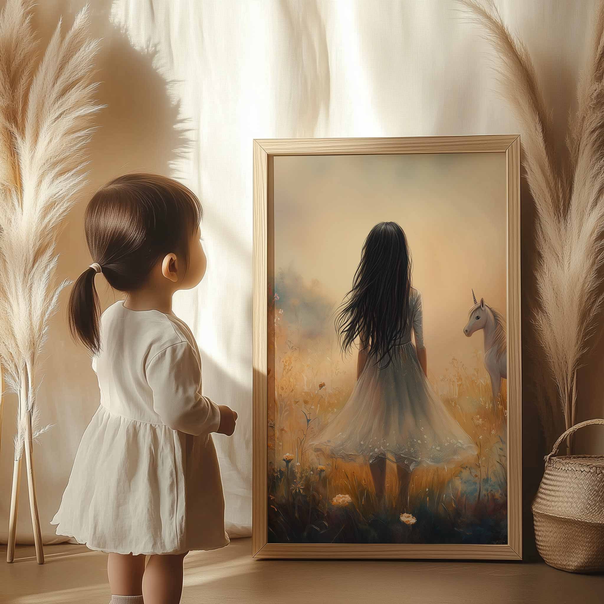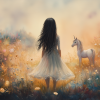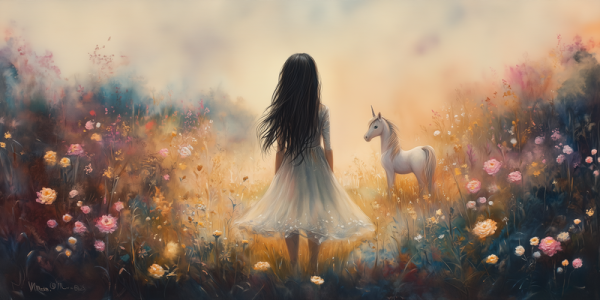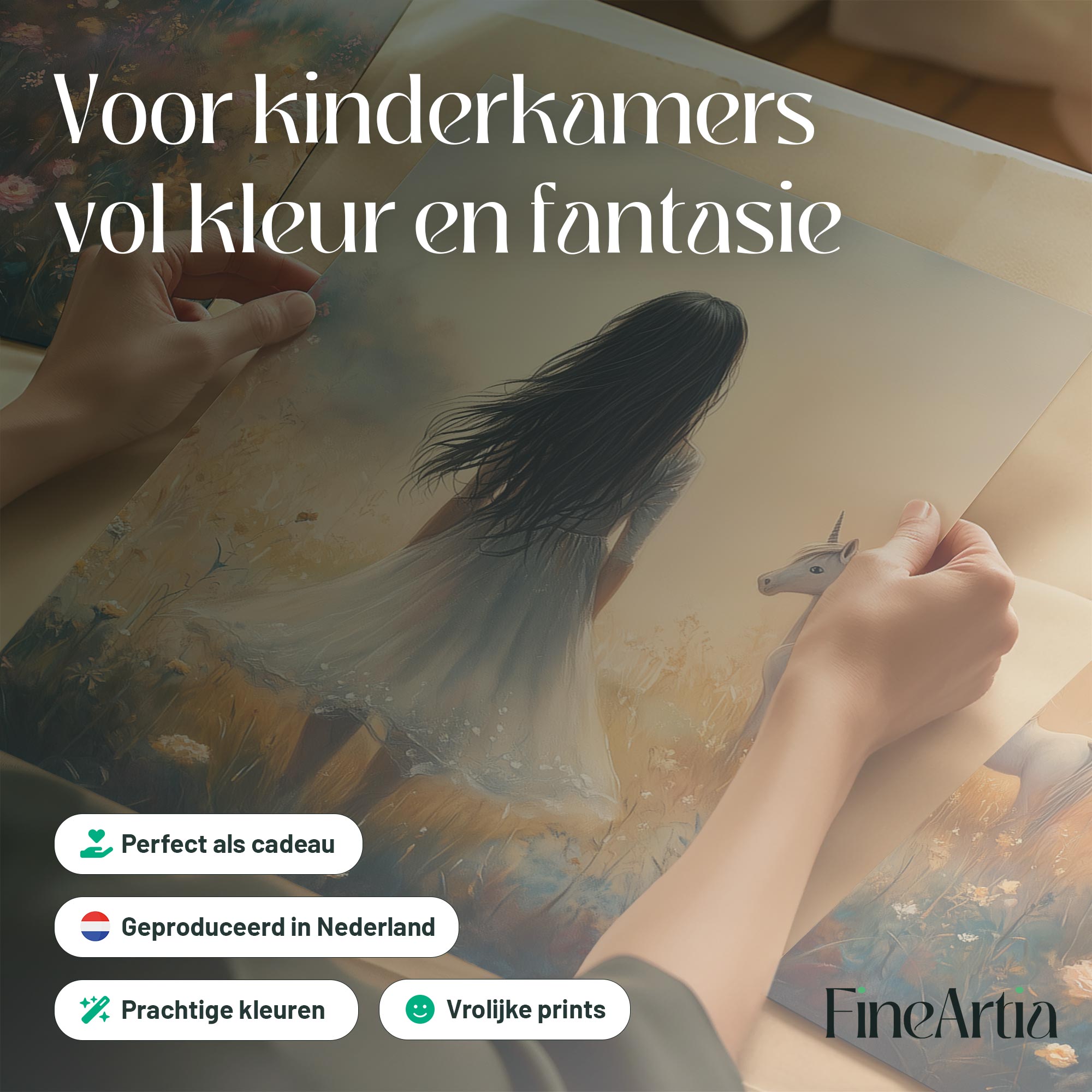 Magisch Meisje en Eenhoorn in Pastel Bloemenveld