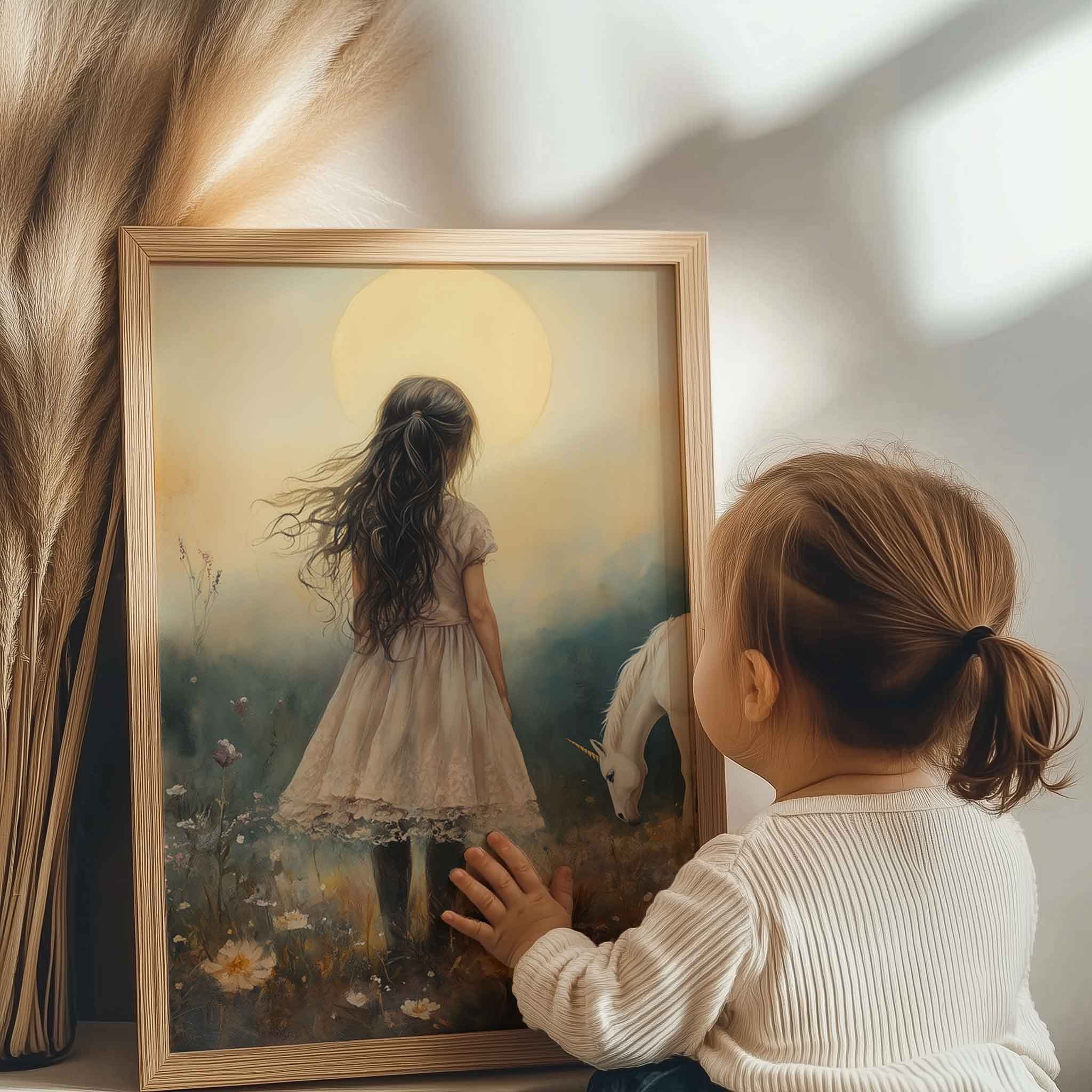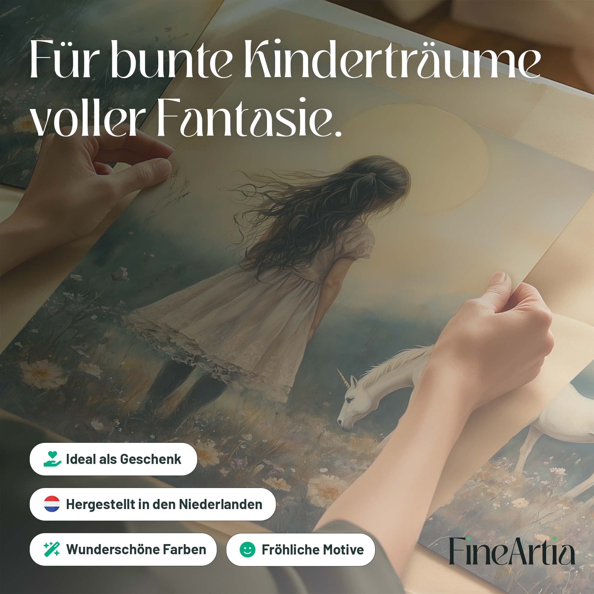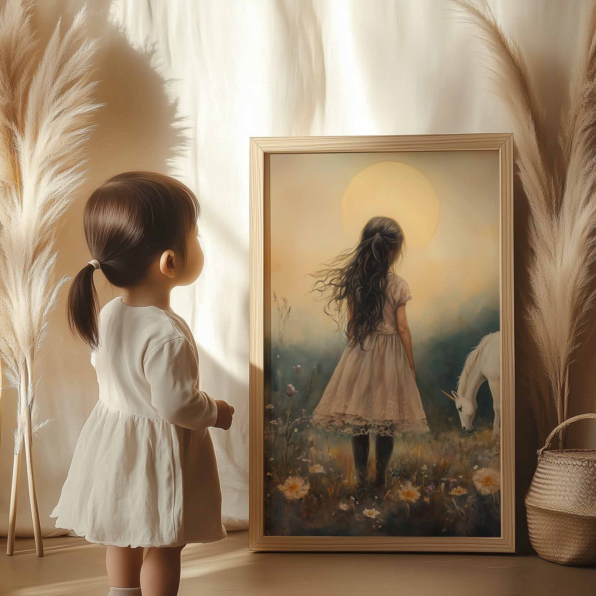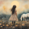 Magisch Meisje en Eenhoorn in Pastel Bloemenveld