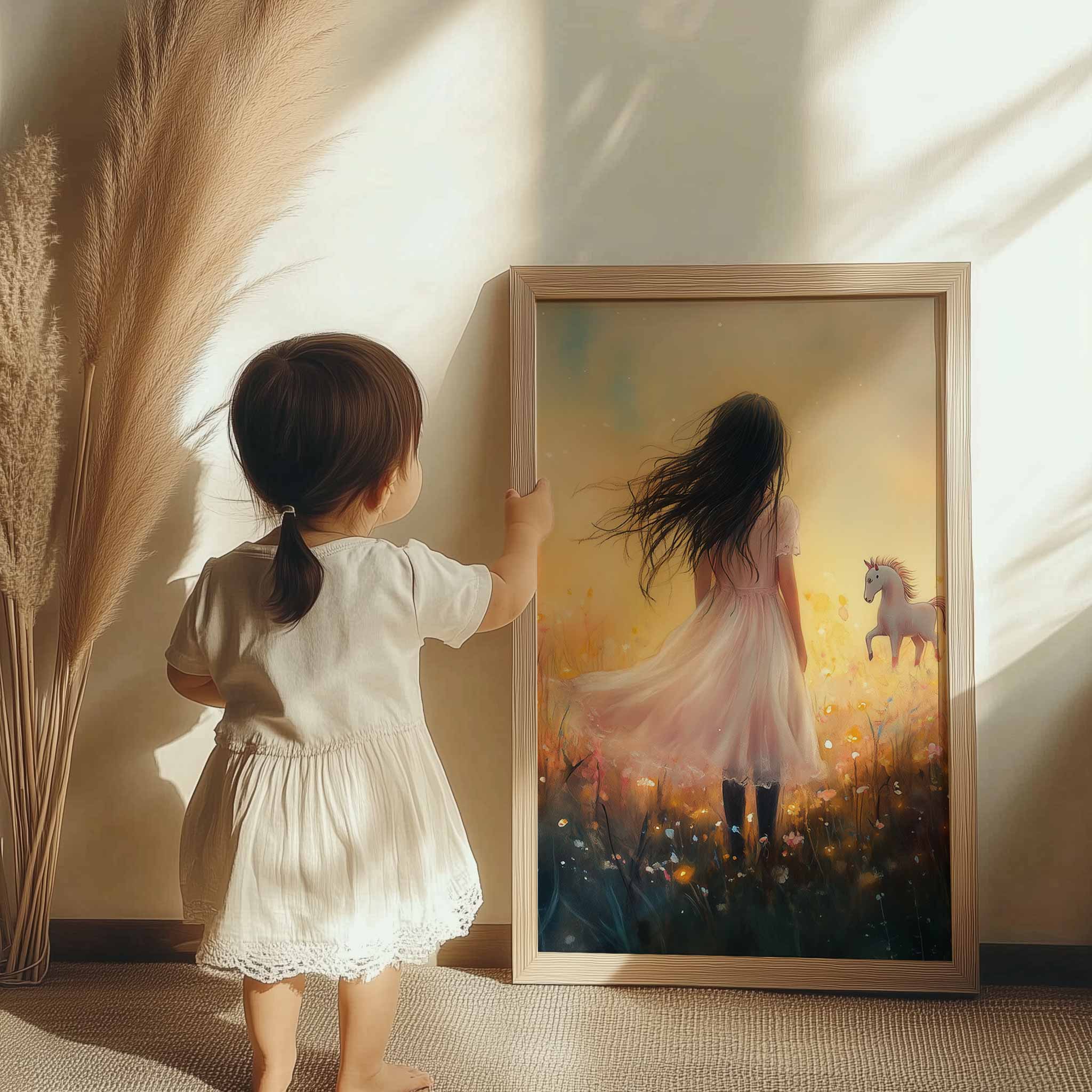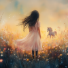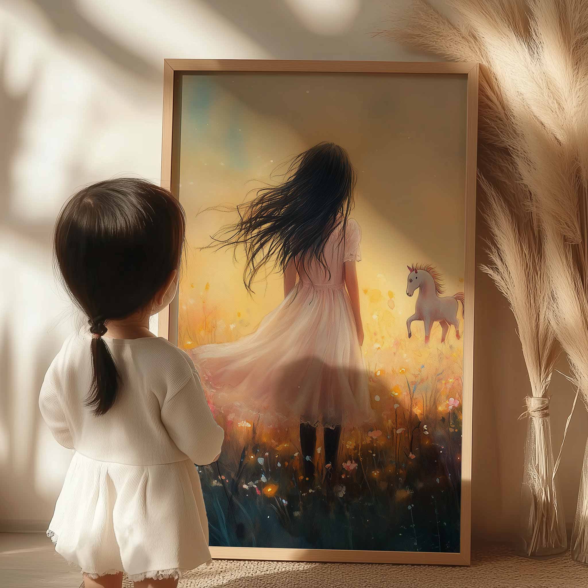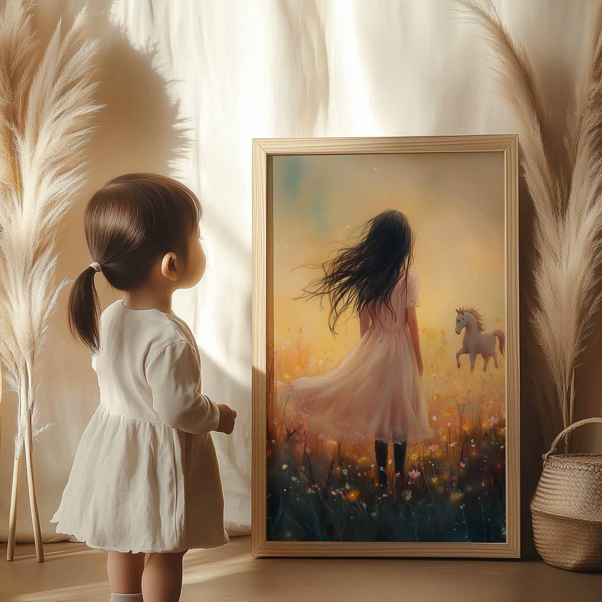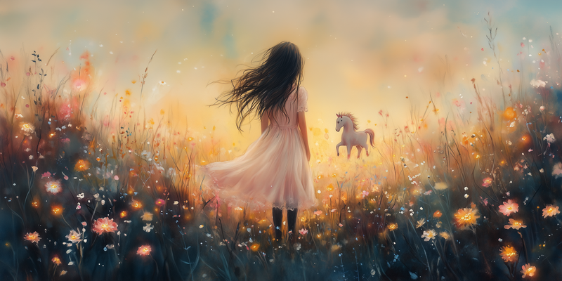 Magisch Meisje en Eenhoorn in Pastel Bloemenveld