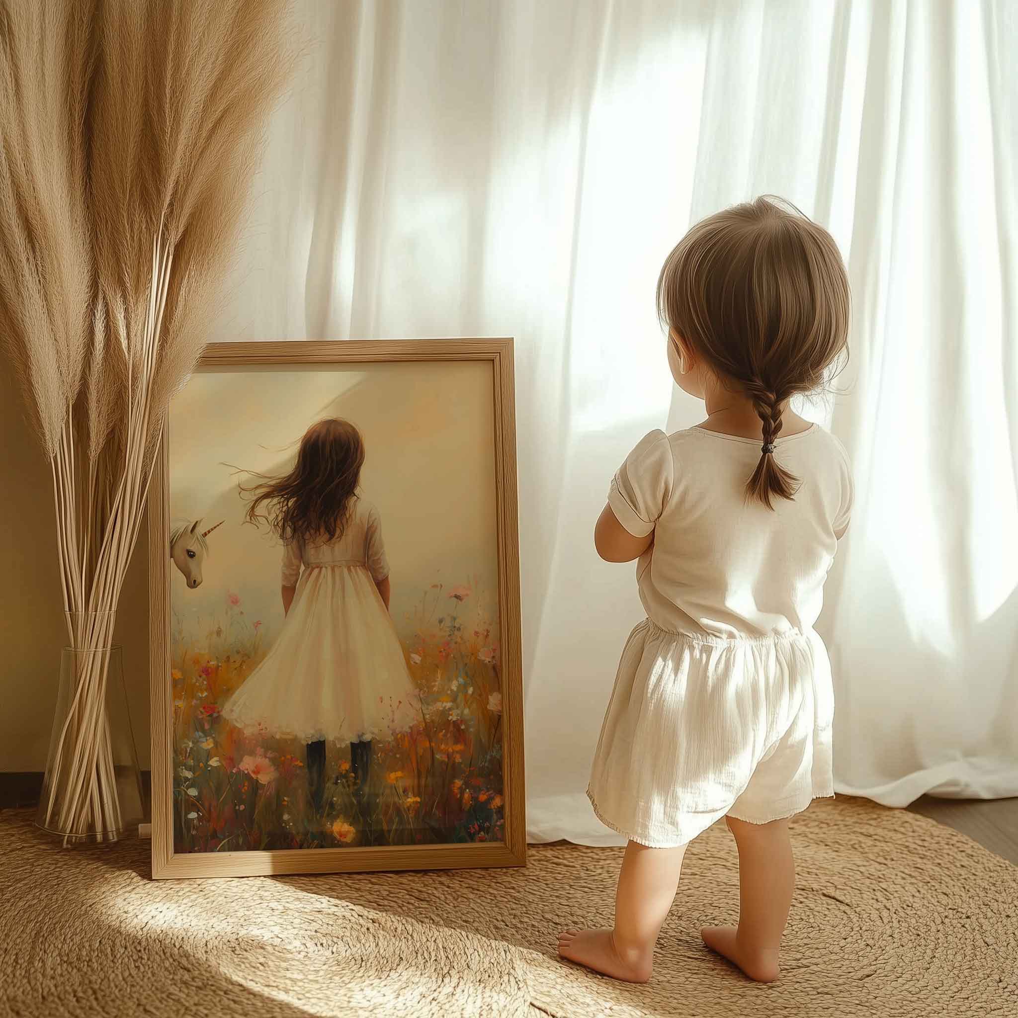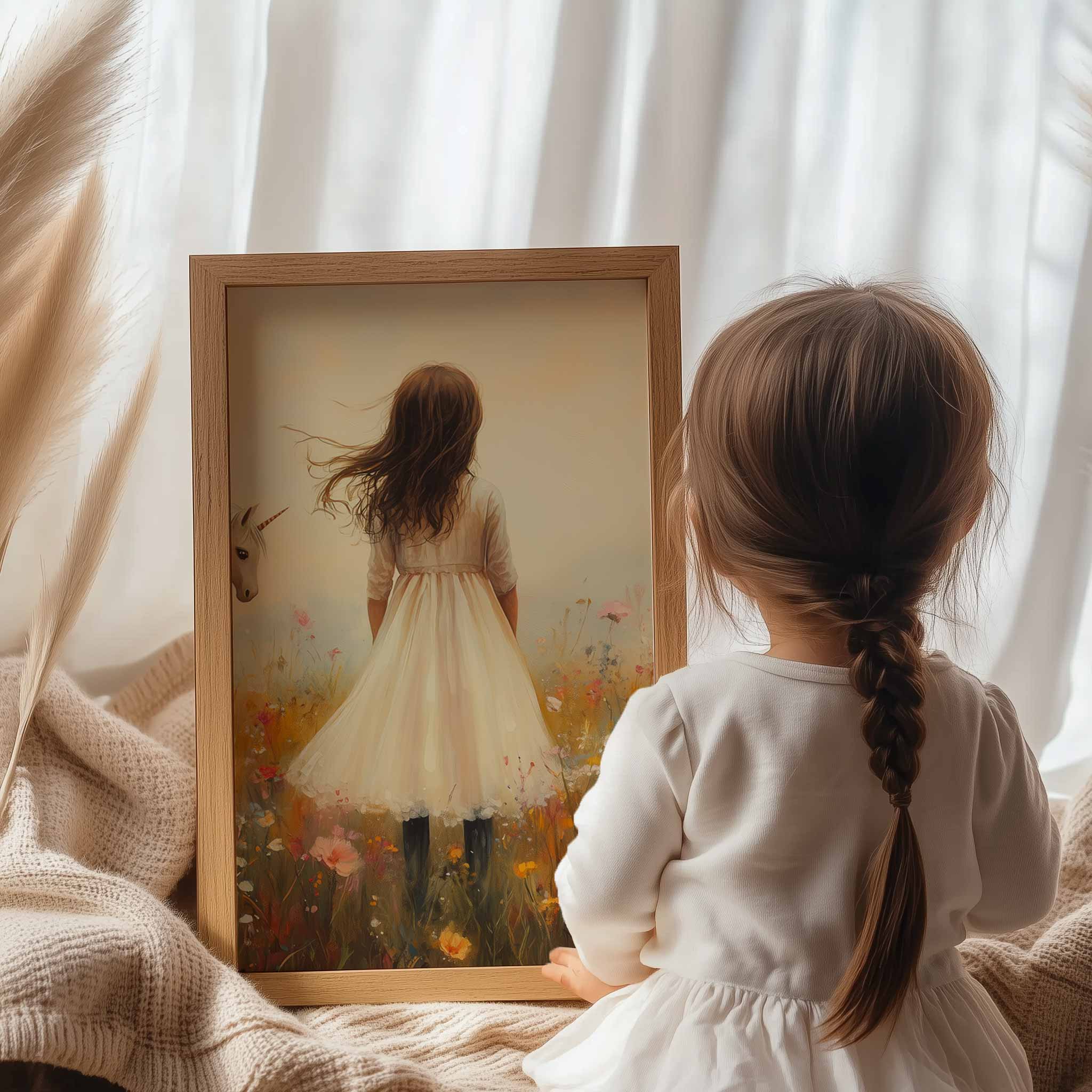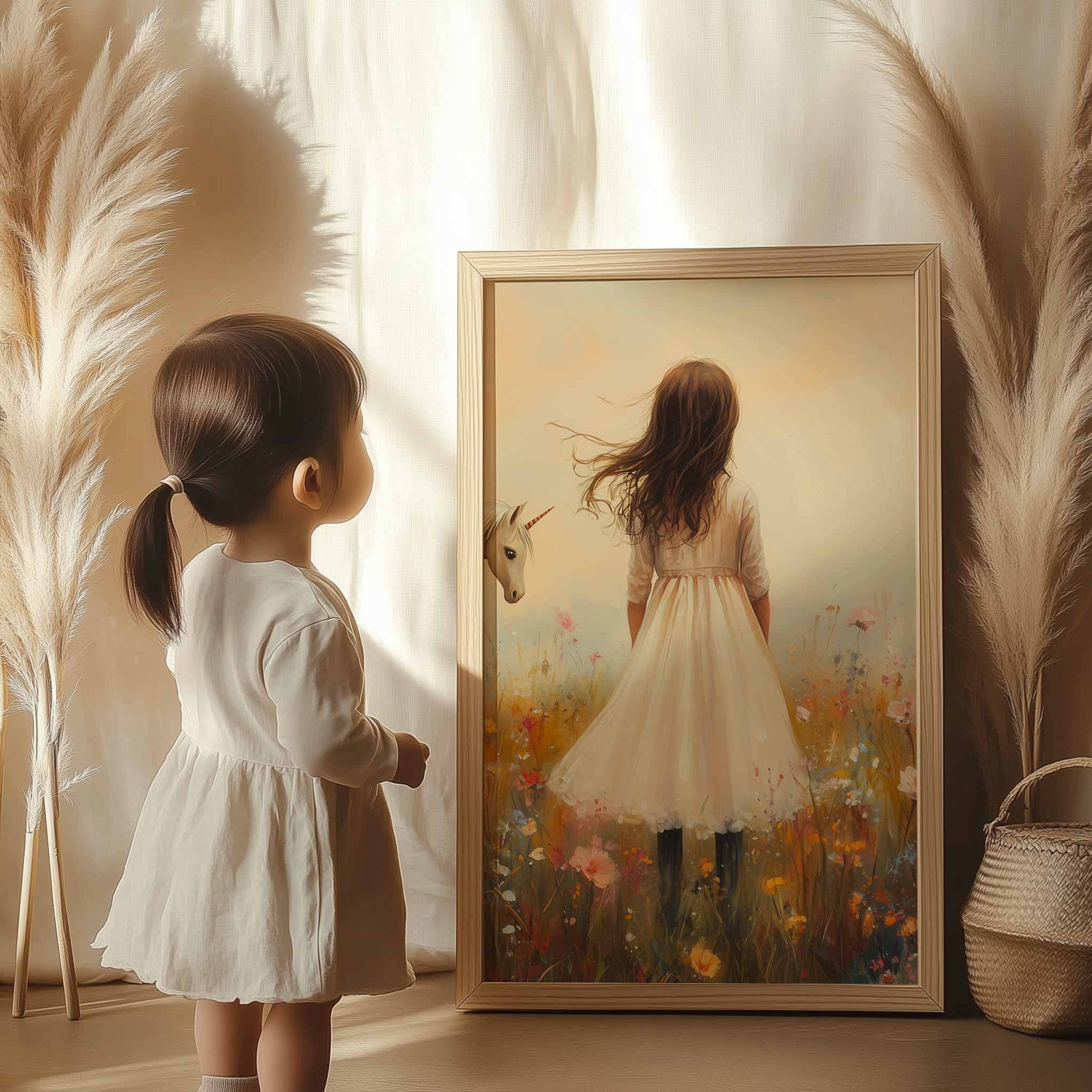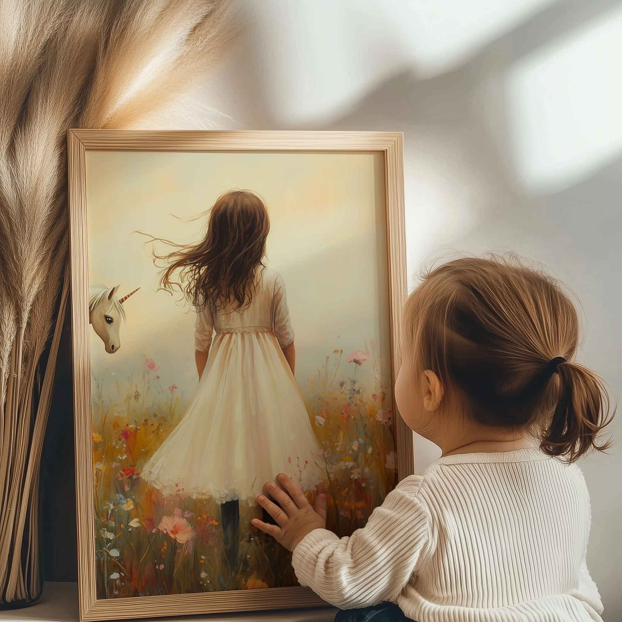 Terug naar collectie Posters Magisch Meisje en Eenhoorn in Pastel Bloemenveld