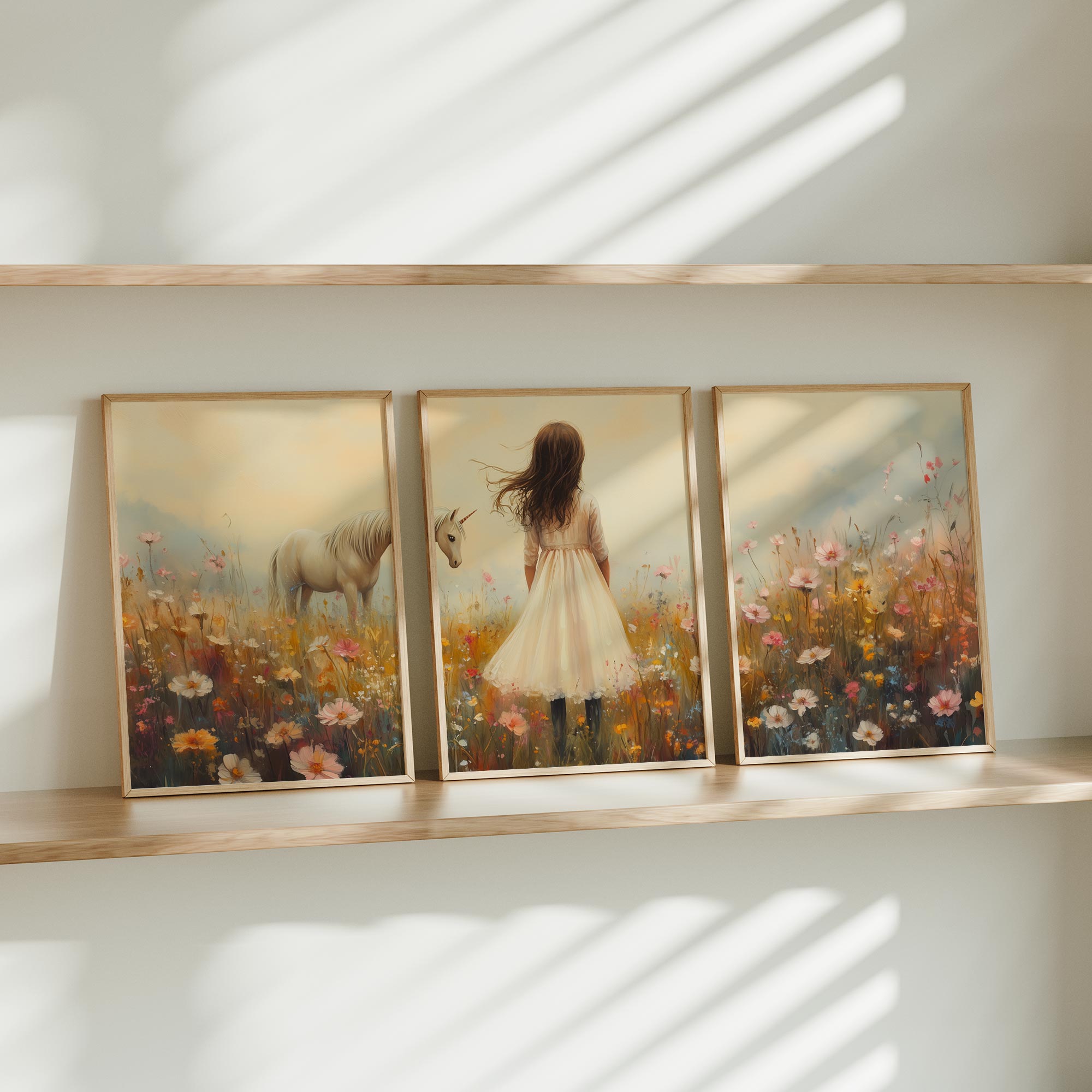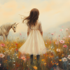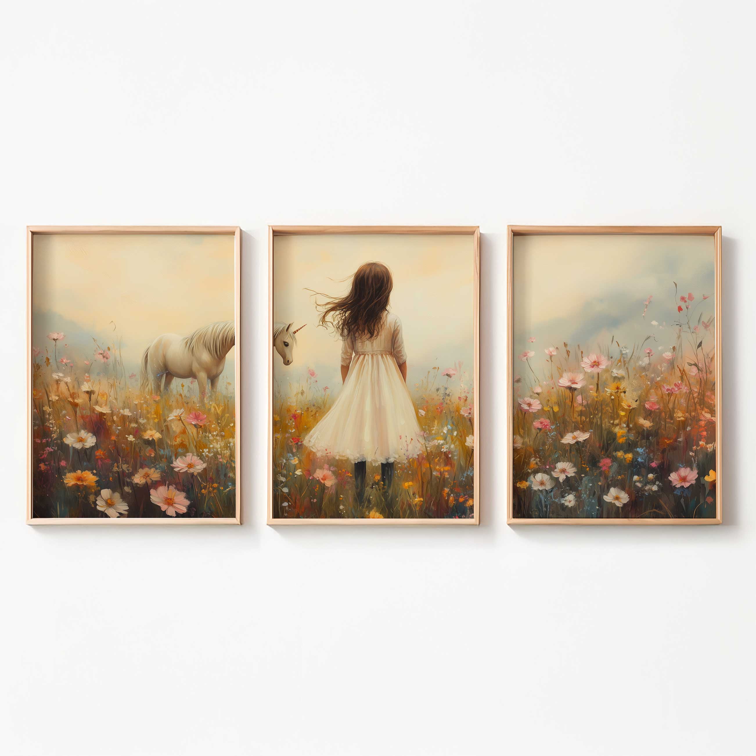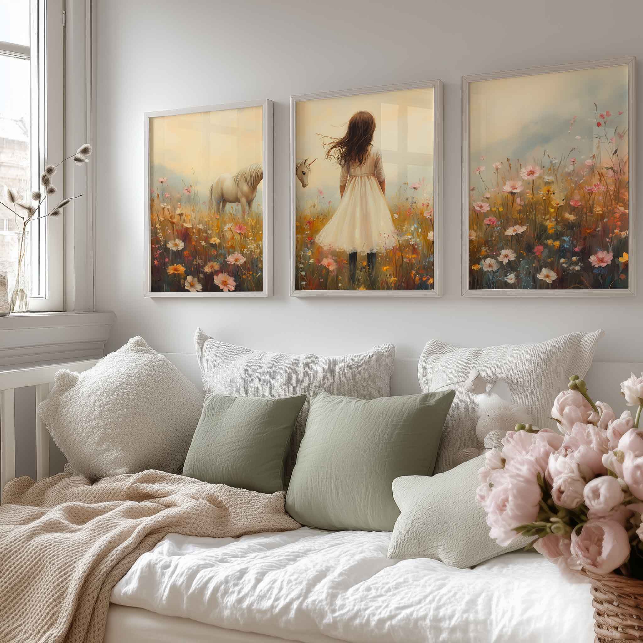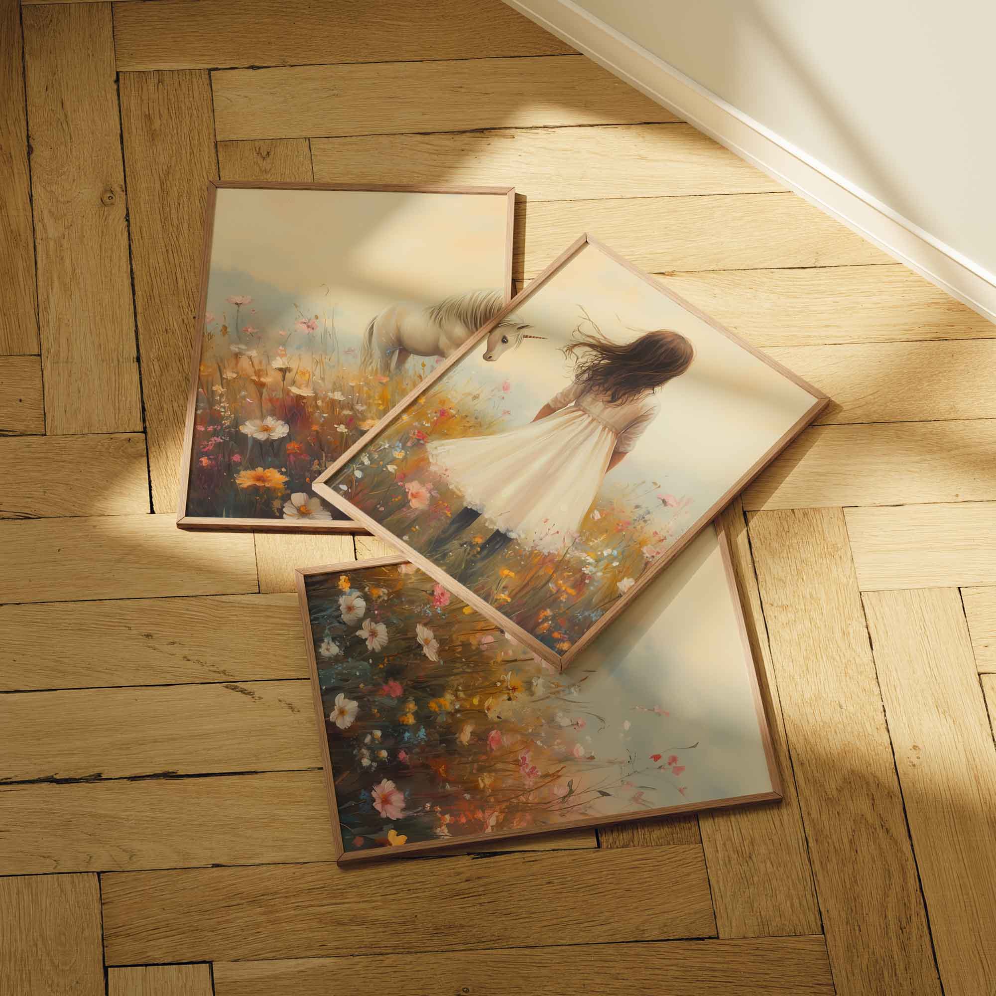 Terug naar collectie Posters Magisch Meisje en Eenhoorn in Pastel Bloemenveld