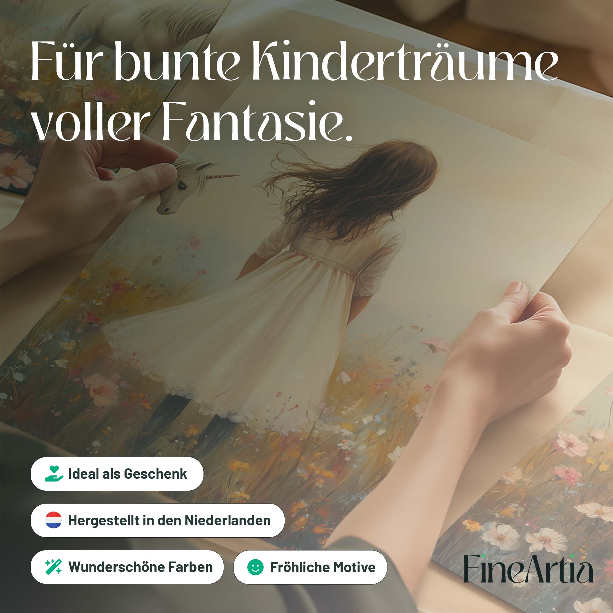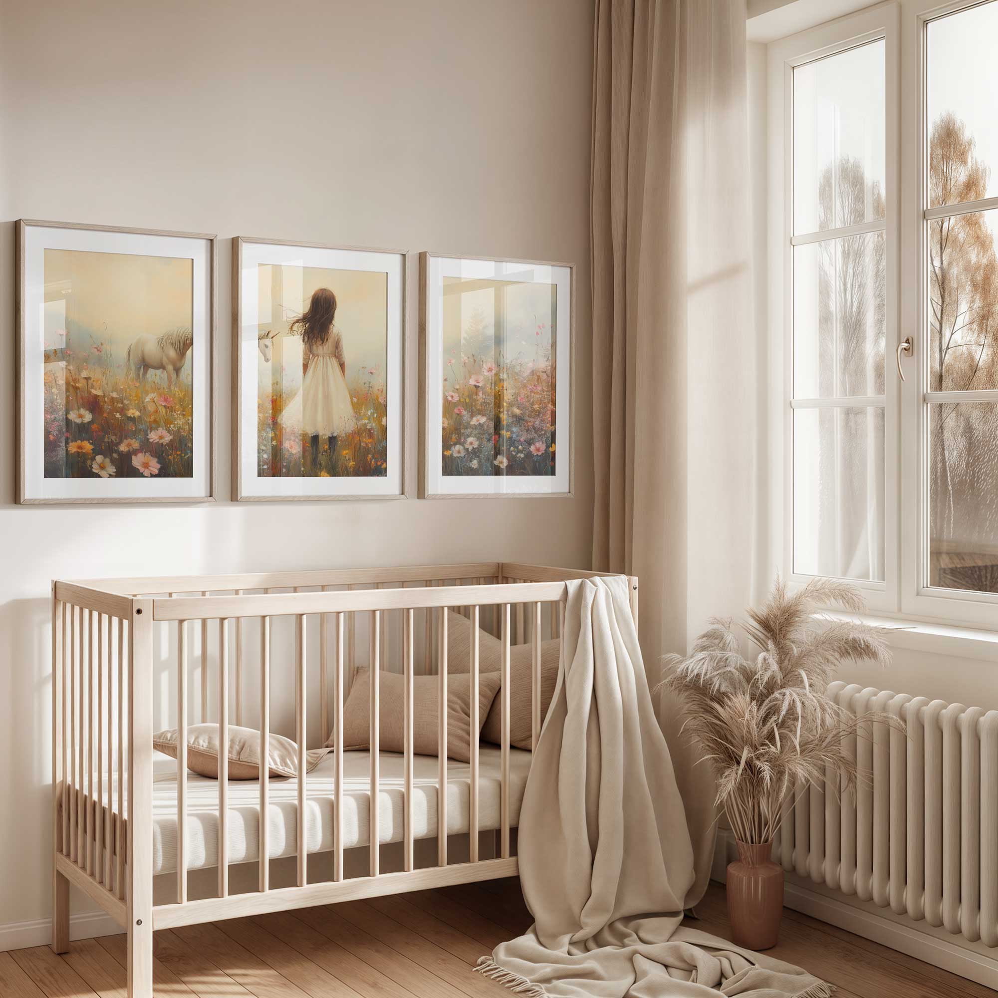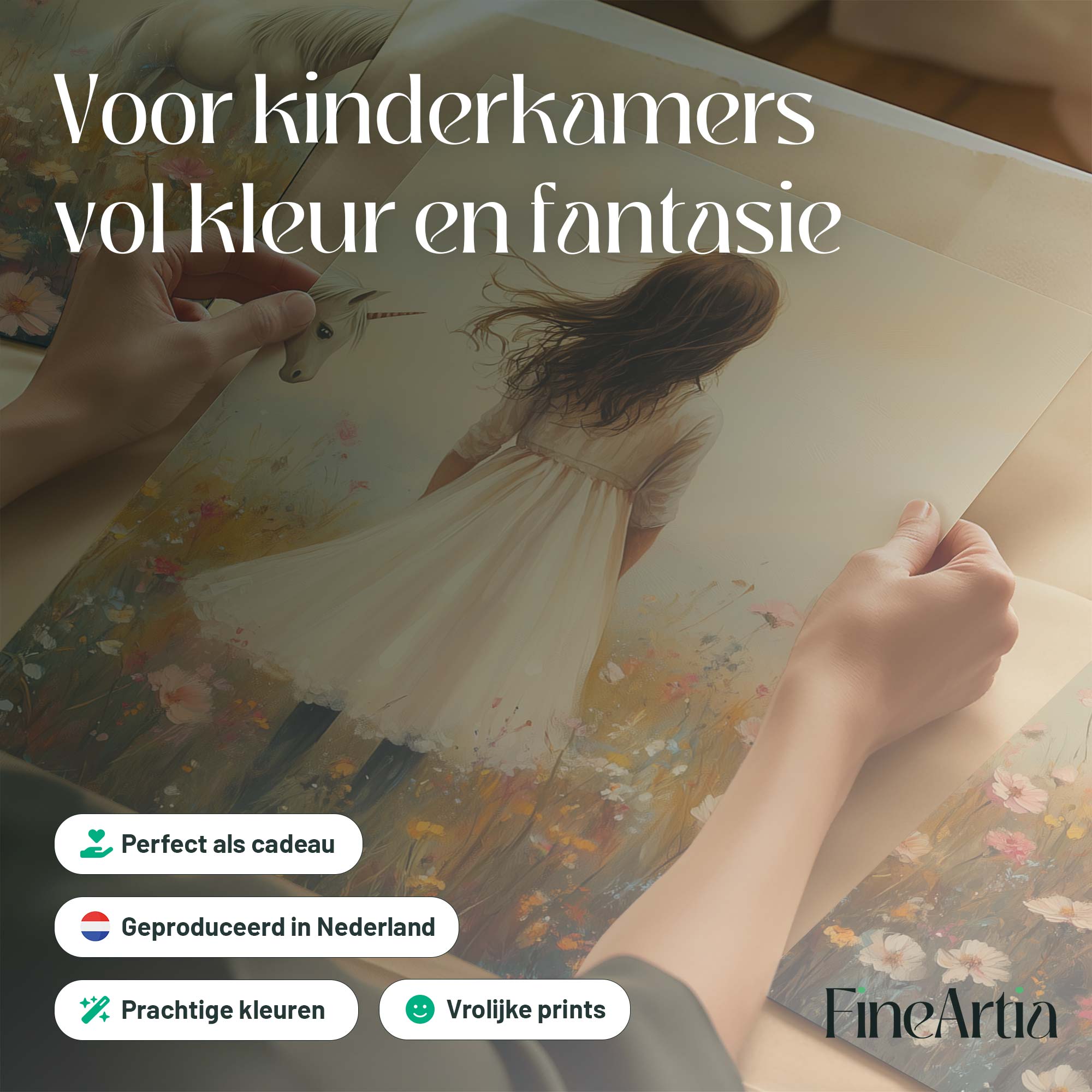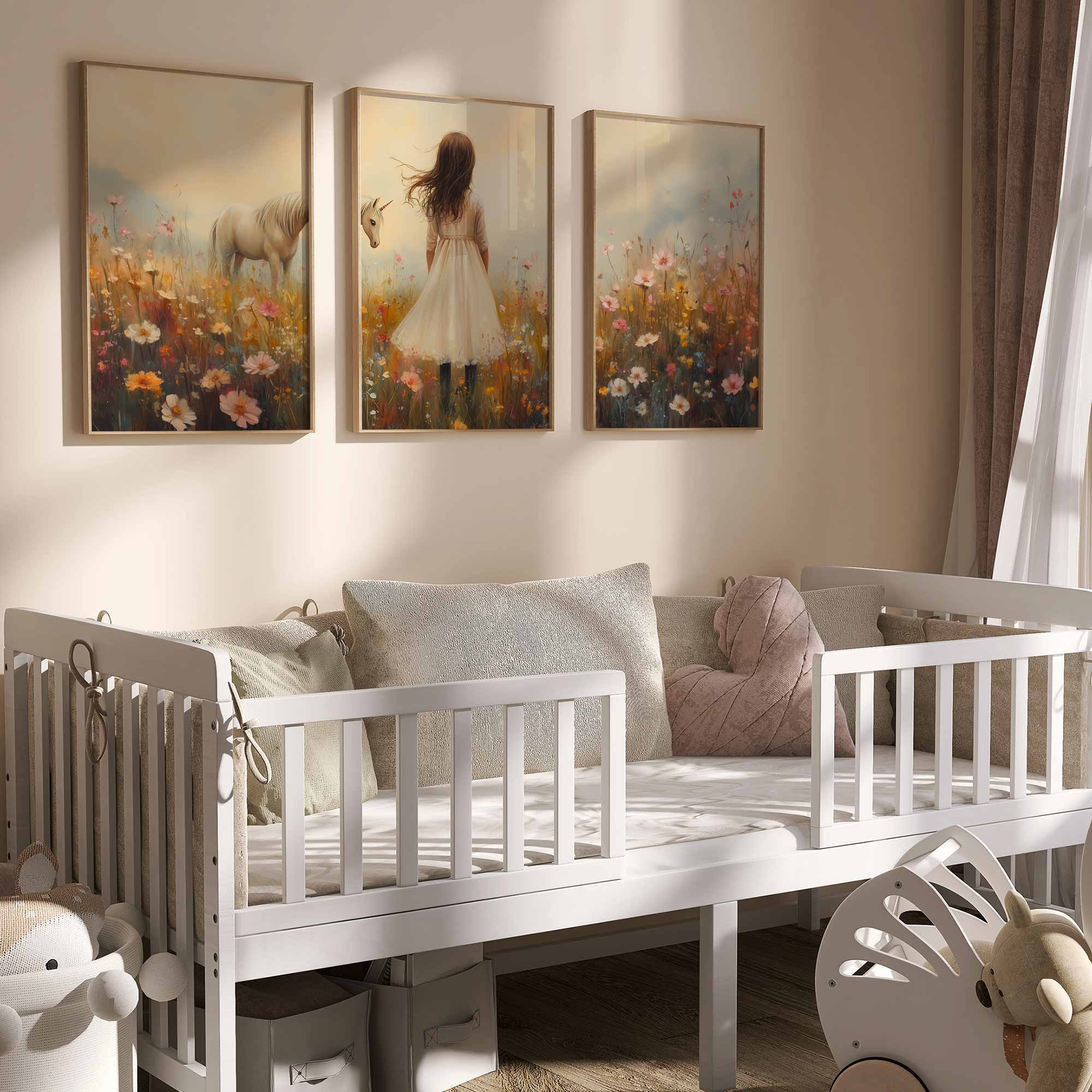 Terug naar collectie Posters Magisch Meisje en Eenhoorn in Pastel Bloemenveld