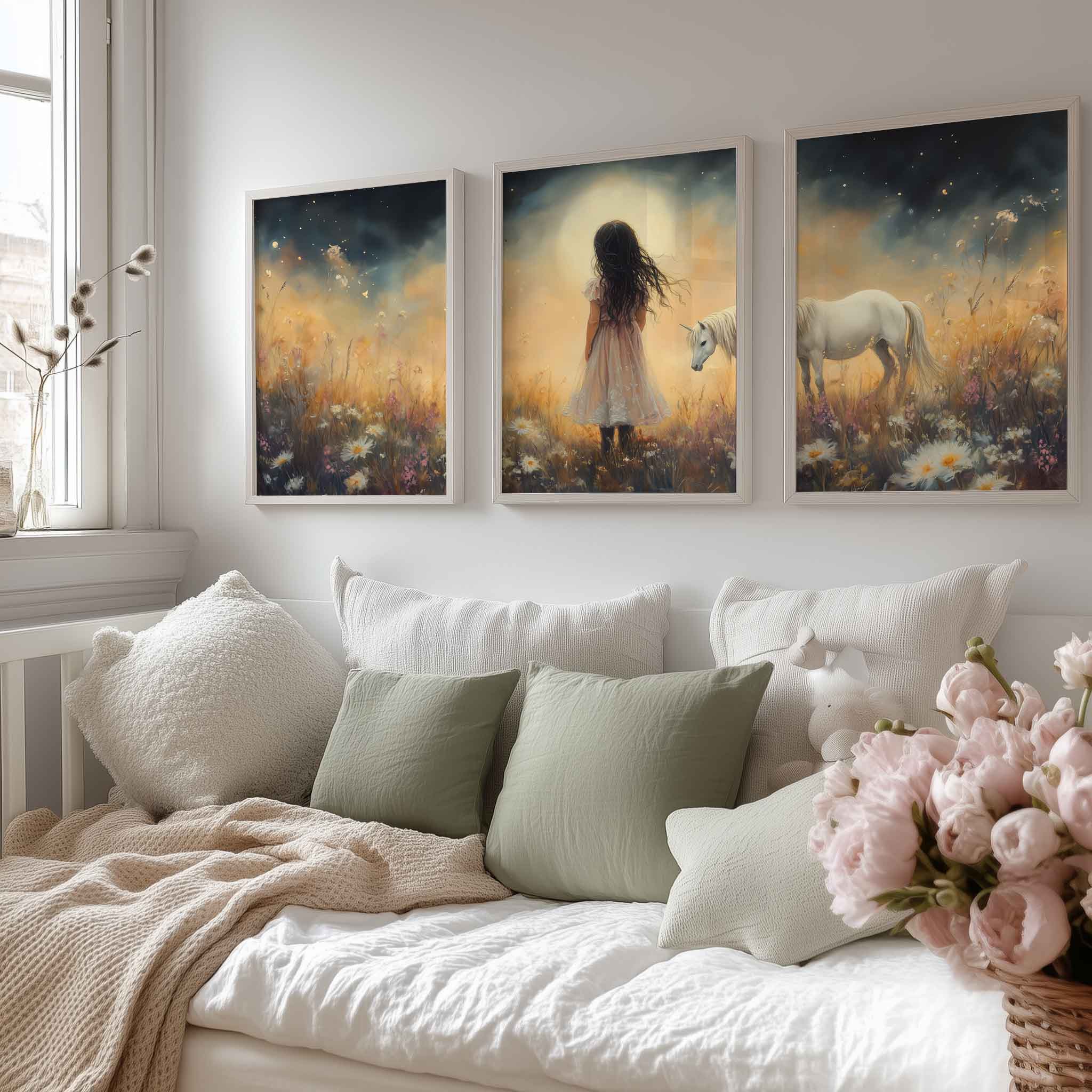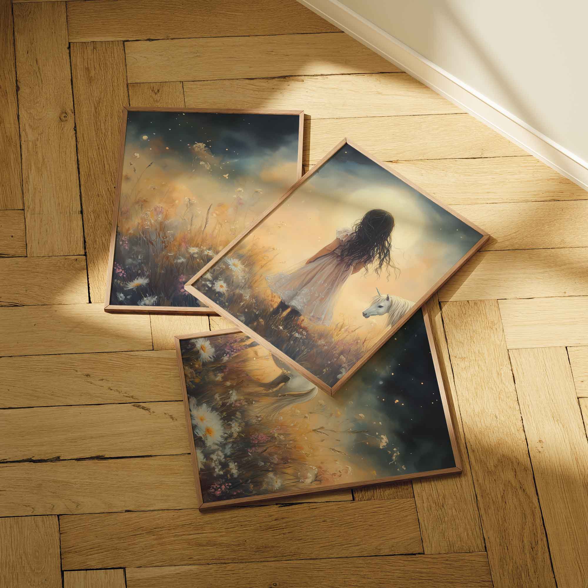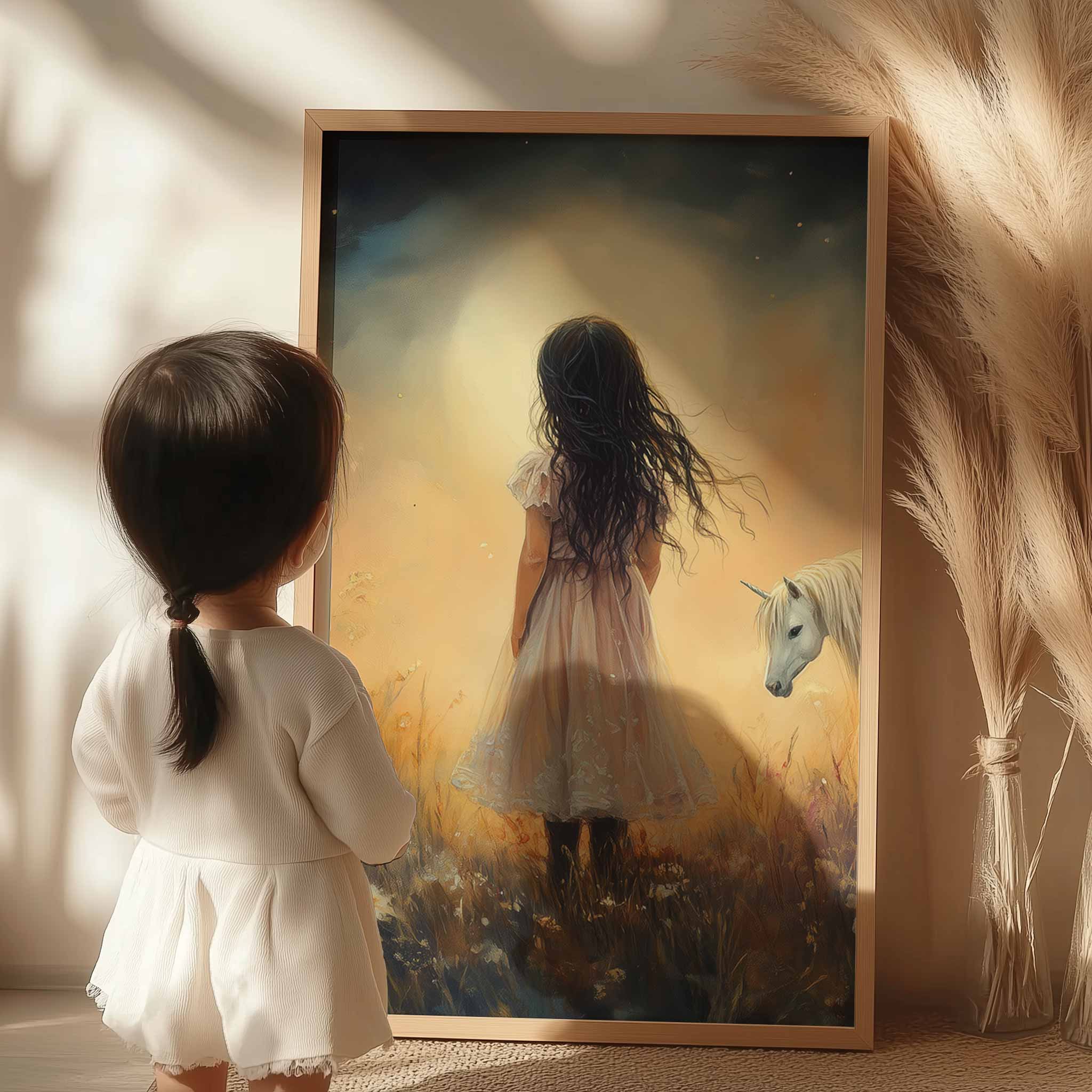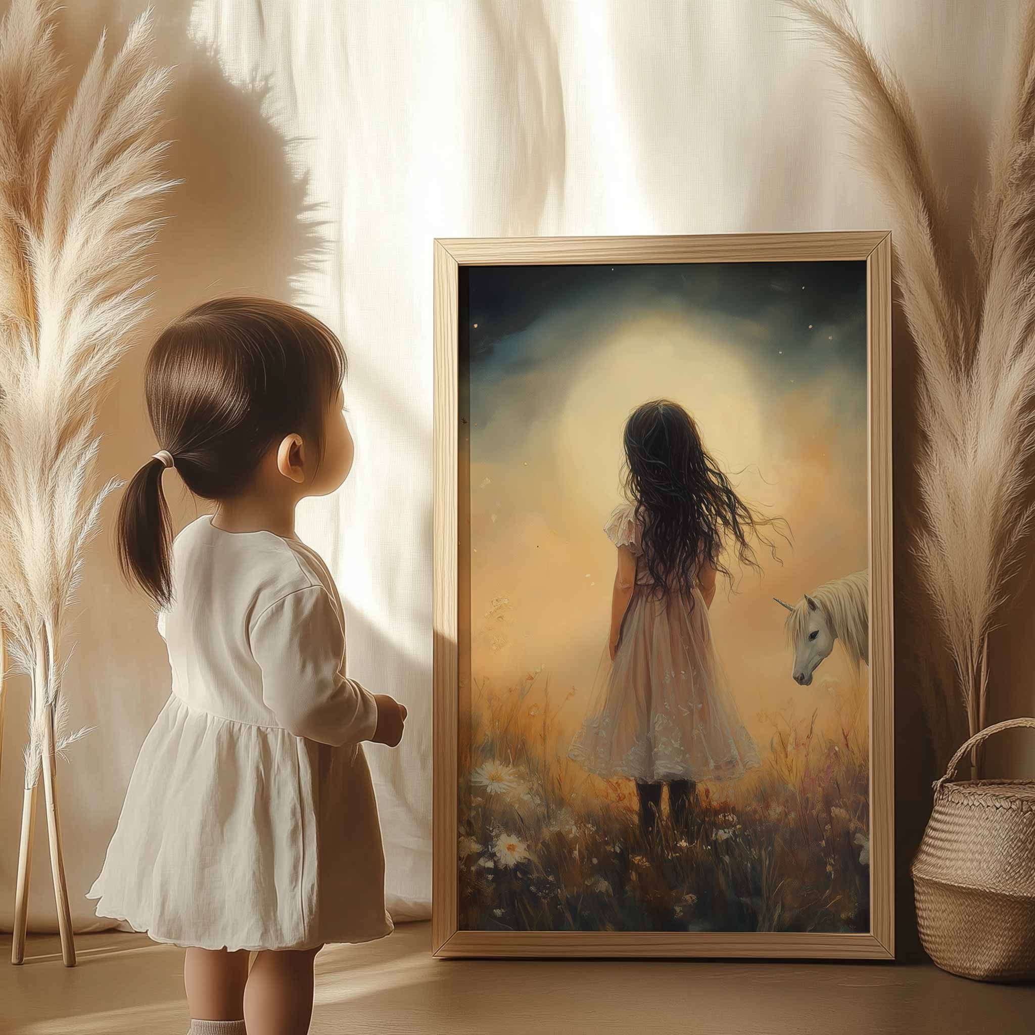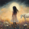 Terug naar collectie Posters Magisch Meisje en Witte Paard in Bloemenveld