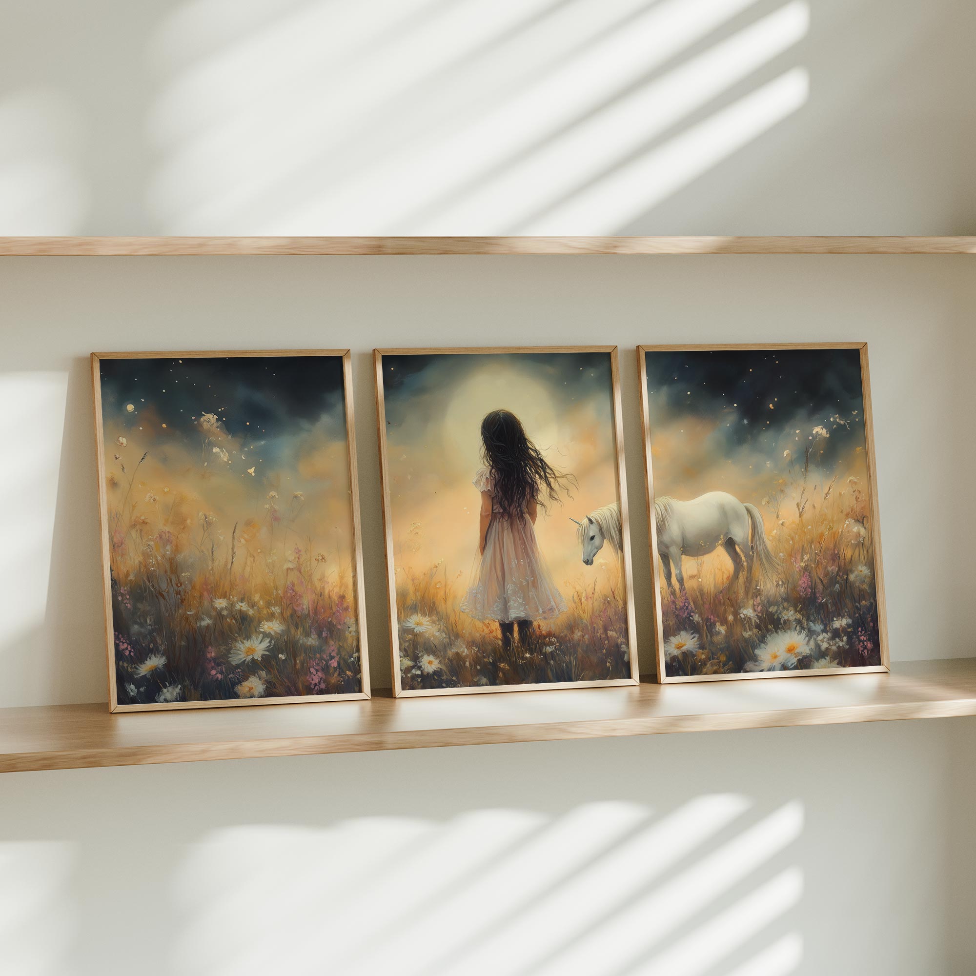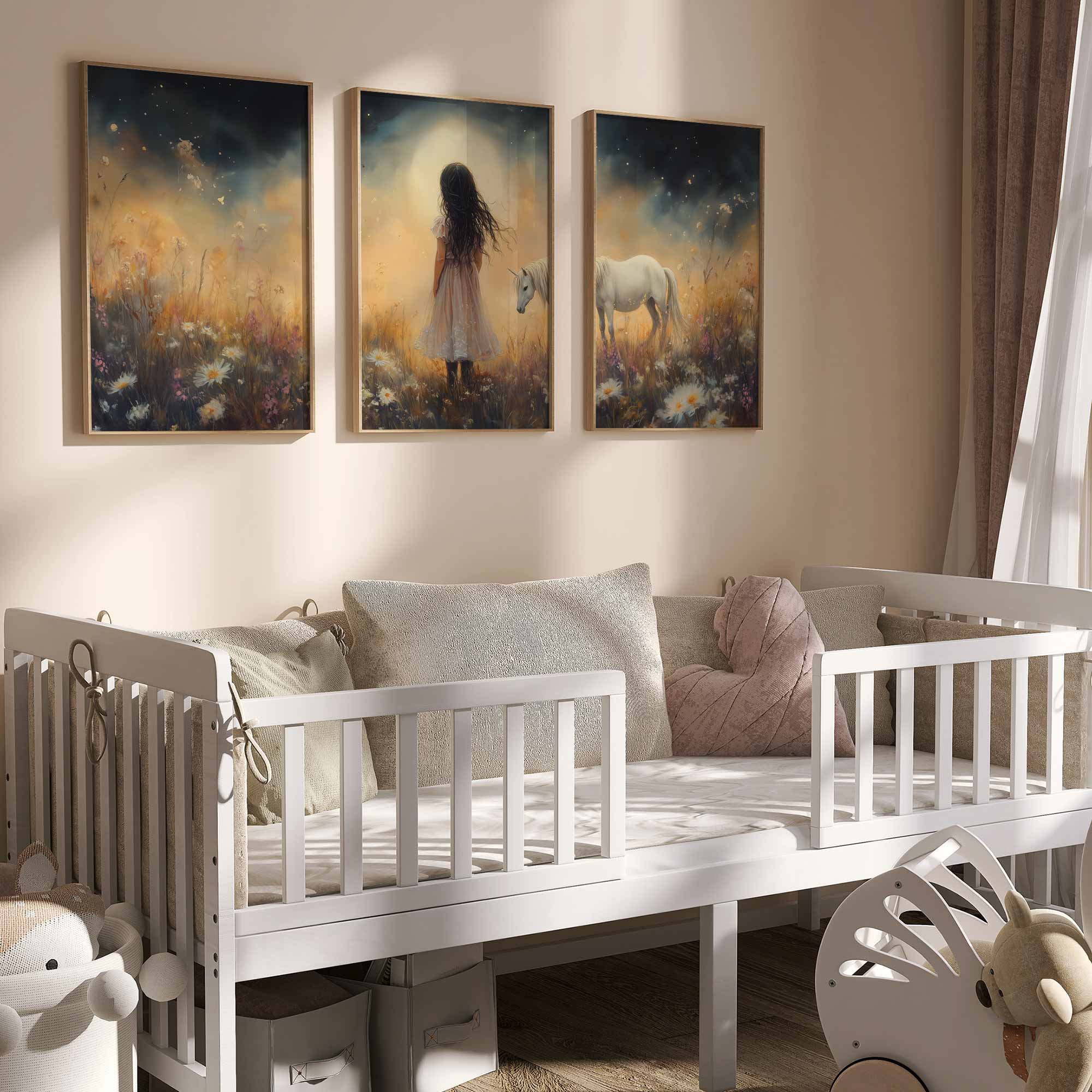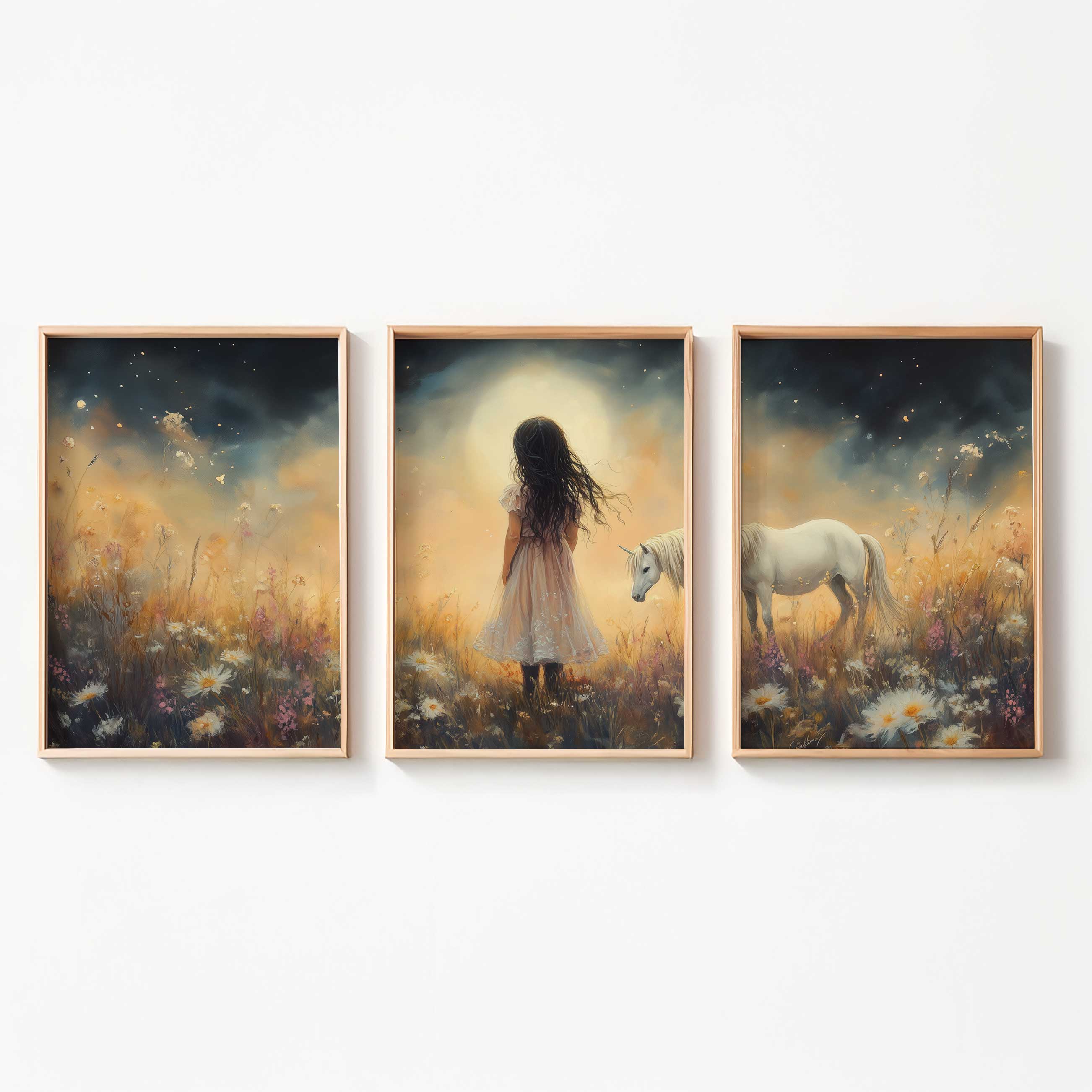 Terug naar collectie Posters Magisch Meisje en Witte Paard in Bloemenveld